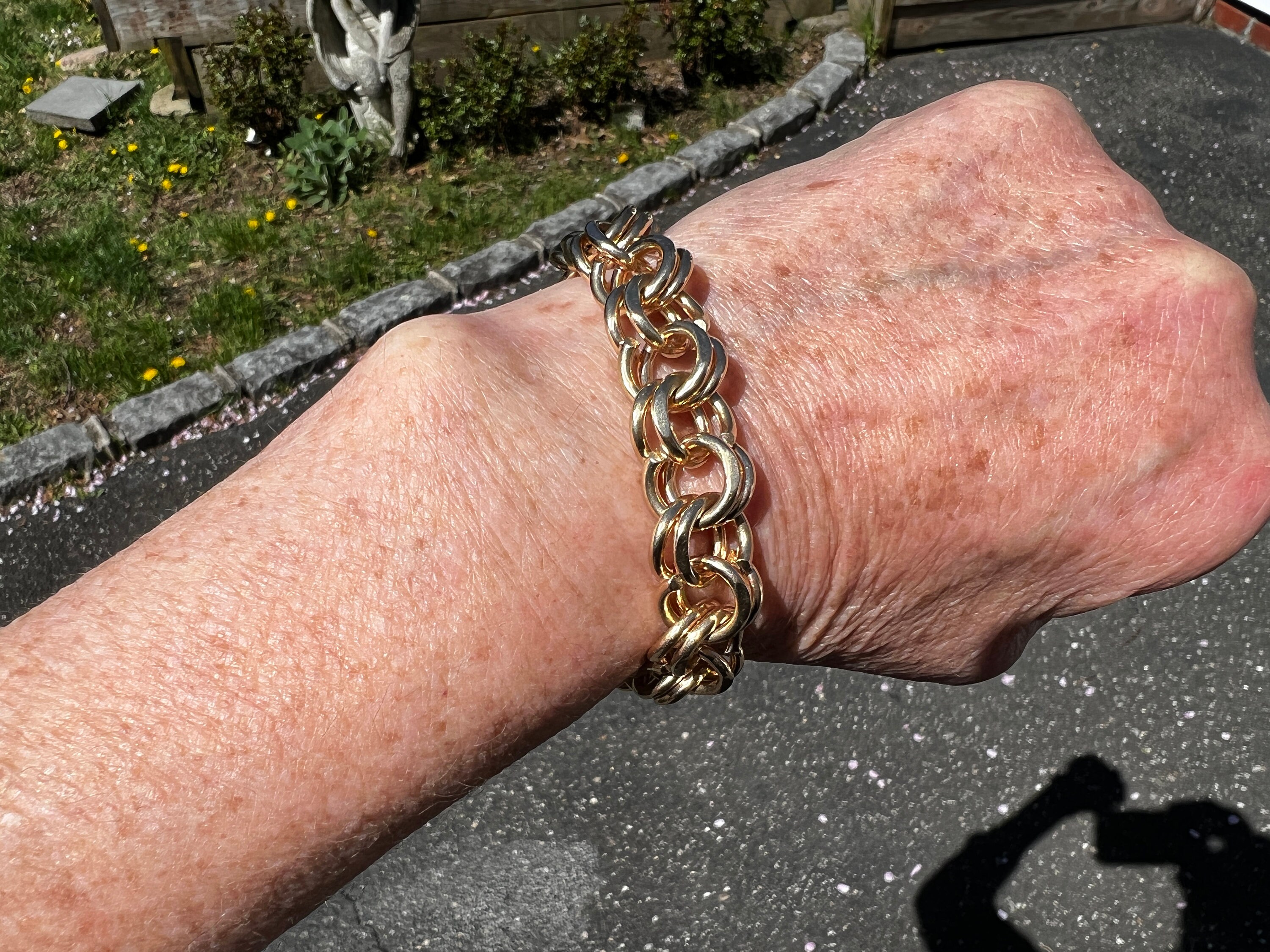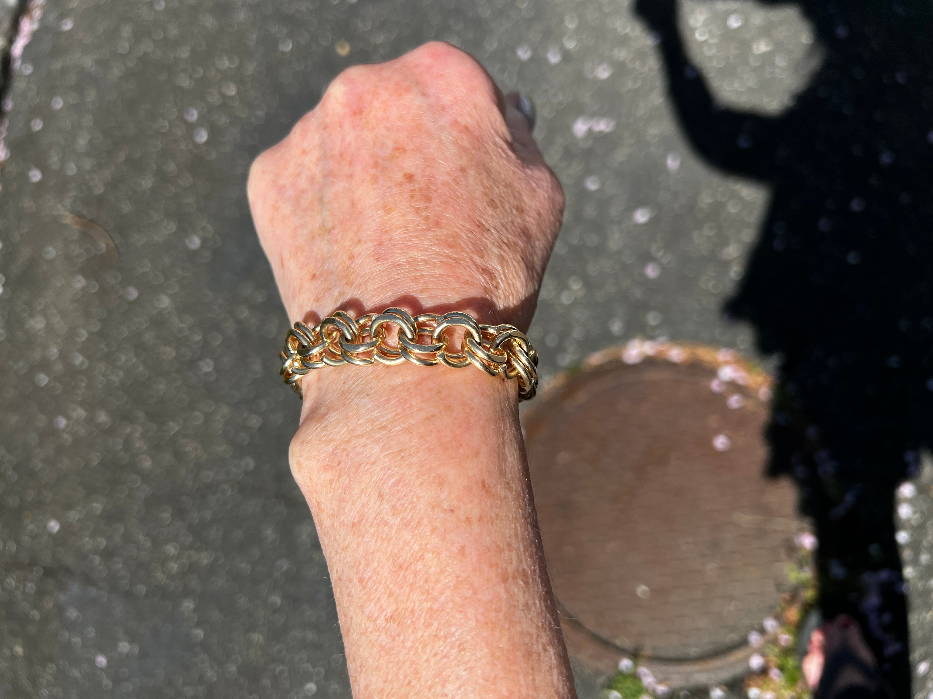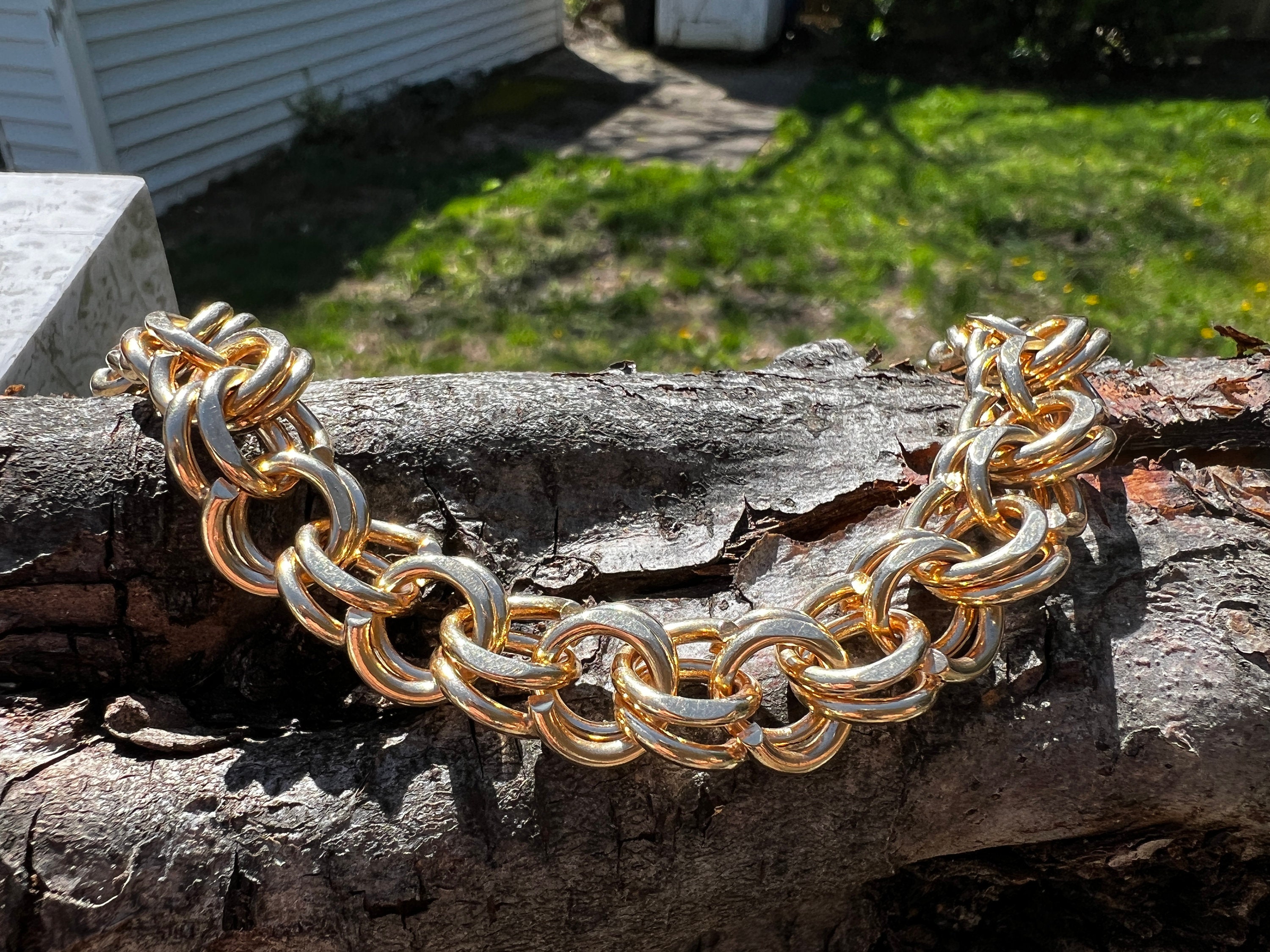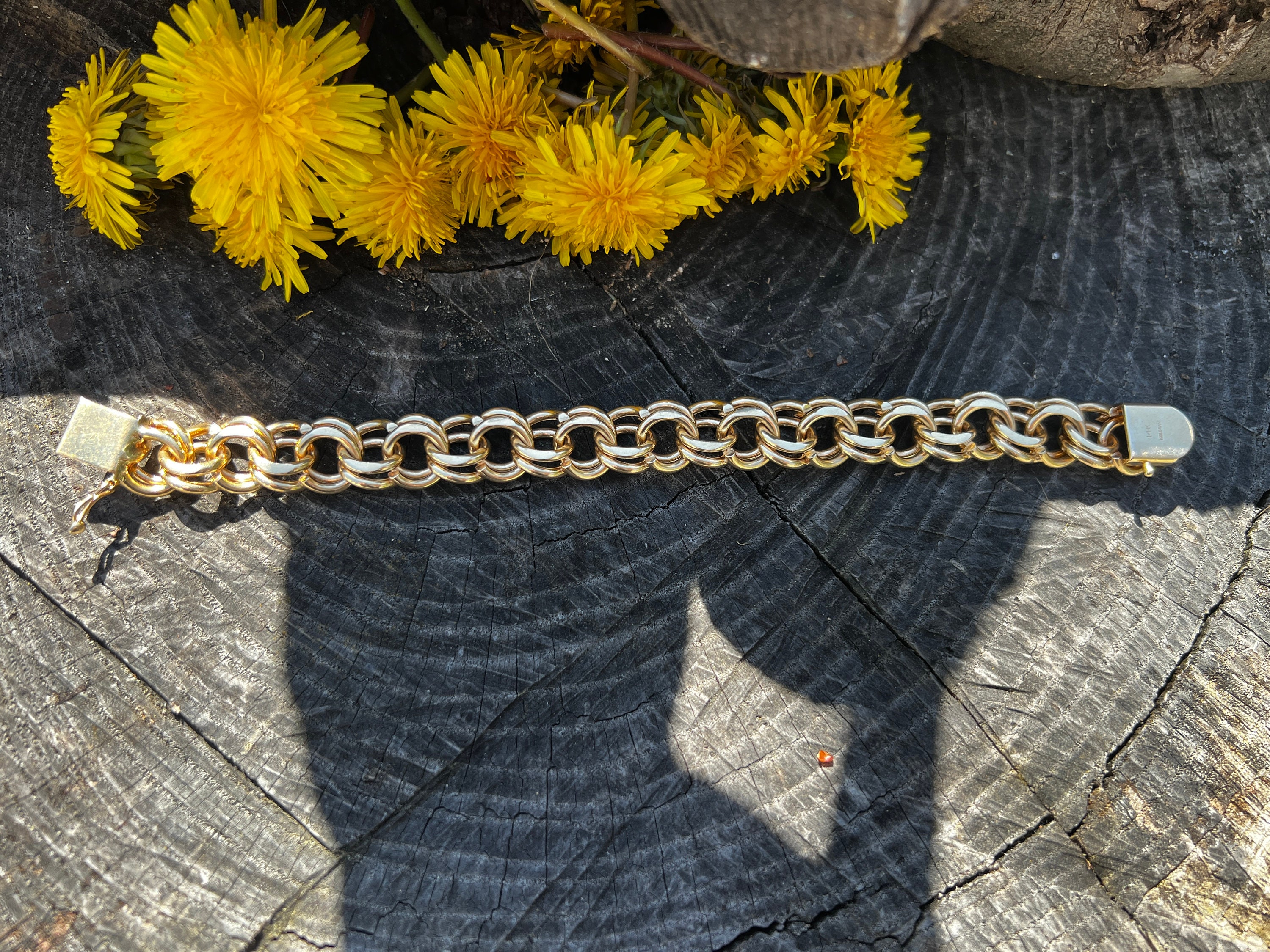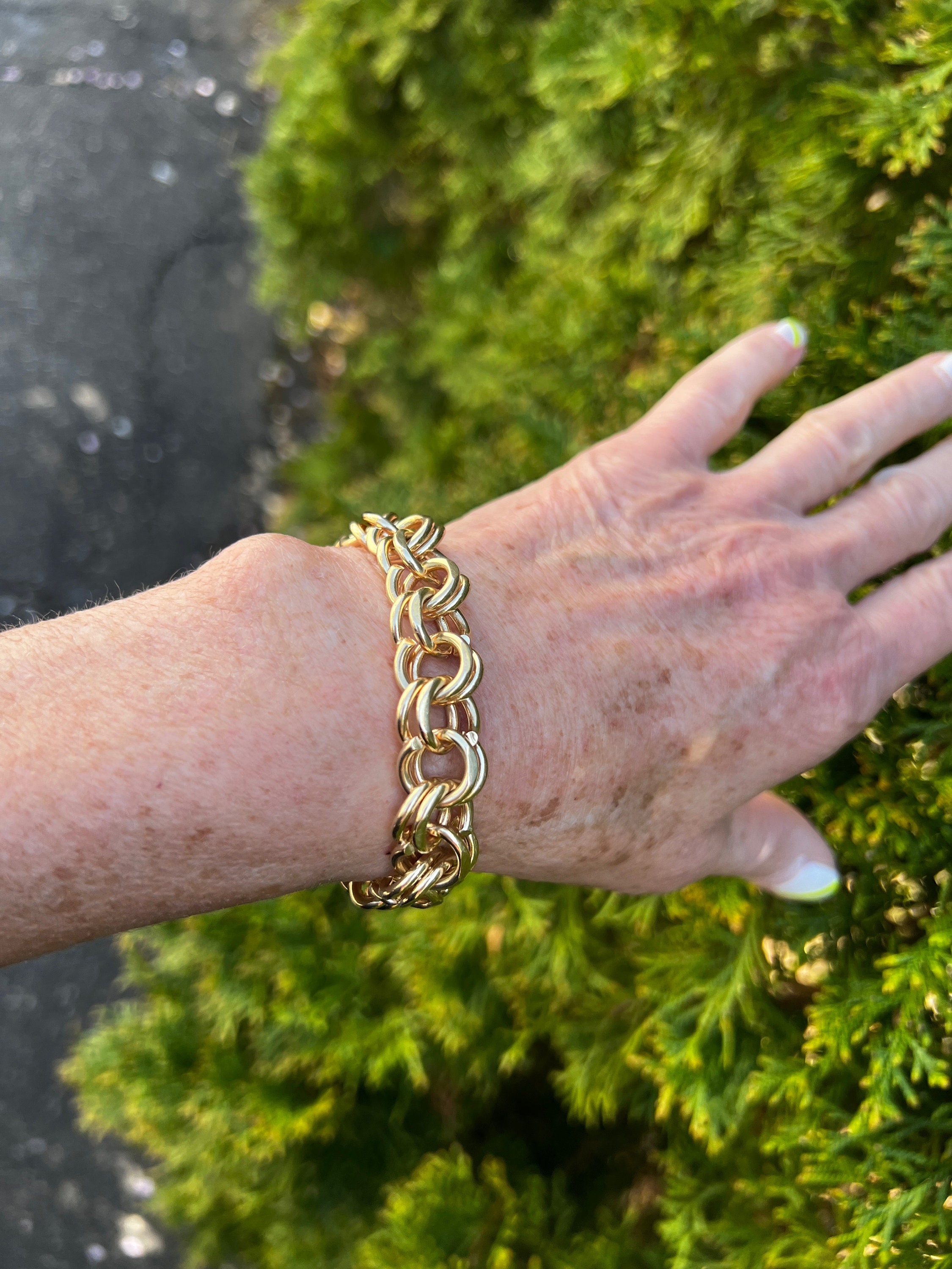 This powerfully stunning bracelet is made in 14k yellow gold. It dates from the 1960s. It is comprised of a series of polished gold interlocking circular ring like links crafted in the yellow gold. A classic with a twist taking it to that elegant echelon of design. The bracelet is 7 1/2 inches in length. It is 3/8" wide. It weighs 60.57 grams. An expression of irresistible style.
