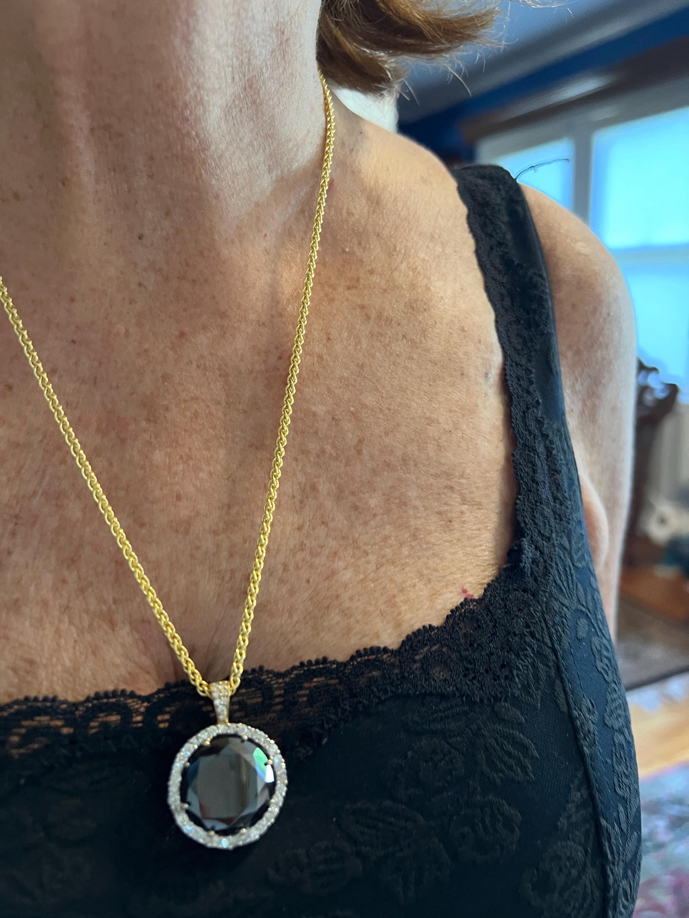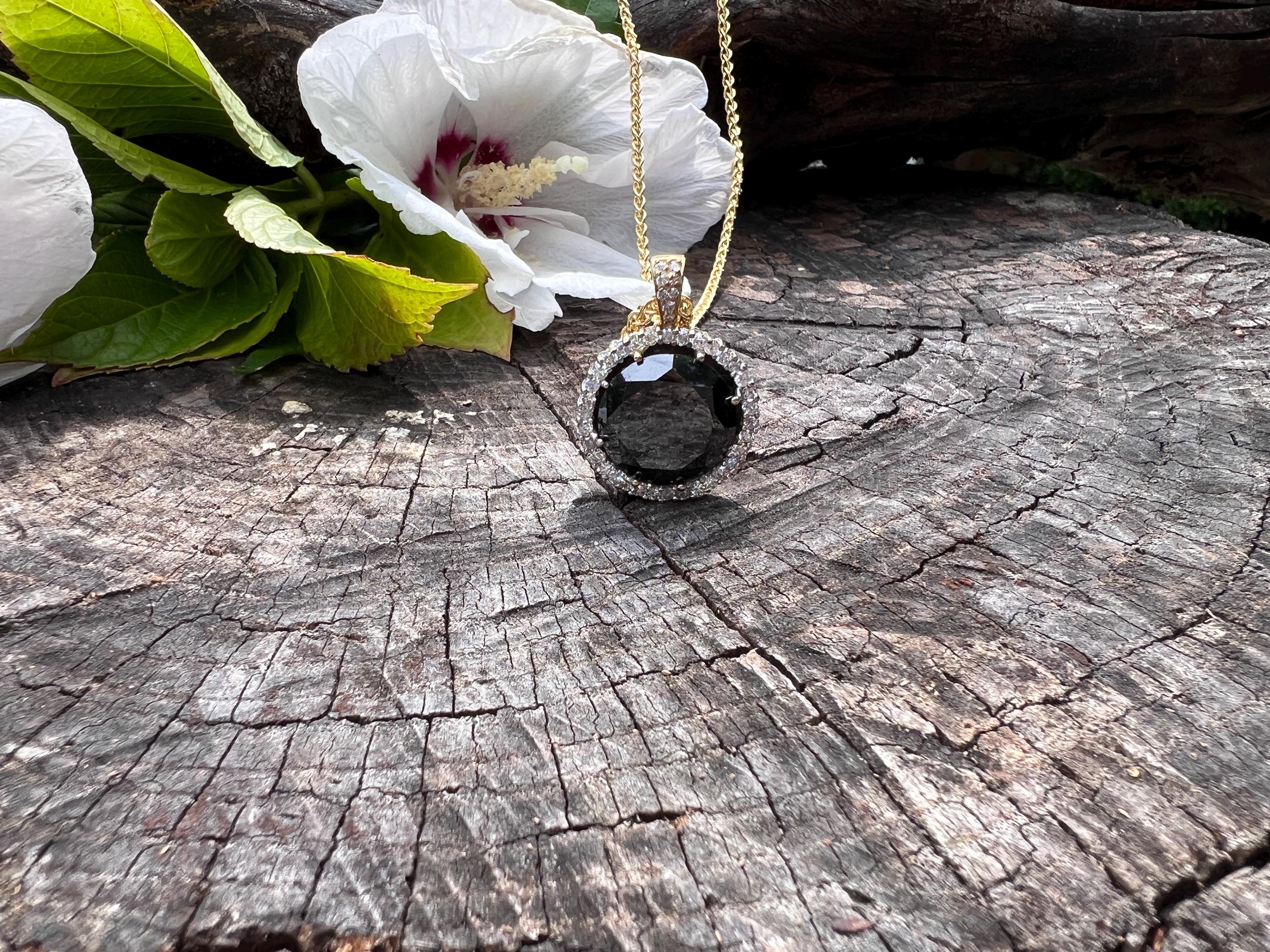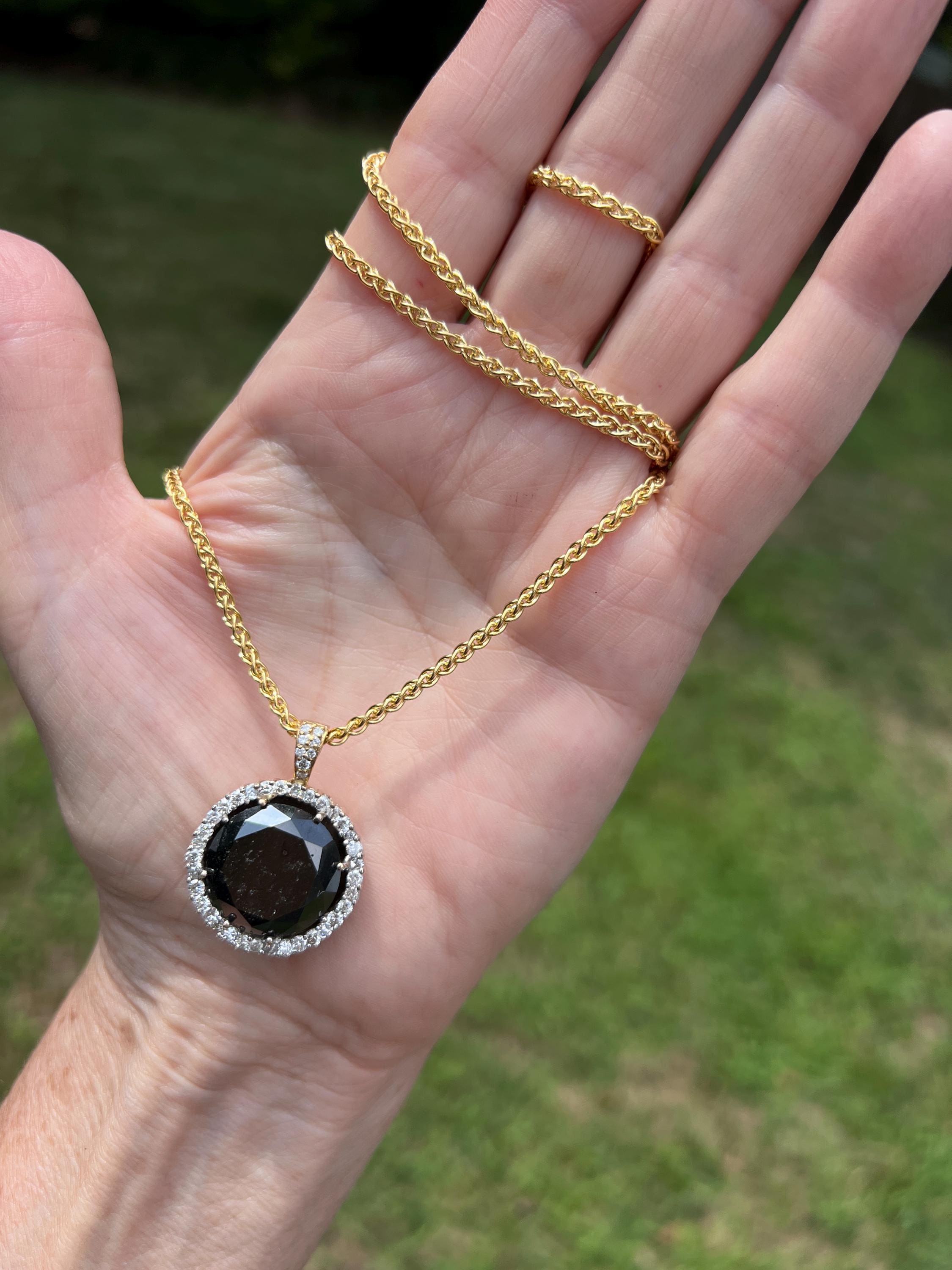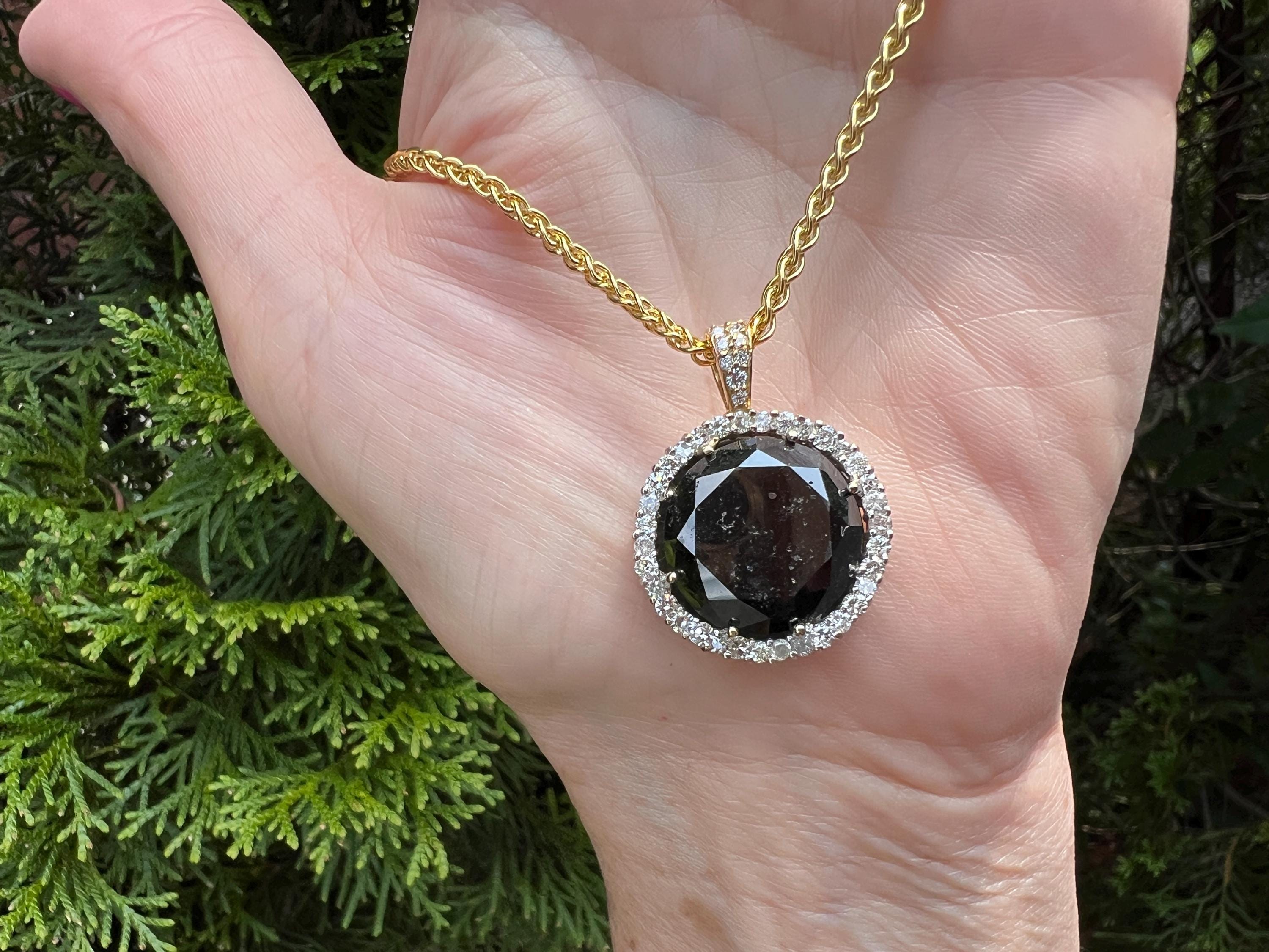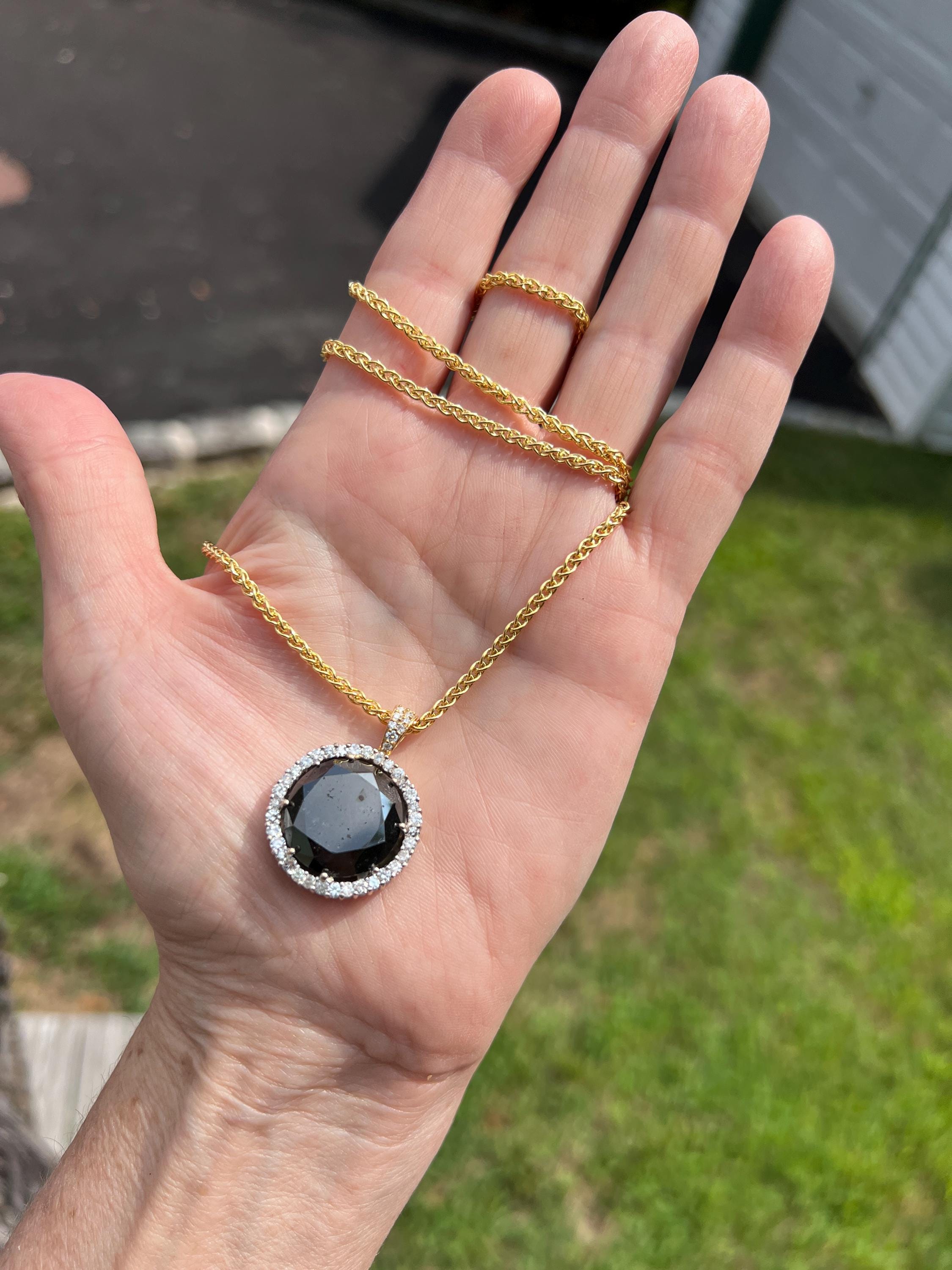 This impressive 14k yellow gold black and white diamond pendant is a statement maker. It dates from the 1970’s. Floating inside of a white diamond studded circle is the large round faceted jet black diamond bringing the sensation. The round shaped black diamond is framed by round dazzling white diamonds. The black diamond weighs 19.03 ct. The white diamonds have a total weight of 1.43 ct. They are H/I in color and VS2/SI1 in clarity. This exquisiteness is all suspended on a lovely yellow gold chain. Extreme elegance. The chain measures 22". The chain weighs 5.90 grams. The pendant measures 1 3/16" x 7/8" including the bale. The pendant weighs 9.75 grams. It is marked 14k.
