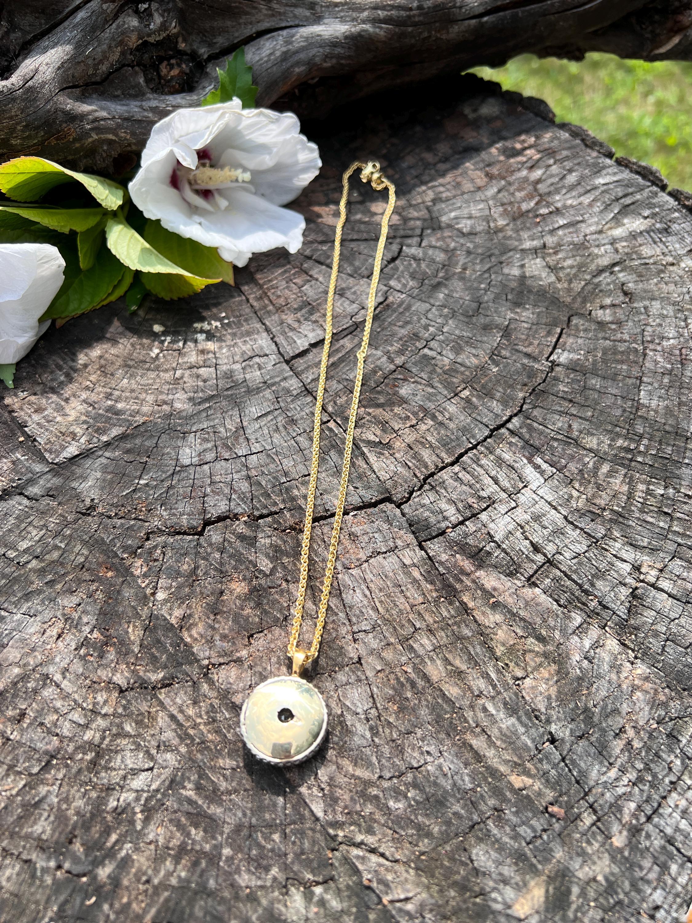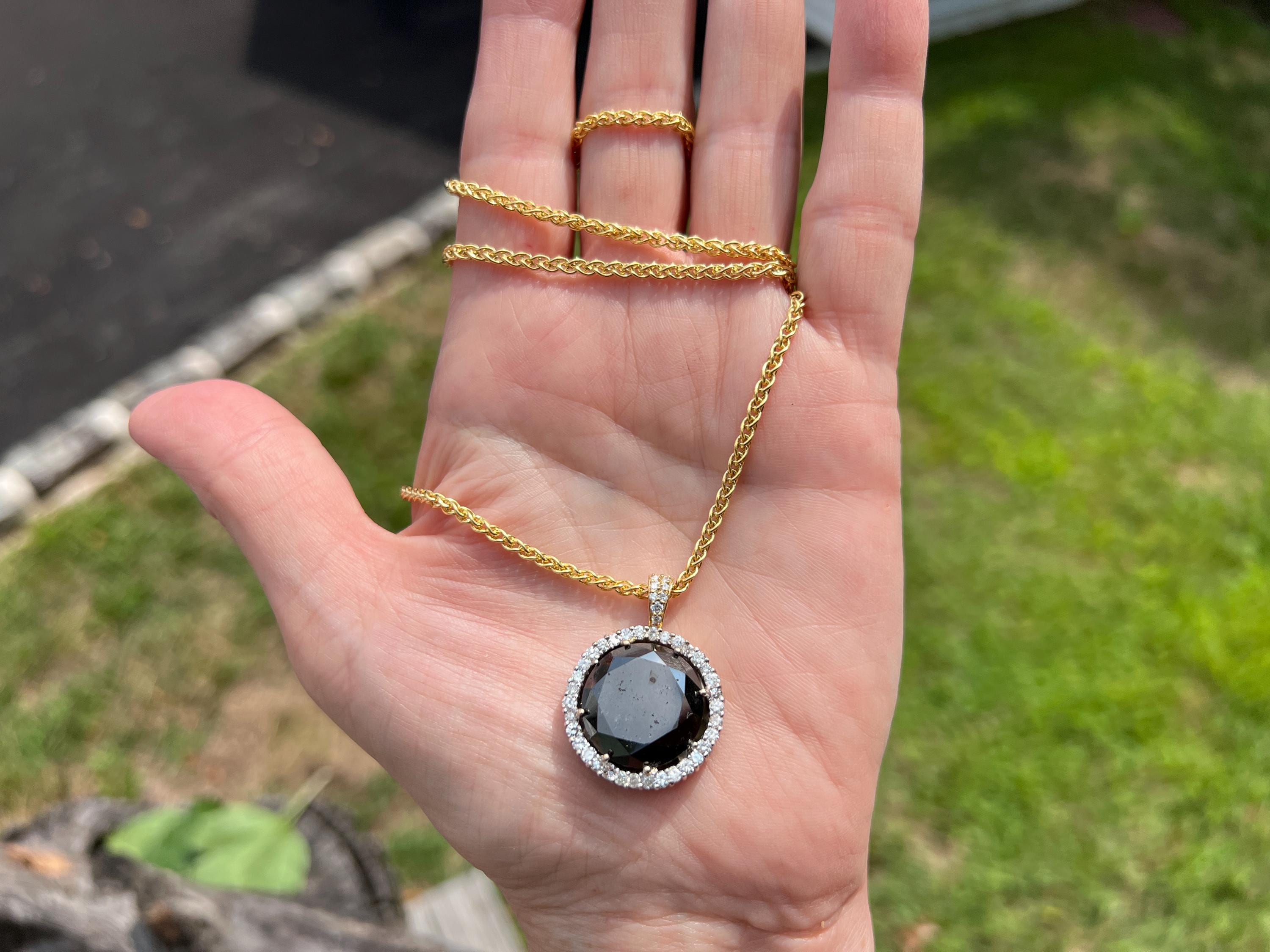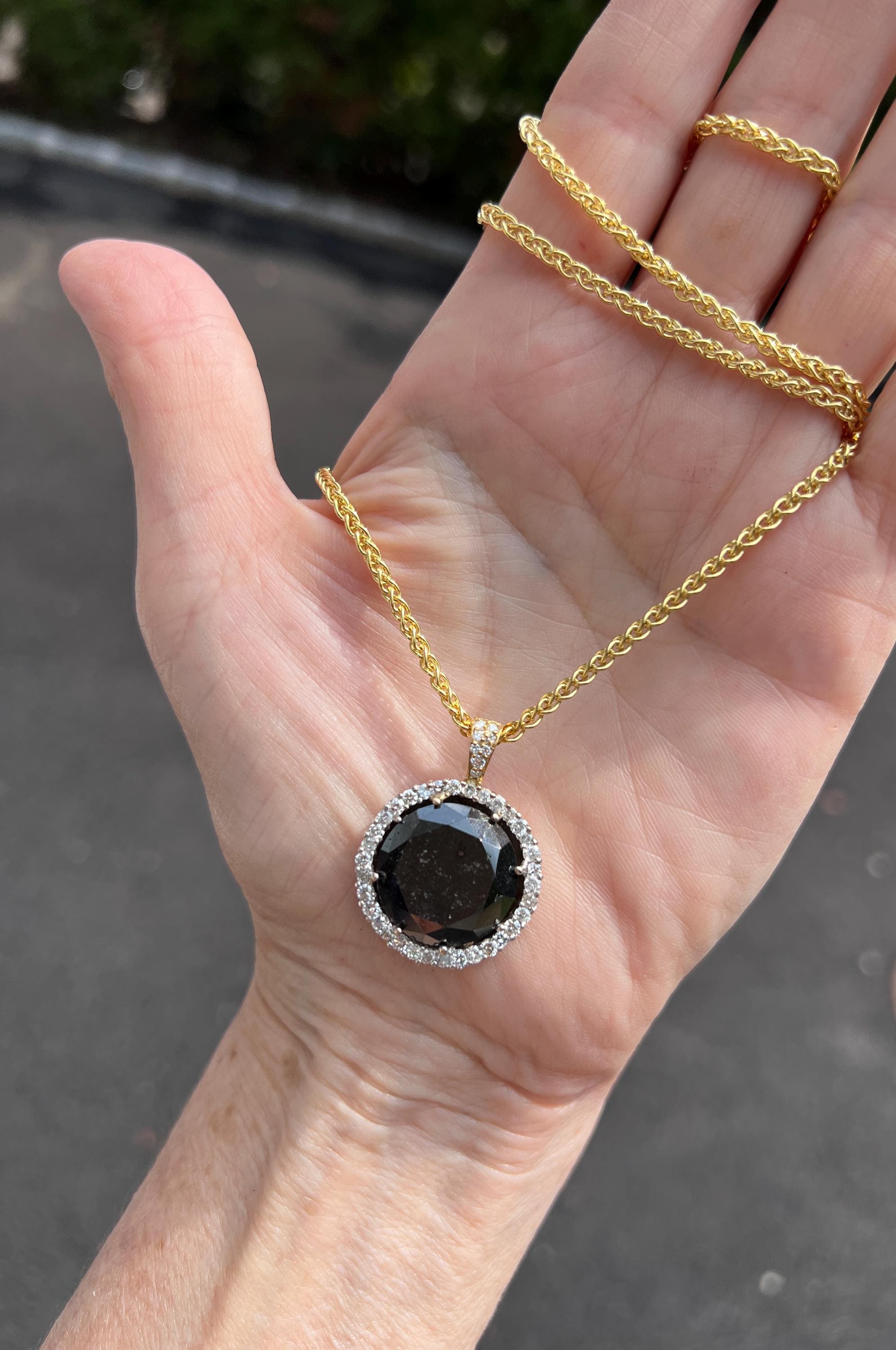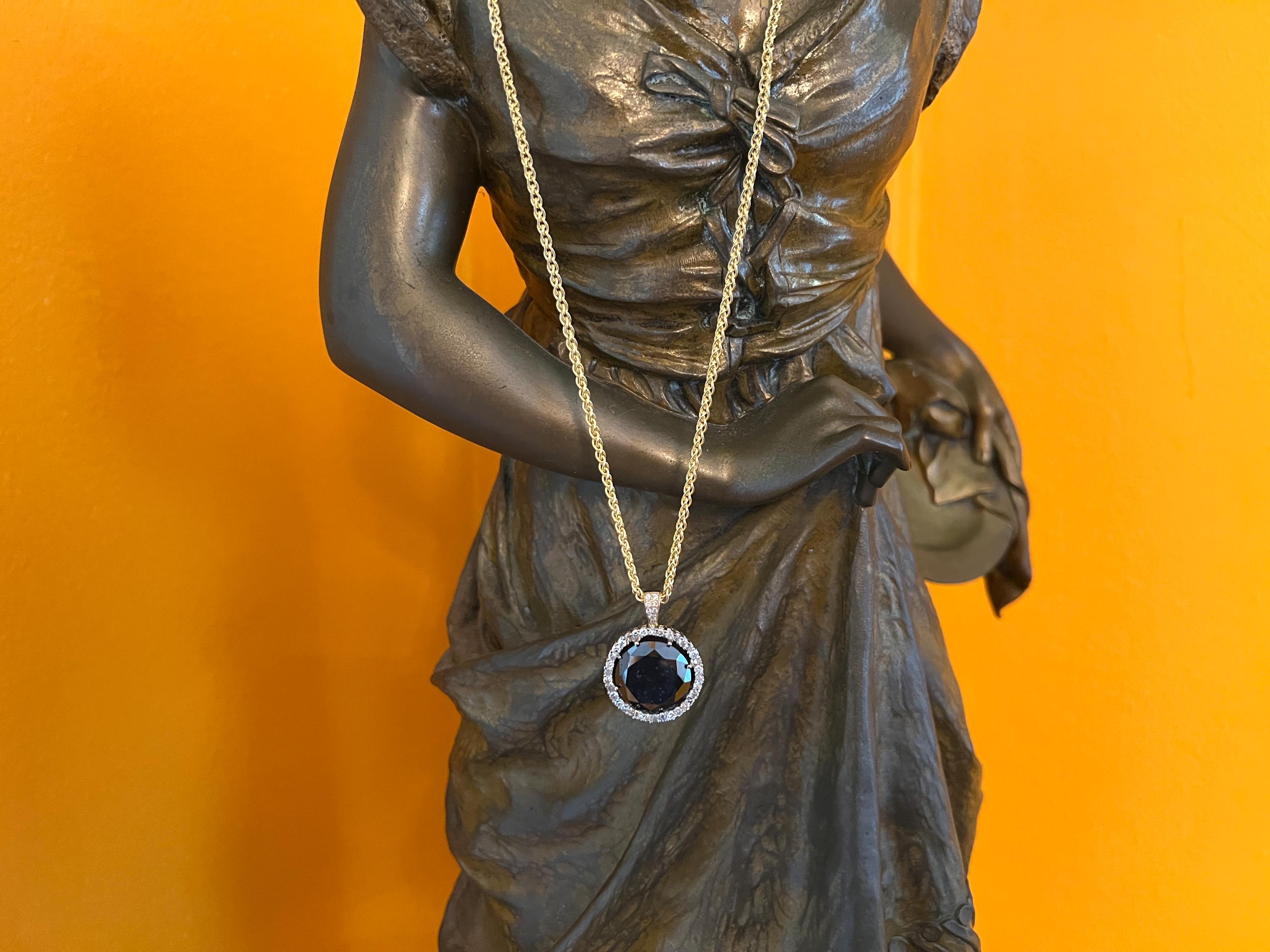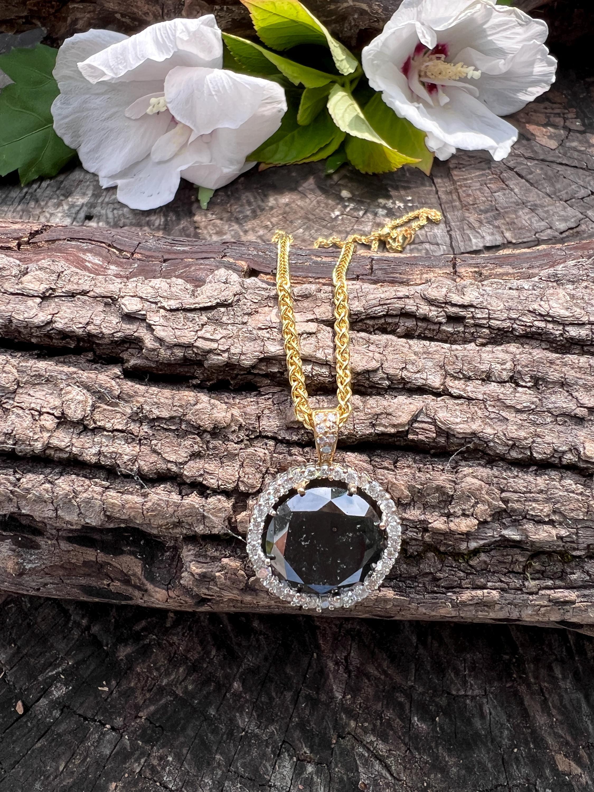 This impressive 14k yellow gold black and white diamond pendant is a statement maker. It dates from the 1970’s. Floating inside of a white diamond studded circle is the large round faceted jet black diamond bringing the sensation. The round shaped black diamond is framed by round dazzling white diamonds. The black diamond weighs 19.03 ct. The white diamonds have a total weight of 1.43 ct. They are H/I in color and VS2/SI1 in clarity. This exquisiteness is all suspended on a lovely yellow gold chain. Extreme elegance. The chain measures 22". The chain weighs 5.90 grams. The pendant measures 1 3/16" x 7/8" including the bale. The pendant weighs 9.75 grams. It is marked 14k.