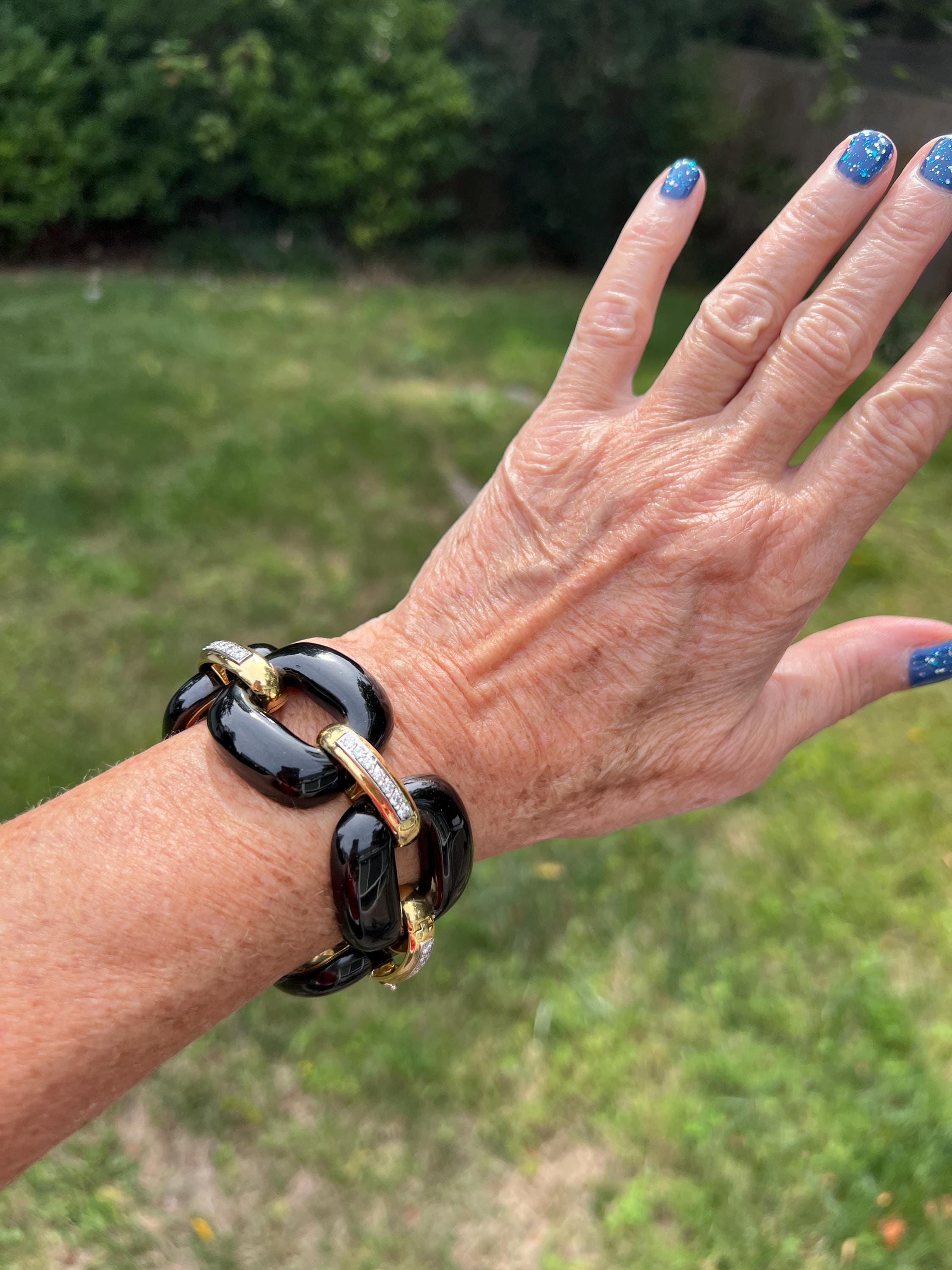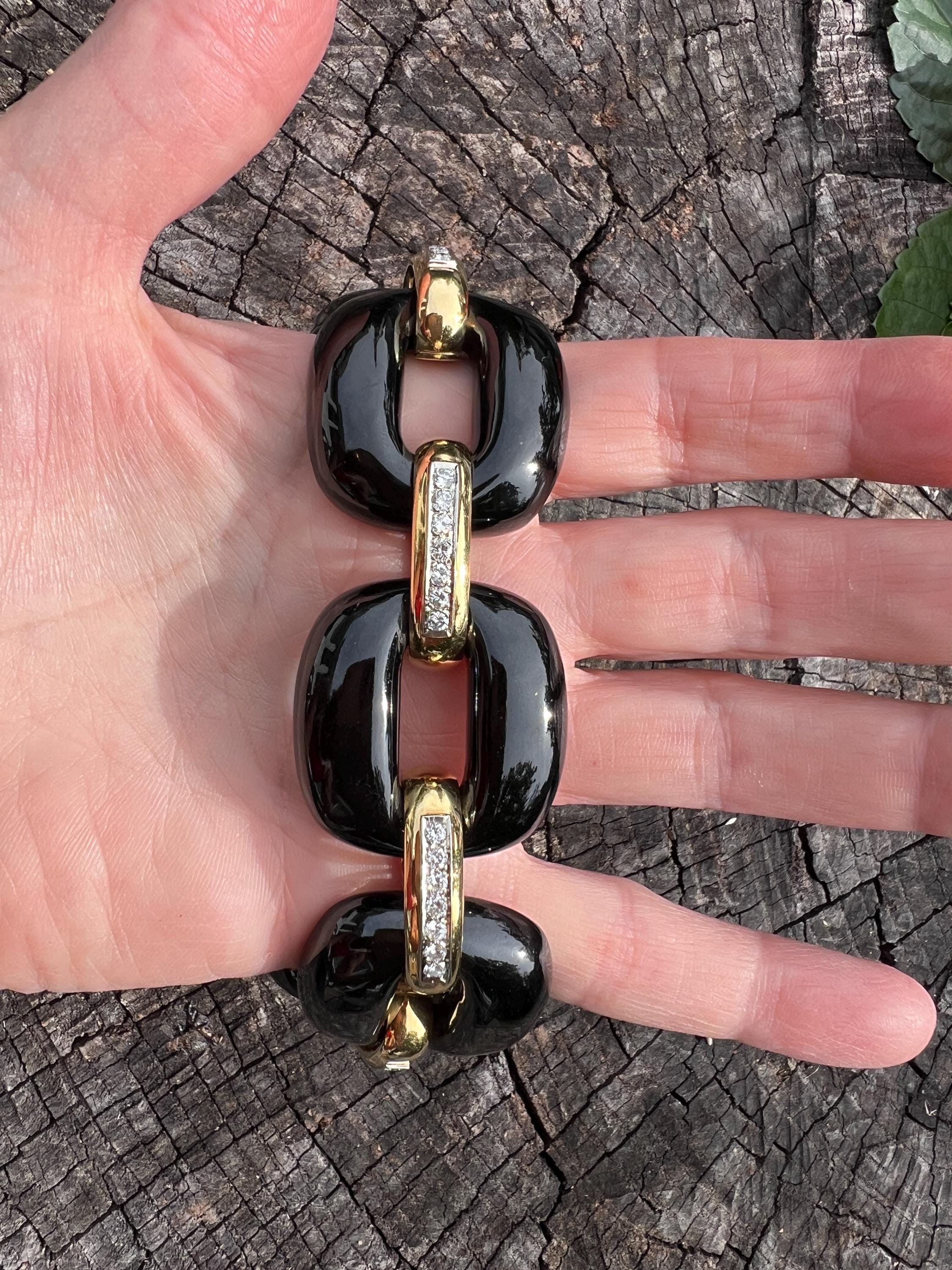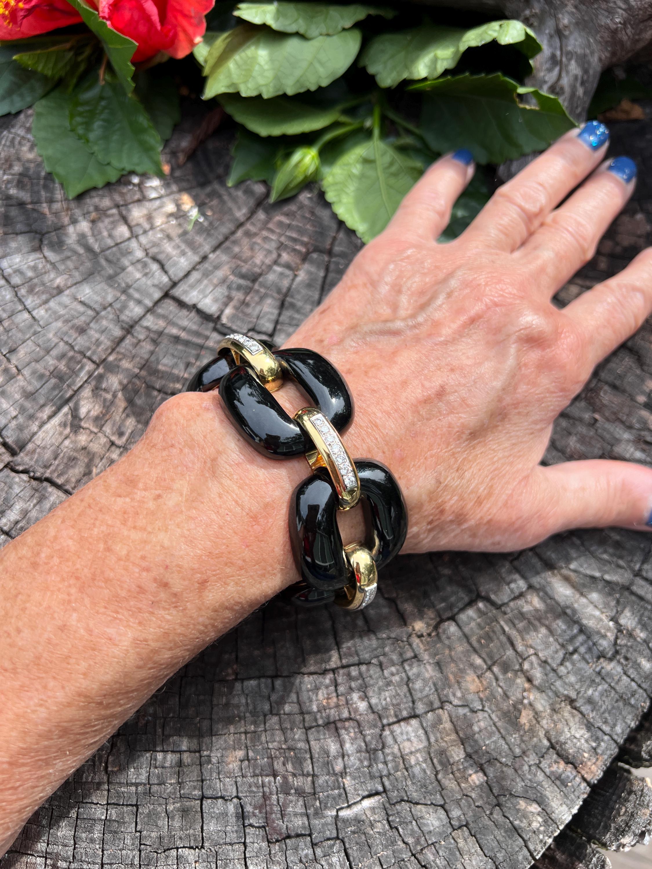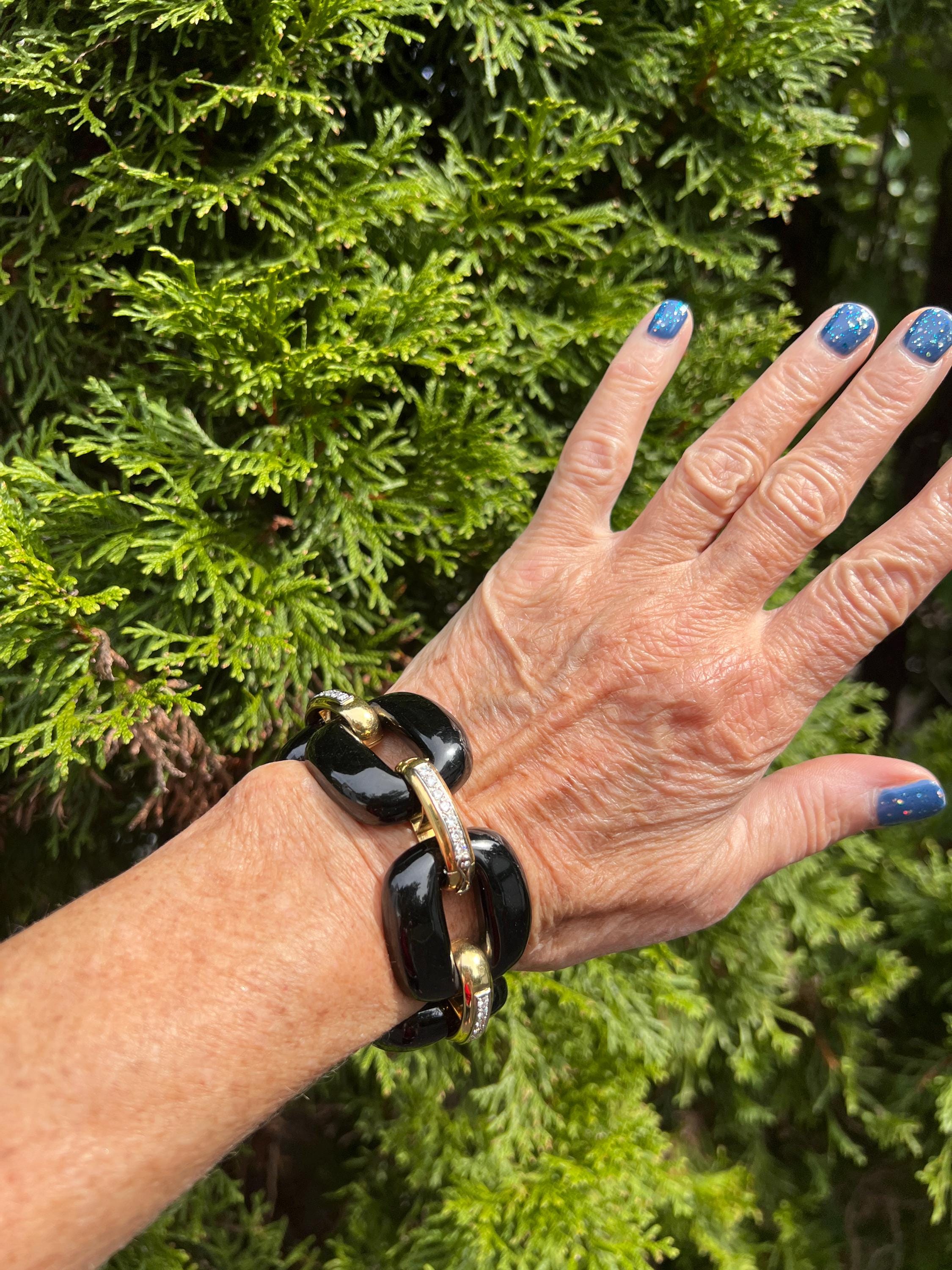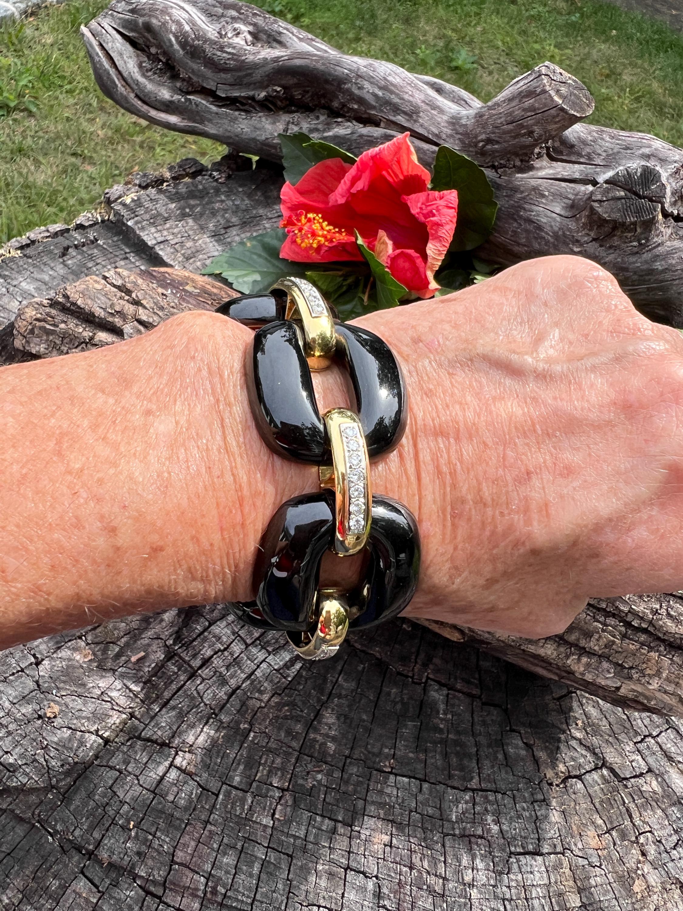 This striking onyx and diamond bracelet is set in 18k yellow gold. It dates from the 1960s. With its open curved large oval pieces of jet black onyx interlocking with the smaller curved shaped pieces of gold studded with diamonds, the bracelet epitomizes glamour. The diamonds have a total approx. weight of 2.25 ct. The diamonds are G in color and VS1 in clarity. An imposing piece of magnificence. A provocative creation on your wrist. The bracelet measures 7 1/2" long and 1 3/16" wide. It weighs 109.32 grams. It is marked 18k, Italy and 3A7A1.
