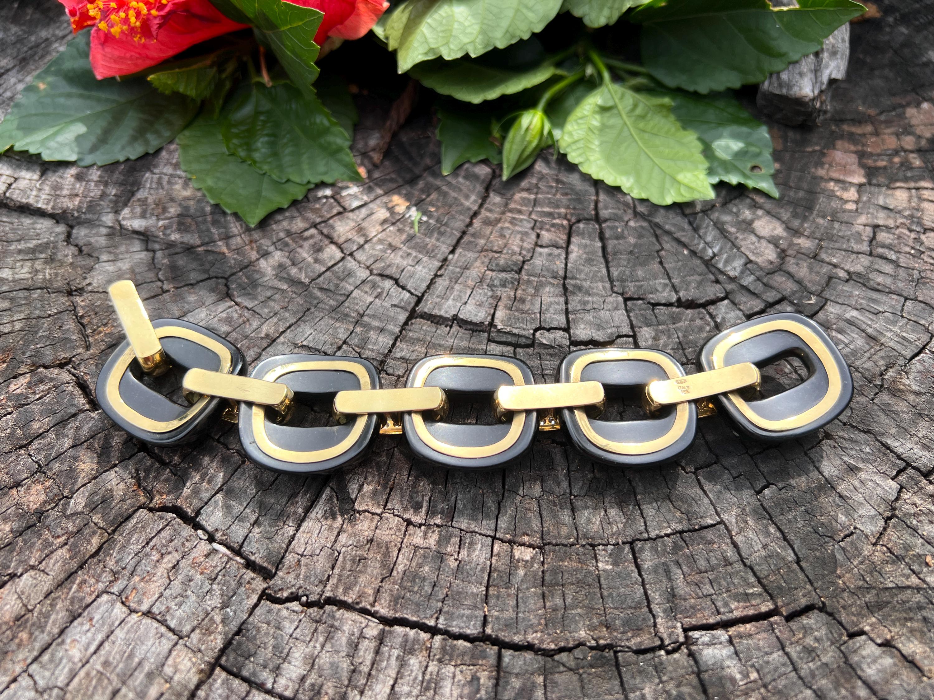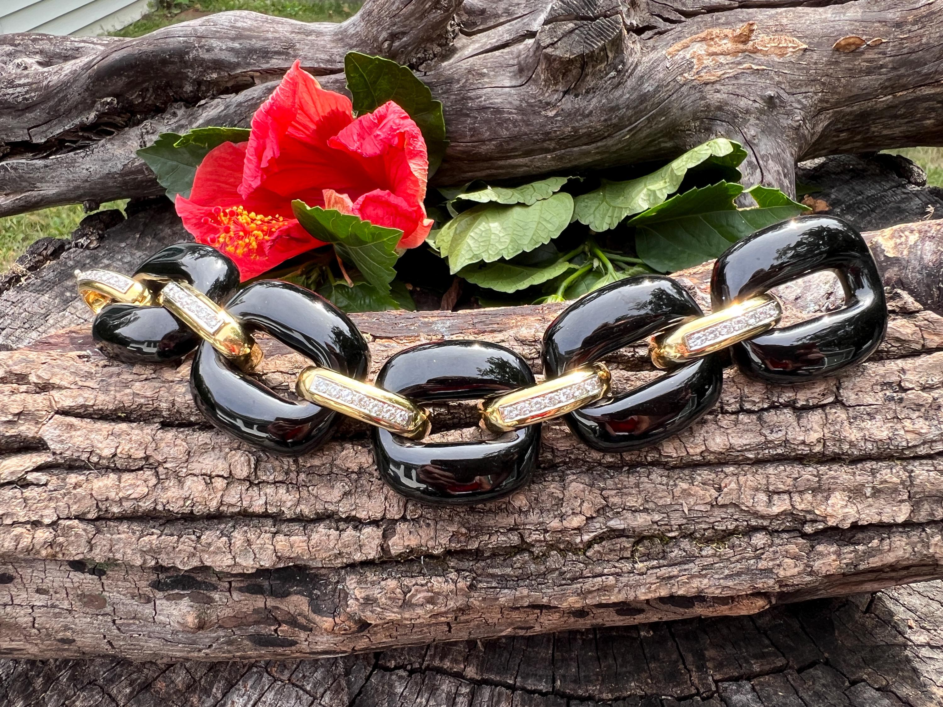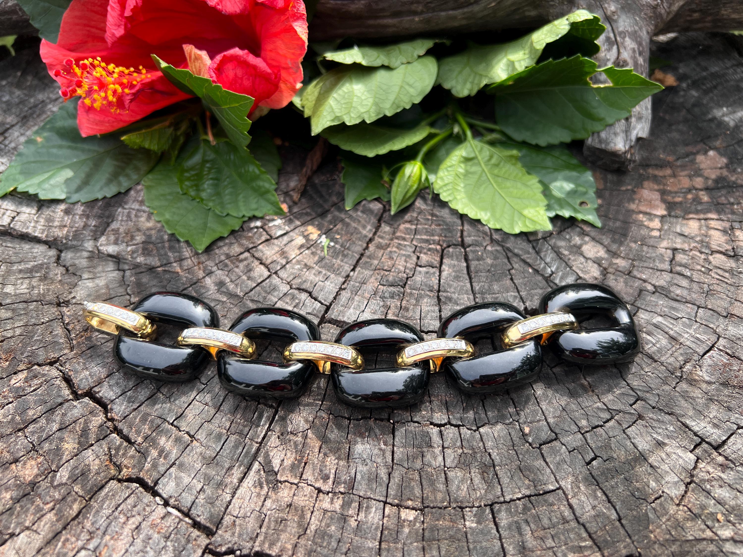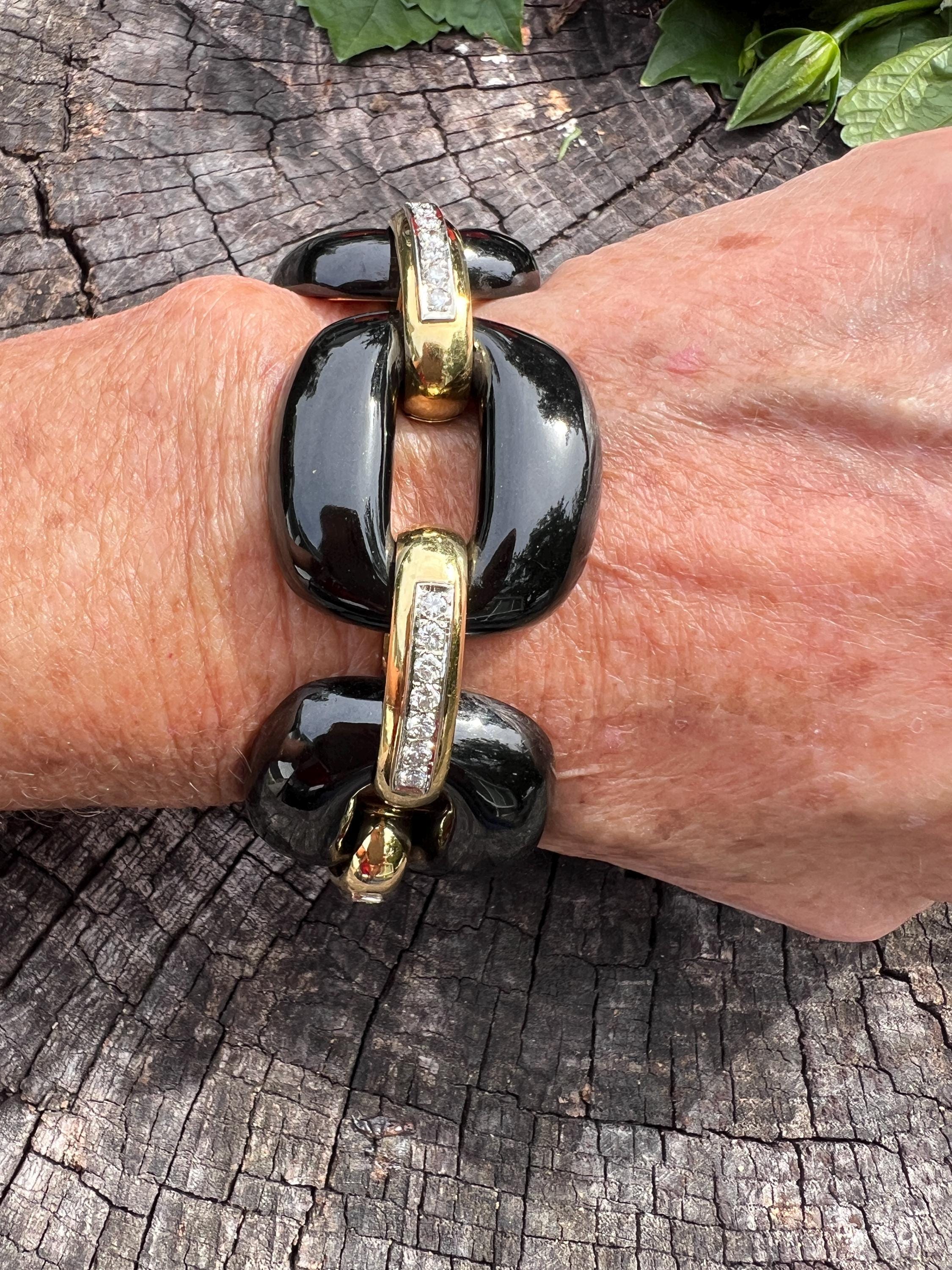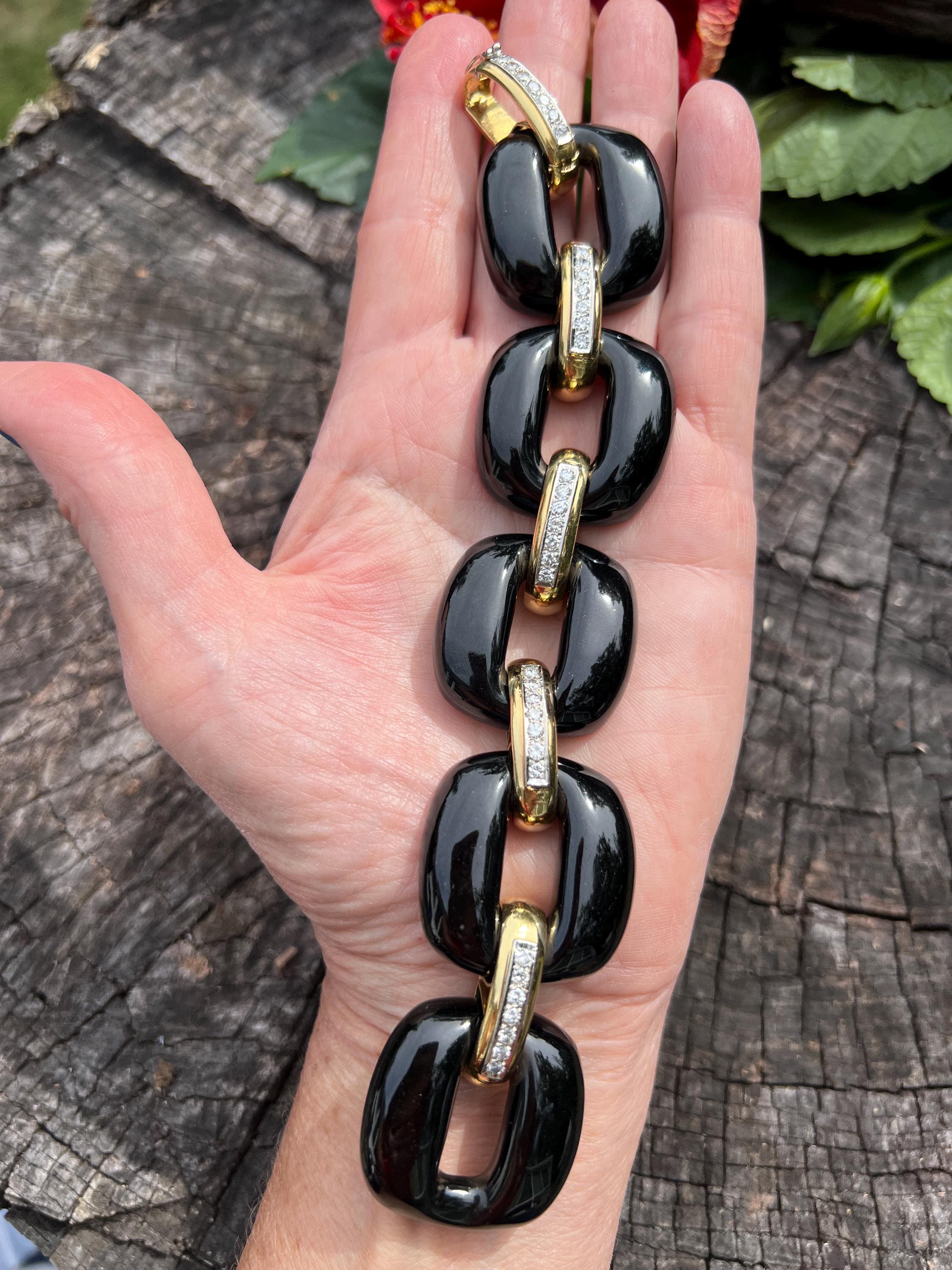 This striking onyx and diamond bracelet is set in 18k yellow gold. It dates from the 1960s. With its open curved large oval pieces of jet black onyx interlocking with the smaller curved shaped pieces of gold studded with diamonds, the bracelet epitomizes glamour. The diamonds have a total approx. weight of 2.25 ct. The diamonds are G in color and VS1 in clarity. An imposing piece of magnificence. A provocative creation on your wrist. The bracelet measures 7 1/2" long and 1 3/16" wide. It weighs 109.32 grams. It is marked 18k, Italy and 3A7A1.