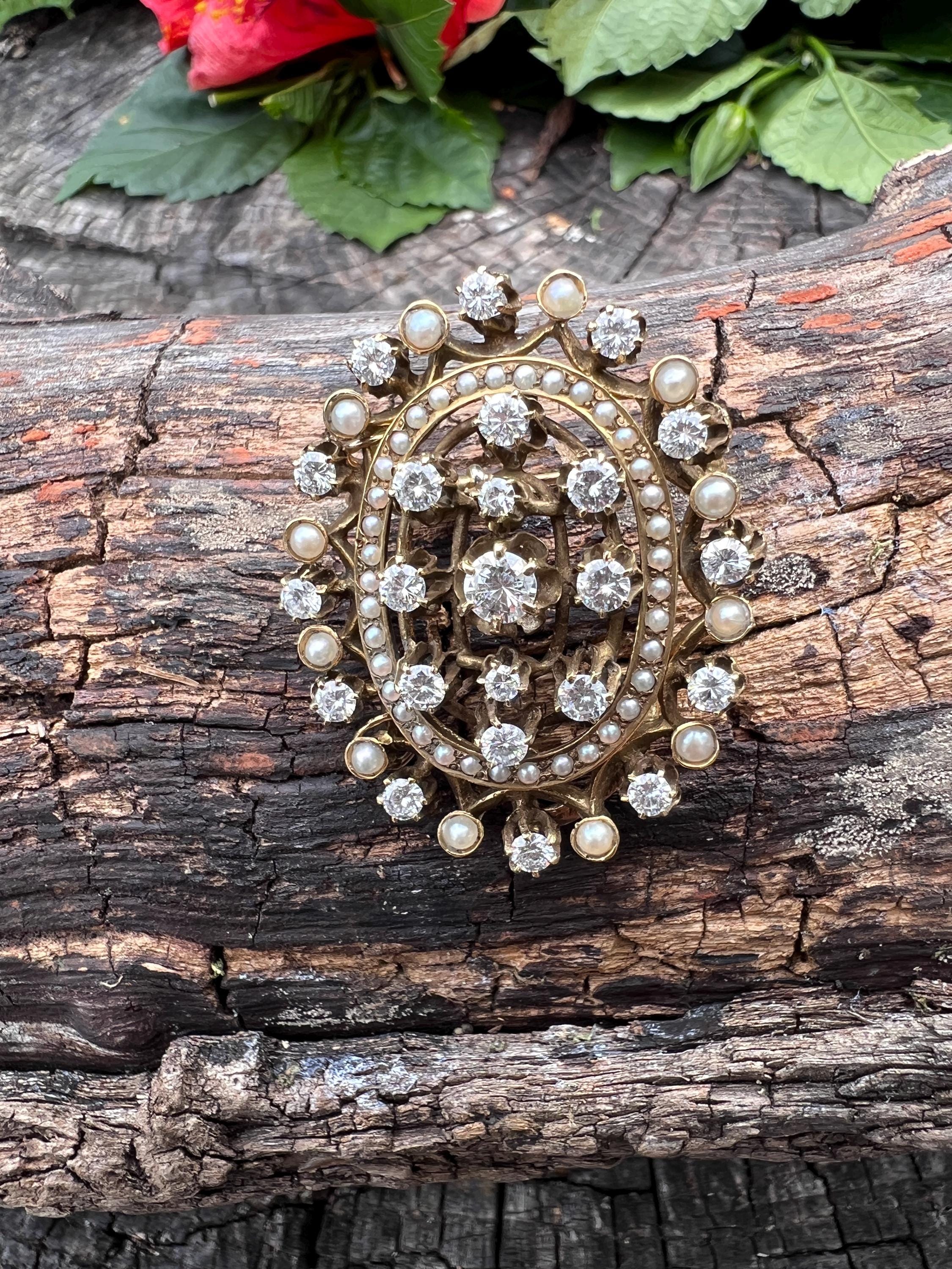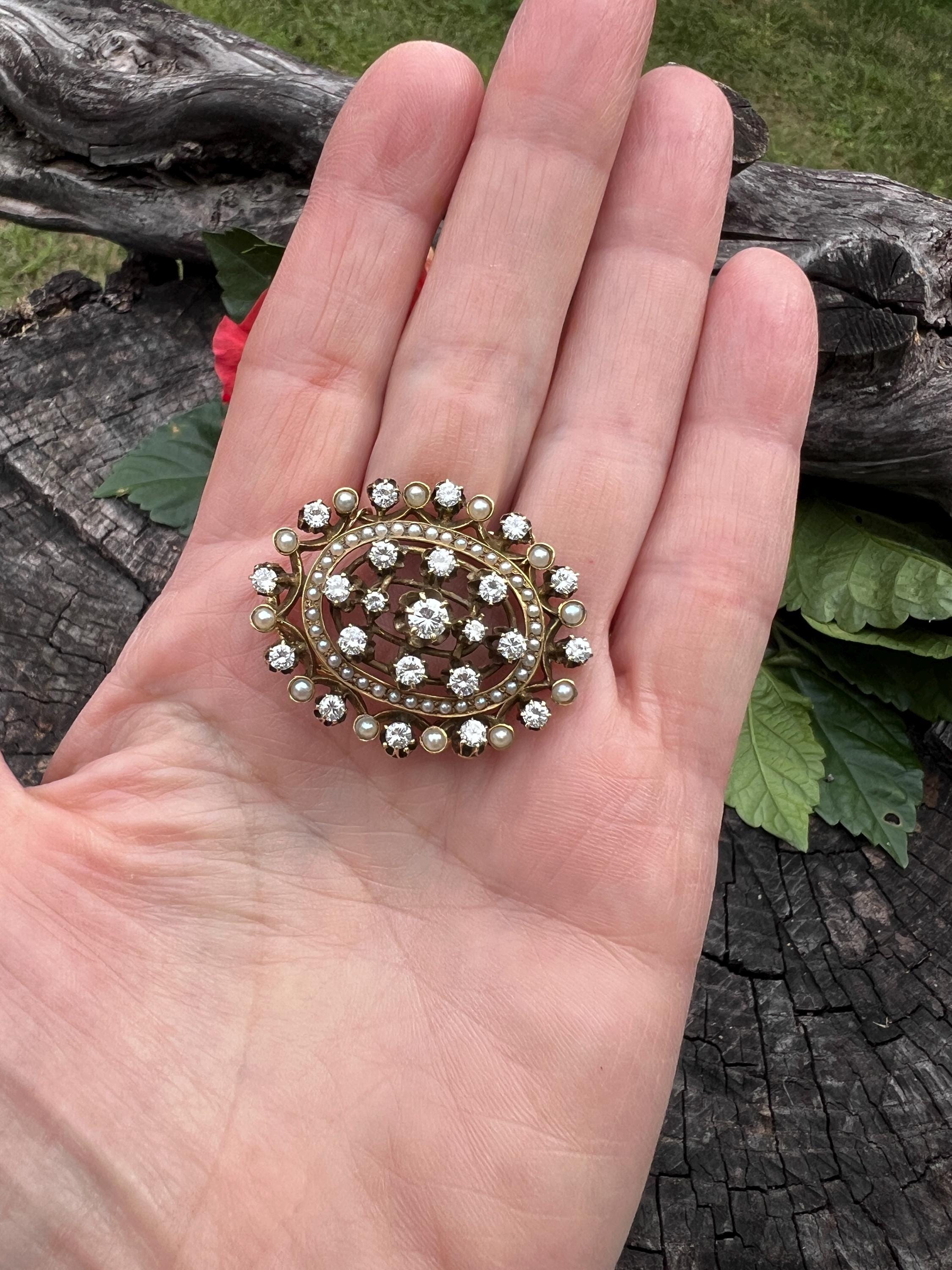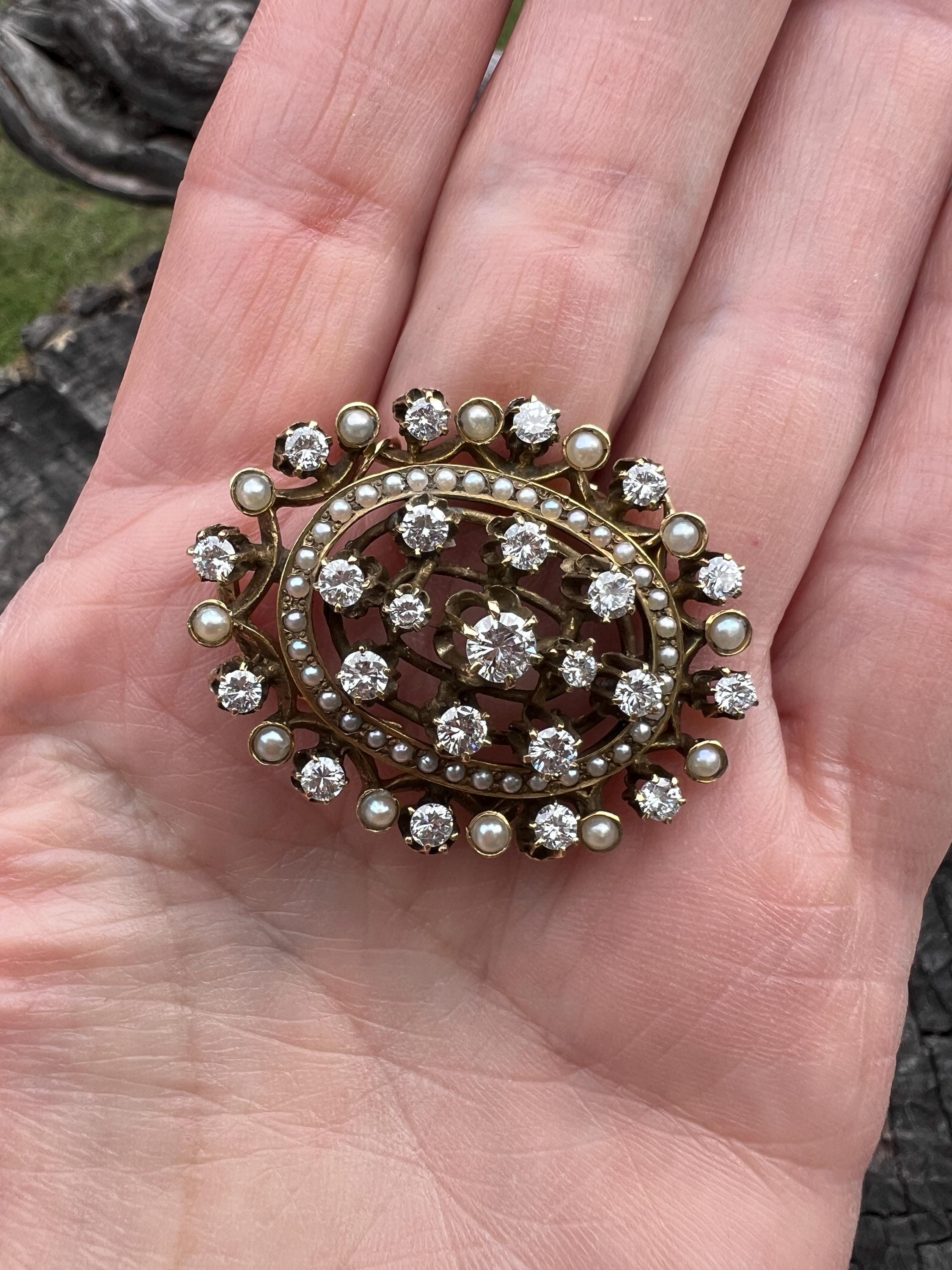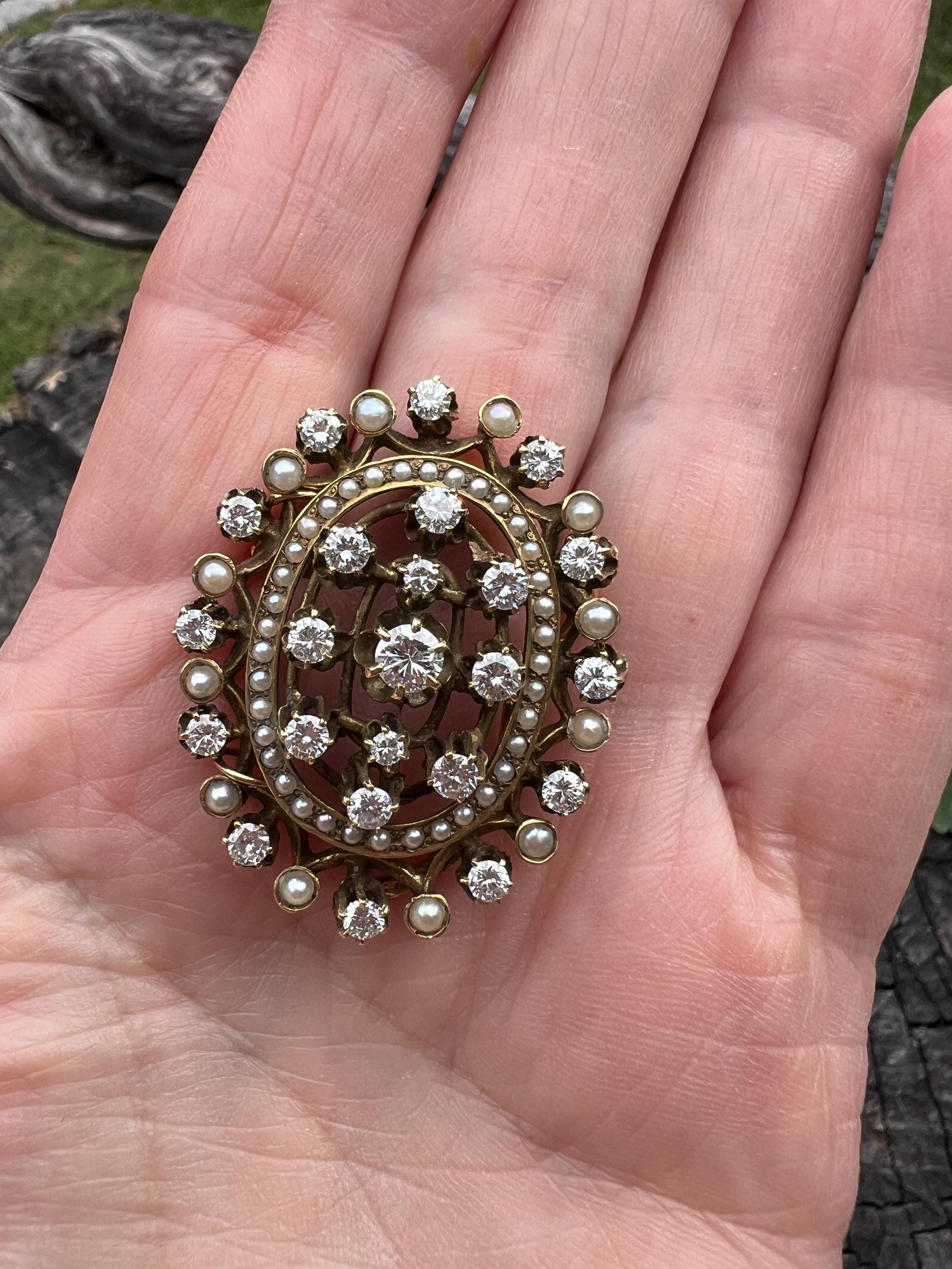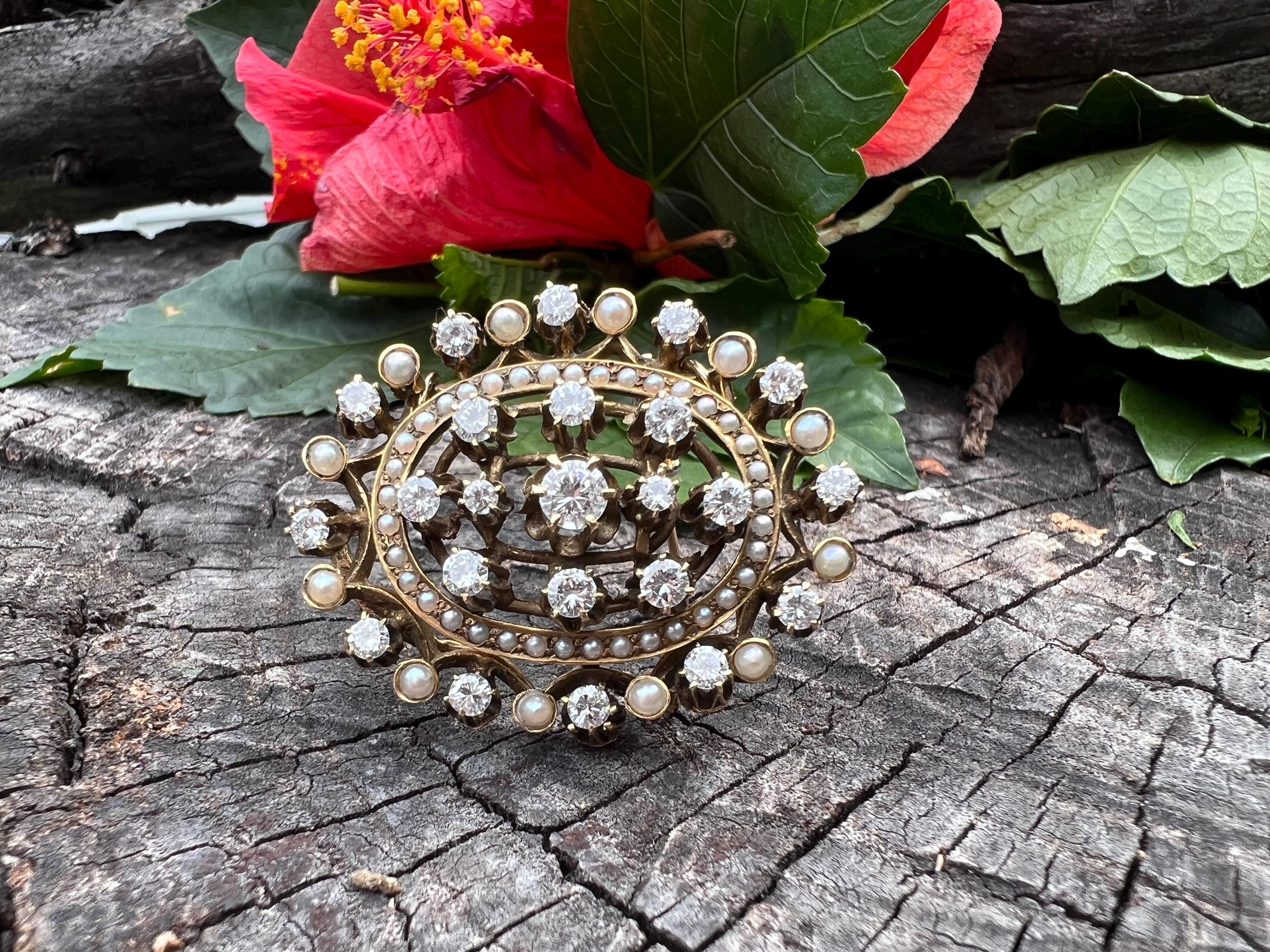 Set in 14k yellow gold this diamond and pearl oval pin is enchanting. It dates from the retro period of the late 1940s. The center cluster of radiantly twinkling round brilliant cut diamonds mingles with the outer swirls of the oval coated small sea pearls and diamonds for a wealth sparkle and richness. The diamonds have an approx. total weight of 2.50 ct. All diamonds are G/H color and VS2 clarity. A look of flourishing finesses. The pin measures 1 1/2" x 1". It weighs 12.70 grams.