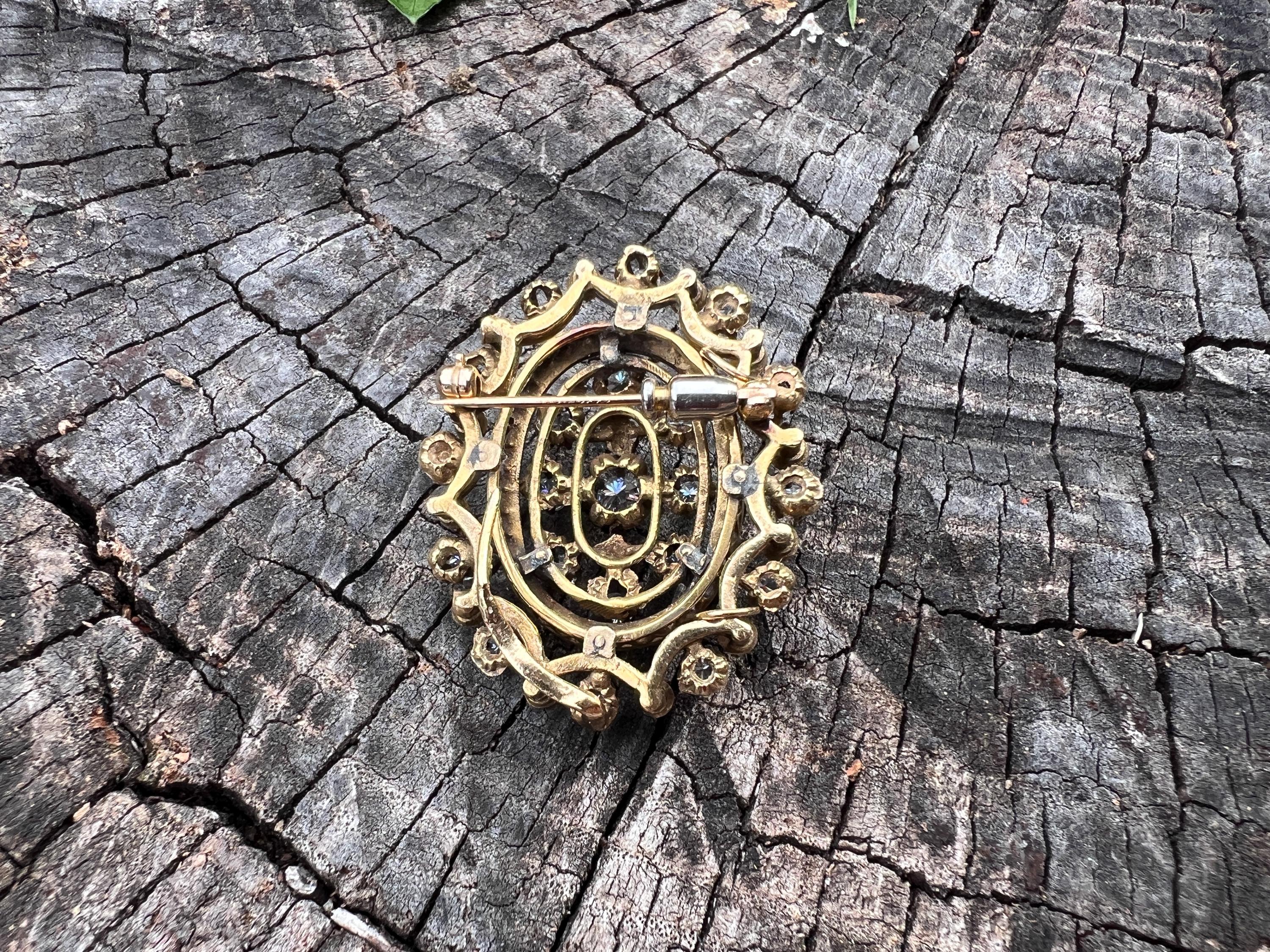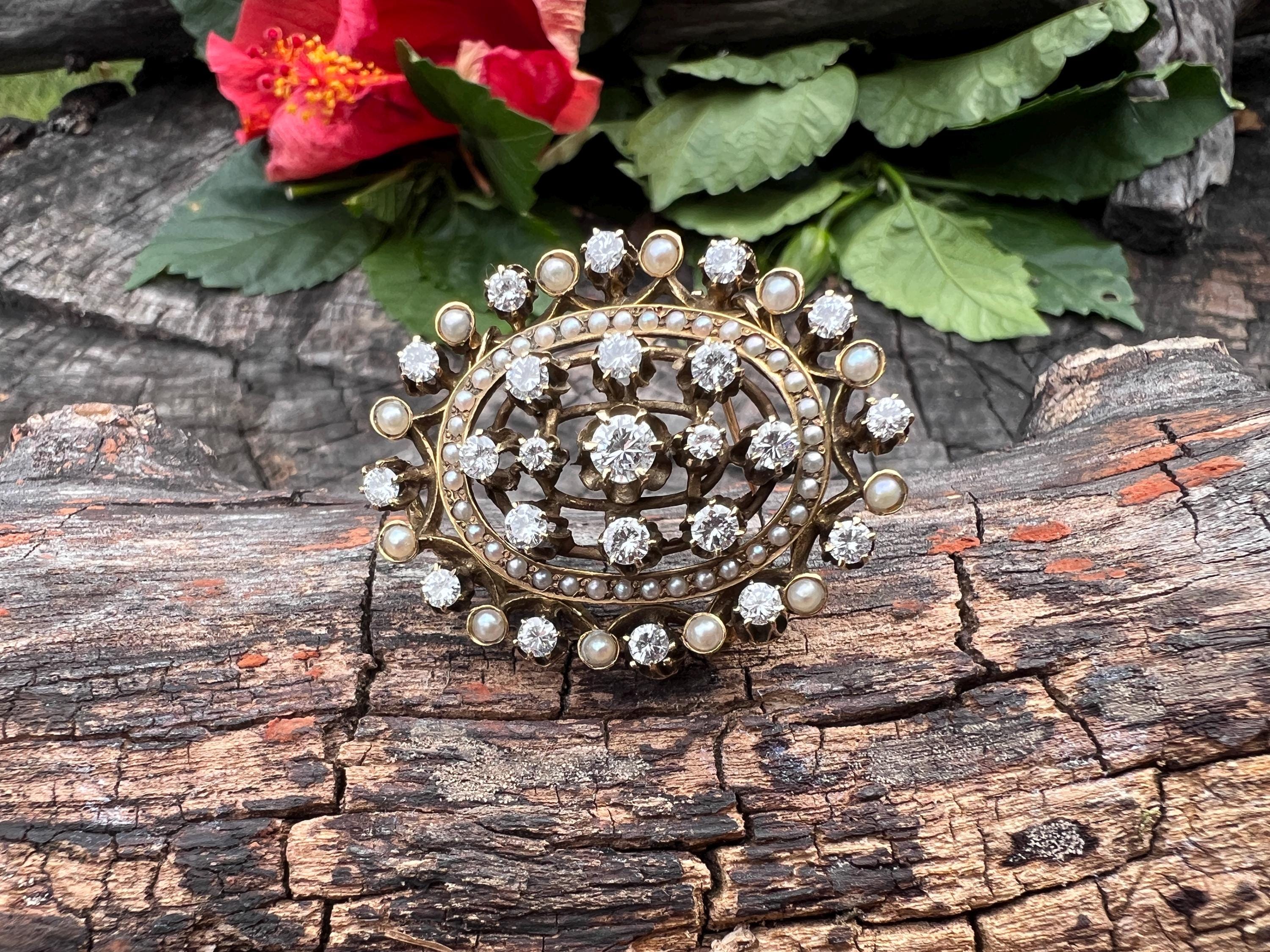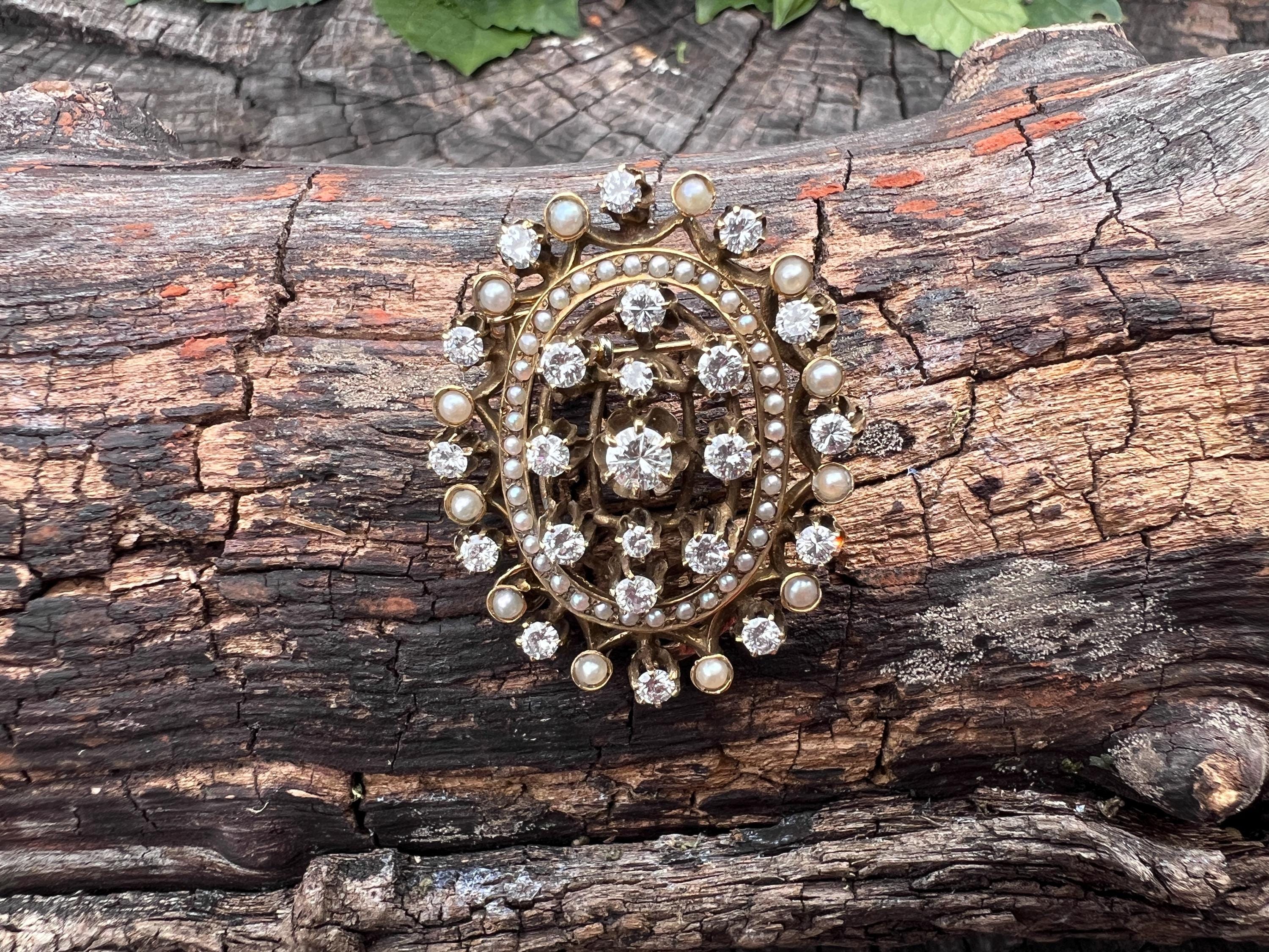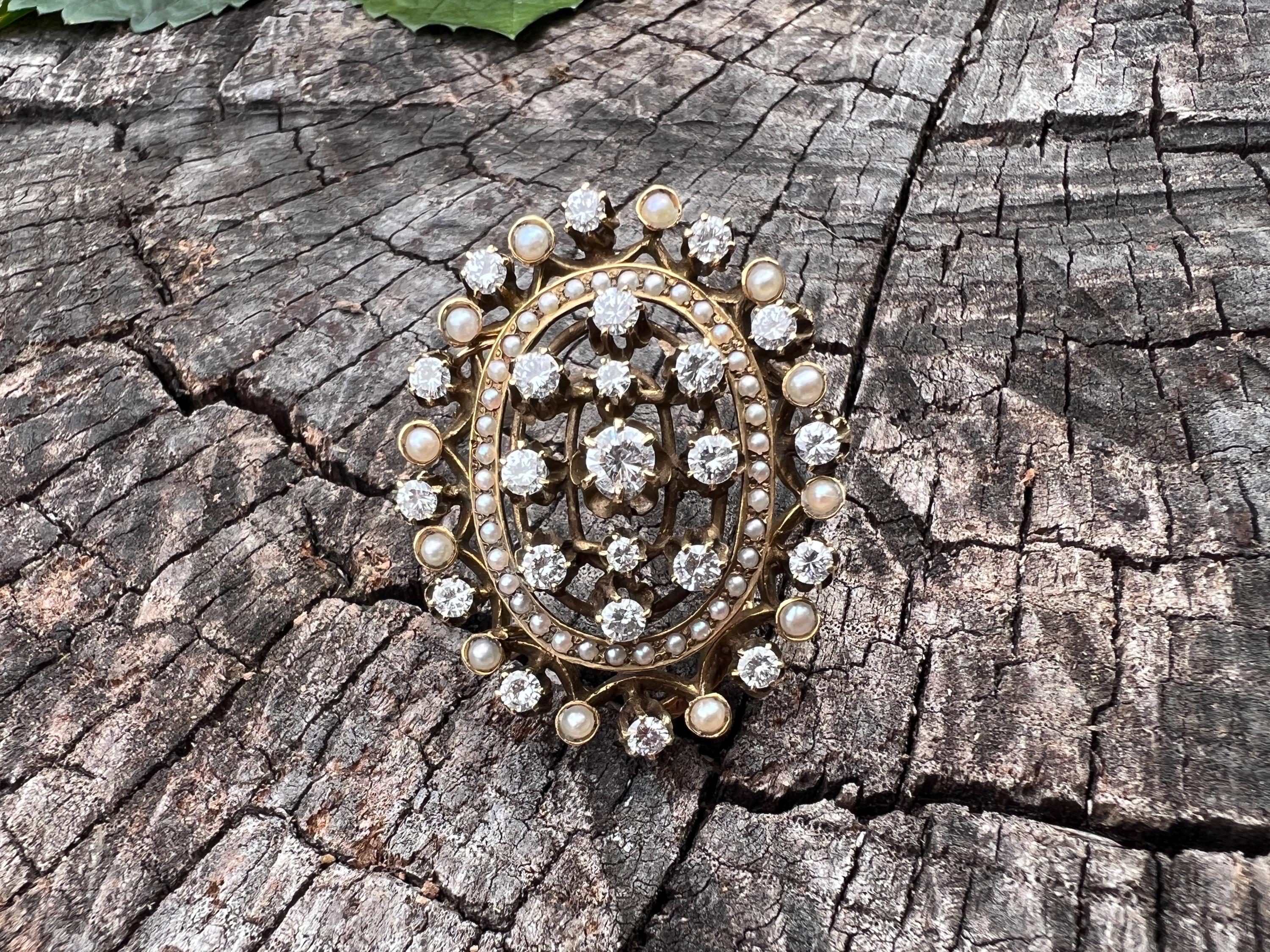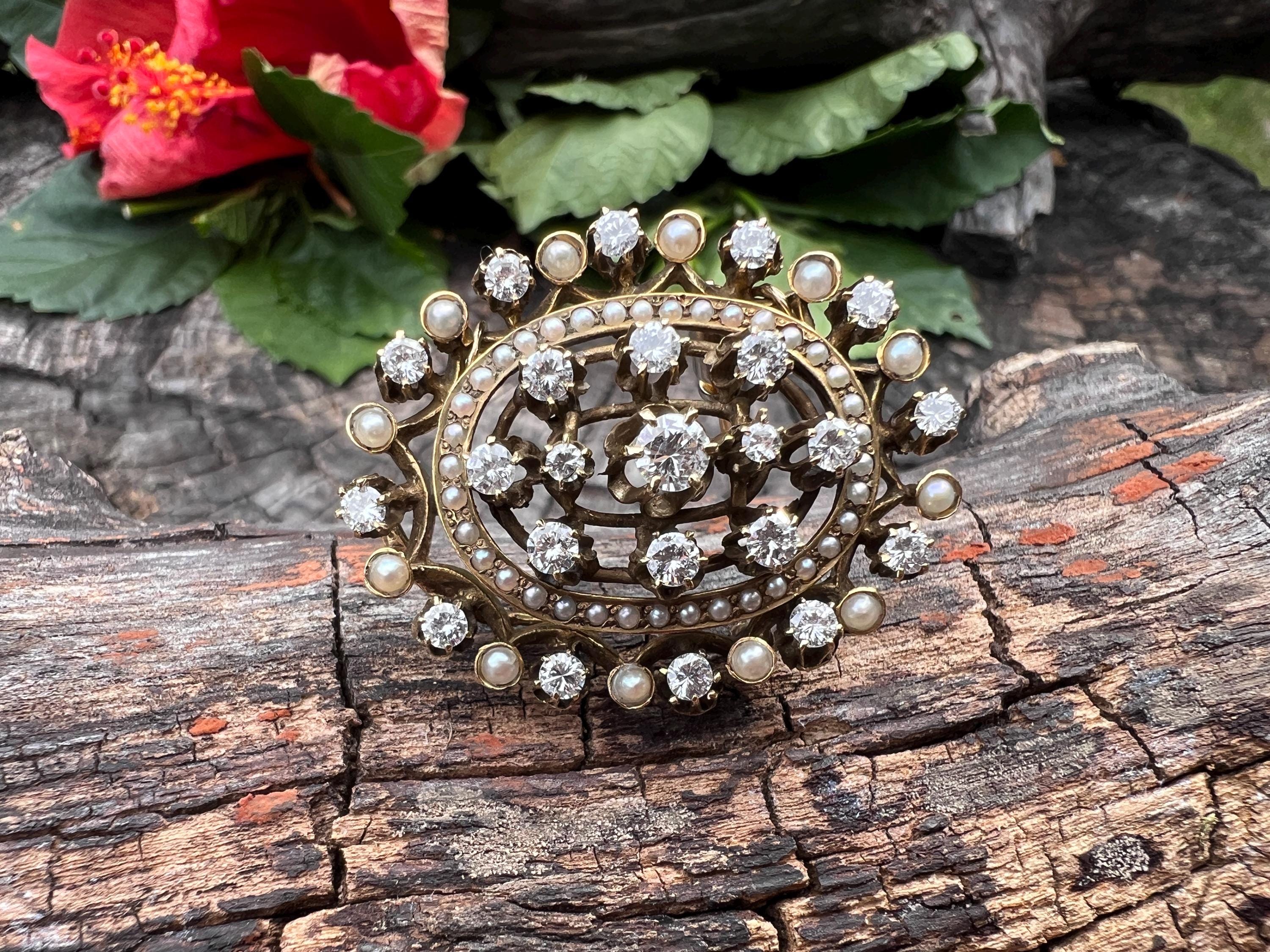 Set in 14k yellow gold this diamond and pearl oval pin is enchanting. It dates from the retro period of the late 1940s. The center cluster of radiantly twinkling round brilliant cut diamonds mingles with the outer swirls of the oval coated small sea pearls and diamonds for a wealth sparkle and richness. The diamonds have an approx. total weight of 2.50 ct. All diamonds are G/H color and VS2 clarity. A look of flourishing finesses. The pin measures 1 1/2" x 1". It weighs 12.70 grams.