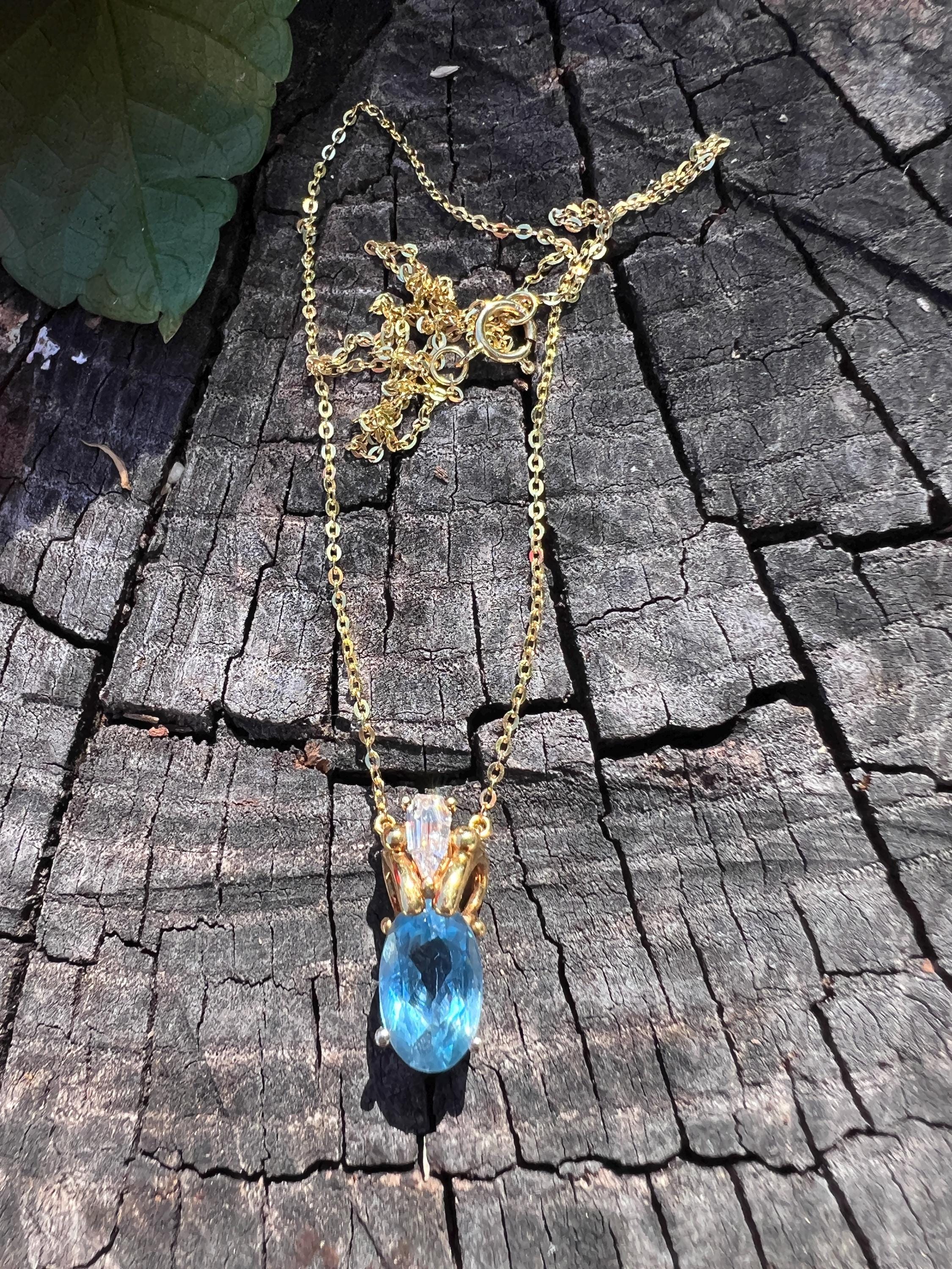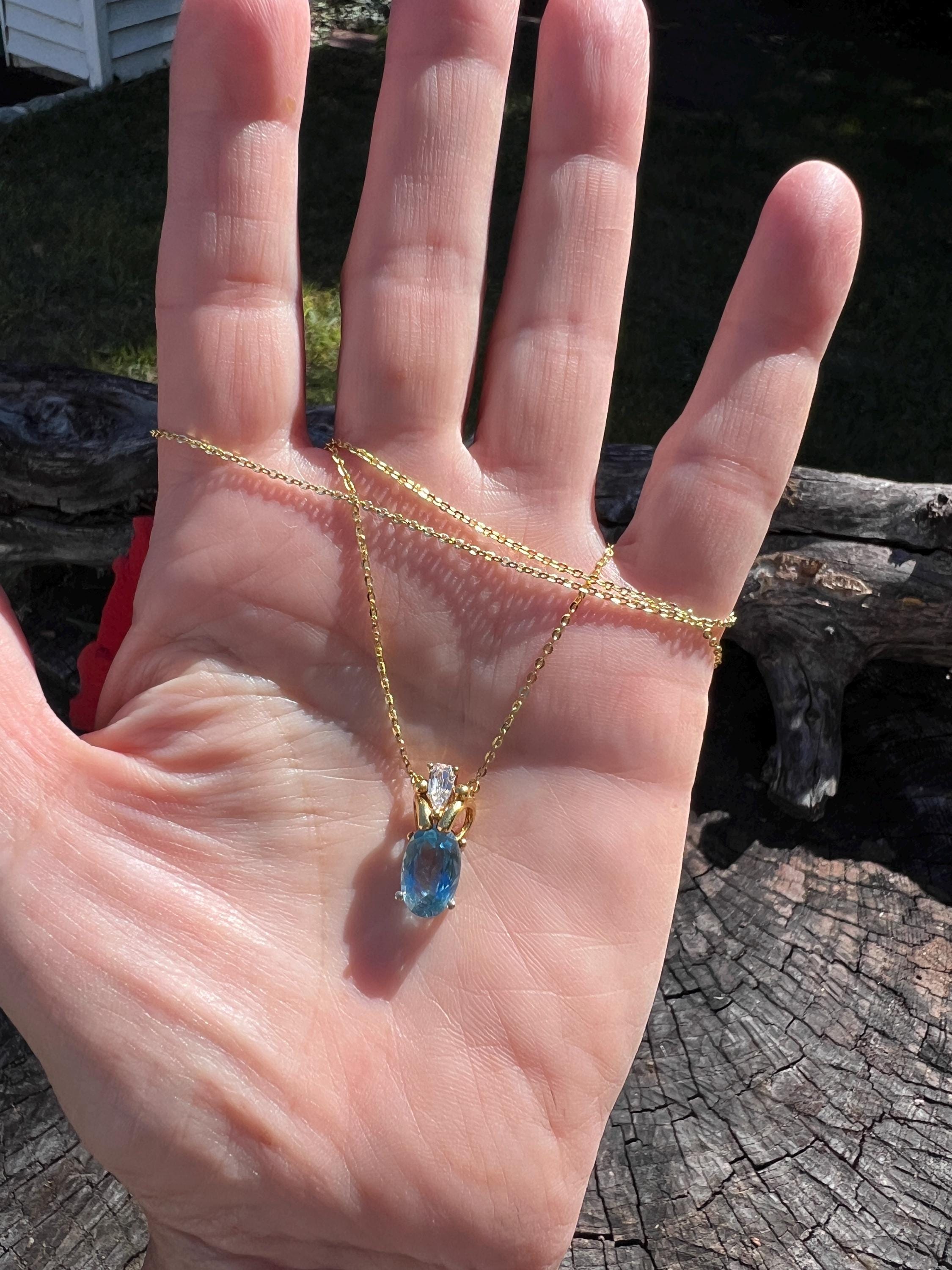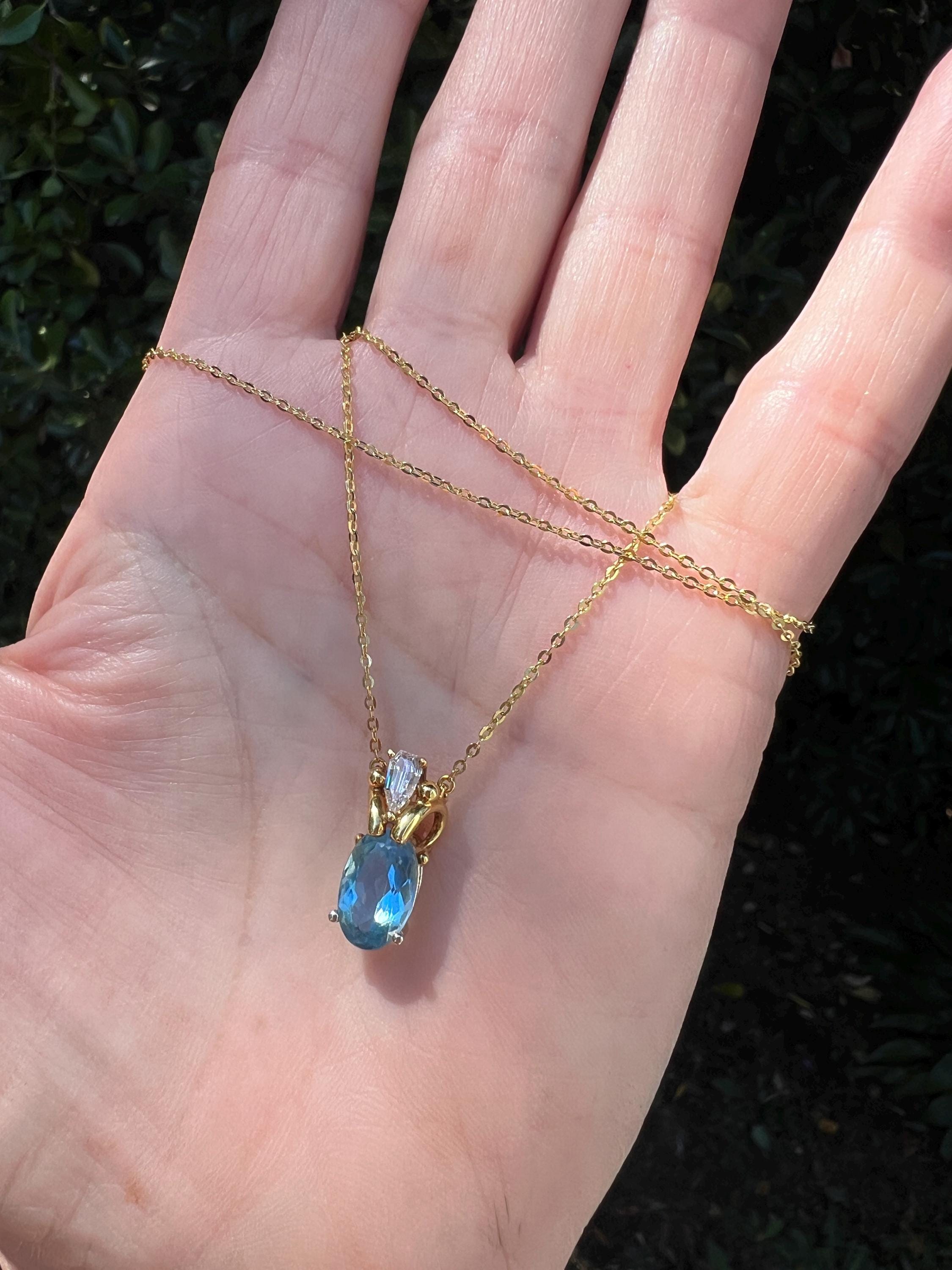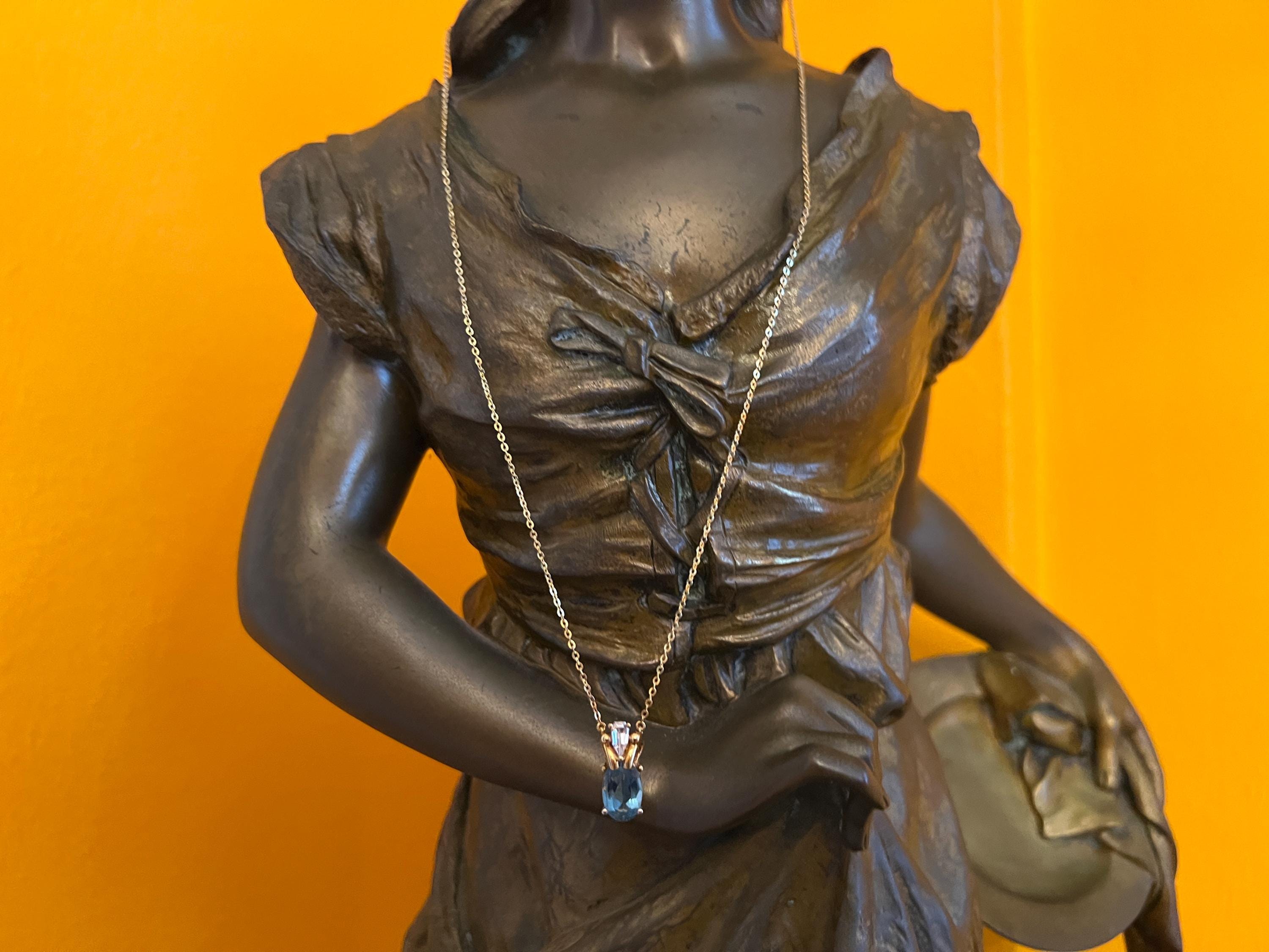 This impressive 18k yellow gold aquamarine and diamond pendant is a statement maker. It dates from the 1980’s. It comes from designer Henry Dunay. Suspended from the top of a kite shaped diamond bale is the oval shaped vividly ocean blue faceted aqua bringing the sensation. The aqua measures approx. 11 mm x 7.5 mm. The diamond has an approx. weight of .30 ct. The diamond is F in color and VS1 in clarity. All attached to an exquisite chain. Extreme elegance. The pendant measures 1 1/2" (including the bale) x 1/4". The chain measures 19". The entire piece weighs 4.48 grams. The pendant is marked Dunay and 18k. The chain is marked 18k.