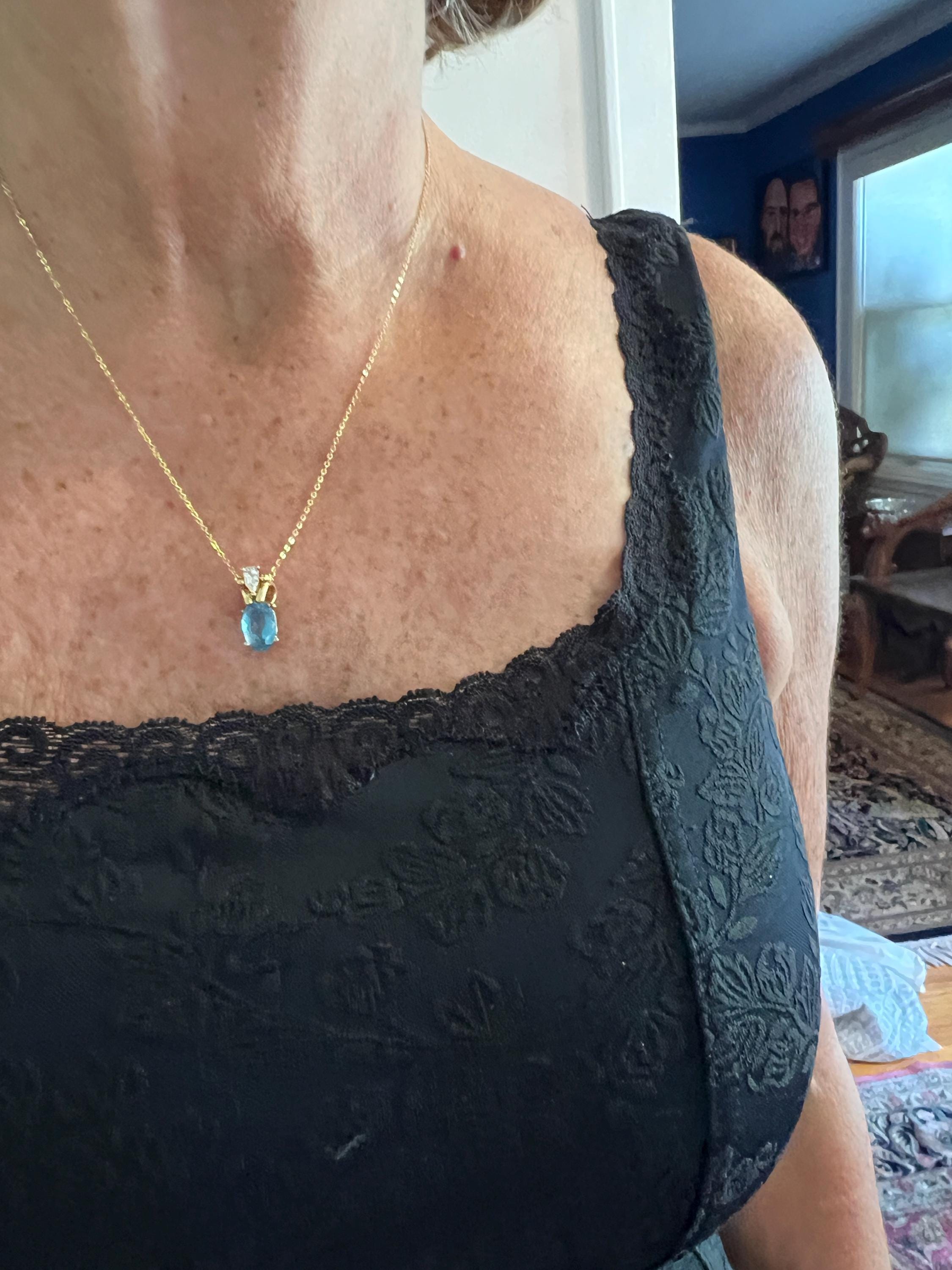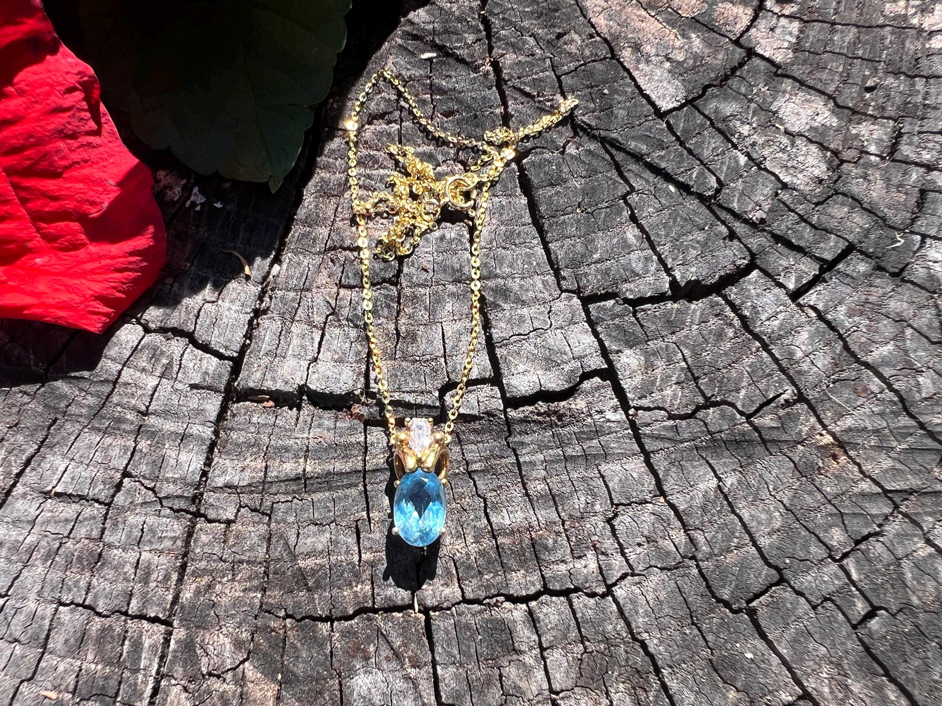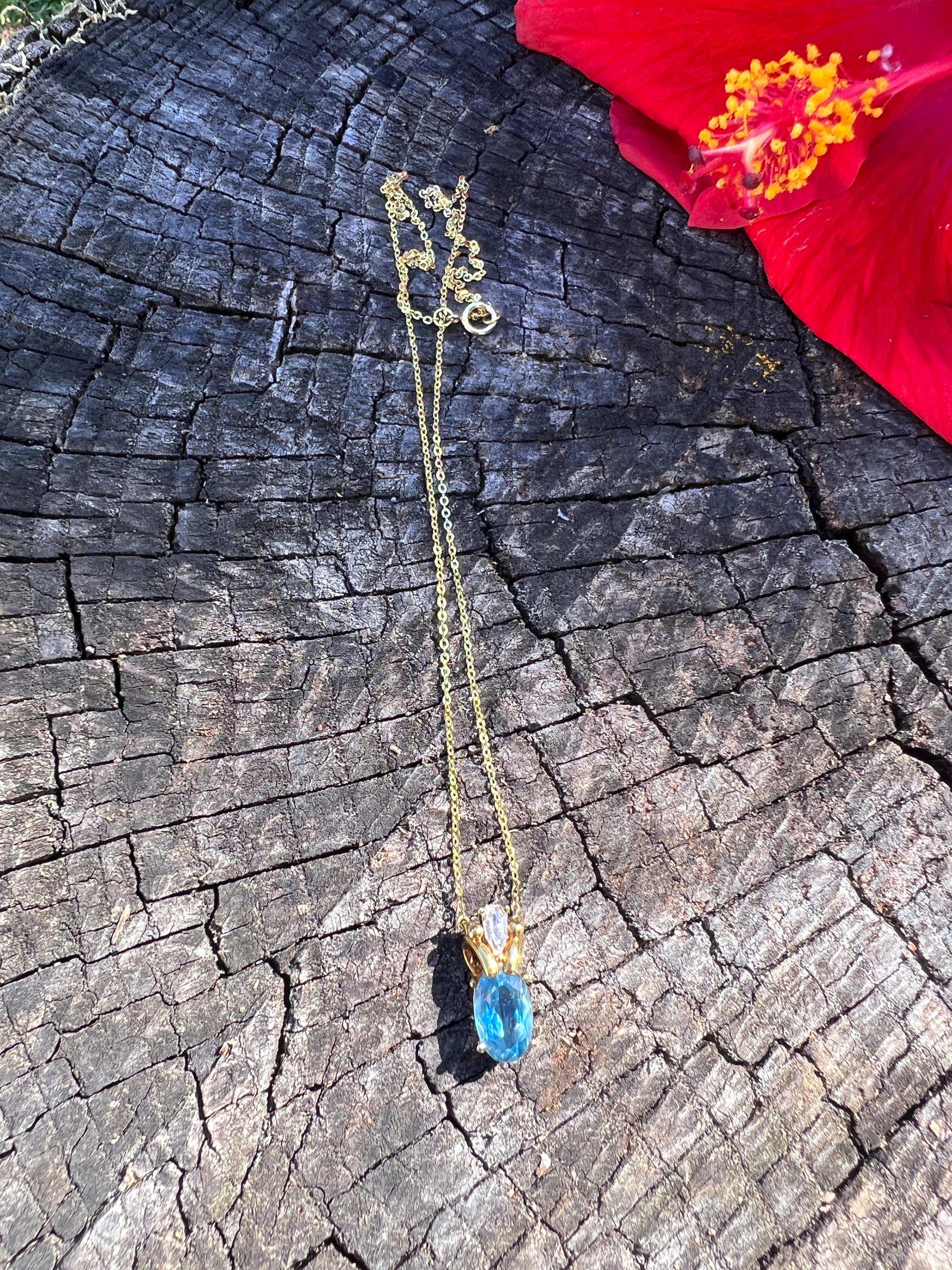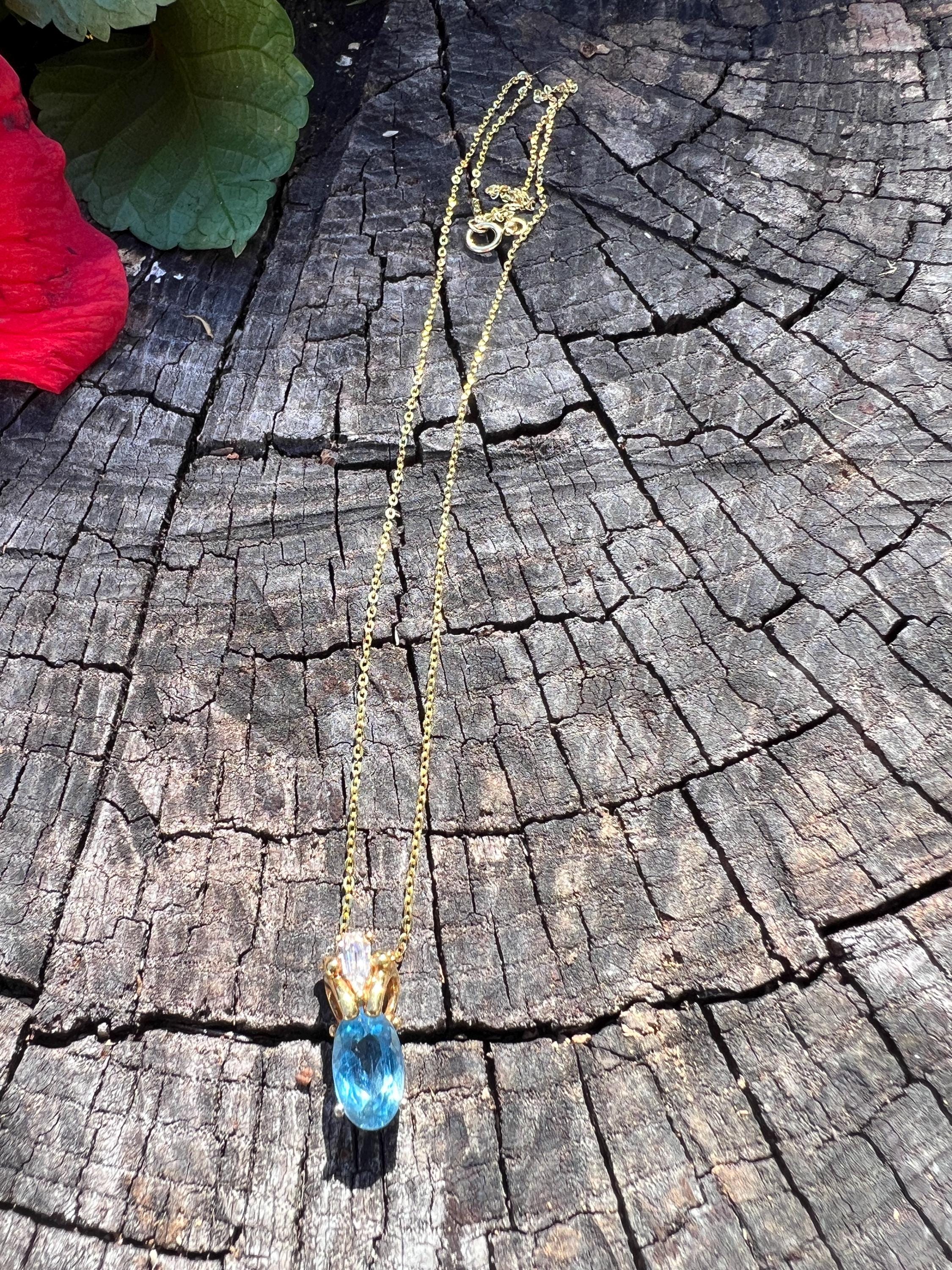 This impressive 18k yellow gold aquamarine and diamond pendant is a statement maker. It dates from the 1980’s. It comes from designer Henry Dunay. Suspended from the top of a kite shaped diamond bale is the oval shaped vividly ocean blue faceted aqua bringing the sensation. The aqua measures approx. 11 mm x 7.5 mm. The diamond has an approx. weight of .30 ct. The diamond is F in color and VS1 in clarity. All attached to an exquisite chain. Extreme elegance. The pendant measures 1 1/2" (including the bale) x 1/4". The chain measures 19". The entire piece weighs 4.48 grams. The pendant is marked Dunay and 18k. The chain is marked 18k.