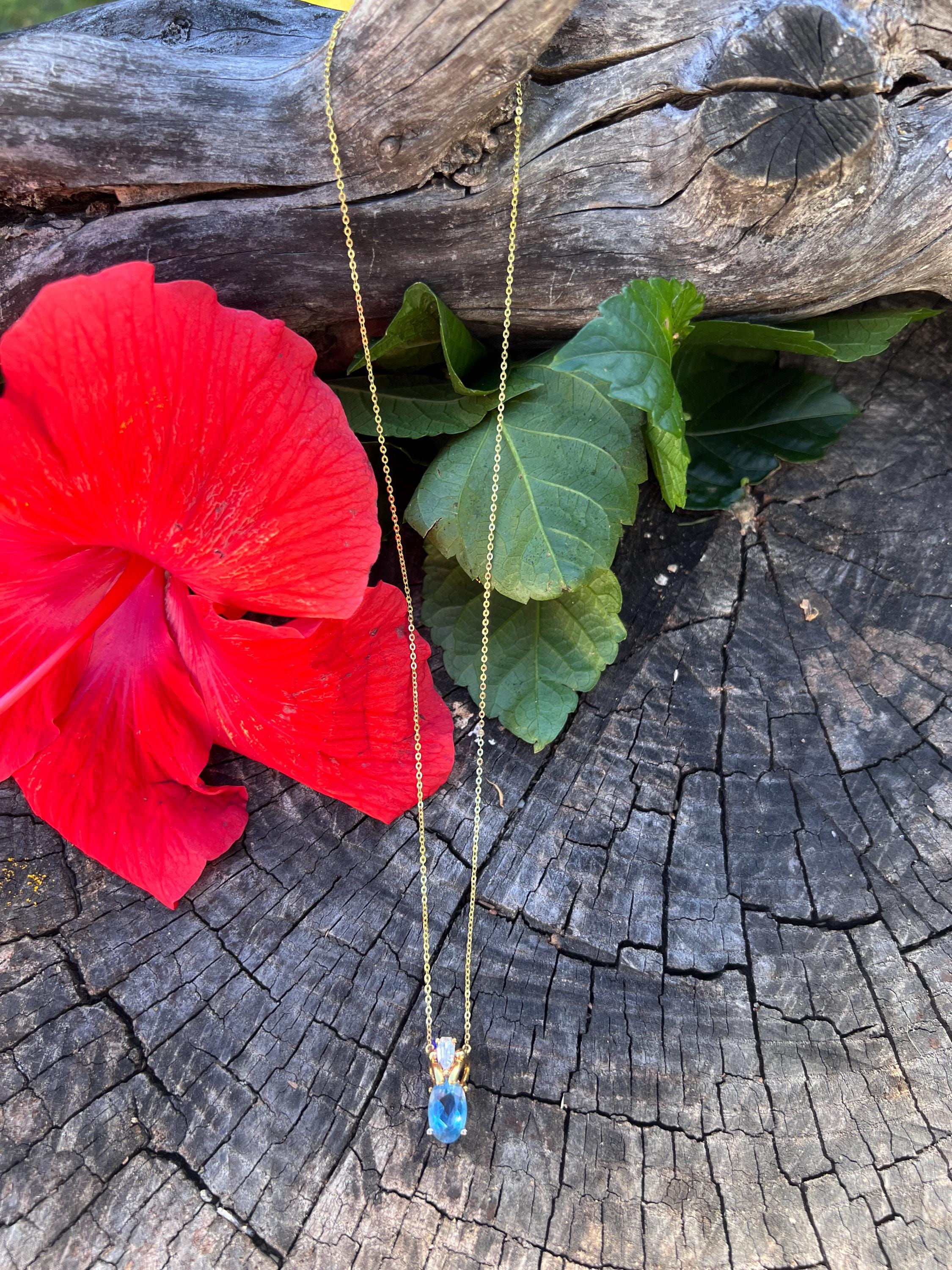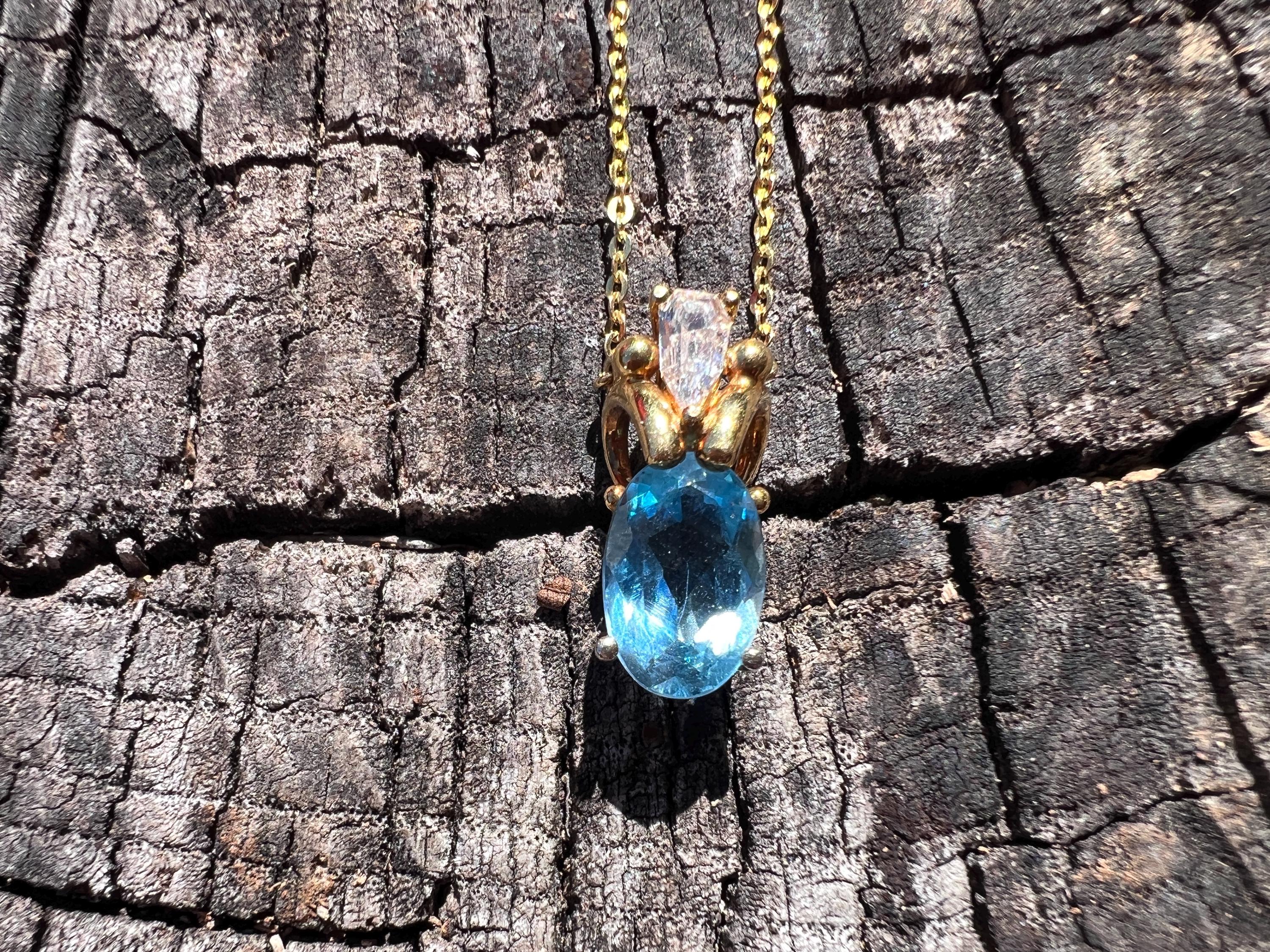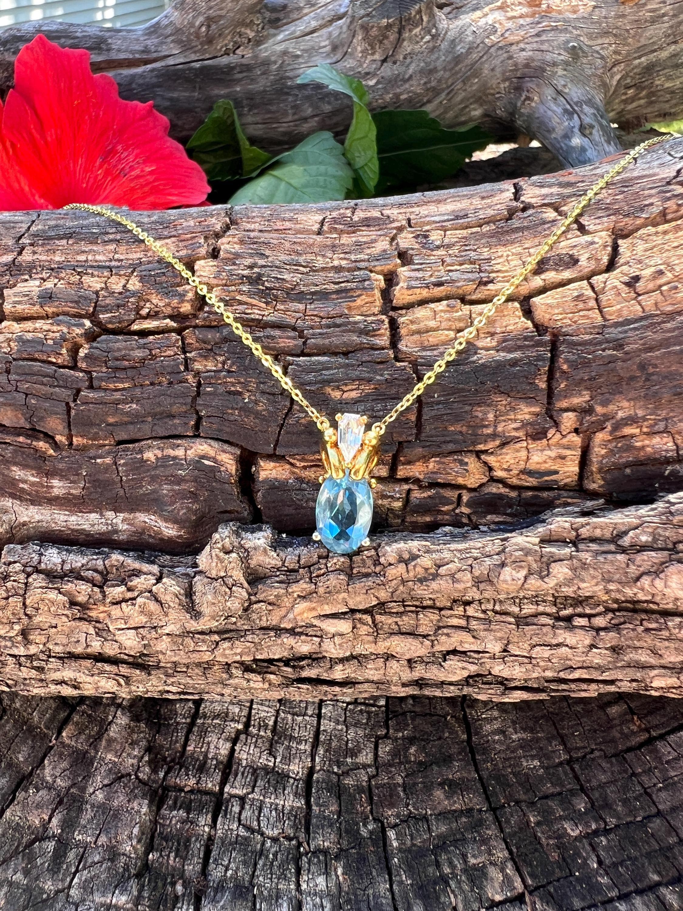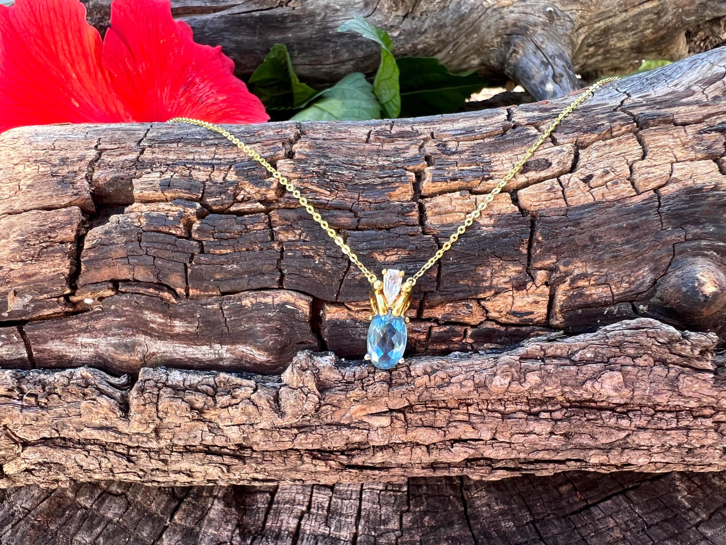 This impressive 18k yellow gold aquamarine and diamond pendant is a statement maker. It dates from the 1980’s. It comes from designer Henry Dunay. Suspended from the top of a kite shaped diamond bale is the oval shaped vividly ocean blue faceted aqua bringing the sensation. The aqua measures approx. 11 mm x 7.5 mm. The diamond has an approx. weight of .30 ct. The diamond is F in color and VS1 in clarity. All attached to an exquisite chain. Extreme elegance. The pendant measures 1 1/2" (including the bale) x 1/4". The chain measures 19". The entire piece weighs 4.48 grams. The pendant is marked Dunay and 18k. The chain is marked 18k.
