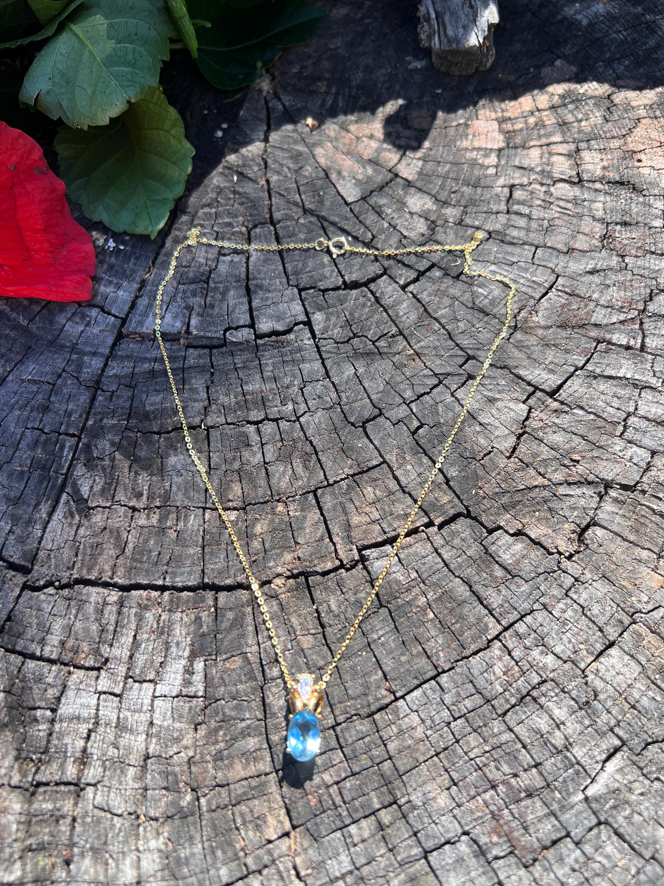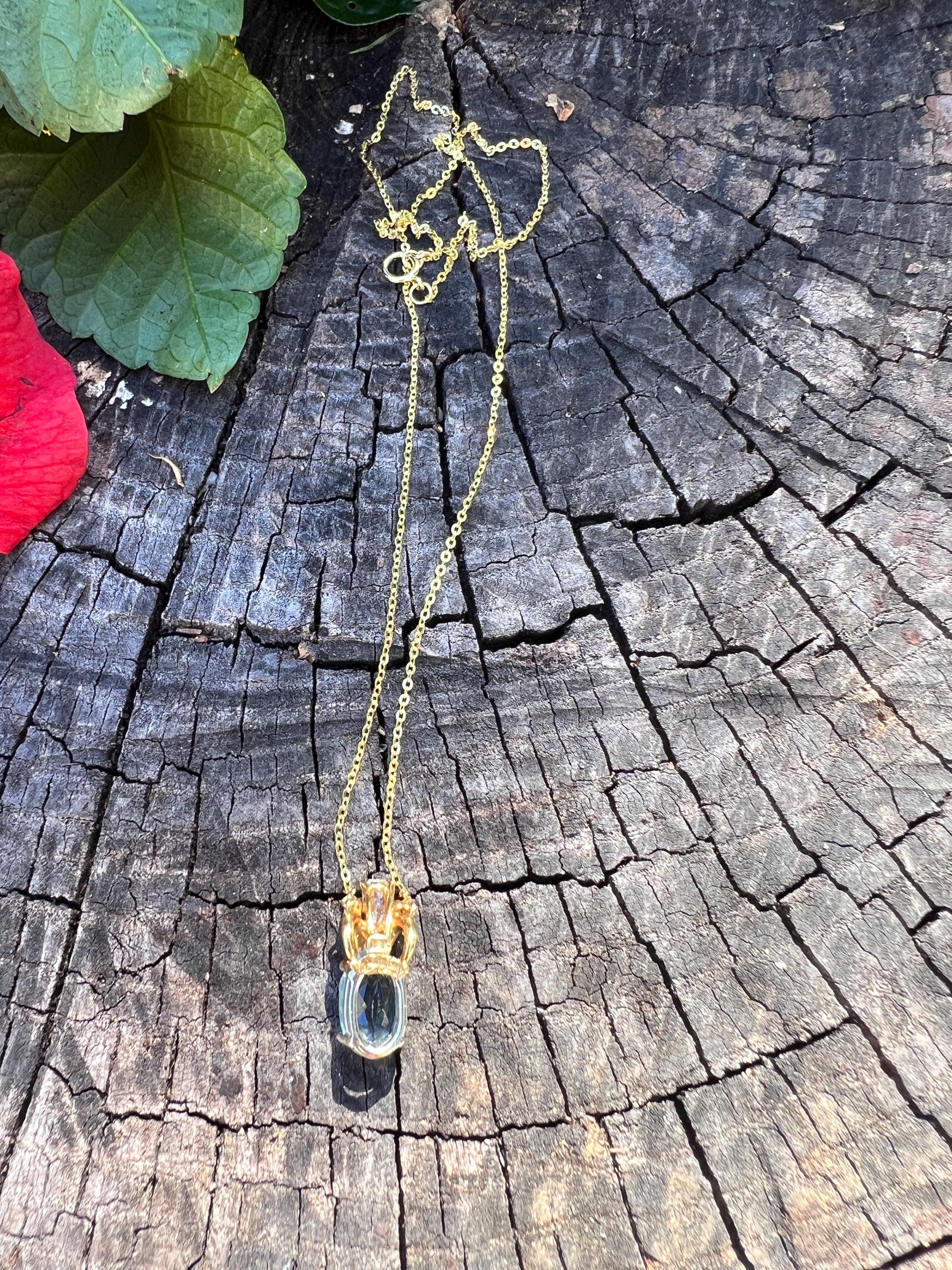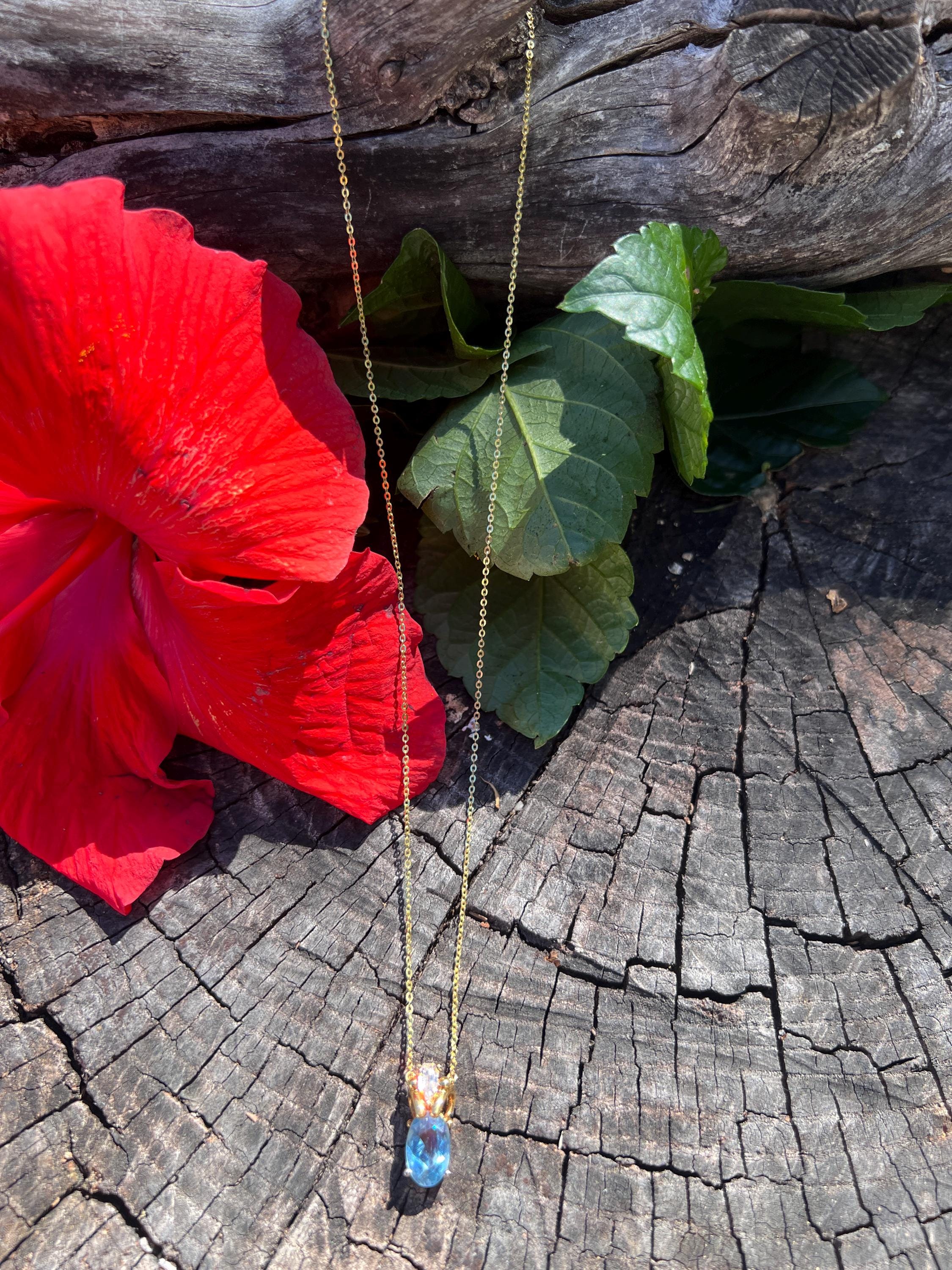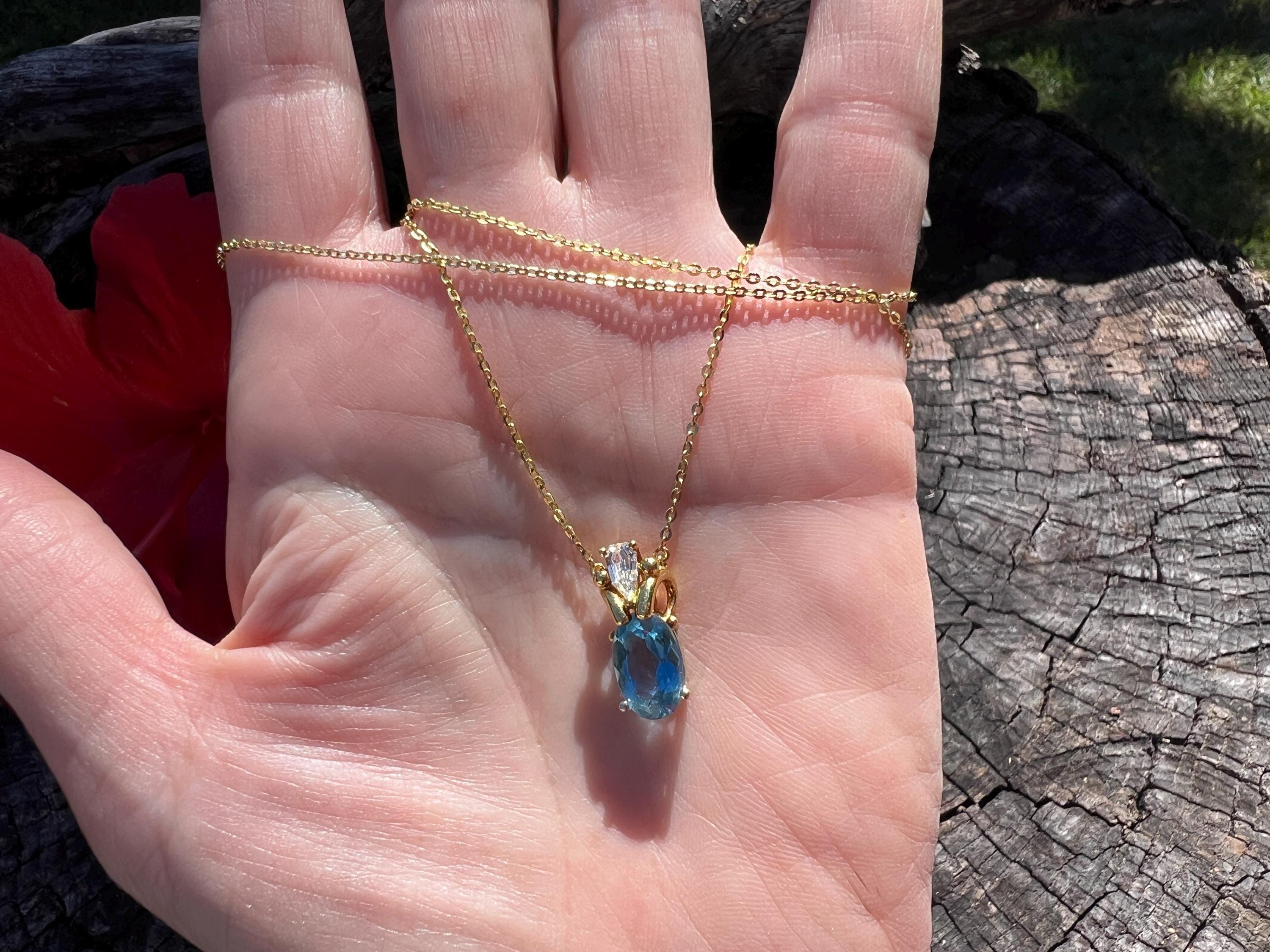 This impressive 18k yellow gold aquamarine and diamond pendant is a statement maker. It dates from the 1980’s. It comes from designer Henry Dunay. Suspended from the top of a kite shaped diamond bale is the oval shaped vividly ocean blue faceted aqua bringing the sensation. The aqua measures approx. 11 mm x 7.5 mm. The diamond has an approx. weight of .30 ct. The diamond is F in color and VS1 in clarity. All attached to an exquisite chain. Extreme elegance. The pendant measures 1 1/2" (including the bale) x 1/4". The chain measures 19". The entire piece weighs 4.48 grams. The pendant is marked Dunay and 18k. The chain is marked 18k.