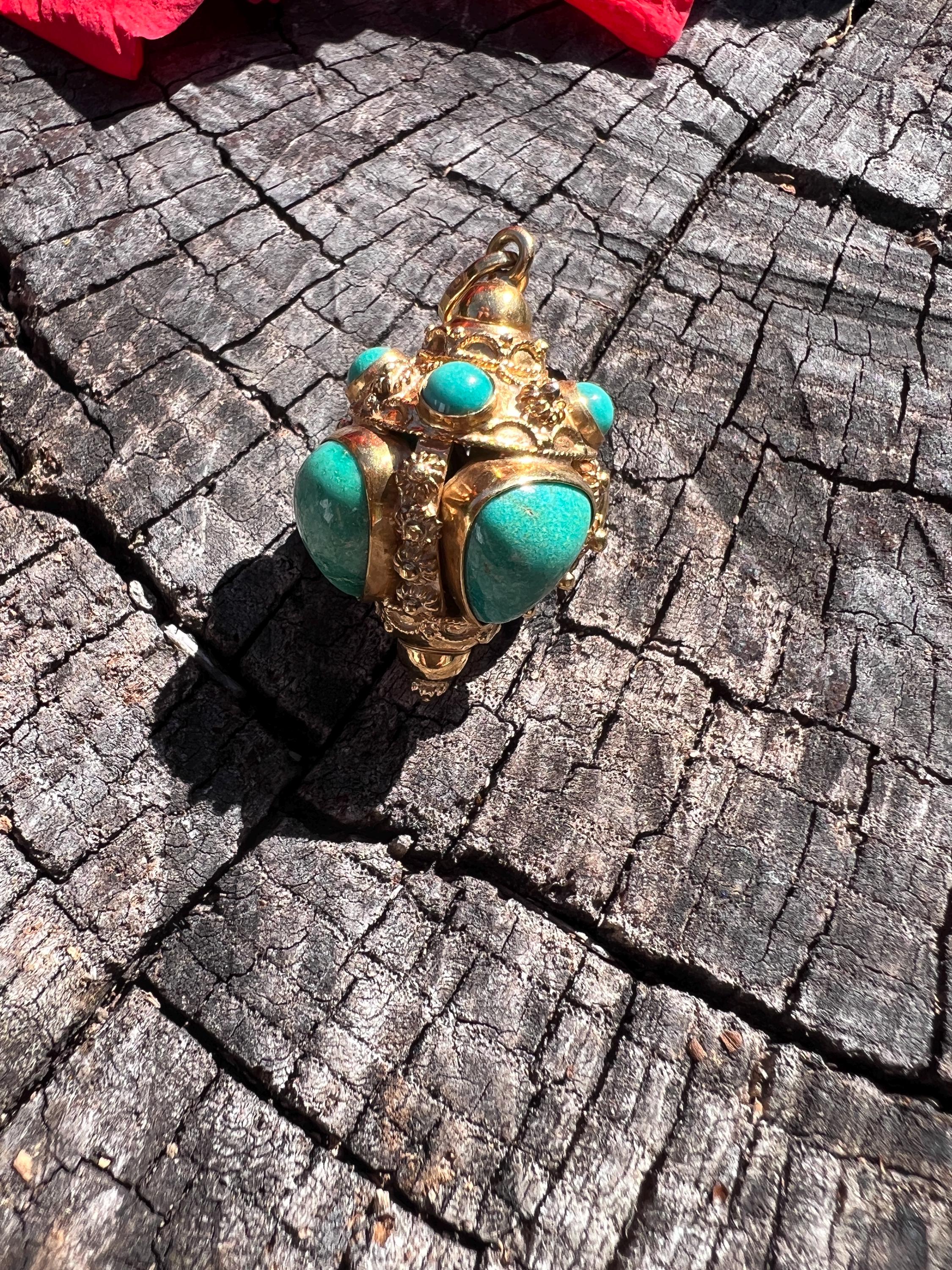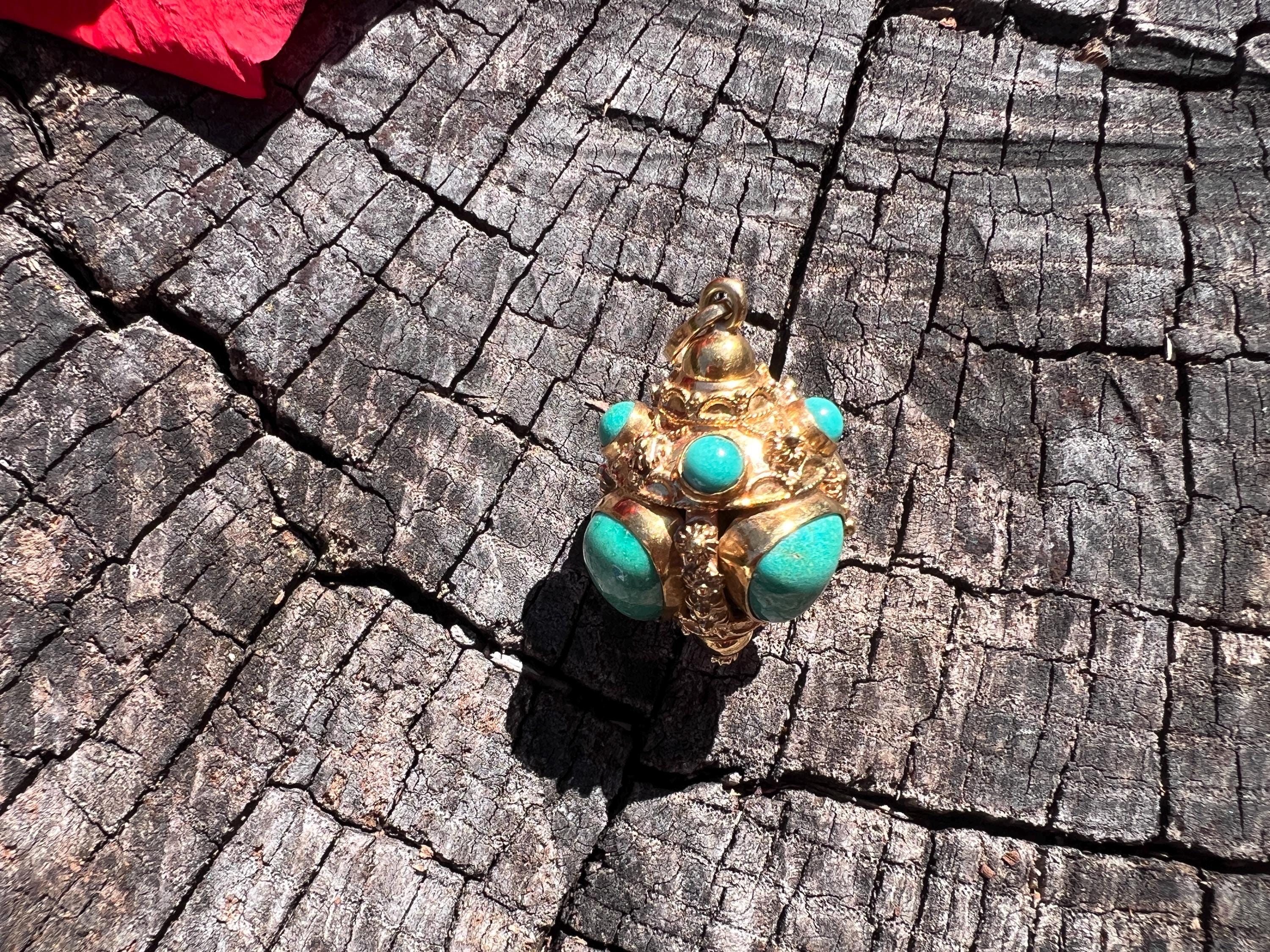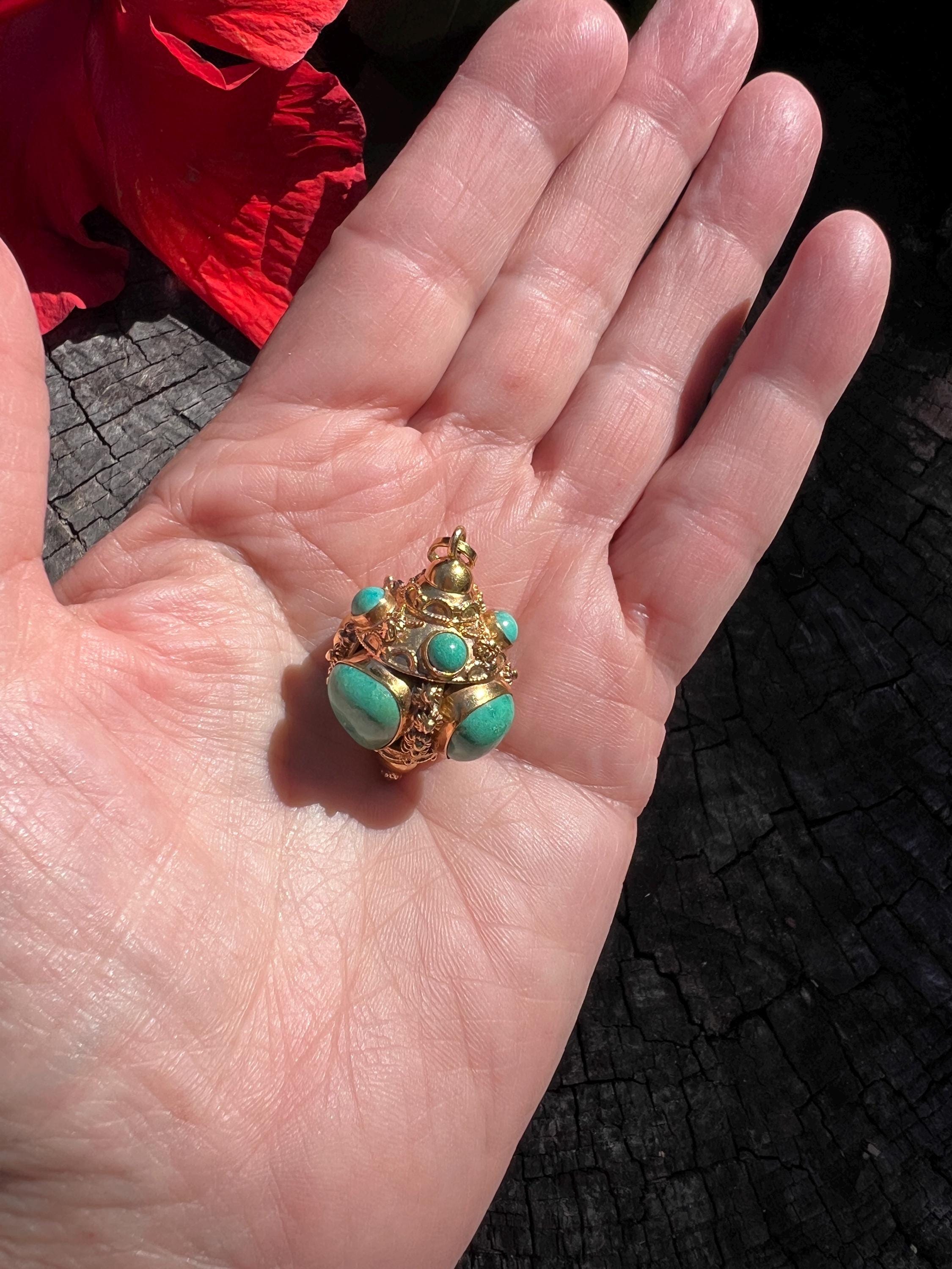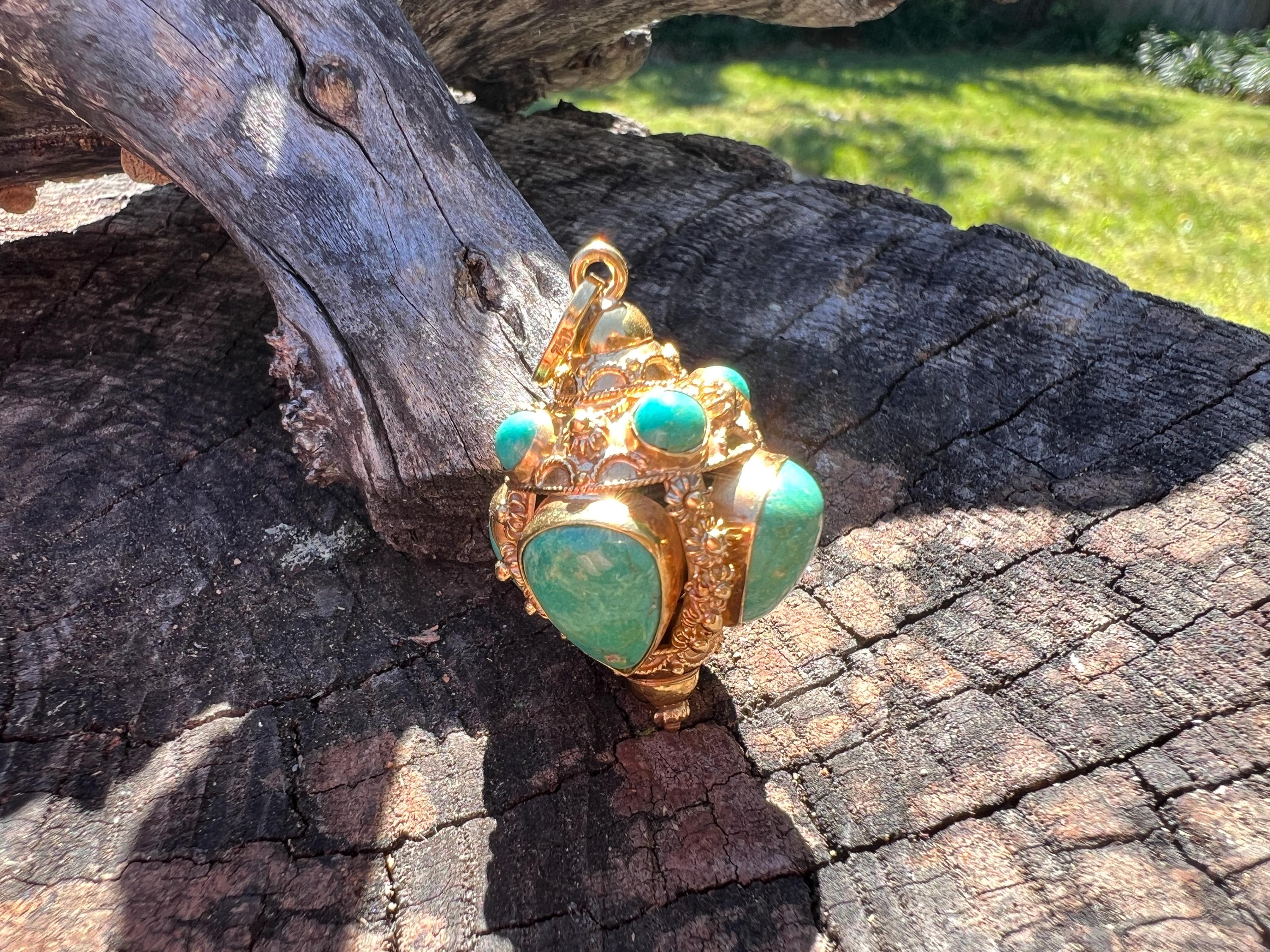 This endearing vintage turquoise charm is made in 18k yellow gold. It dates from the 1950's. The Venetian charm has an embroidered look to it with beautiful floral inspired design and bead work all around. Enveloping the gold, placed around the center, is a circle of vibrant Mediterranean blue pear shaped turquoise. Round pieces of turquoise envelope the top. A great addition to any charm bracelet or a great layering piece with a pendant. It measures 1 1/2" long and 3" around. It weighs 15 grams. It is marked 750.