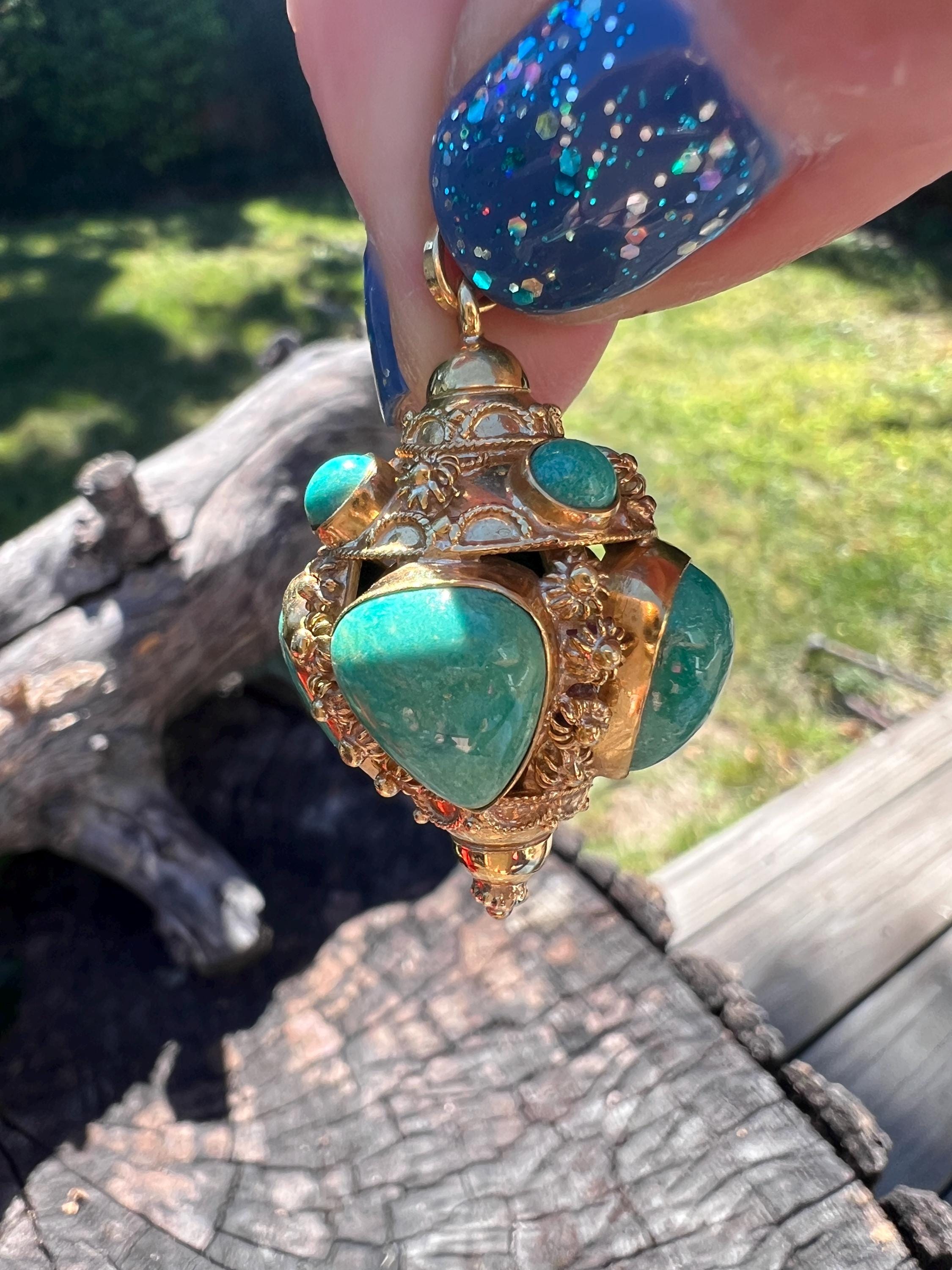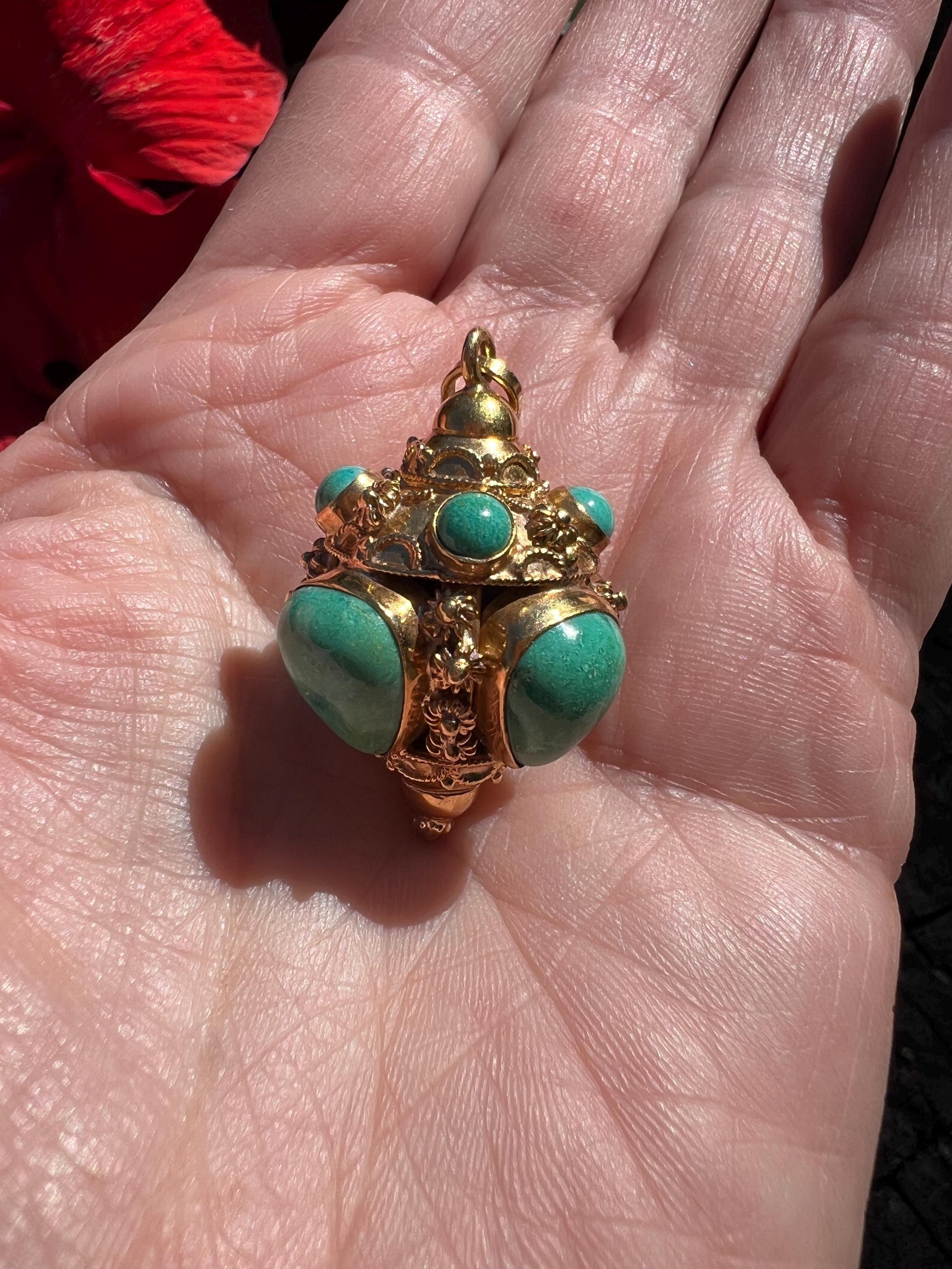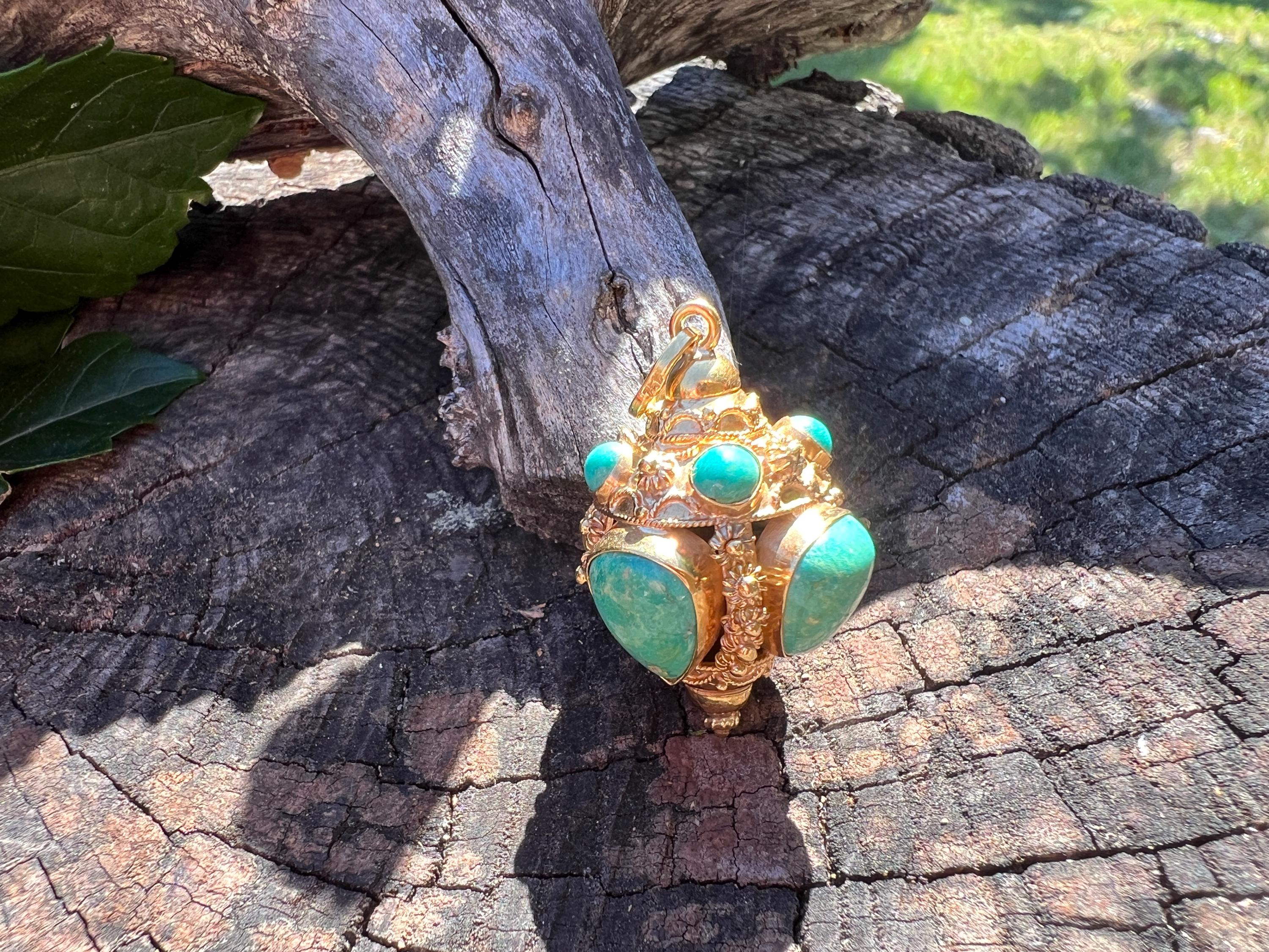 This endearing vintage turquoise charm is made in 18k yellow gold. It dates from the 1950's. The Venetian charm has an embroidered look to it with beautiful floral inspired design and bead work all around. Enveloping the gold, placed around the center, is a circle of vibrant Mediterranean blue pear shaped turquoise. Round pieces of turquoise envelope the top. A great addition to any charm bracelet or a great layering piece with a pendant. It measures 1 1/2" long and 3" around. It weighs 15 grams. It is marked 750.