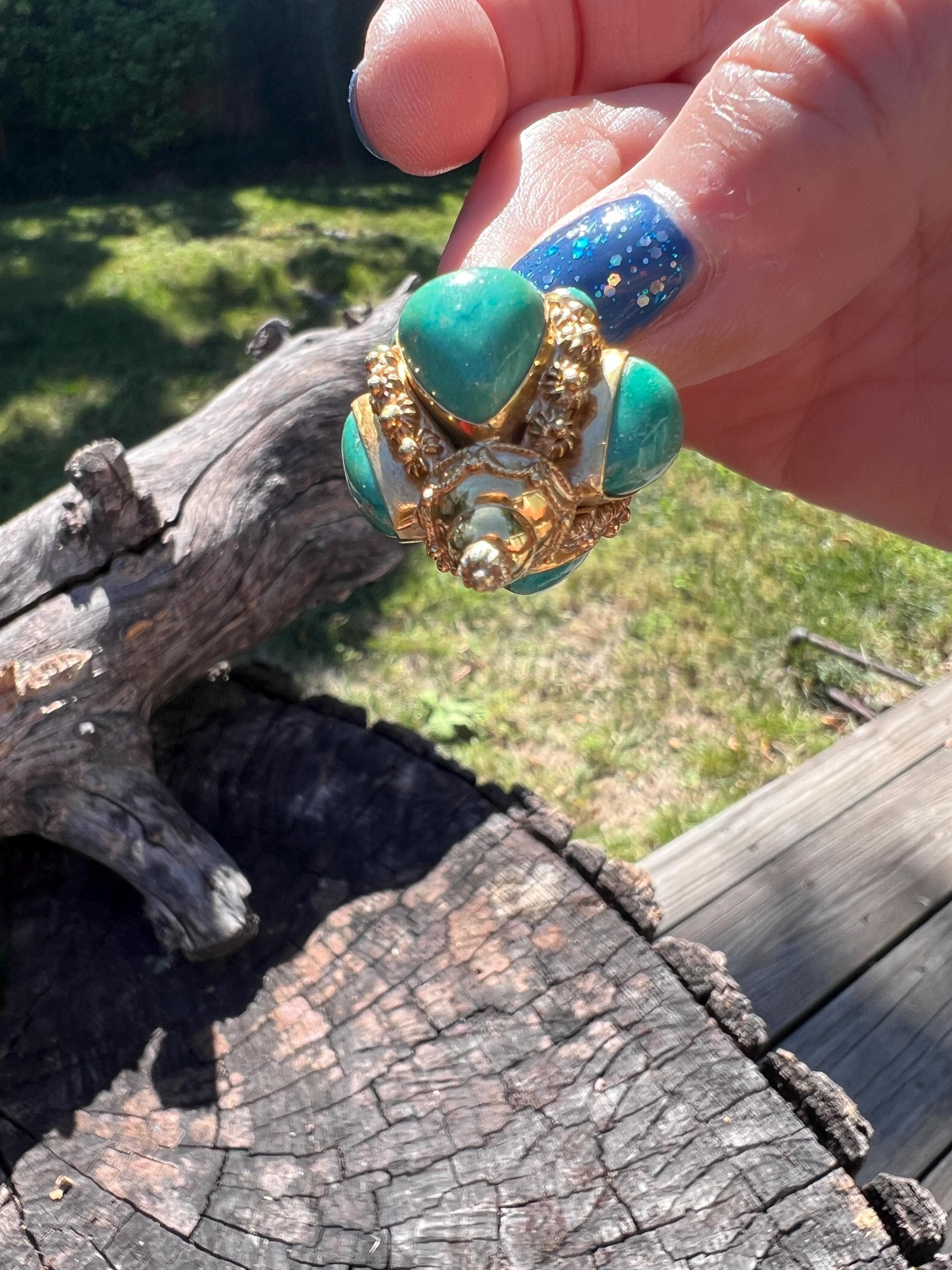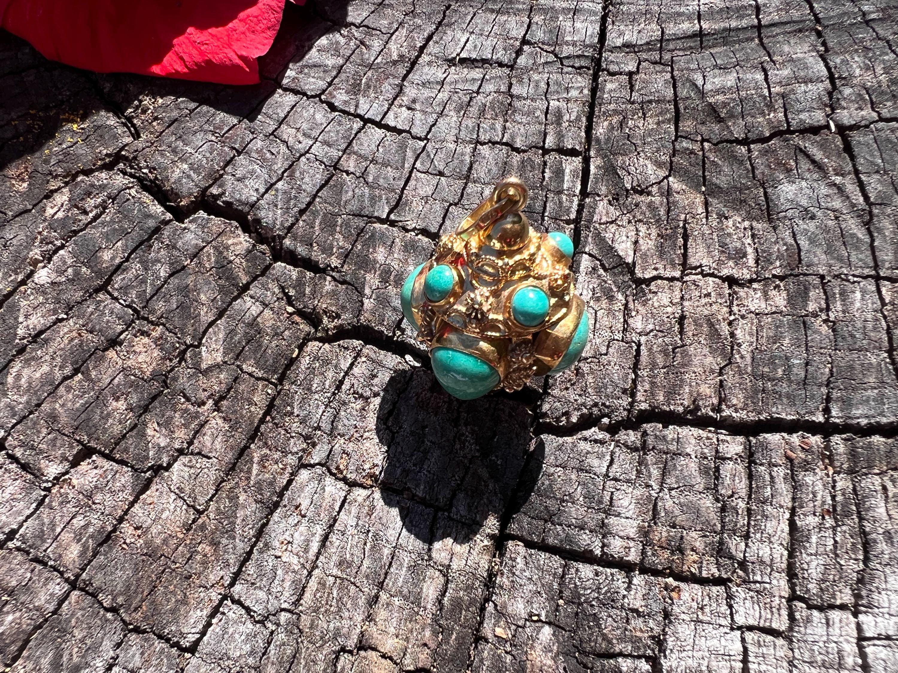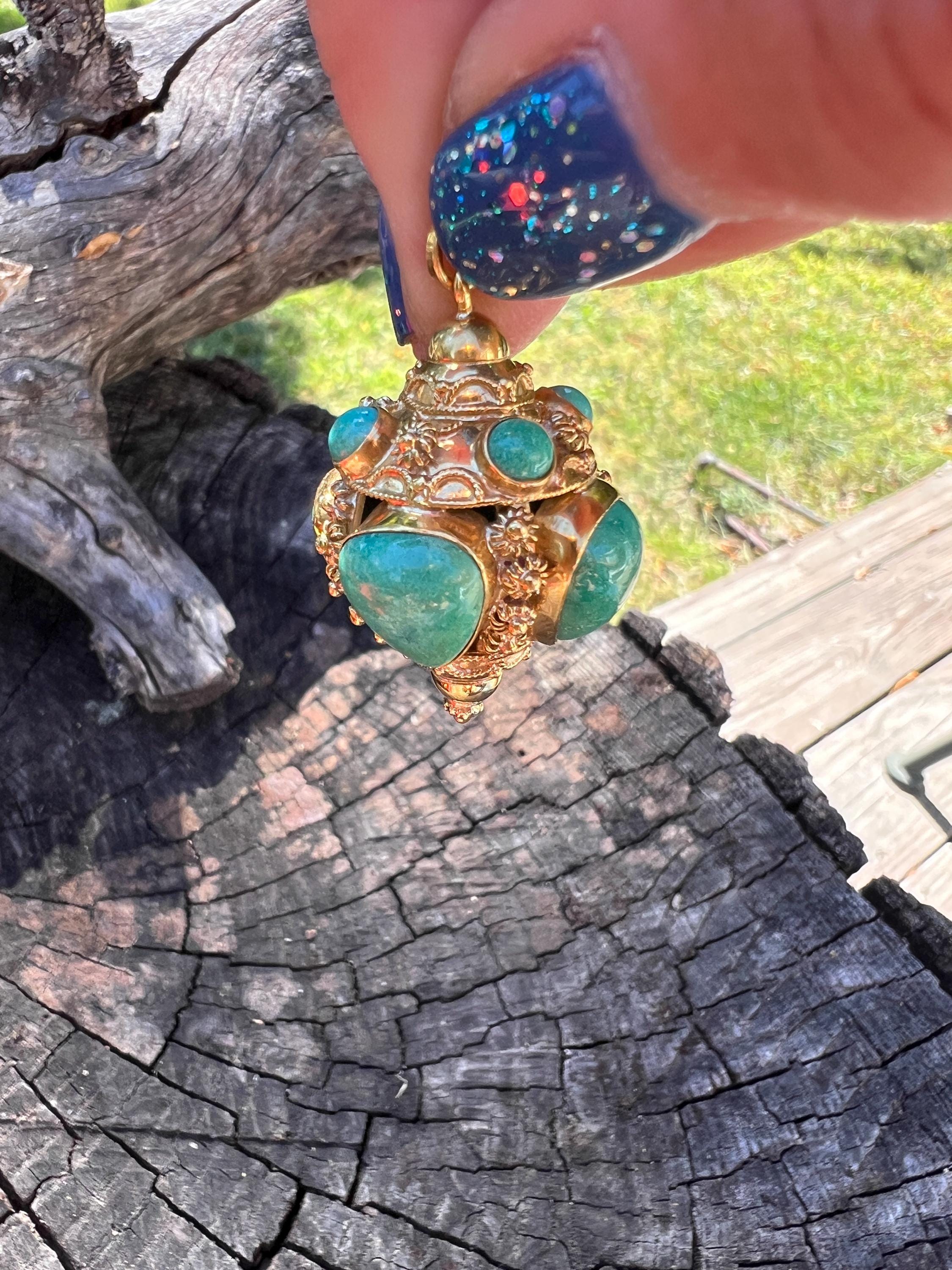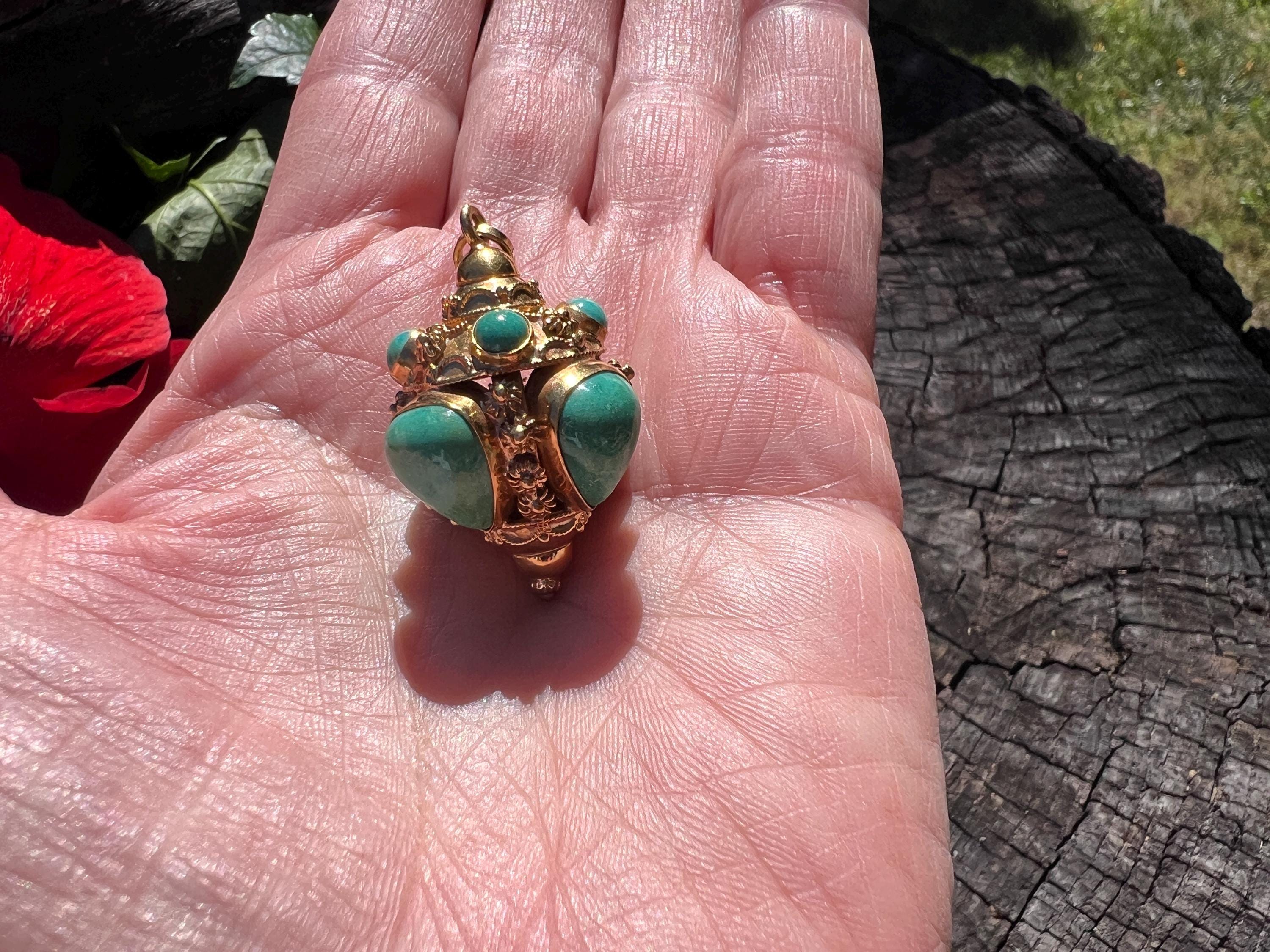 This endearing vintage turquoise charm is made in 18k yellow gold. It dates from the 1950's. The Venetian charm has an embroidered look to it with beautiful floral inspired design and bead work all around. Enveloping the gold, placed around the center, is a circle of vibrant Mediterranean blue pear shaped turquoise. Round pieces of turquoise envelope the top. A great addition to any charm bracelet or a great layering piece with a pendant. It measures 1 1/2" long and 3" around. It weighs 15 grams. It is marked 750.