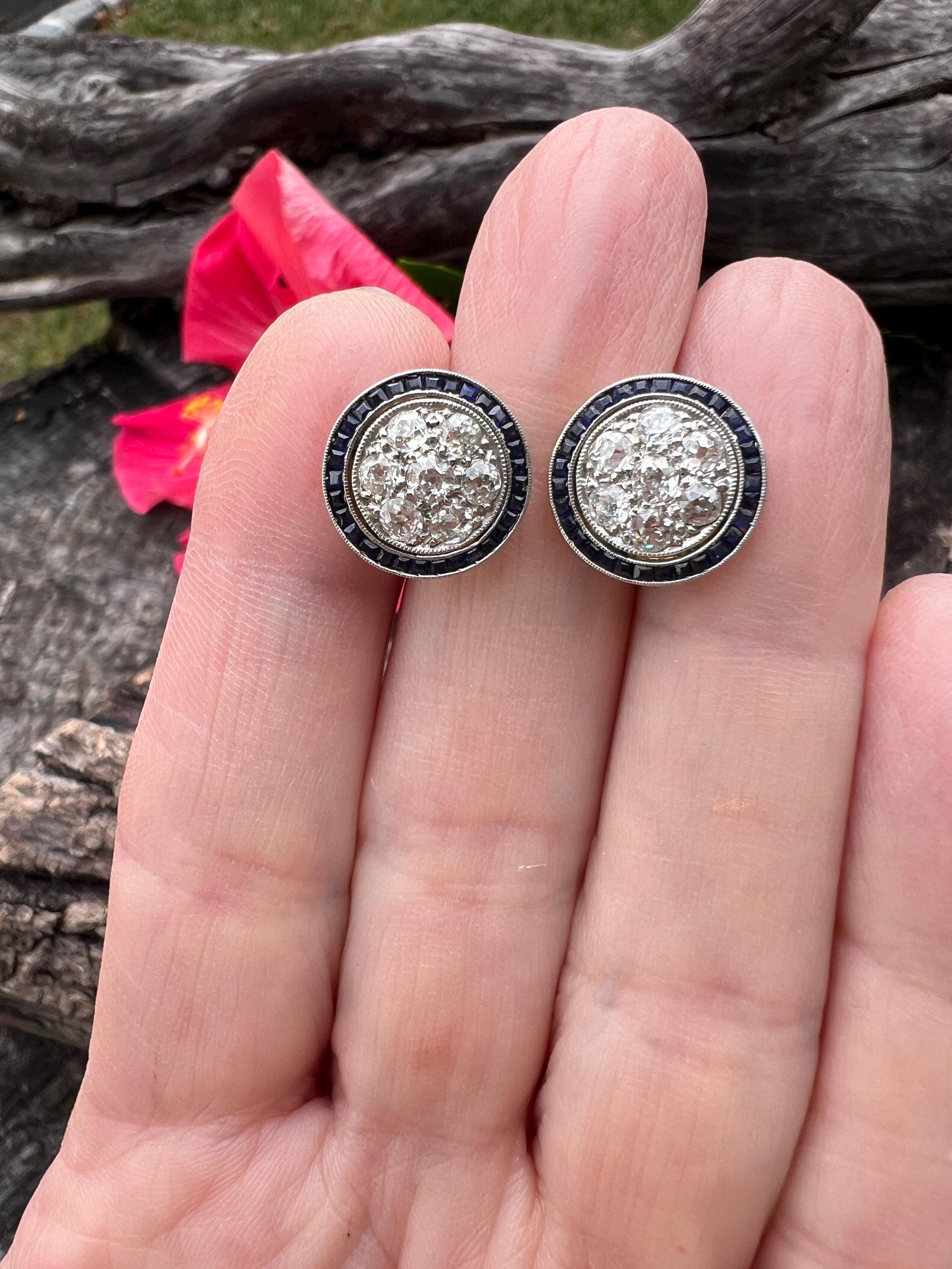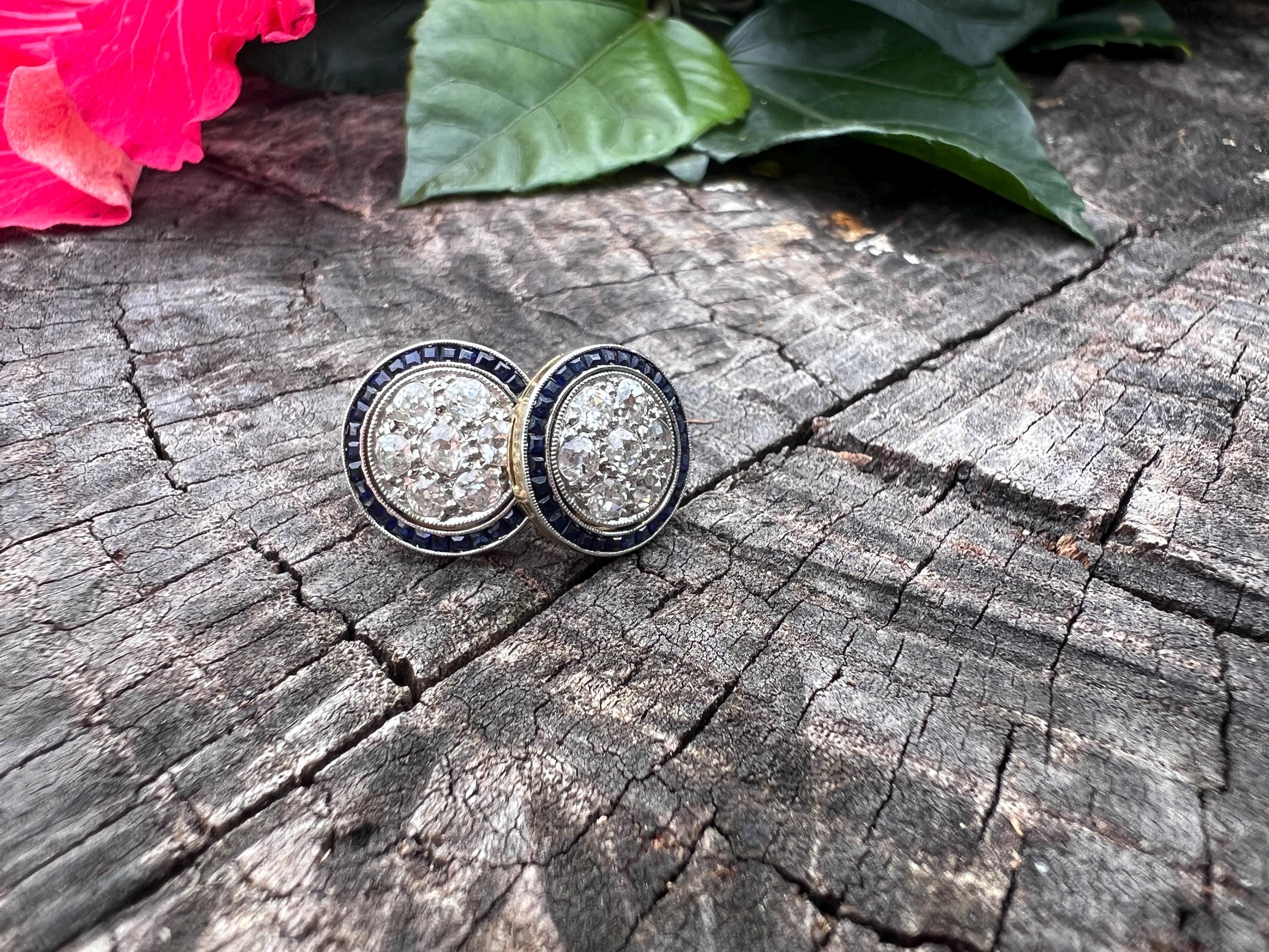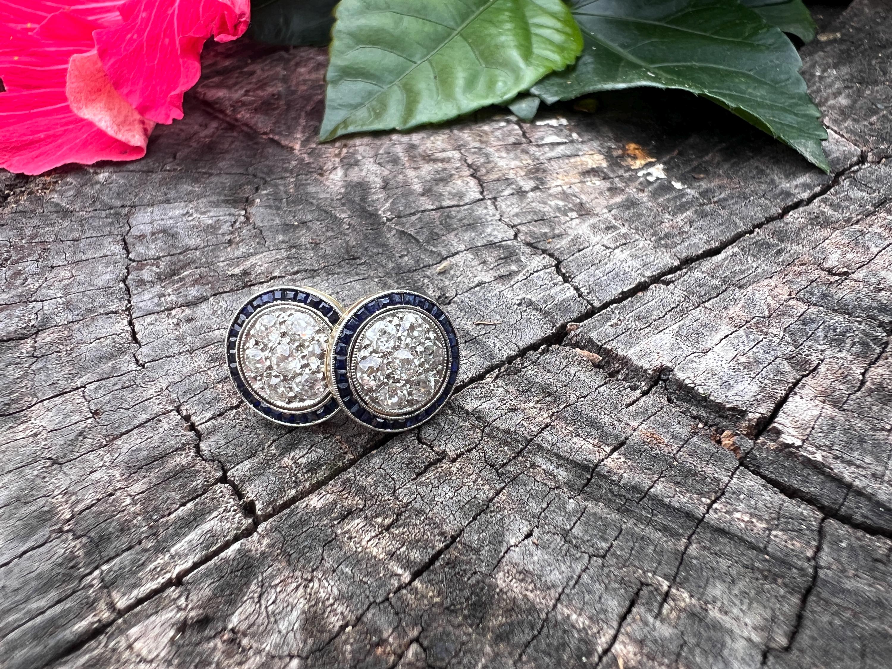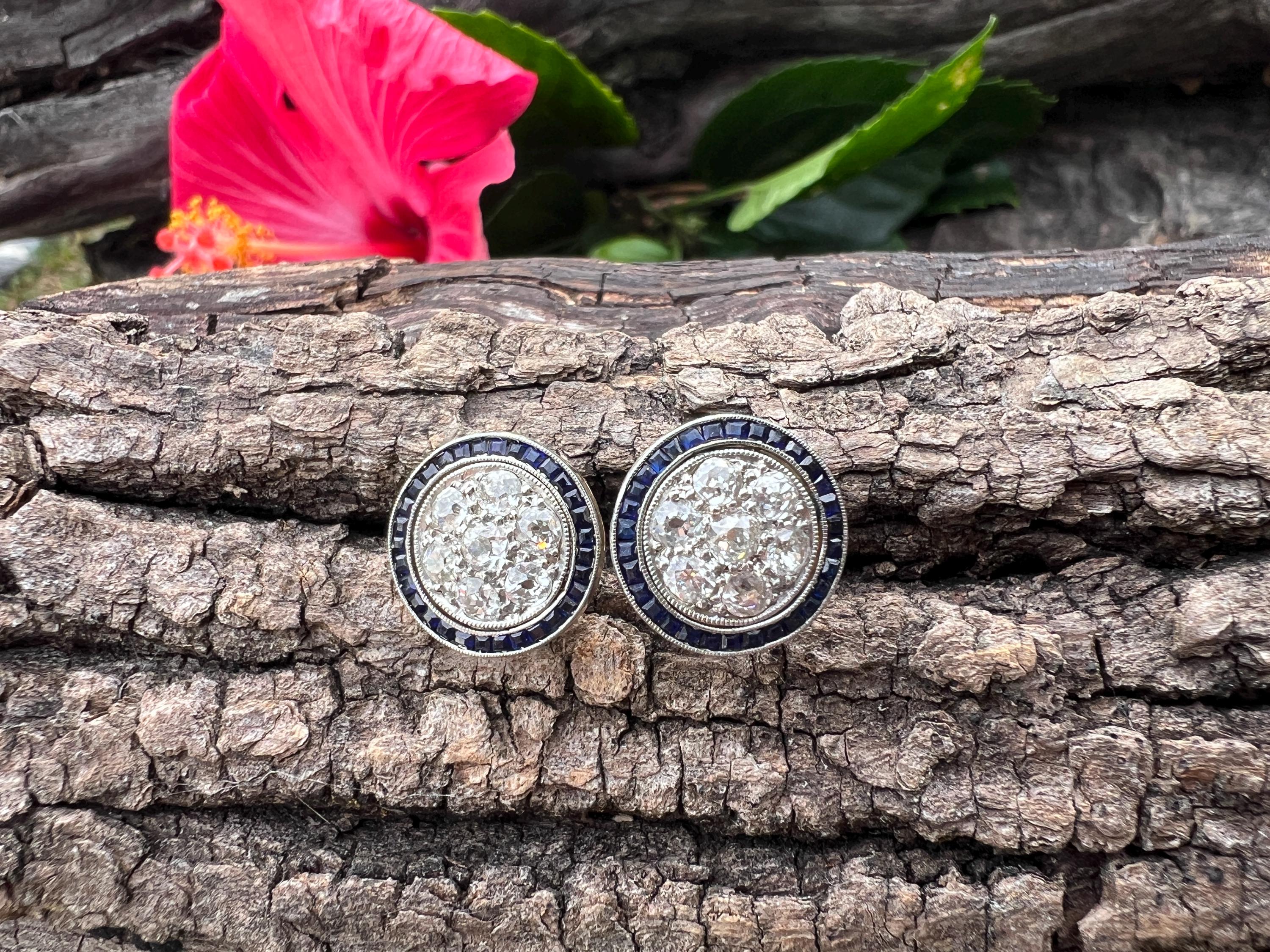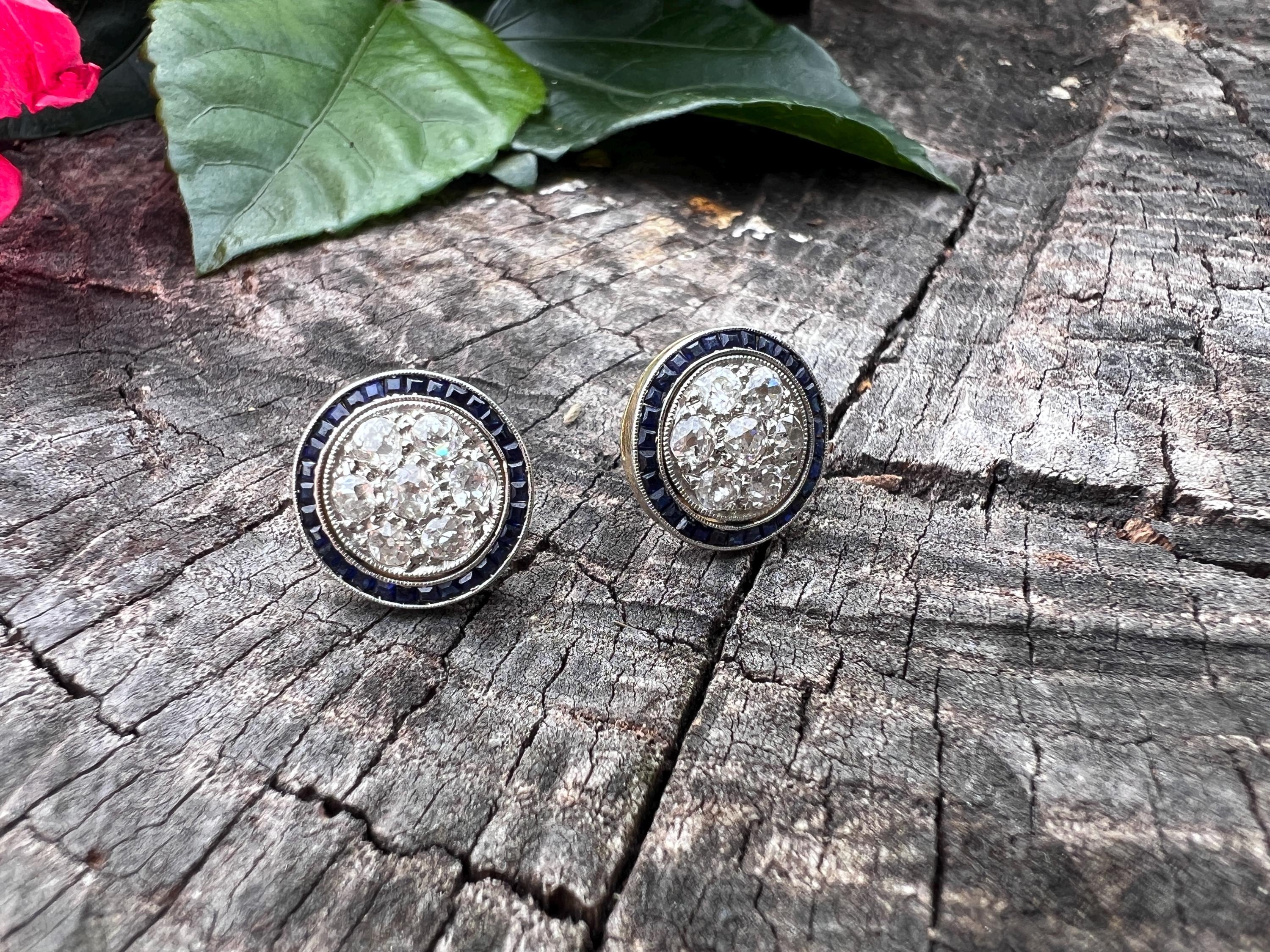Set in 18k yellow and white gold and platinum these magical earrings are a unique take on a diamond stud. They date from the art deco period of the 1920s. The circular disc earring is blanketed in a platinum setting with old mine cut diamonds dazzling the center. The diamonds have a total approx. weight of 1.75 ct. They are I in color and SI1 in clarity. They are bordered by a circle of square cut sapphires bringing that brush of color, contrast and sophistication. They offer classic beauty and compelling allure. An elegant twist on a classic. They measure 1/2". They weigh 4 grams. The bar that holds the post is 14k gold,