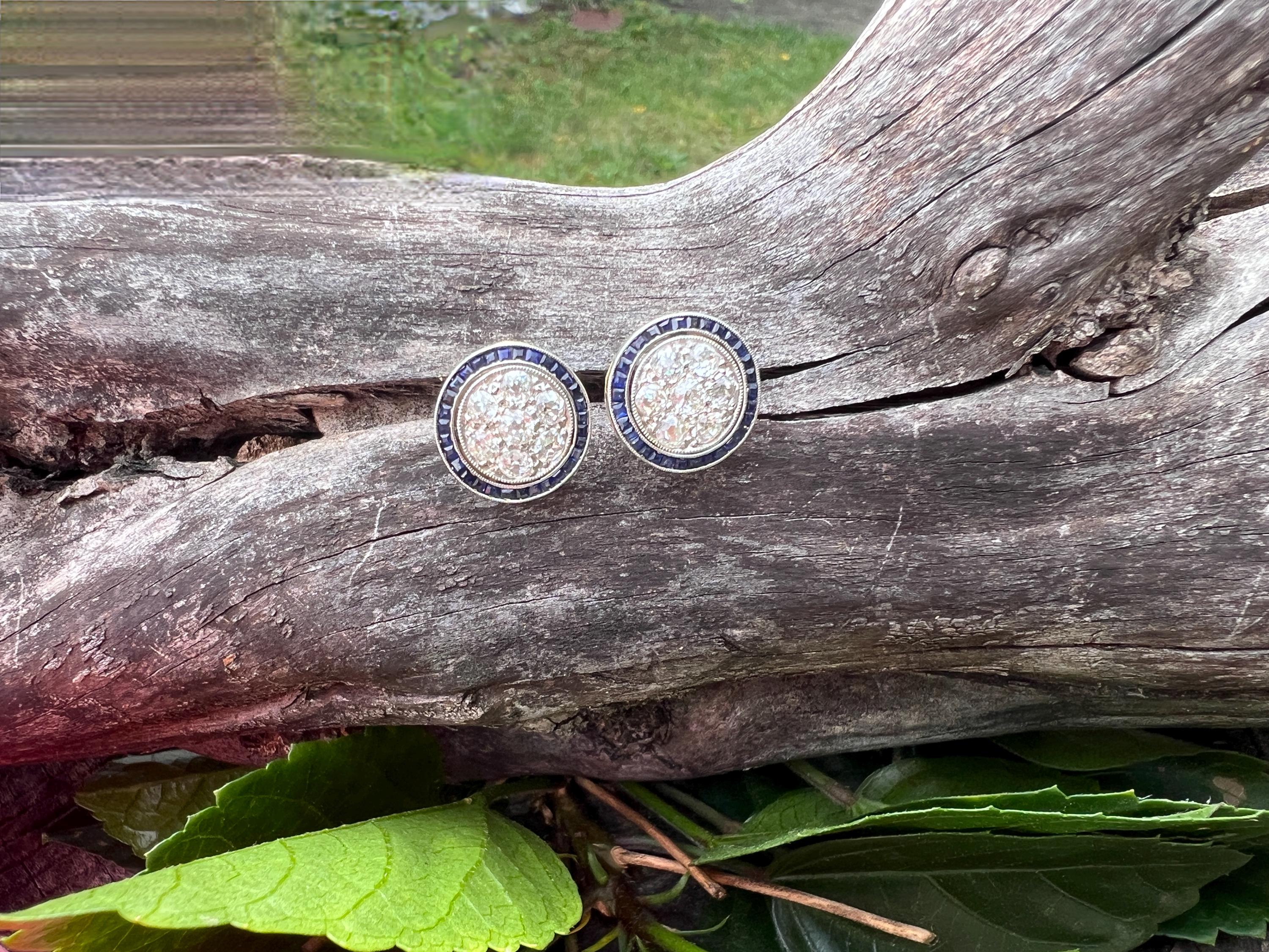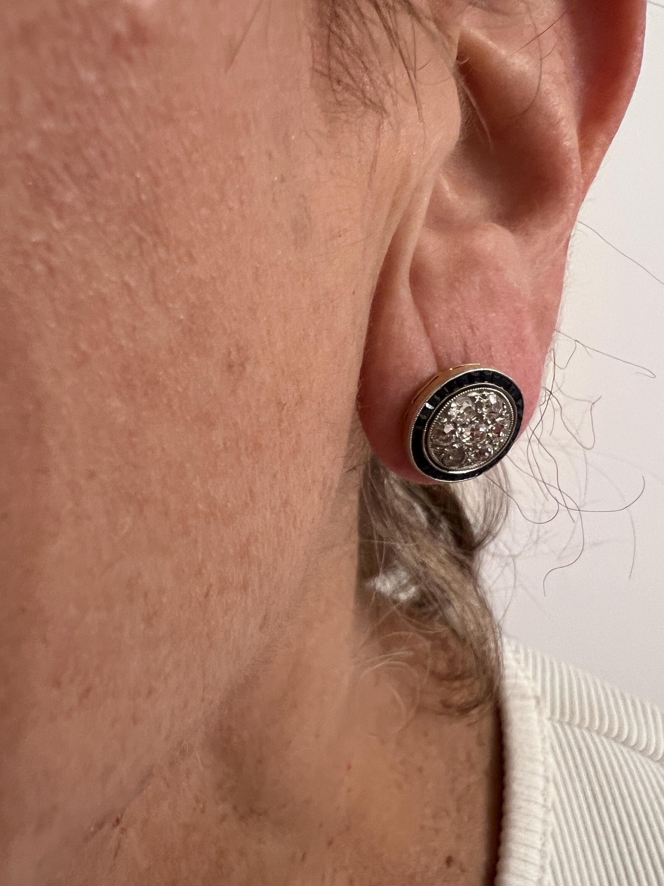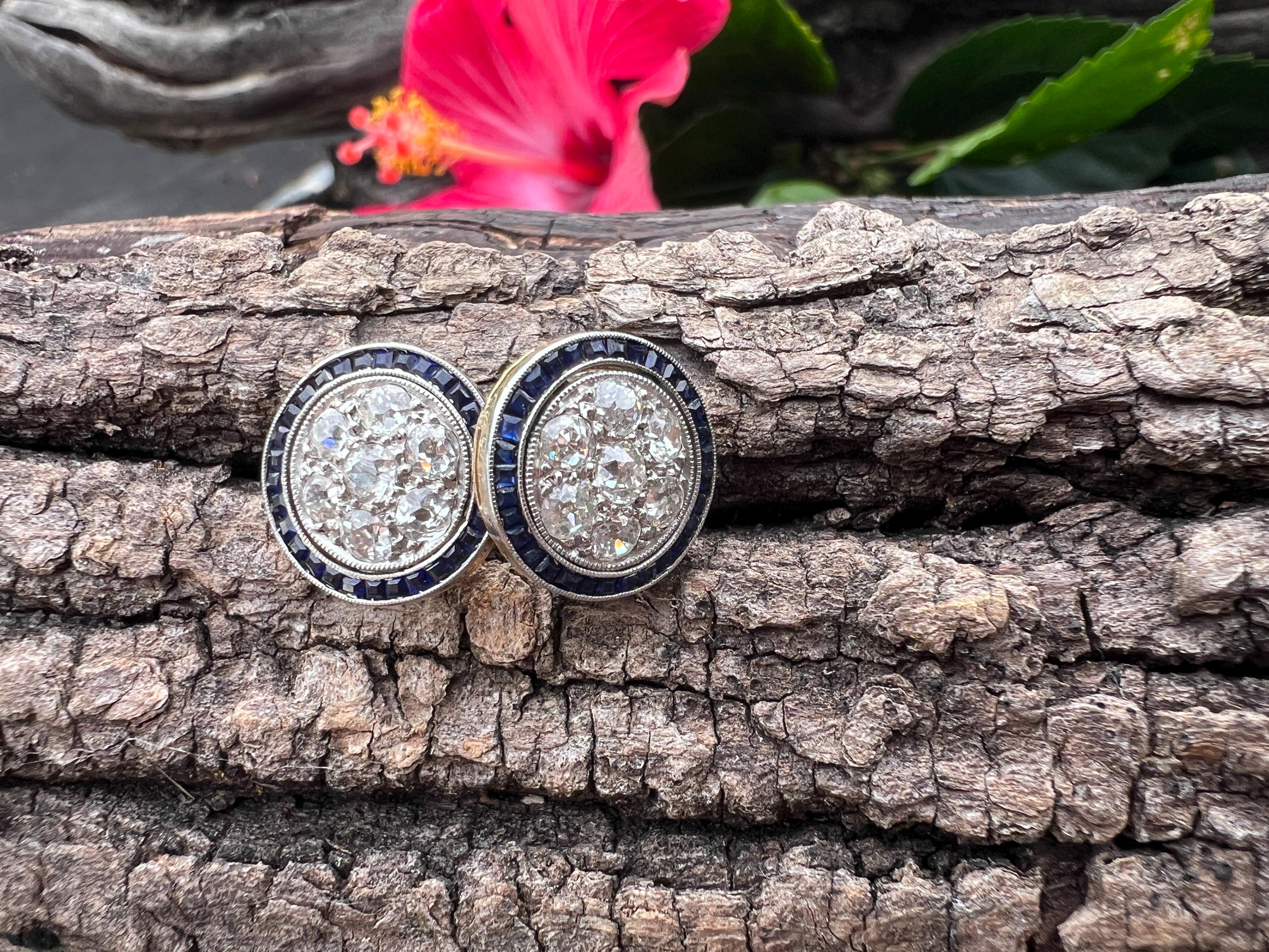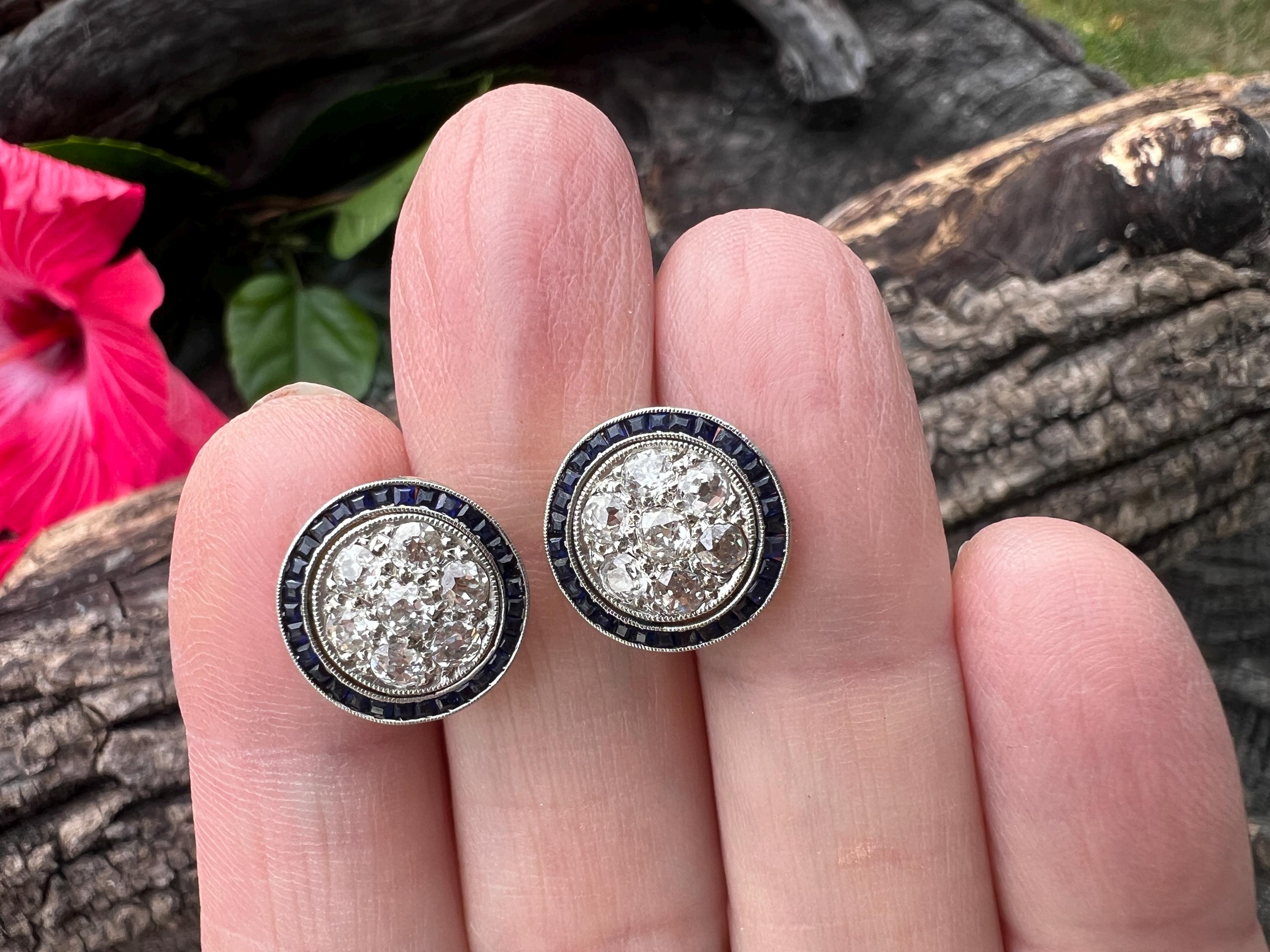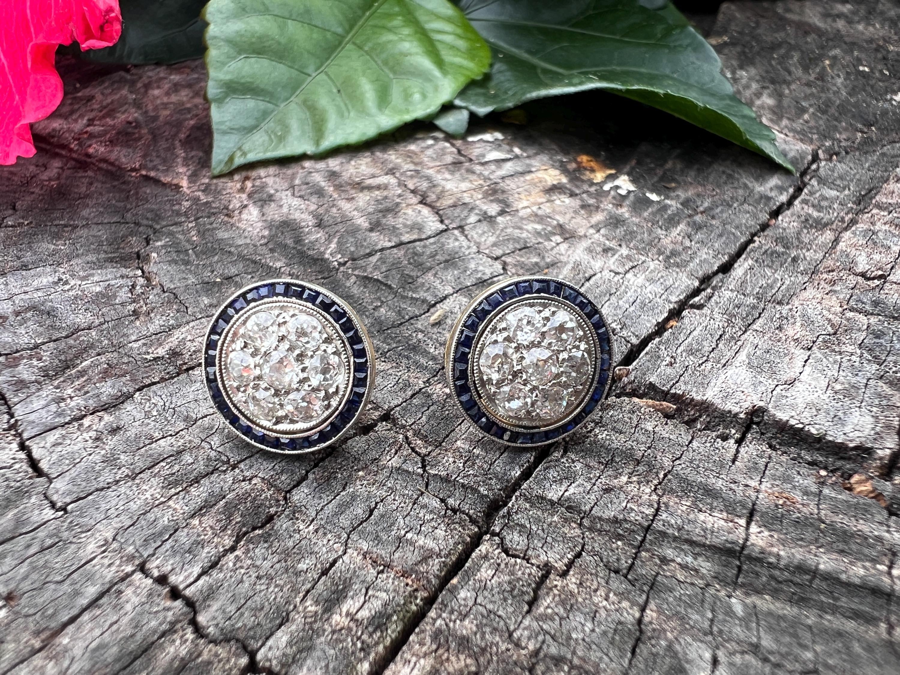 Set in 18k yellow and white gold and platinum these magical earrings are a unique take on a diamond stud. They date from the art deco period of the 1920s. The circular disc earring is blanketed in a platinum setting with old mine cut diamonds dazzling the center. The diamonds have a total approx. weight of 1.75 ct. They are I in color and SI1 in clarity. They are bordered by a circle of square cut sapphires bringing that brush of color, contrast and sophistication. They offer classic beauty and compelling allure. An elegant twist on a classic. They measure 1/2". They weigh 4 grams. The bar that holds the post is 14k gold,