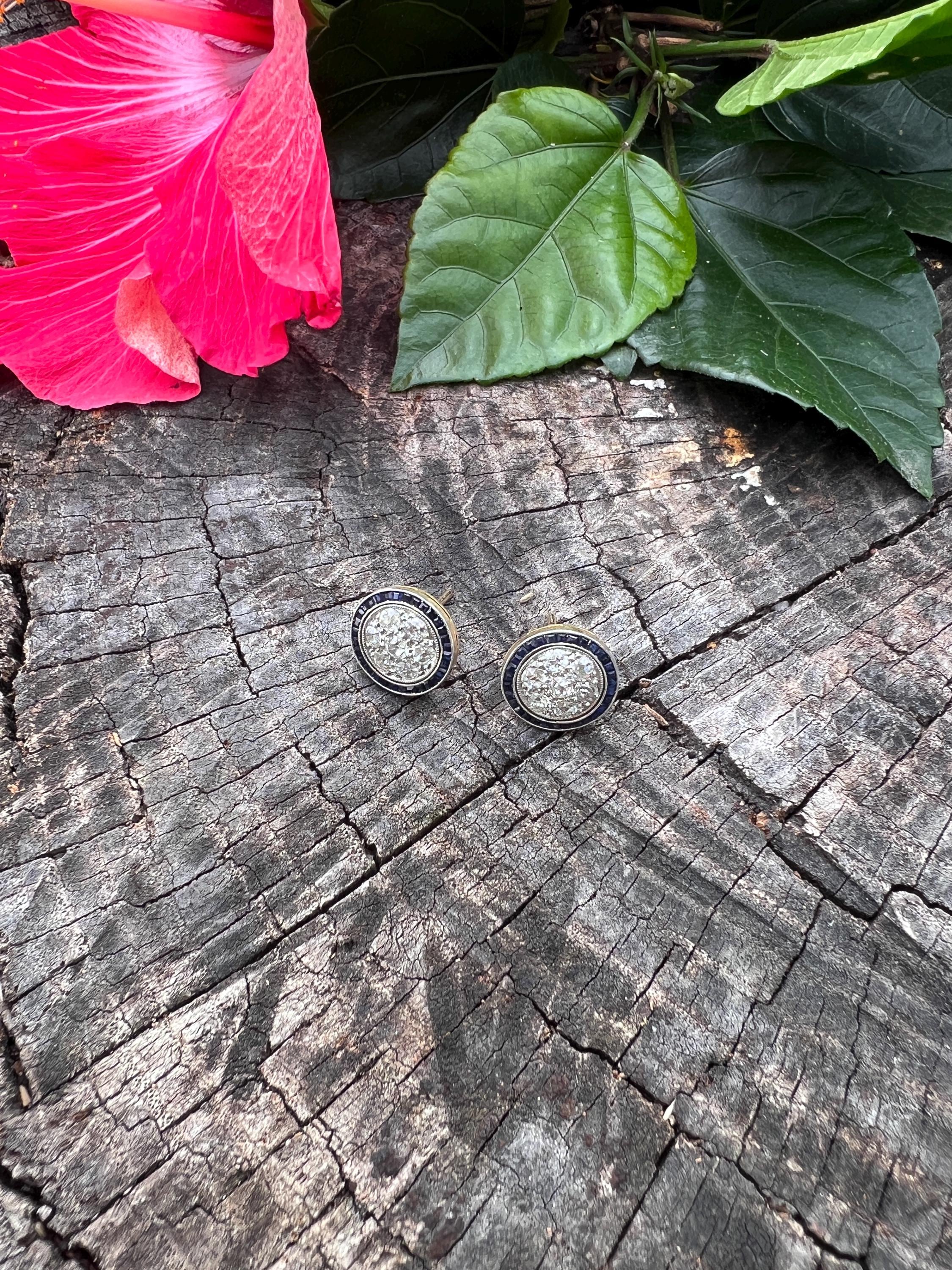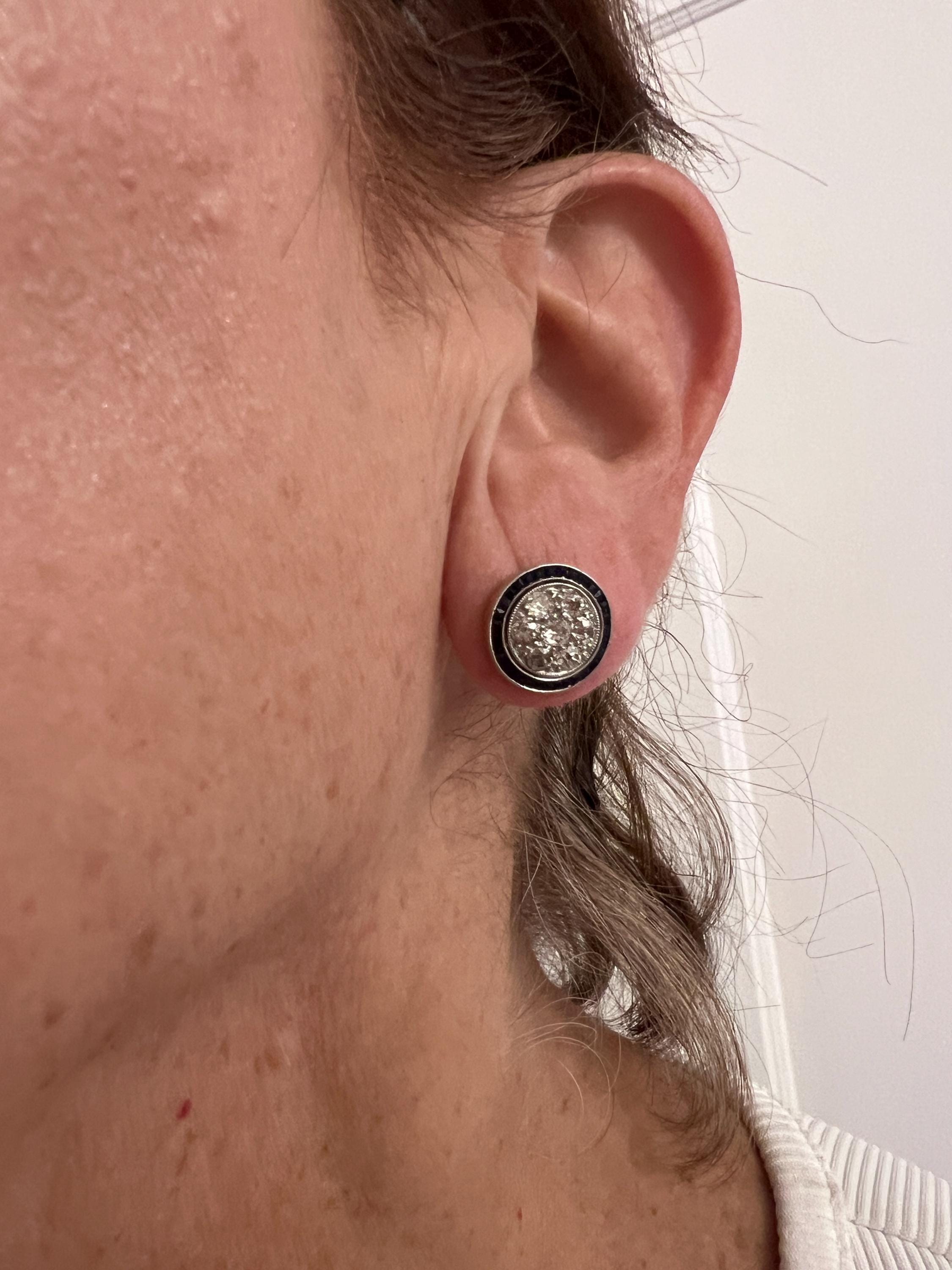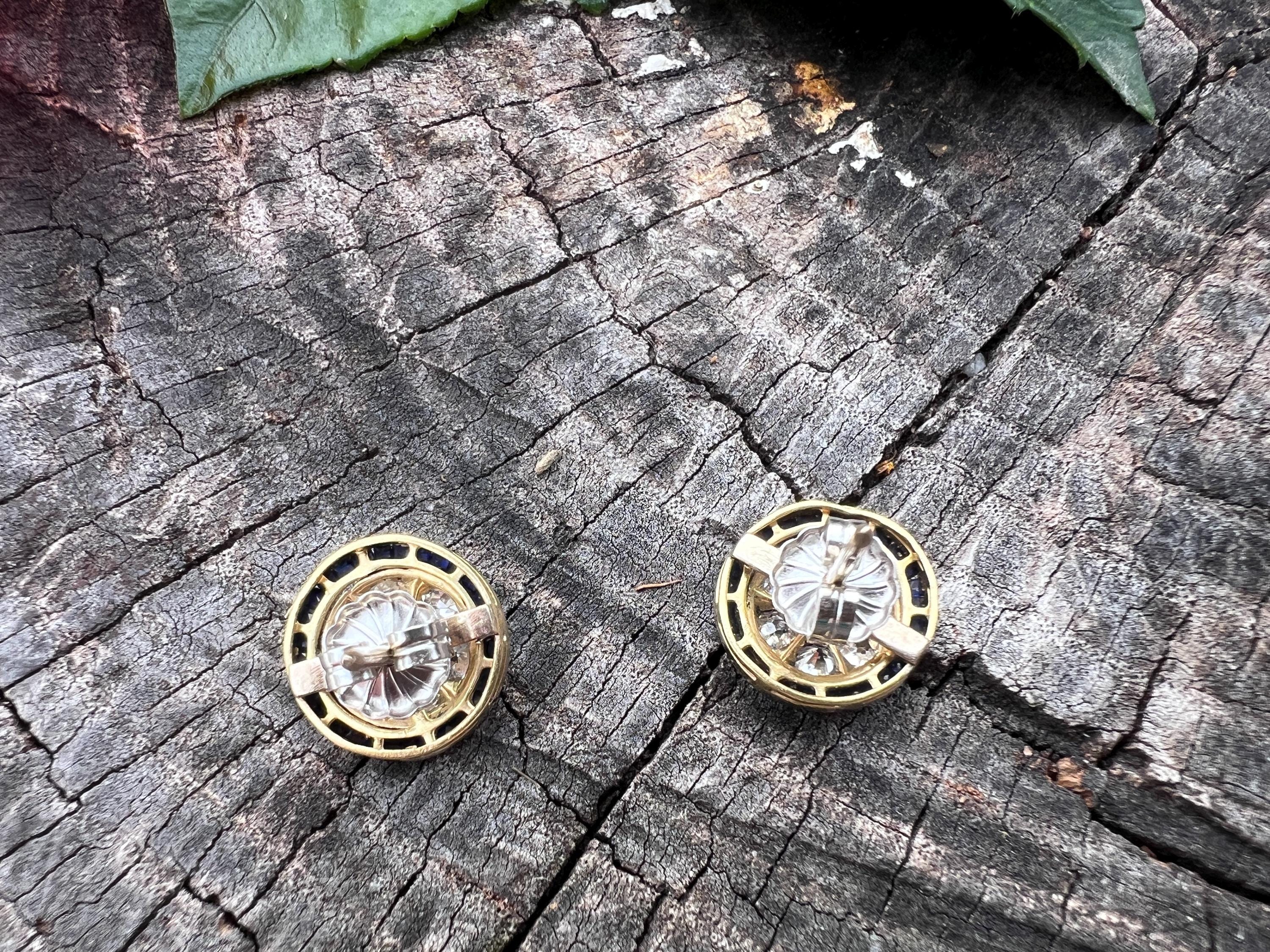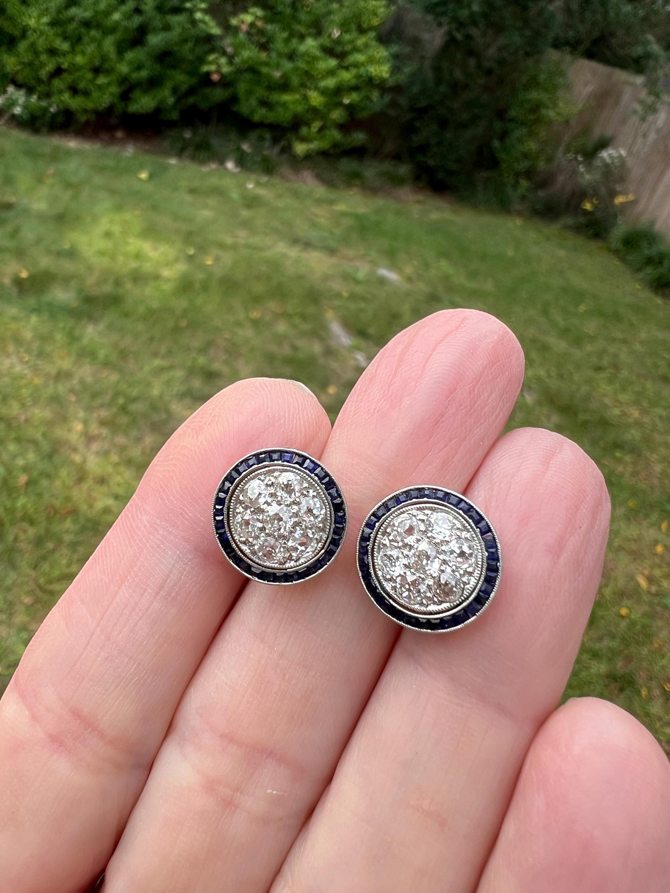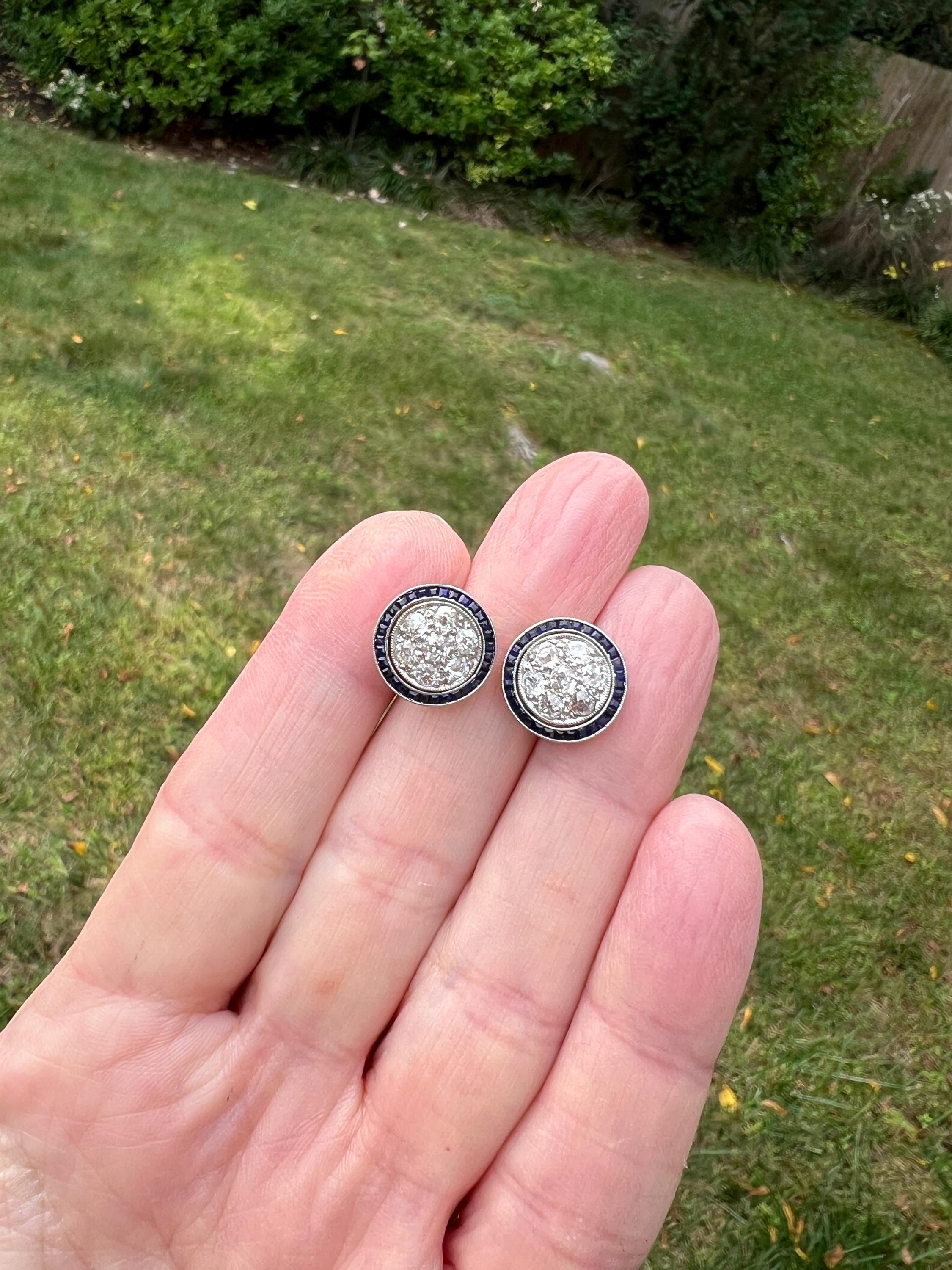 Set in 18k yellow and white gold and platinum these magical earrings are a unique take on a diamond stud. They date from the art deco period of the 1920s. The circular disc earring is blanketed in a platinum setting with old mine cut diamonds dazzling the center. The diamonds have a total approx. weight of 1.75 ct. They are I in color and SI1 in clarity. They are bordered by a circle of square cut sapphires bringing that brush of color, contrast and sophistication. They offer classic beauty and compelling allure. An elegant twist on a classic. They measure 1/2". They weigh 4 grams. The bar that holds the post is 14k gold,