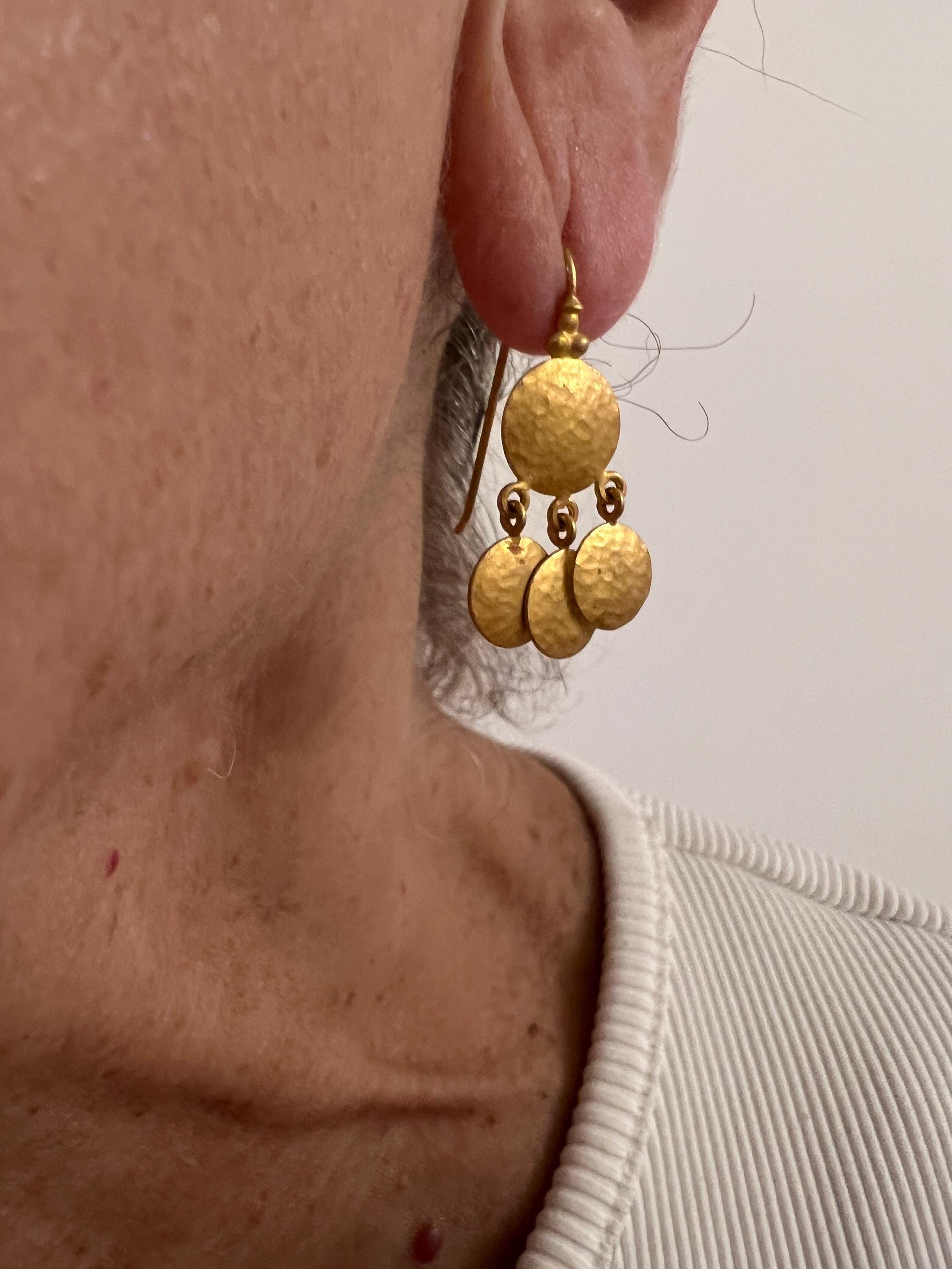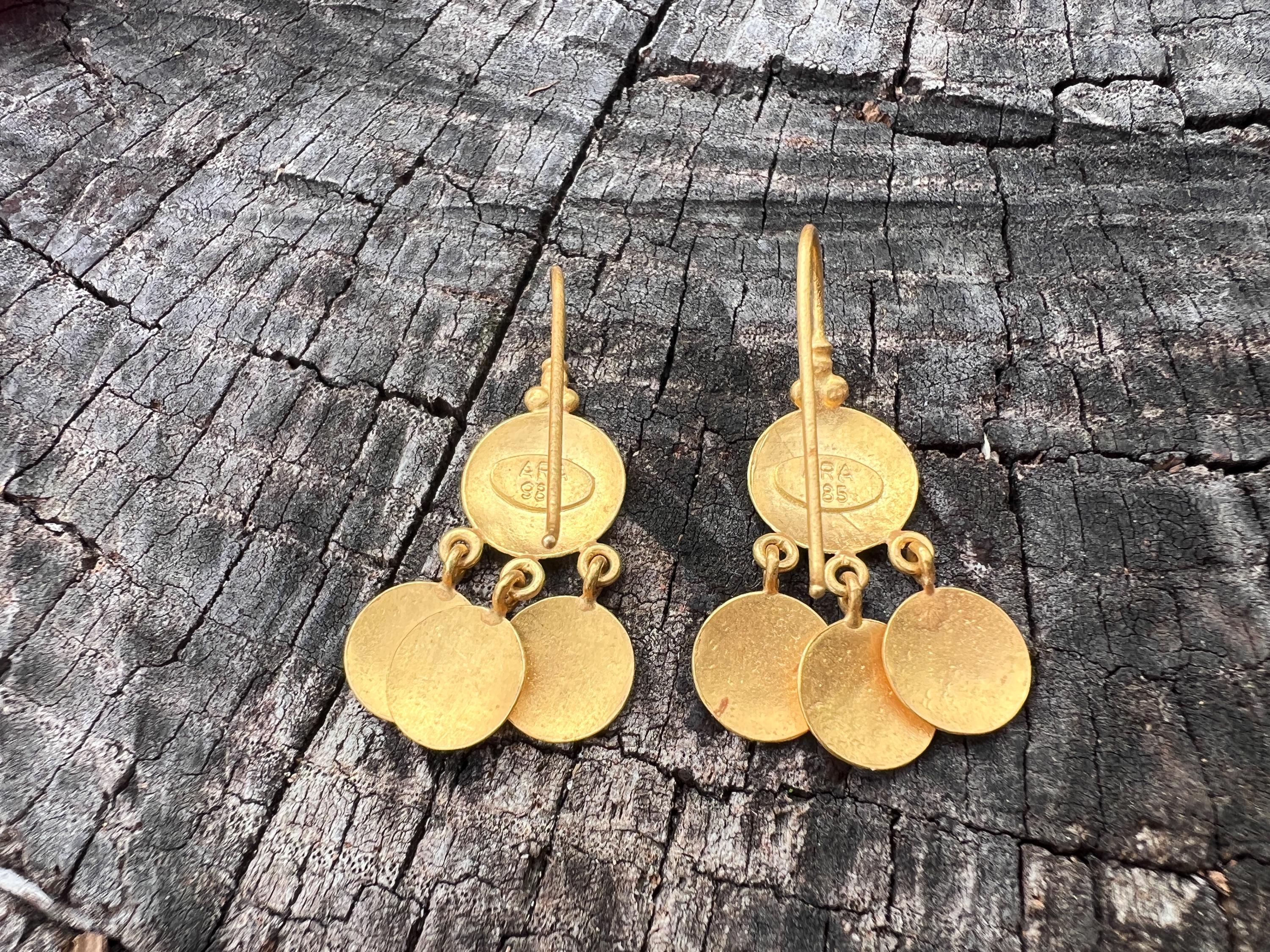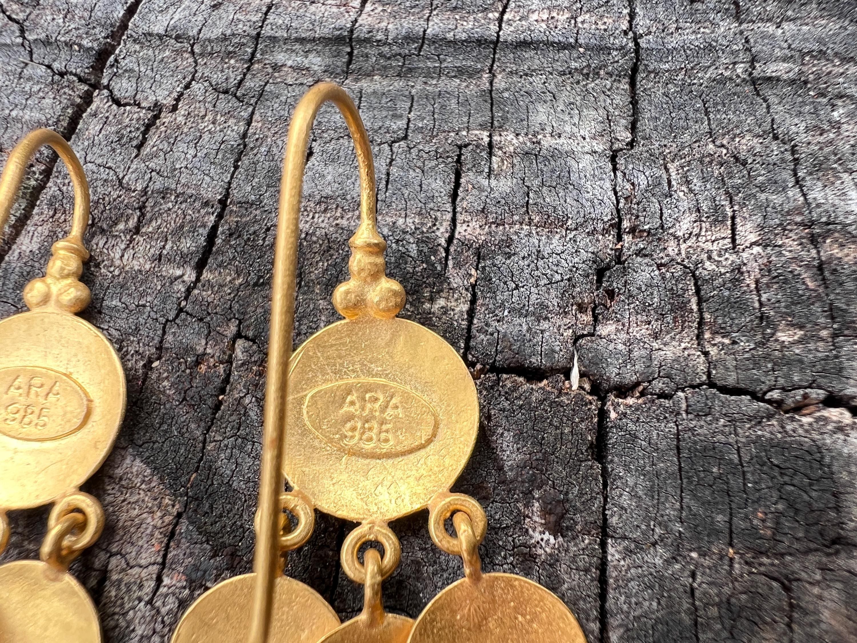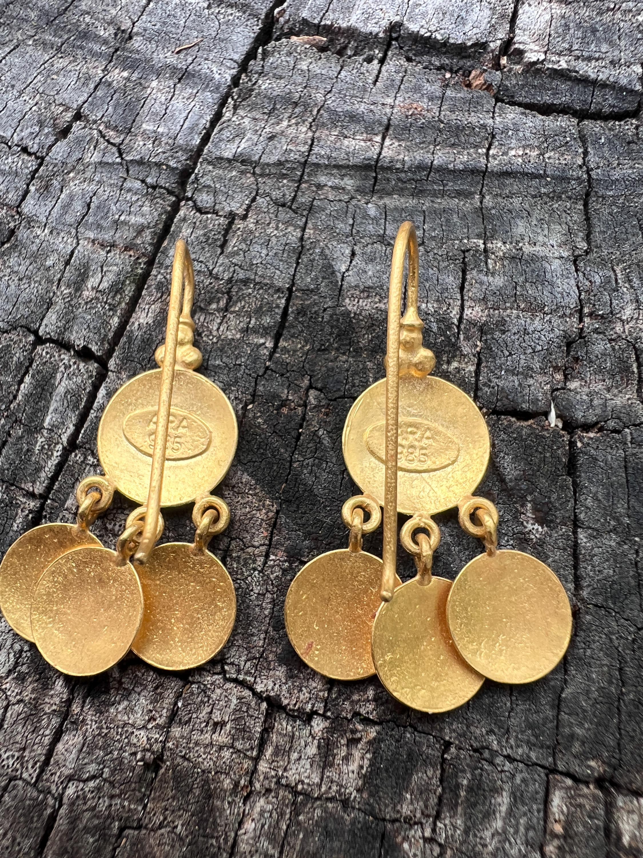 Set in 23k yellow gold, these compelling vintage multi disc earrings are anything by ordinary. The yellow gold round ringlets are linked together to create an endless dangle of hoop uniqueness. These statement makers are a modern and fun twist to the classic. The earrings weigh 5.95 grams. They are 1 " long and 3/4" wide at its widest point. They are made for pierced ears only. They are marked ARA and 985.