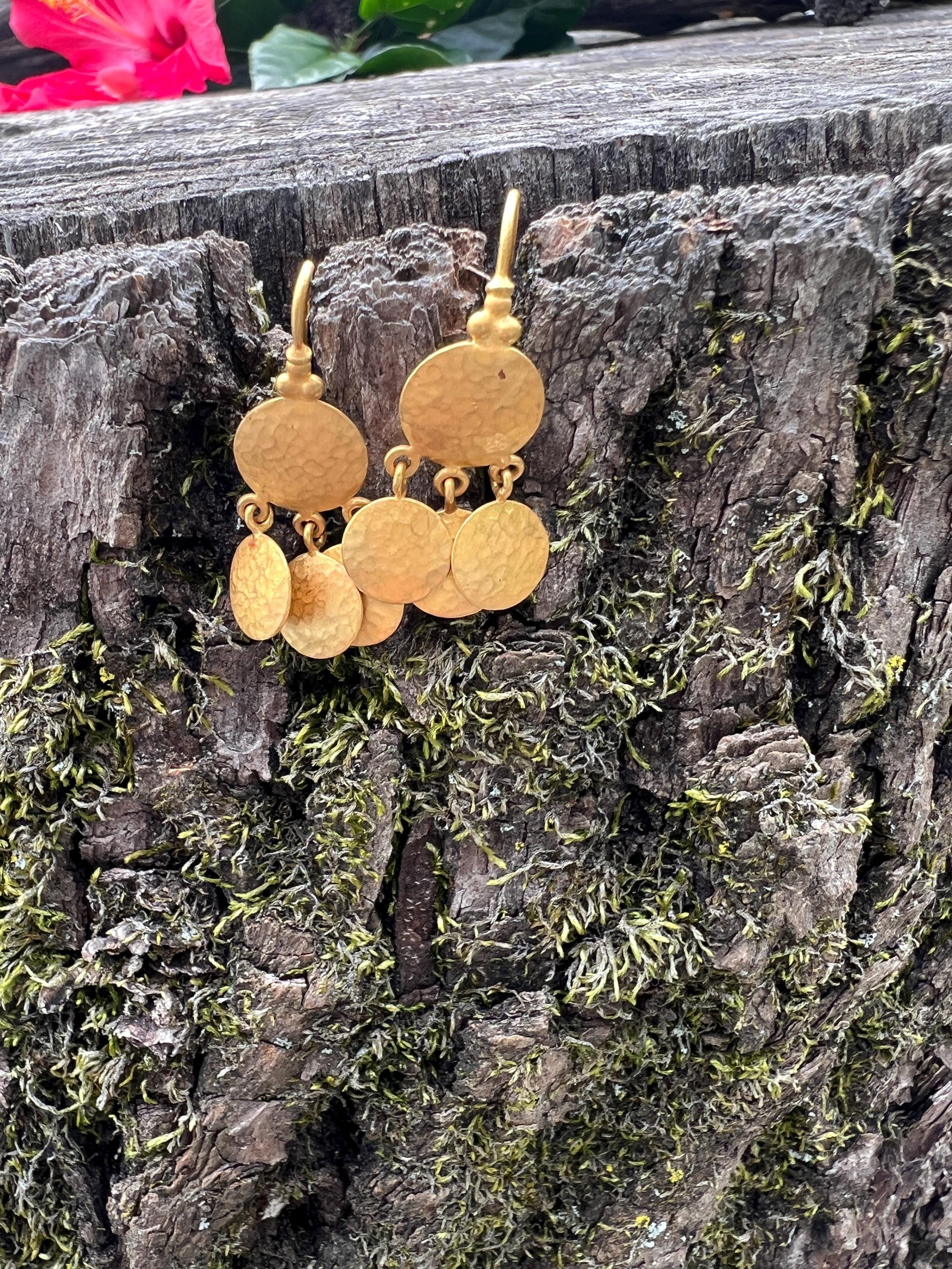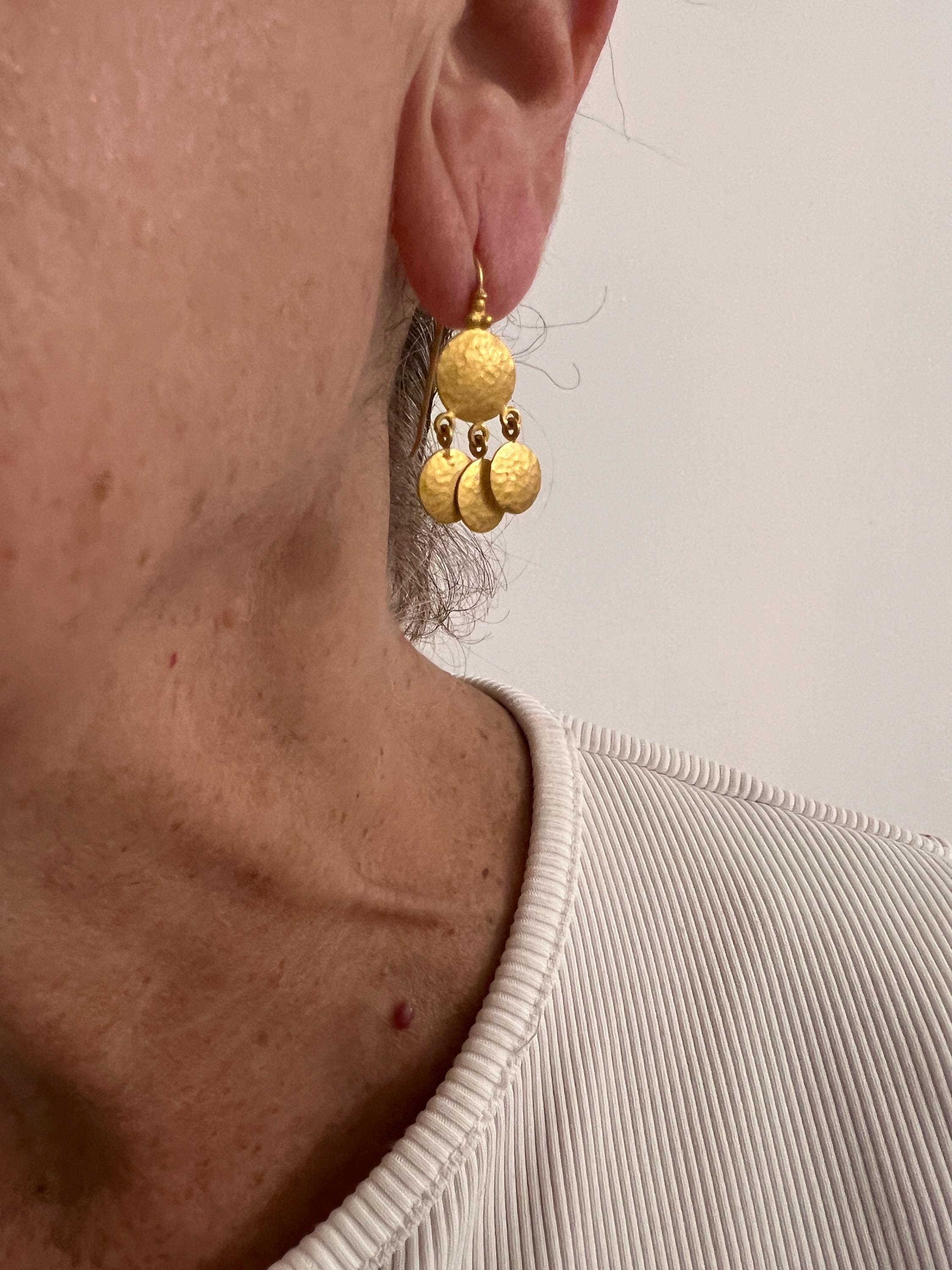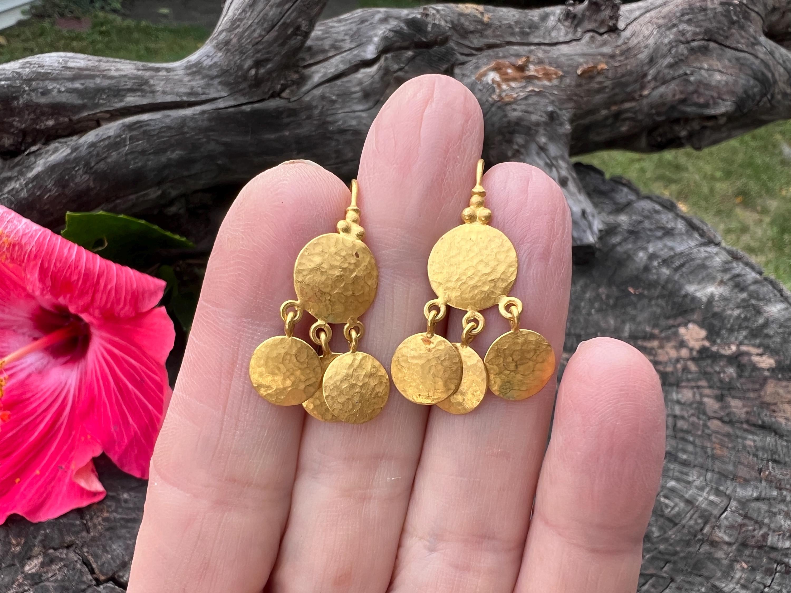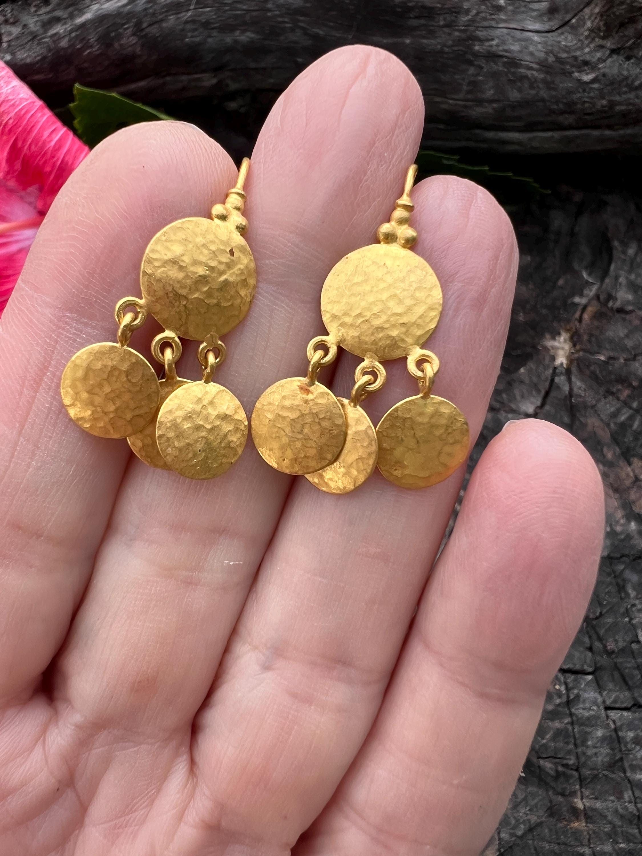 Set in 23k yellow gold, these compelling vintage multi disc earrings are anything by ordinary. The yellow gold round ringlets are linked together to create an endless dangle of hoop uniqueness. These statement makers are a modern and fun twist to the classic. The earrings weigh 5.95 grams. They are 1 " long and 3/4" wide at its widest point. They are made for pierced ears only. They are marked ARA and 985.