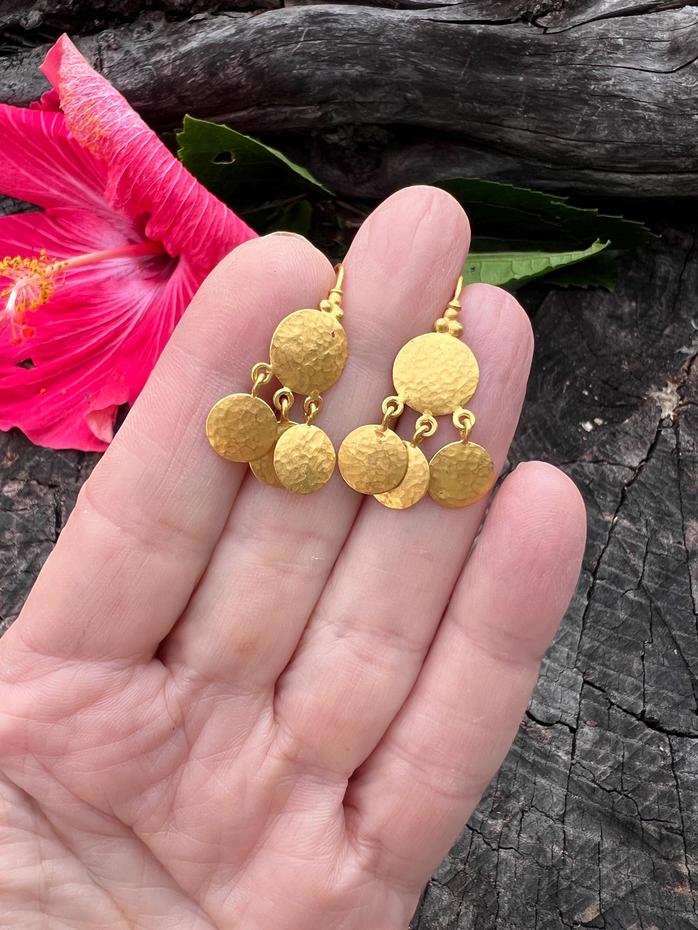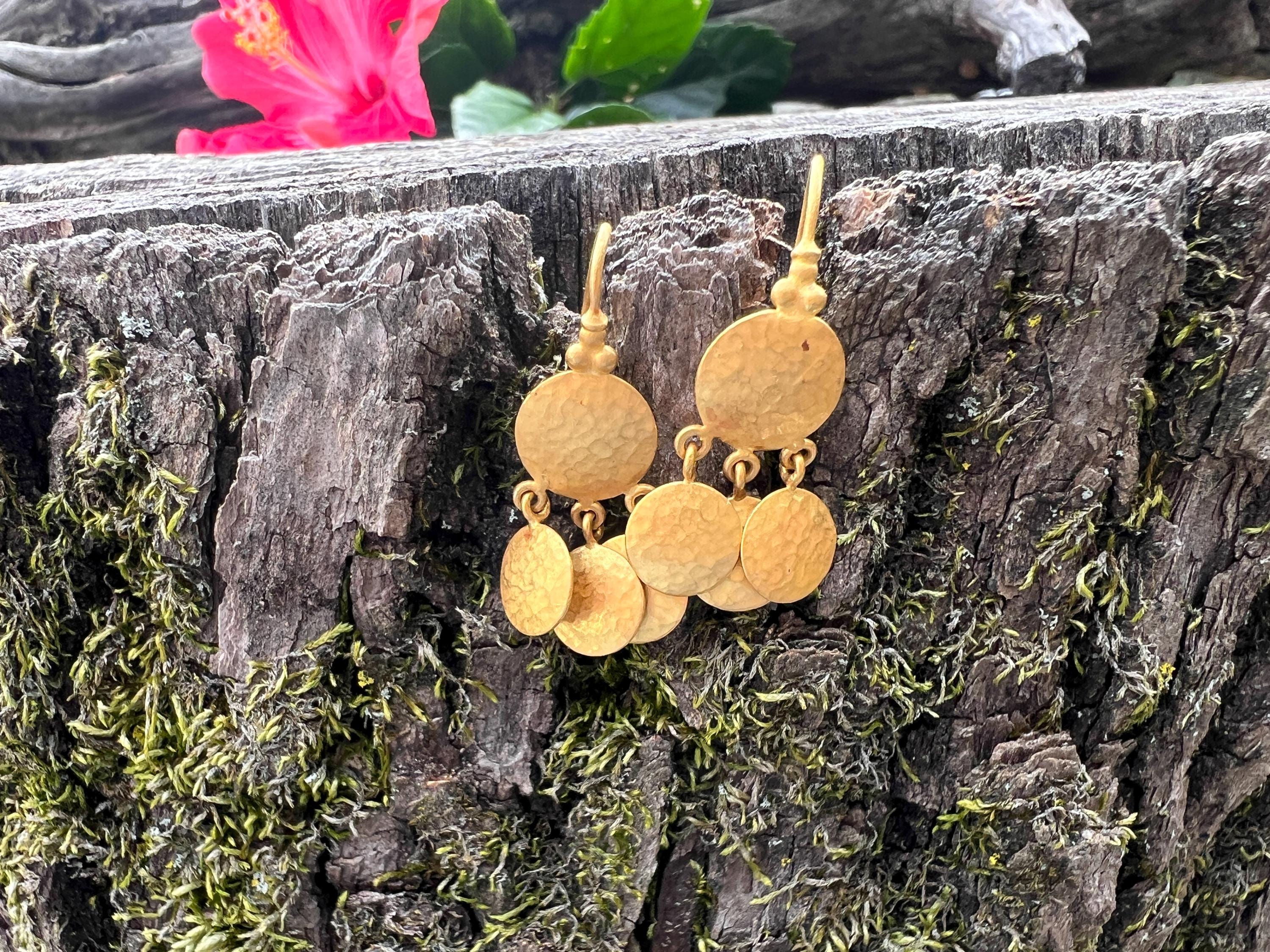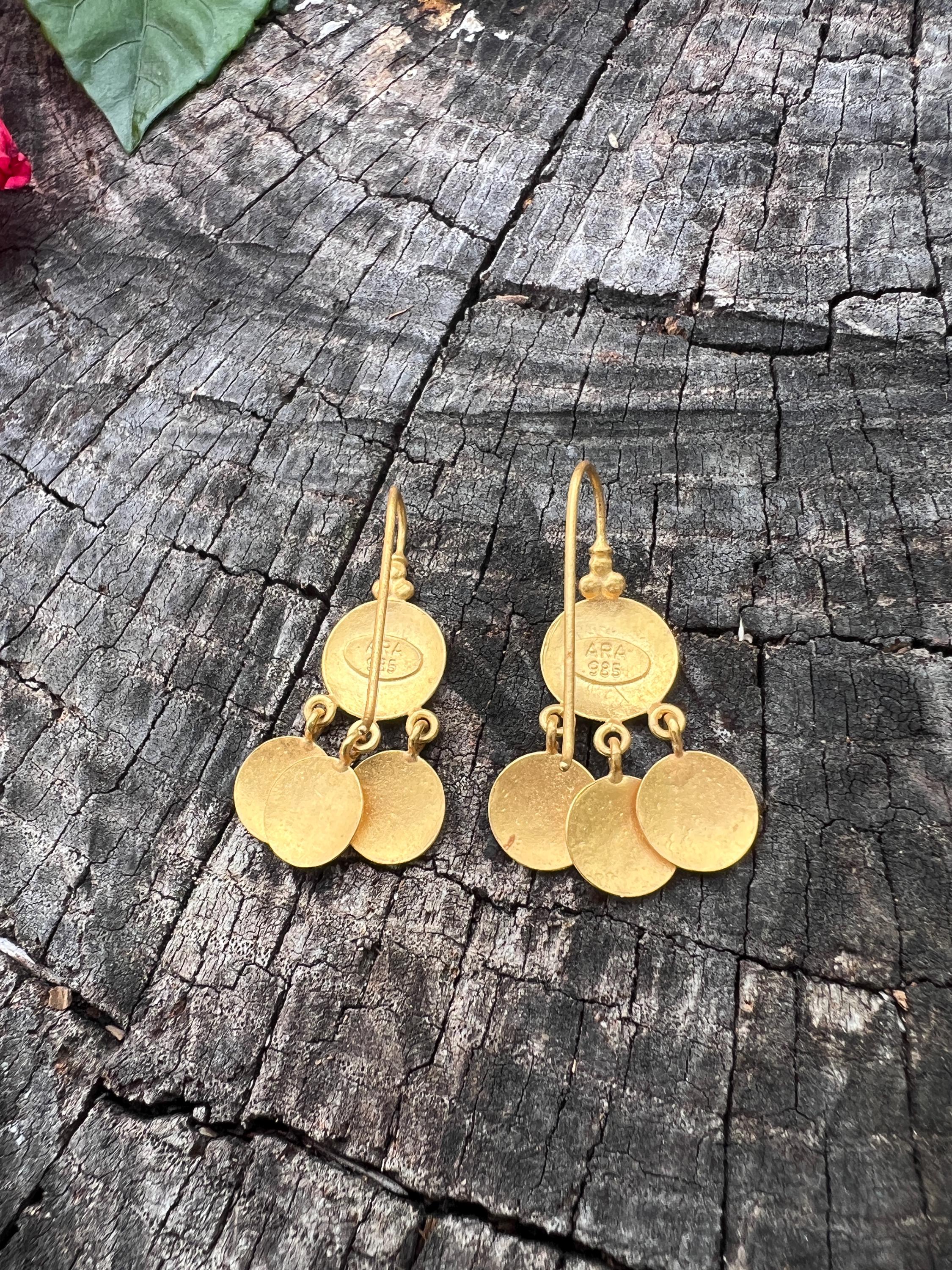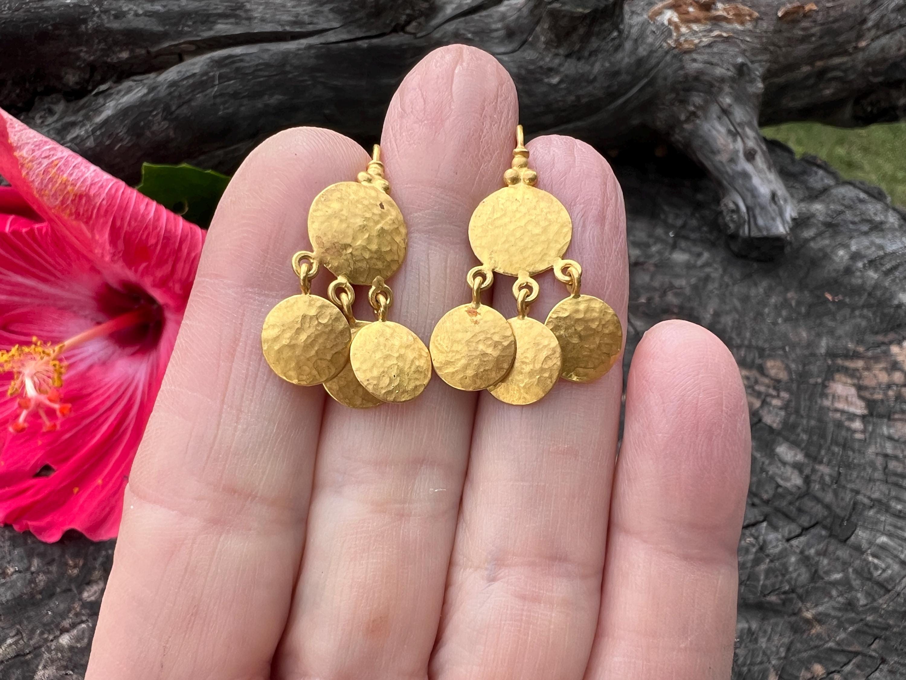 Set in 23k yellow gold, these compelling vintage multi disc earrings are anything by ordinary. The yellow gold round ringlets are linked together to create an endless dangle of hoop uniqueness. These statement makers are a modern and fun twist to the classic. The earrings weigh 5.95 grams. They are 1 " long and 3/4" wide at its widest point. They are made for pierced ears only. They are marked ARA and 985.