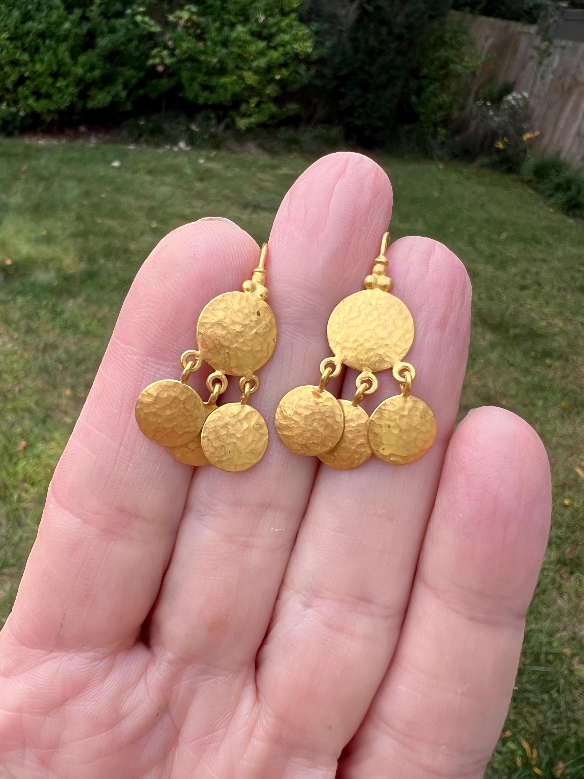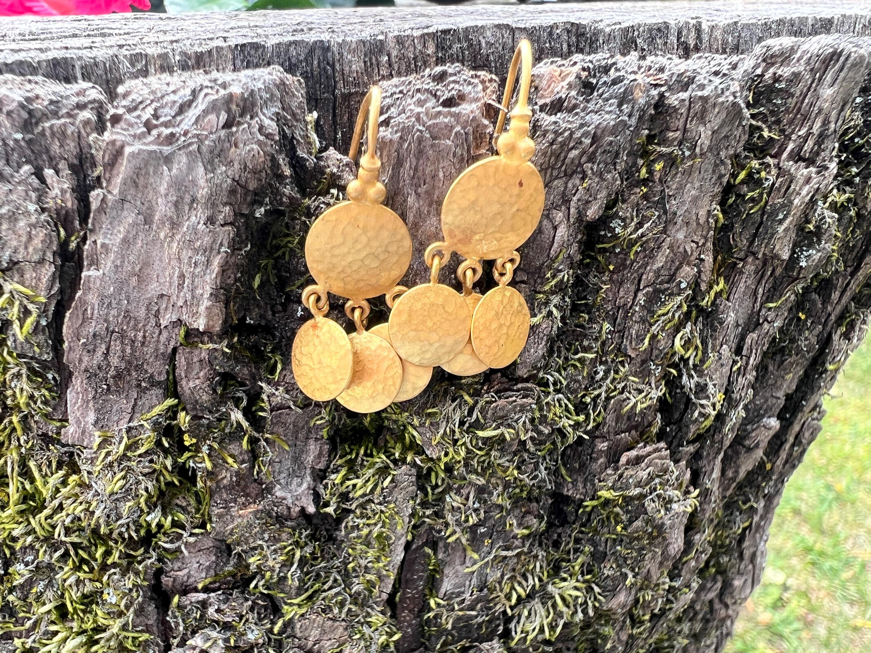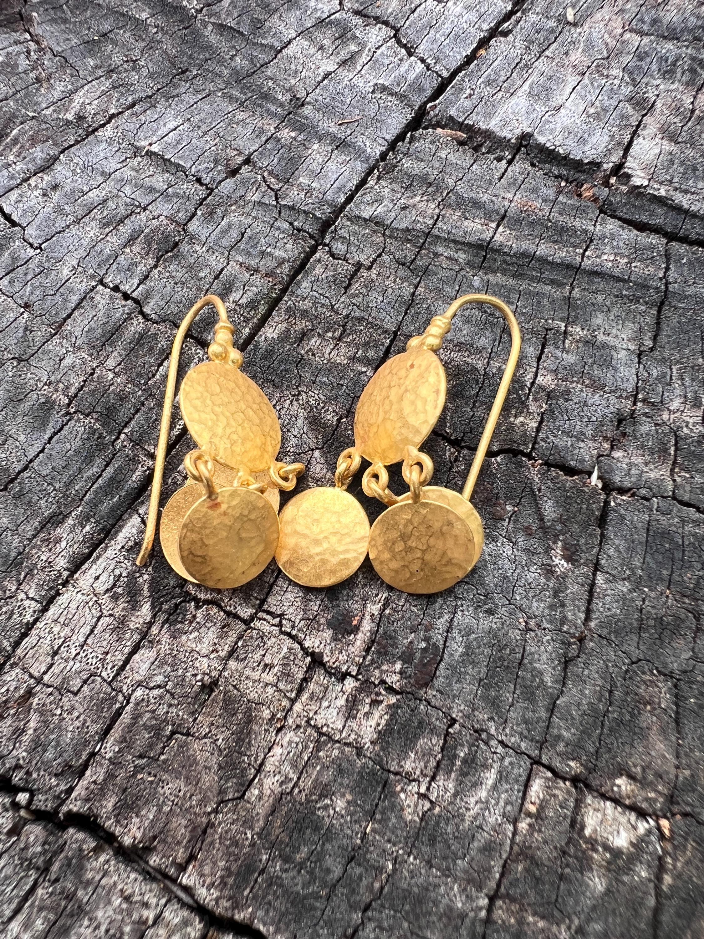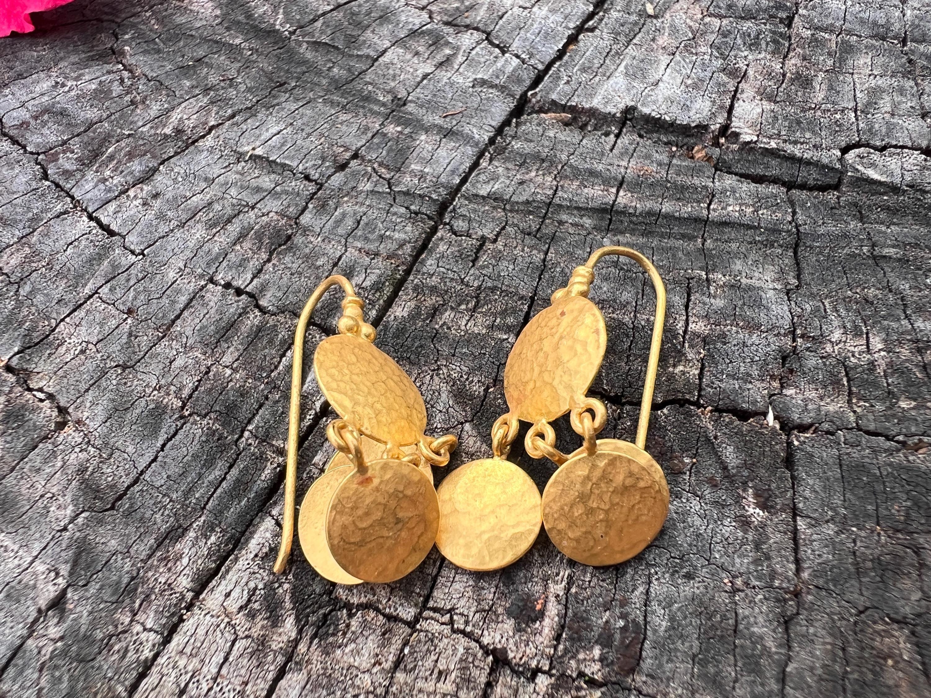 Set in 23k yellow gold, these compelling vintage multi disc earrings are anything by ordinary. The yellow gold round ringlets are linked together to create an endless dangle of hoop uniqueness. These statement makers are a modern and fun twist to the classic. The earrings weigh 5.95 grams. They are 1 " long and 3/4" wide at its widest point. They are made for pierced ears only. They are marked ARA and 985.