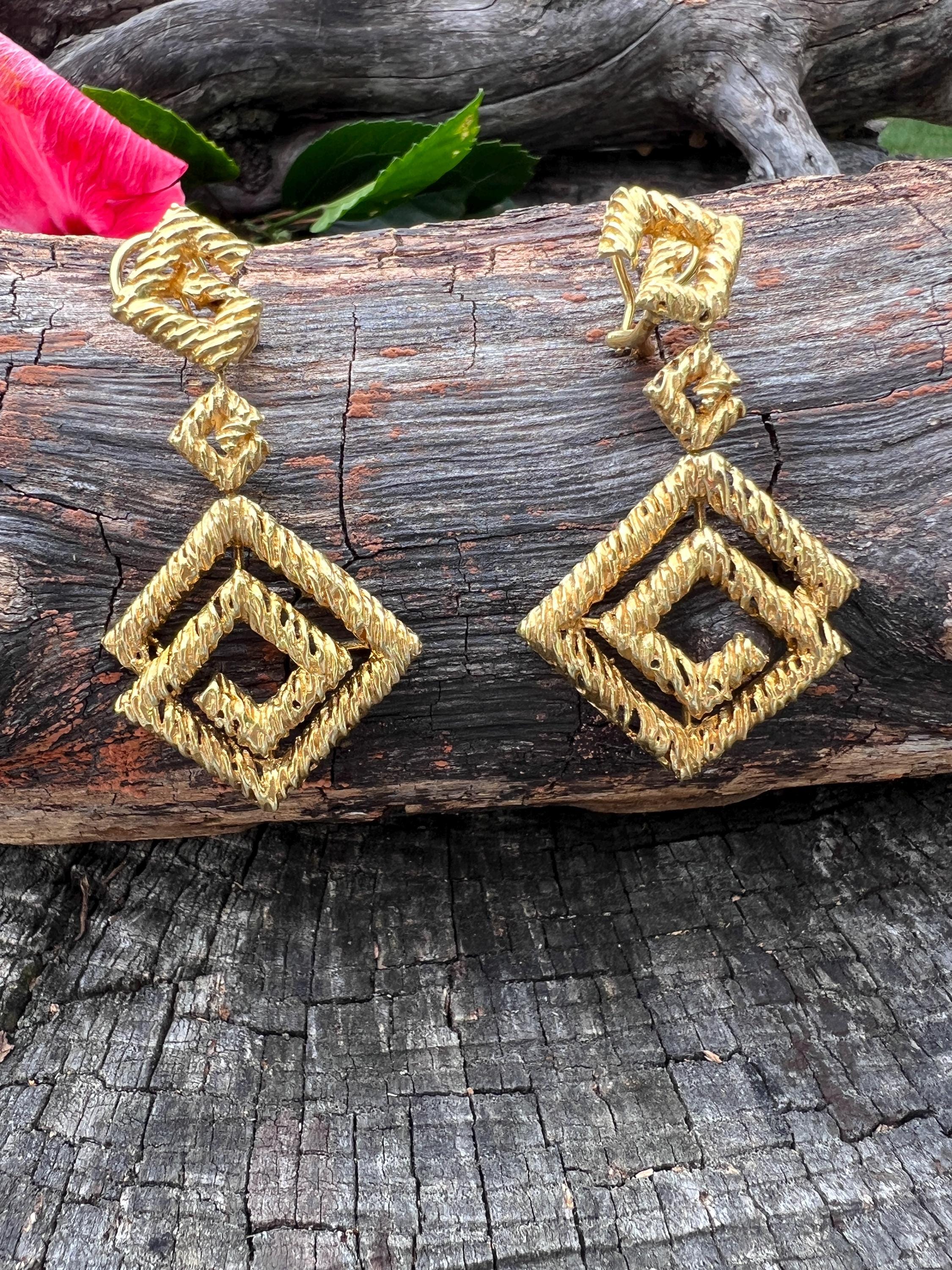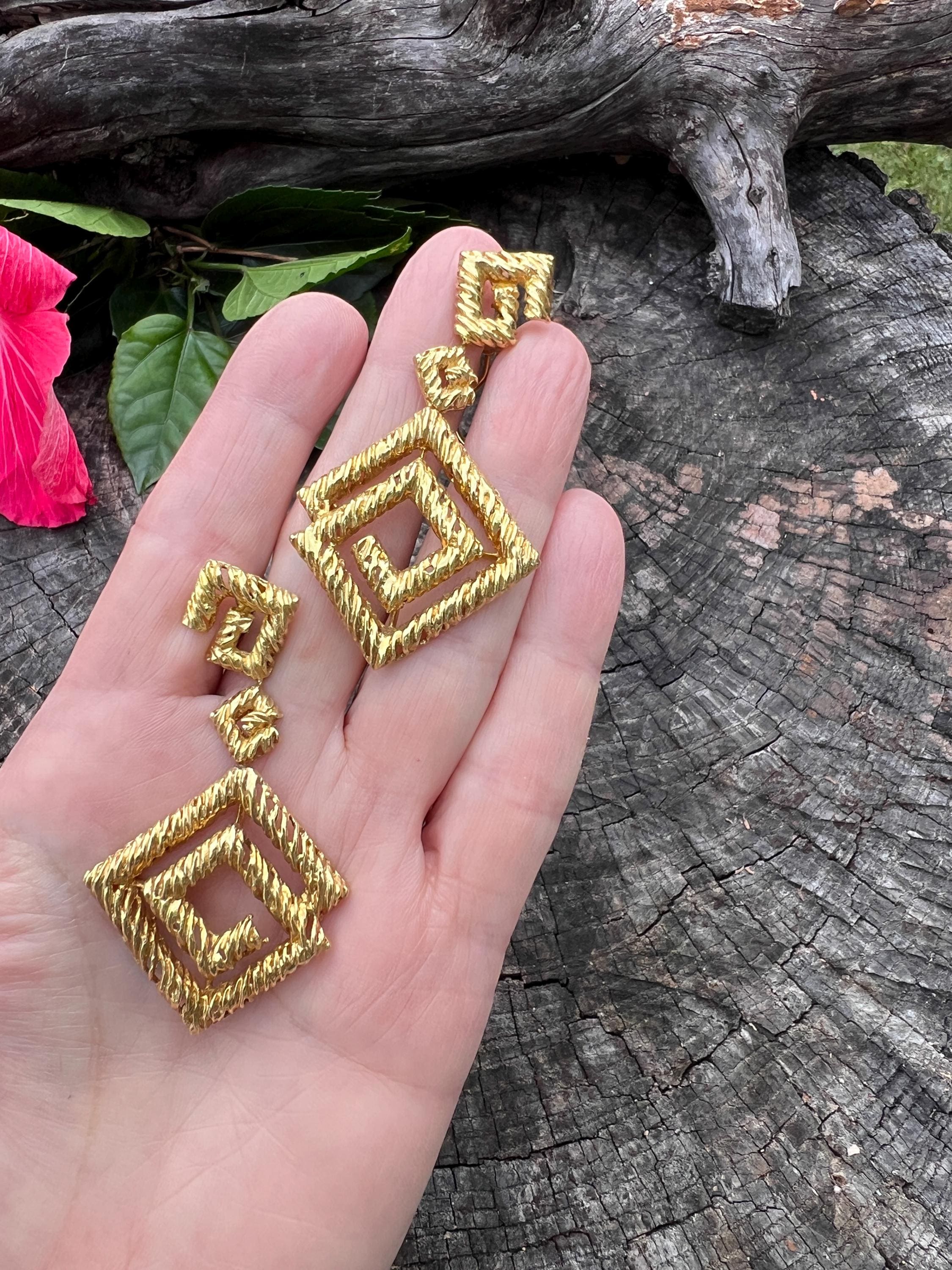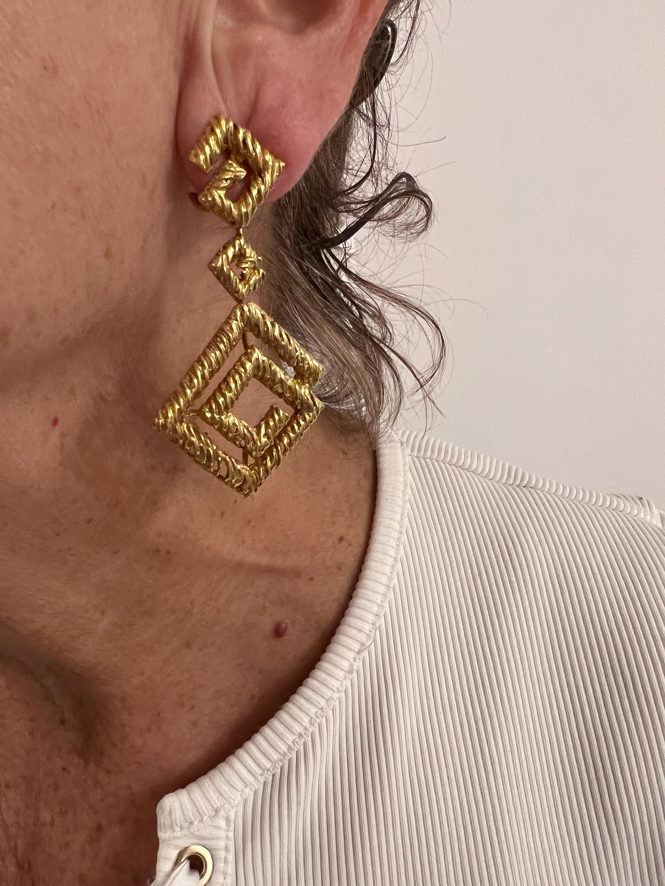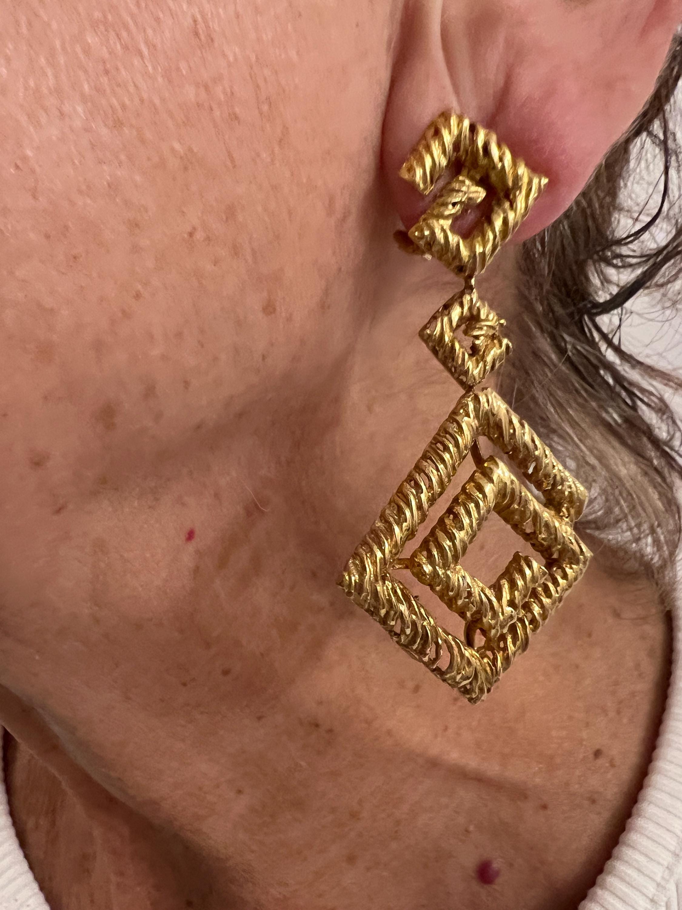 Set in 18k yellow gold, these striking vintage dangle earrings are larger than life. They dates from the 1980’s. The earrings are comprised of beautifully twisted ropes of textured gold tightly wound around a series of dramatic shapes. They It creates a geometric pattern and three dimensional effect. Daringly bold and sensational y powerful. They measures 2 1/2" long. The bottoms measure 1 1/4" x 1 3/8". The top is 1/2" x 1/2" and the middle is 1/4". The earrings are marked 18k. They weighs 25.58 grams. They are made for pierced ears.