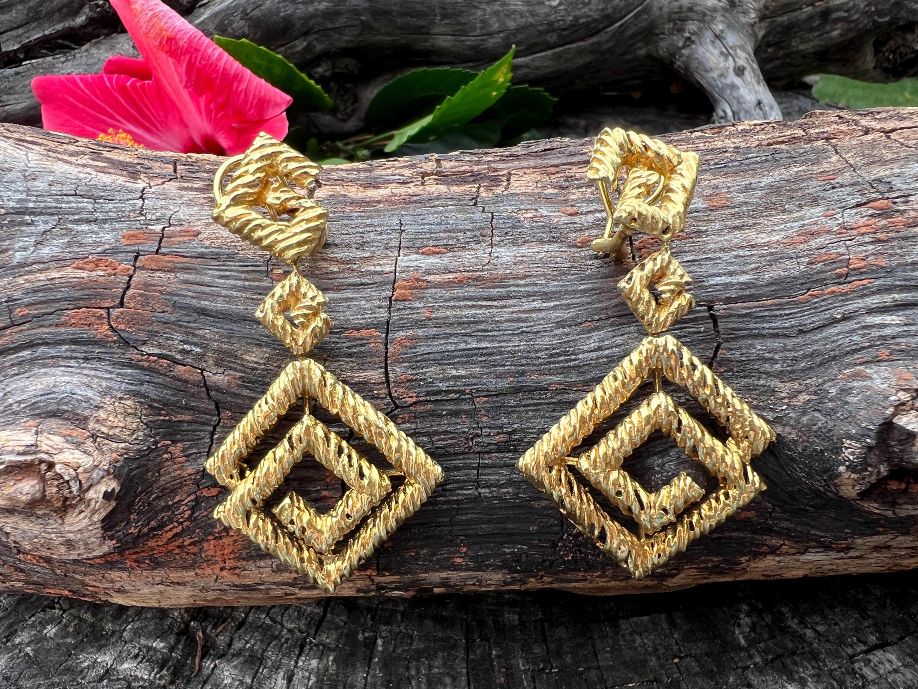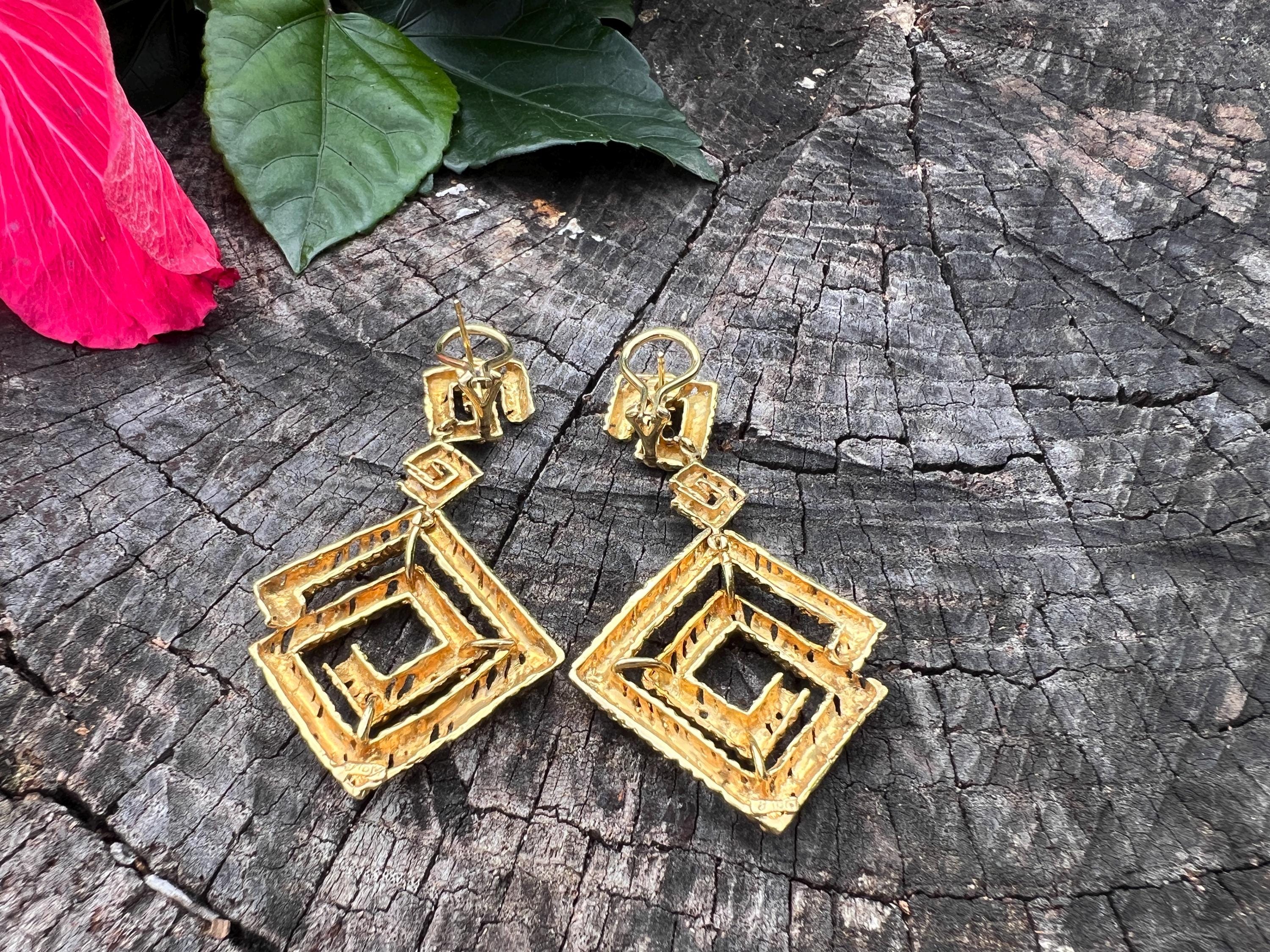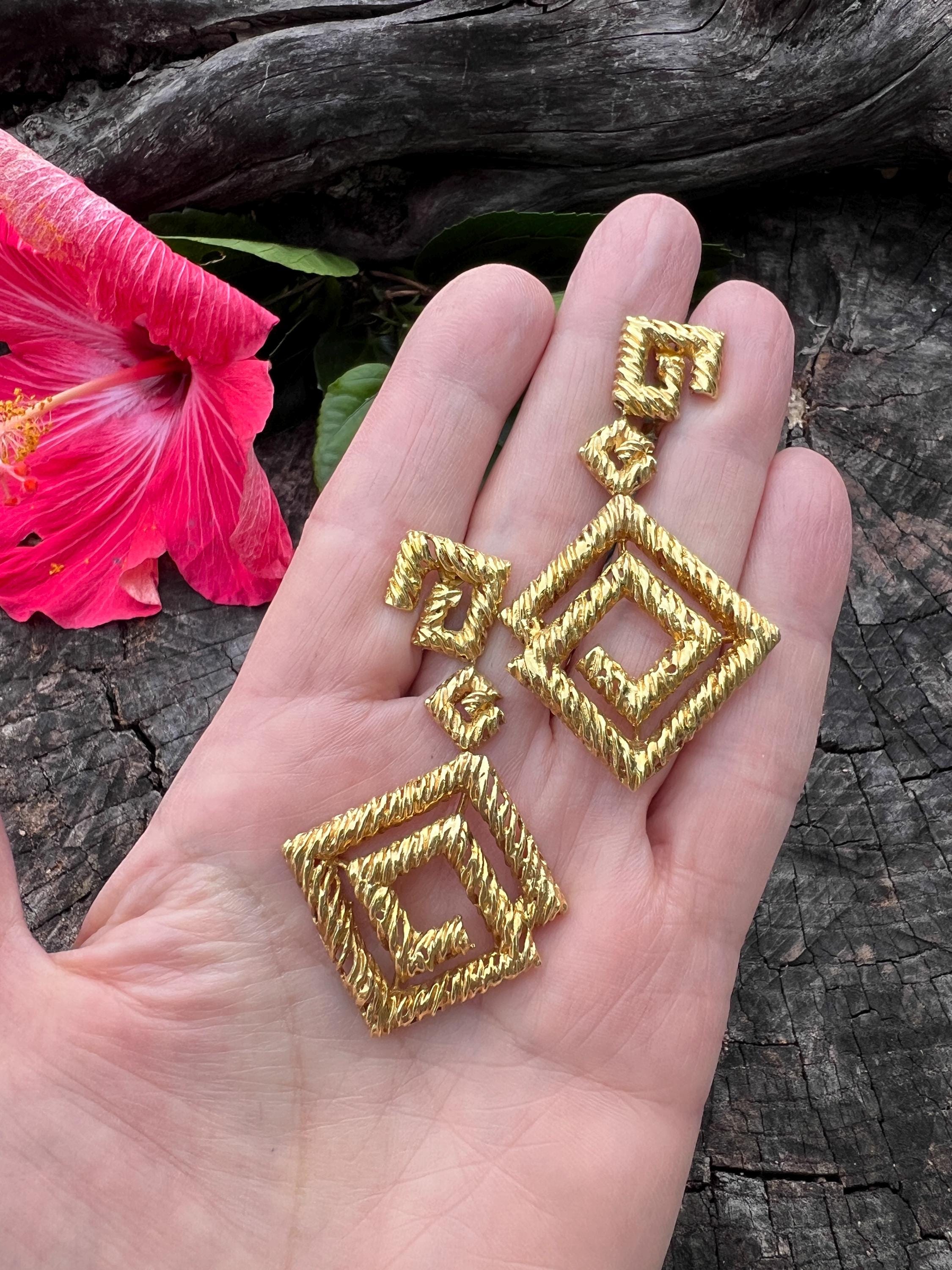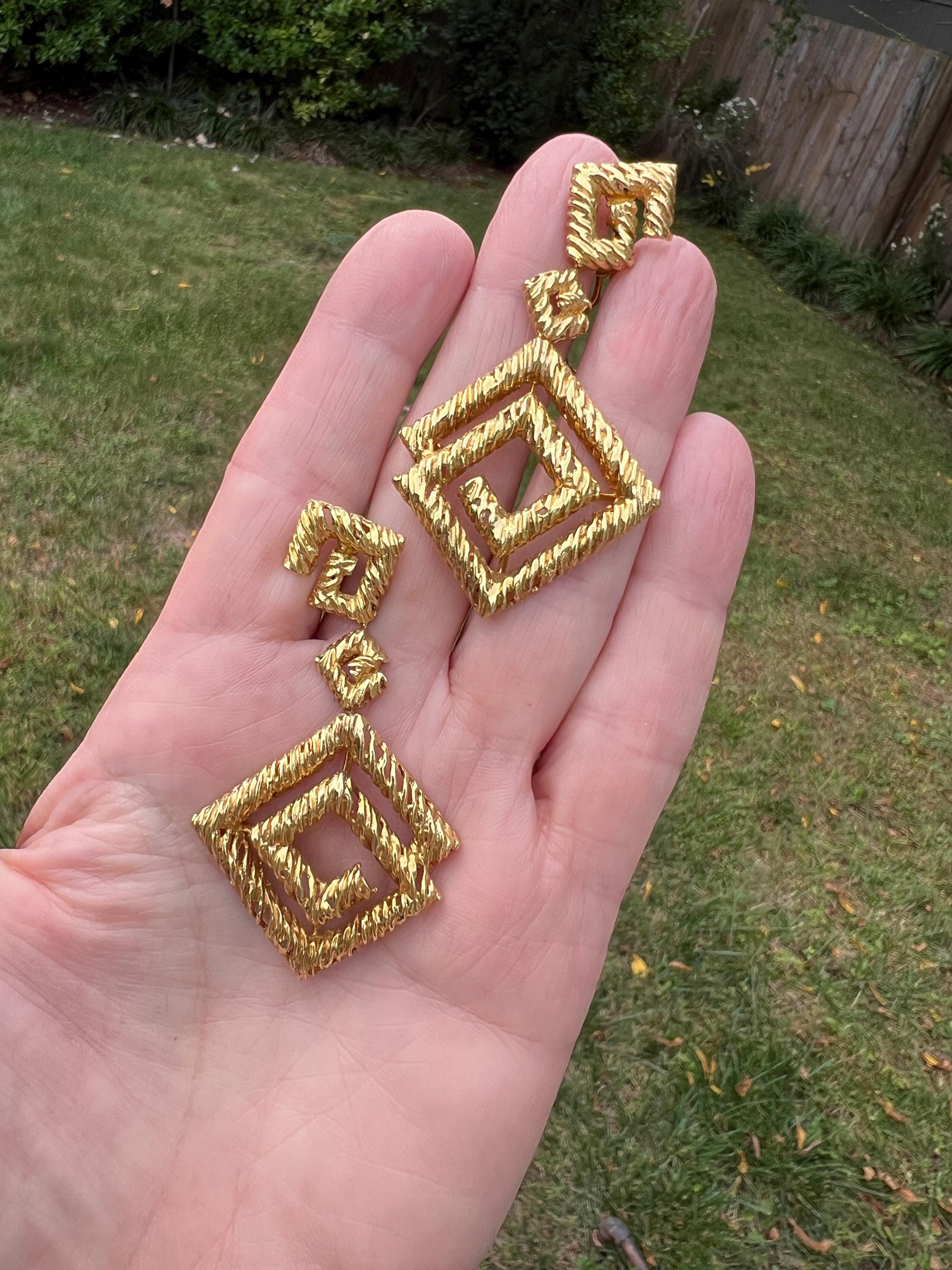 Set in 18k yellow gold, these striking vintage dangle earrings are larger than life. They dates from the 1980’s. The earrings are comprised of beautifully twisted ropes of textured gold tightly wound around a series of dramatic shapes. They It creates a geometric pattern and three dimensional effect. Daringly bold and sensational y powerful. They measures 2 1/2" long. The bottoms measure 1 1/4" x 1 3/8". The top is 1/2" x 1/2" and the middle is 1/4". The earrings are marked 18k. They weighs 25.58 grams. They are made for pierced ears.