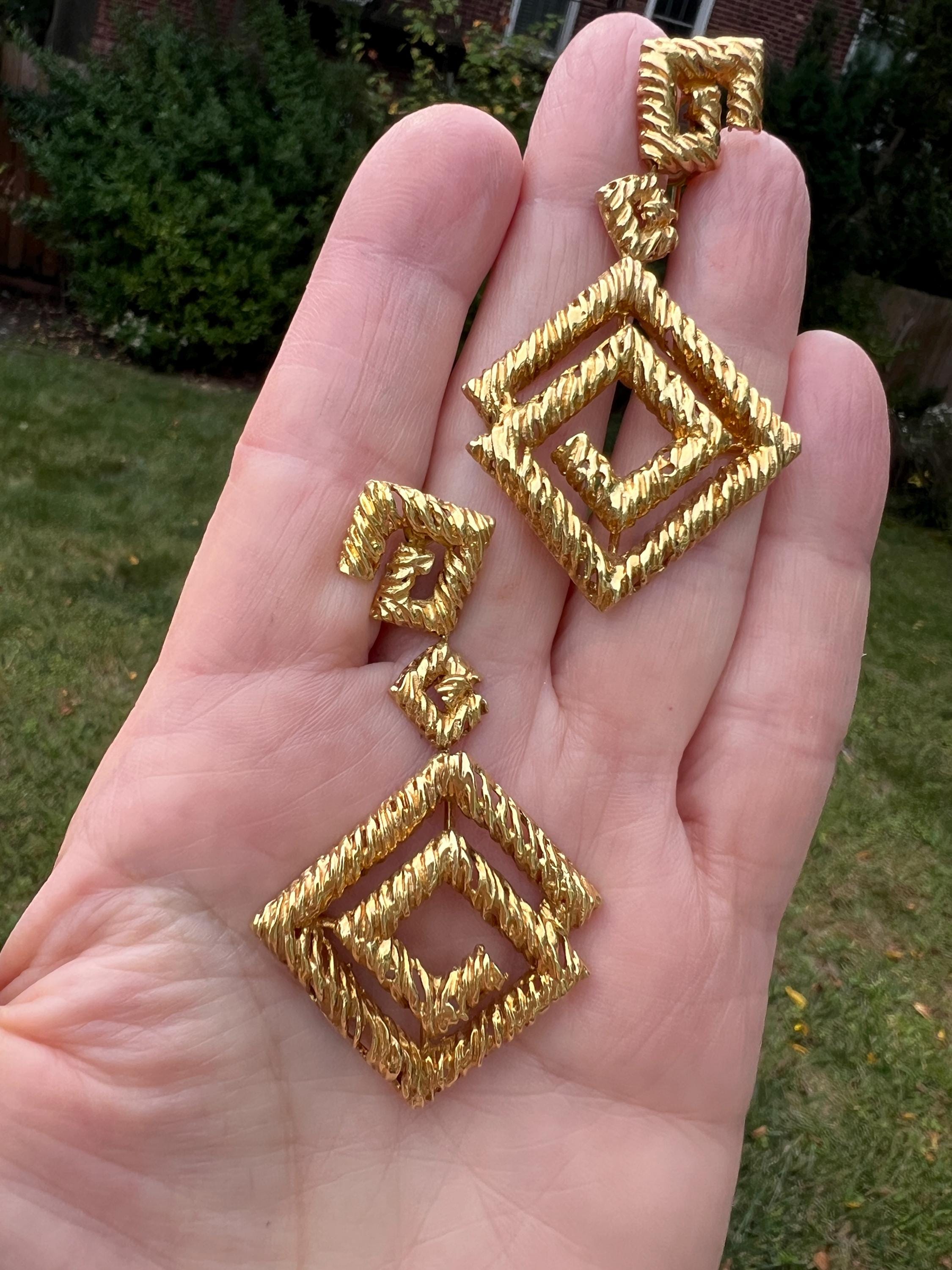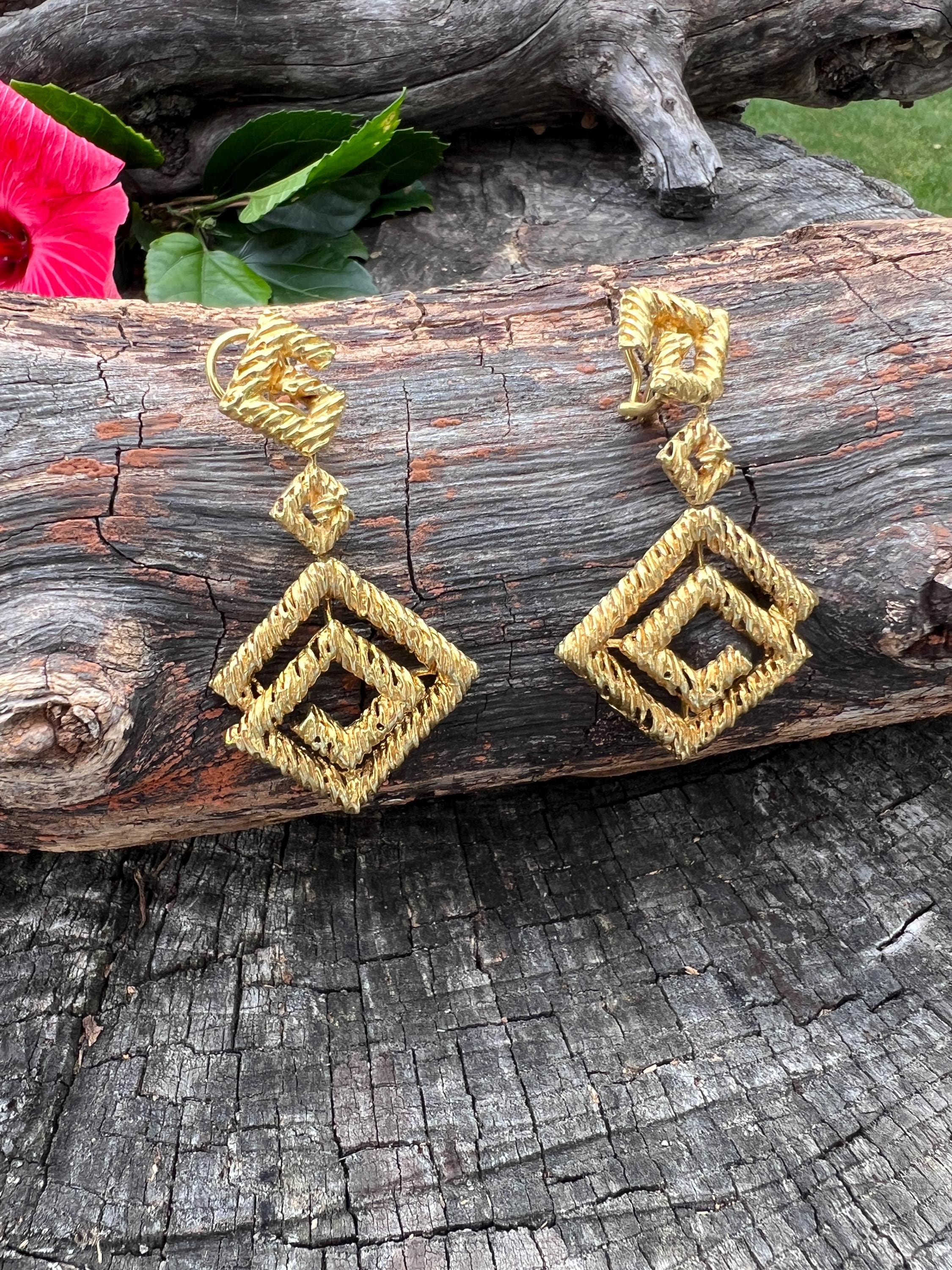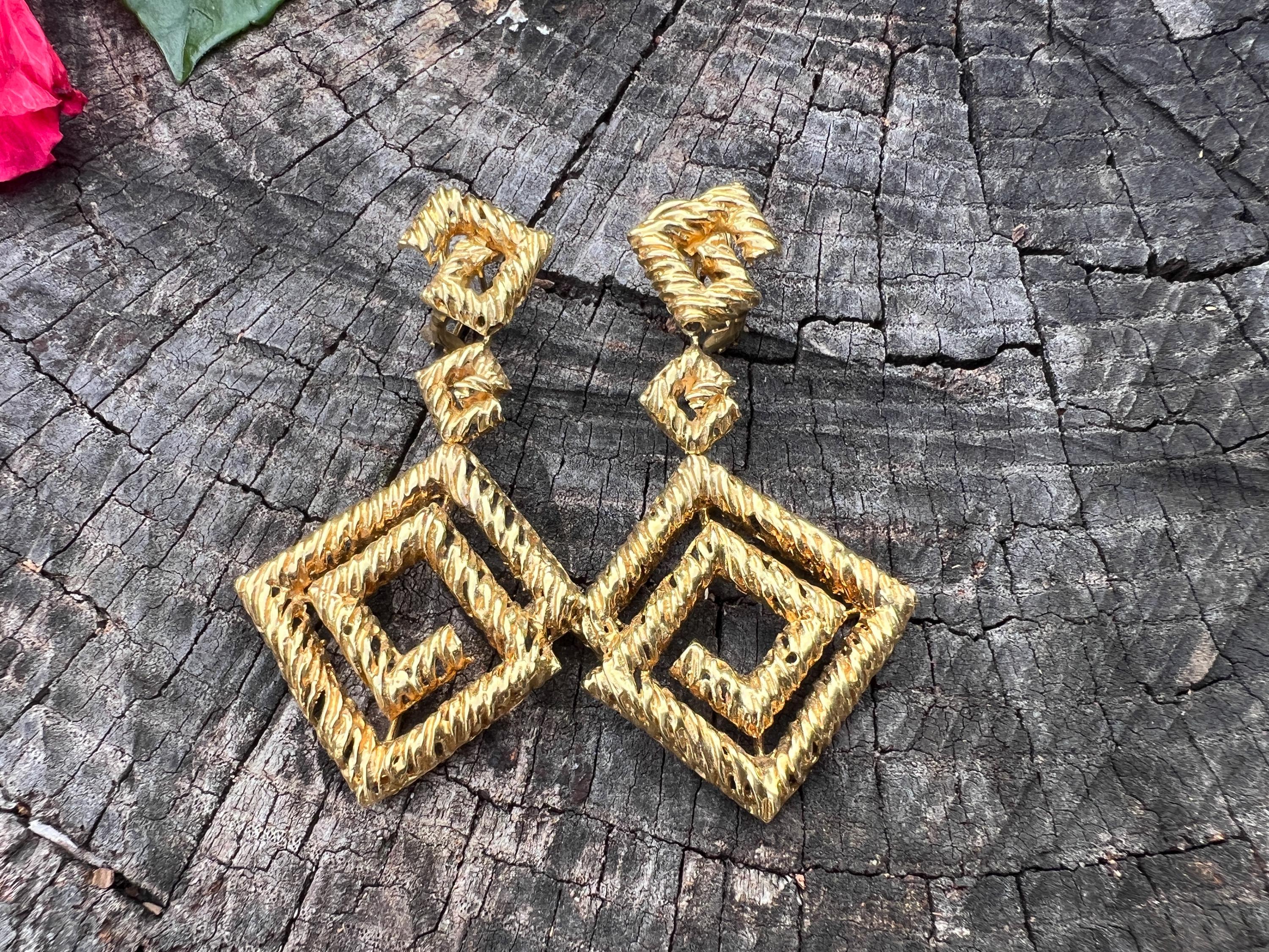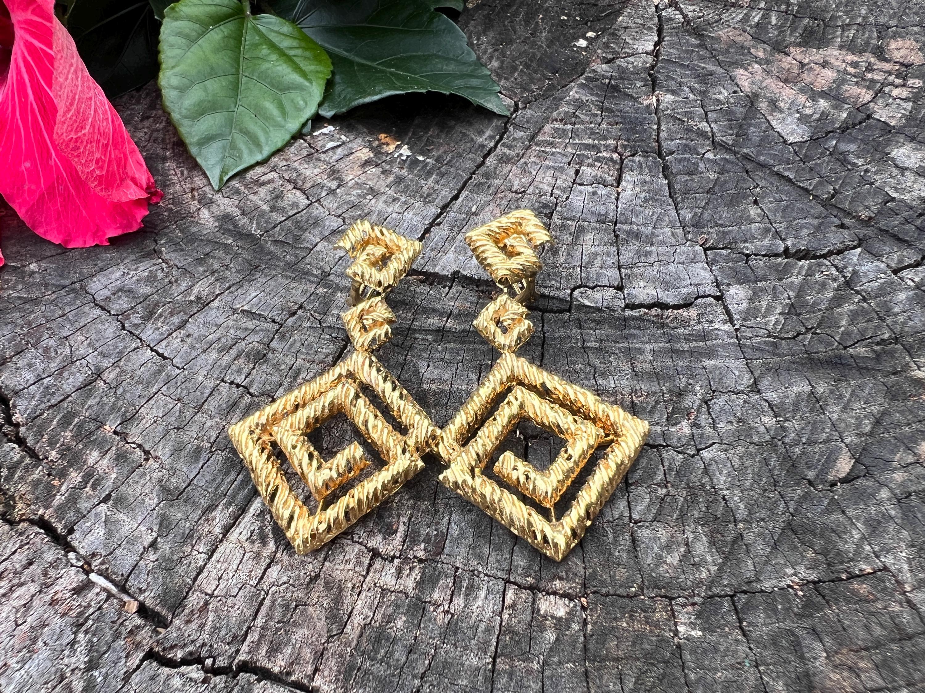 Set in 18k yellow gold, these striking vintage dangle earrings are larger than life. They dates from the 1980’s. The earrings are comprised of beautifully twisted ropes of textured gold tightly wound around a series of dramatic shapes. They It creates a geometric pattern and three dimensional effect. Daringly bold and sensational y powerful. They measures 2 1/2" long. The bottoms measure 1 1/4" x 1 3/8". The top is 1/2" x 1/2" and the middle is 1/4". The earrings are marked 18k. They weighs 25.58 grams. They are made for pierced ears.