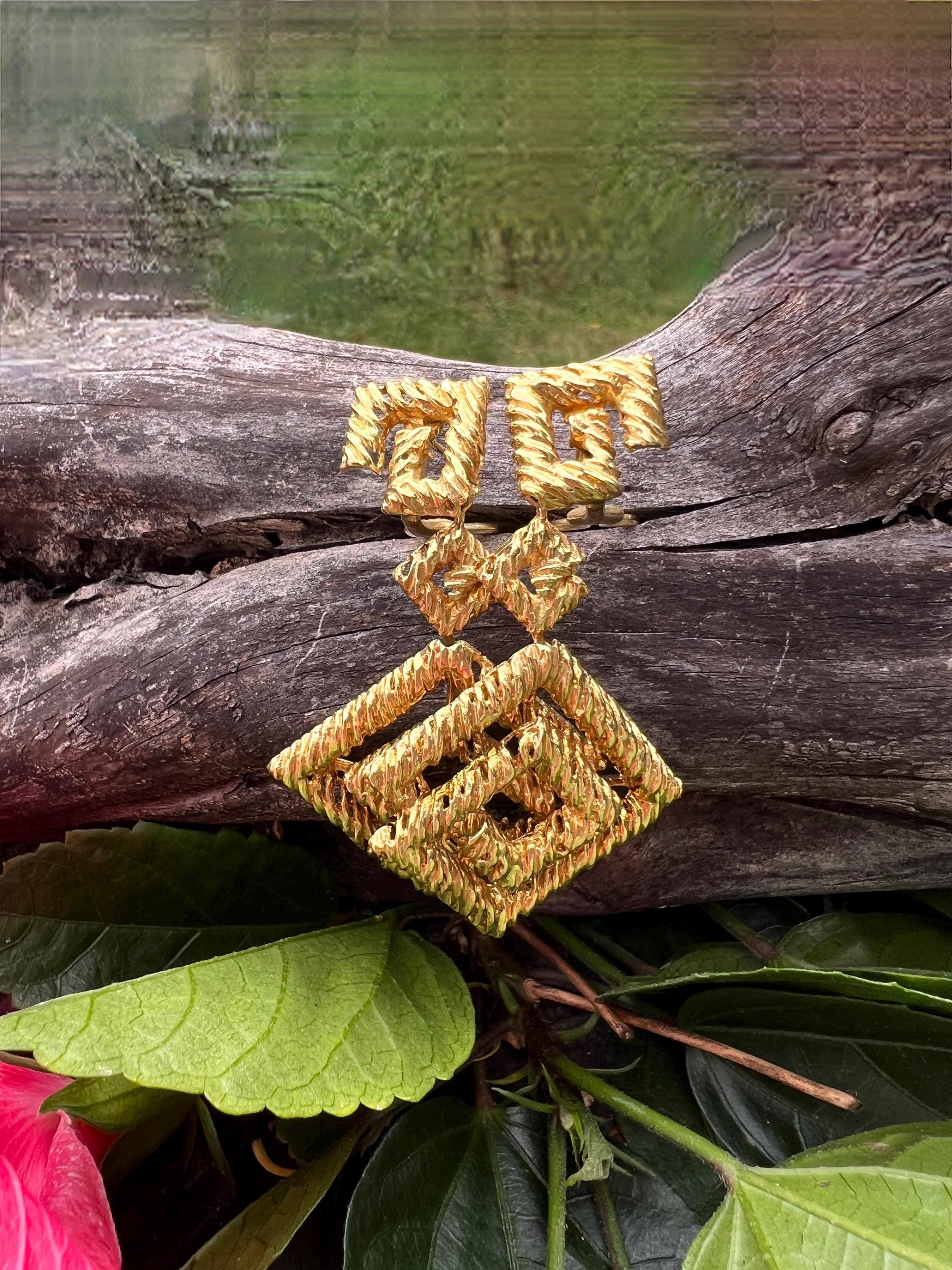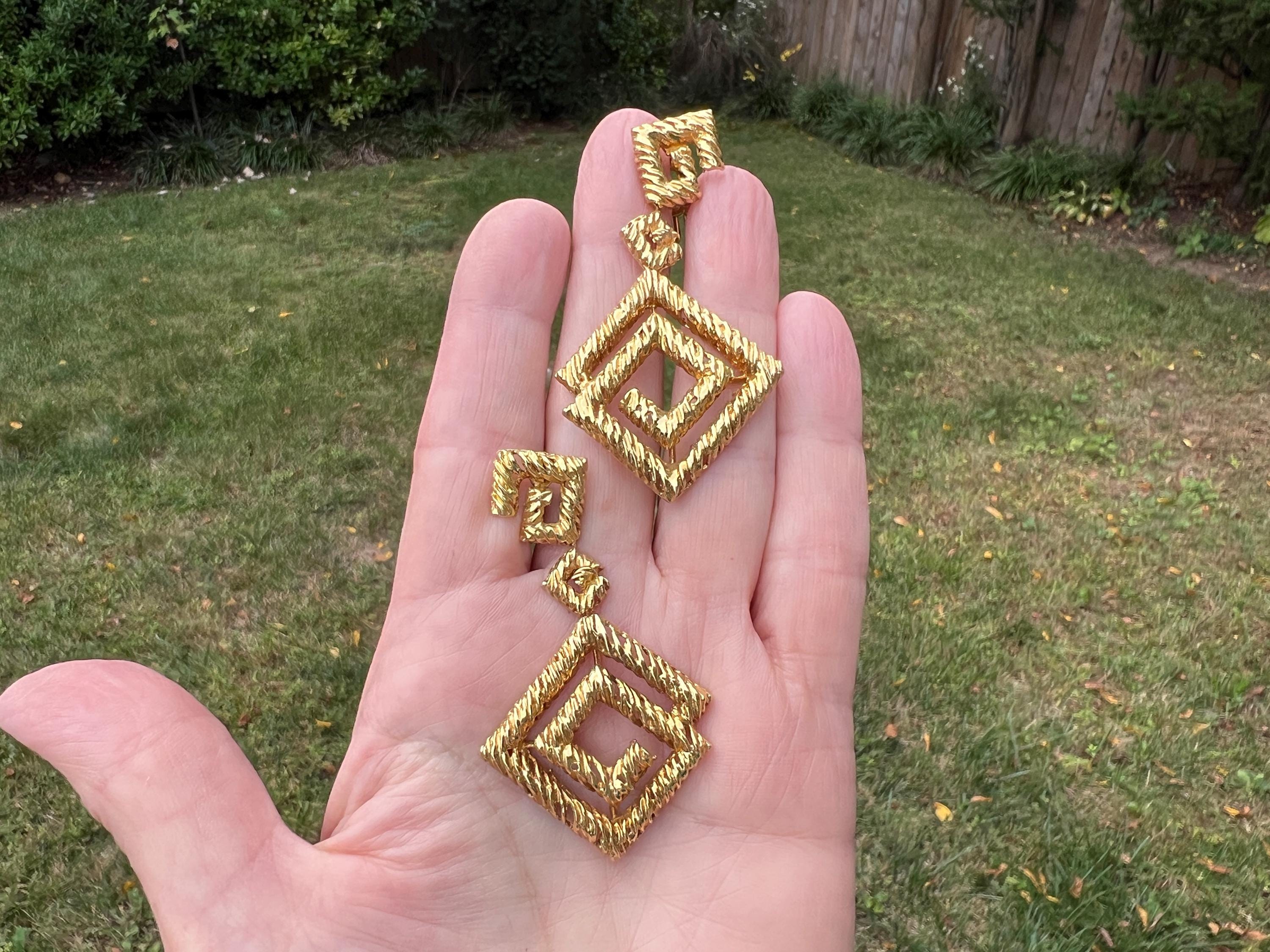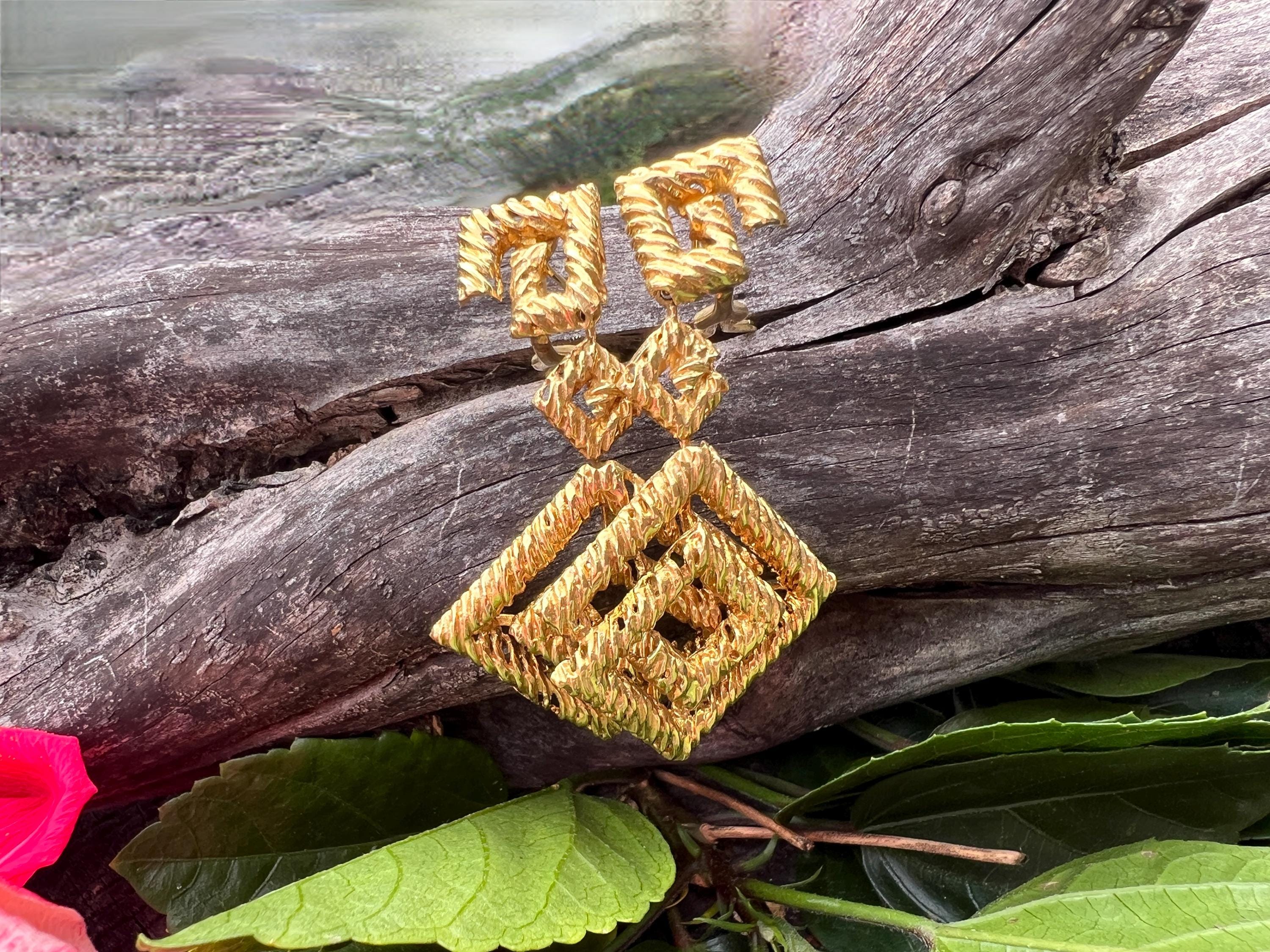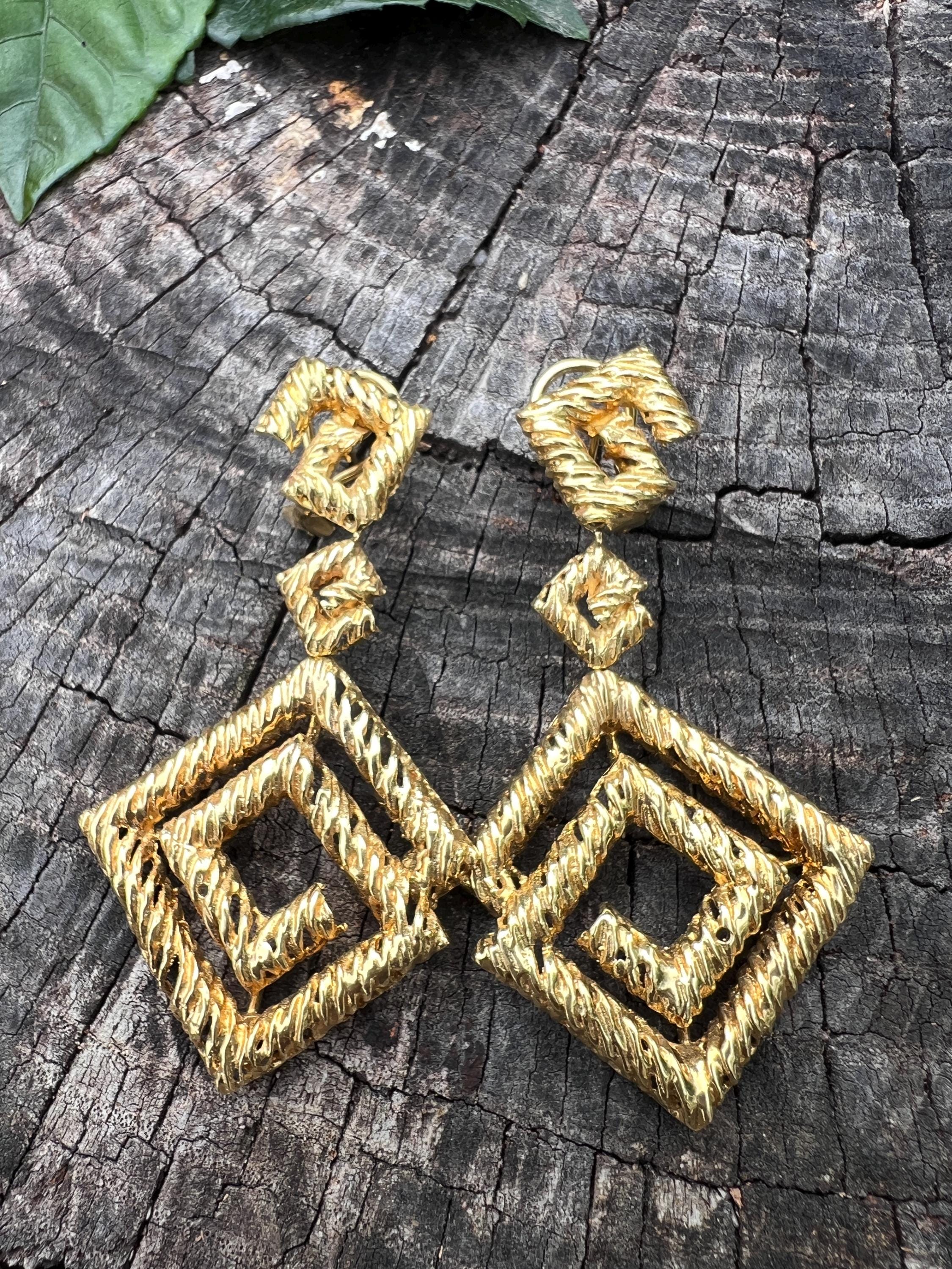 Set in 18k yellow gold, these striking vintage dangle earrings are larger than life. They dates from the 1980’s. The earrings are comprised of beautifully twisted ropes of textured gold tightly wound around a series of dramatic shapes. They It creates a geometric pattern and three dimensional effect. Daringly bold and sensational y powerful. They measures 2 1/2" long. The bottoms measure 1 1/4" x 1 3/8". The top is 1/2" x 1/2" and the middle is 1/4". The earrings are marked 18k. They weighs 25.58 grams. They are made for pierced ears.