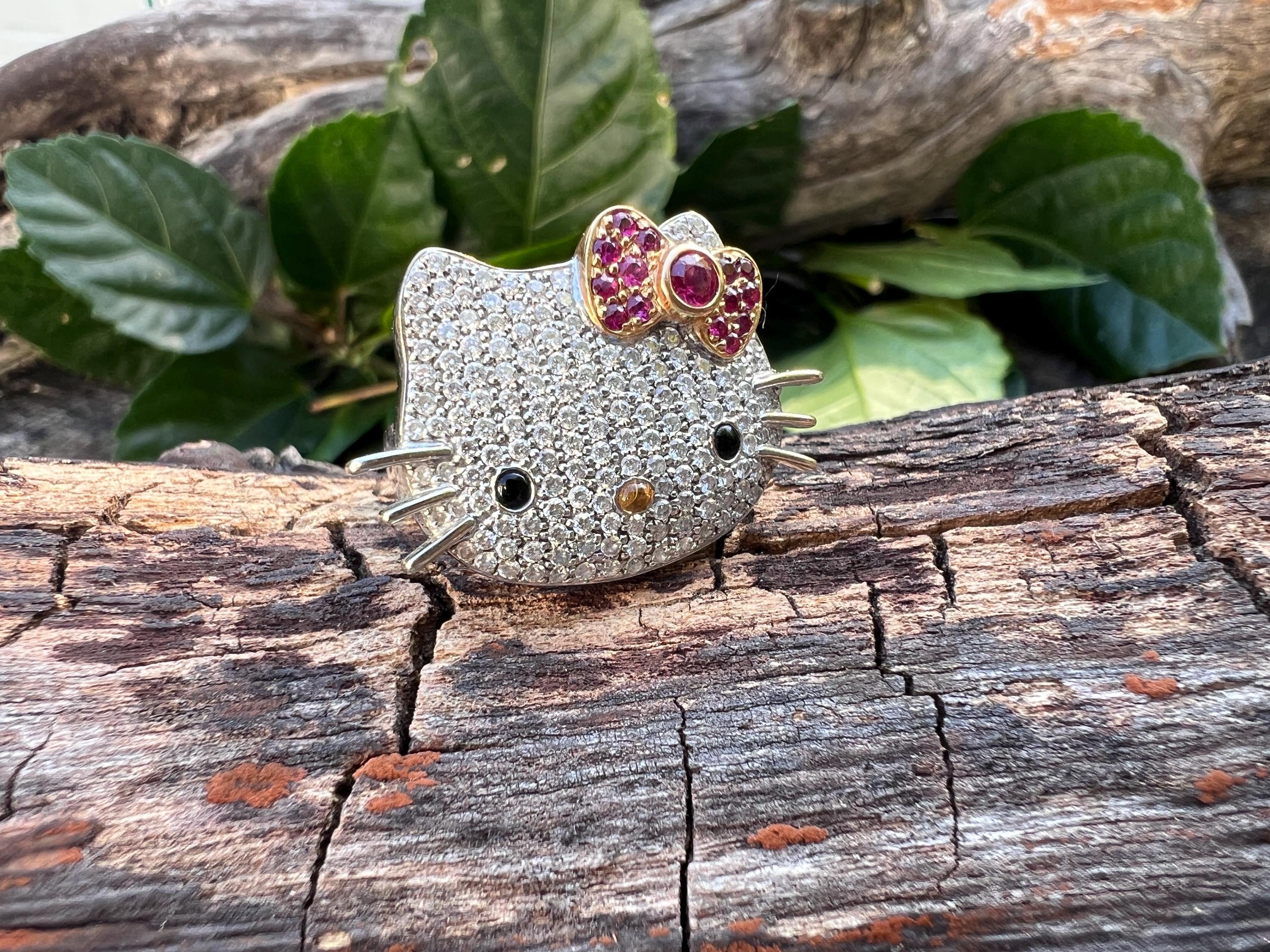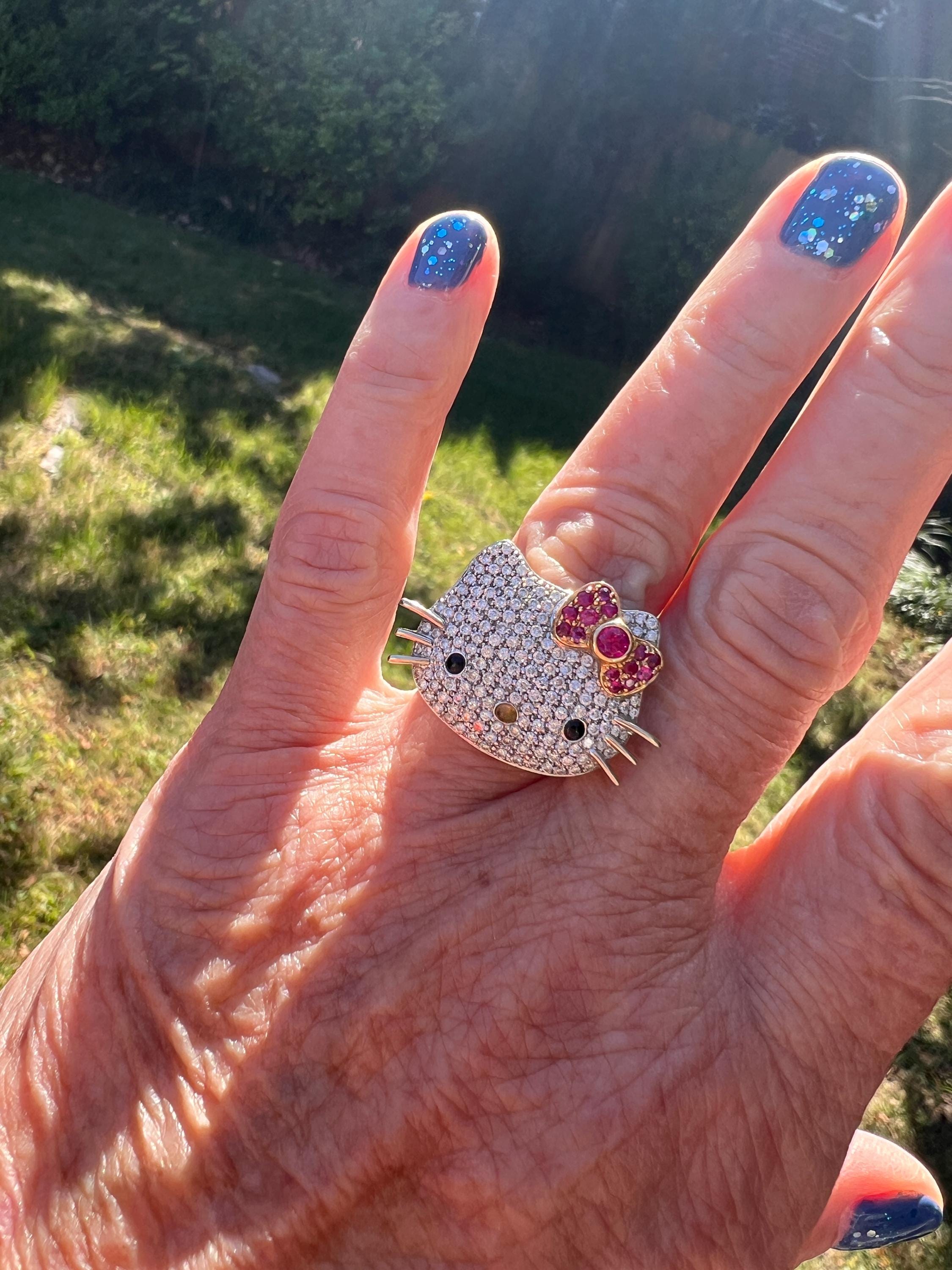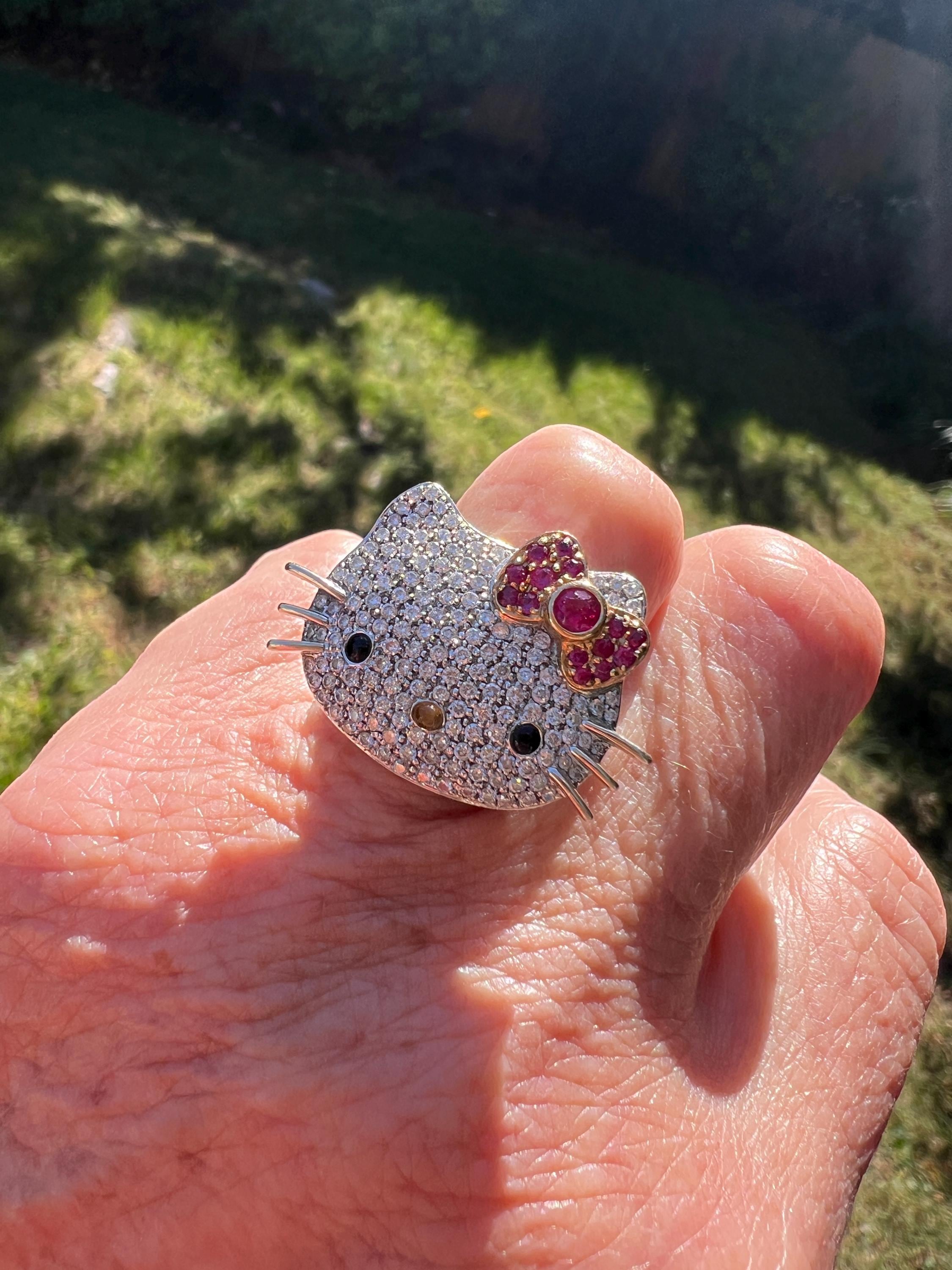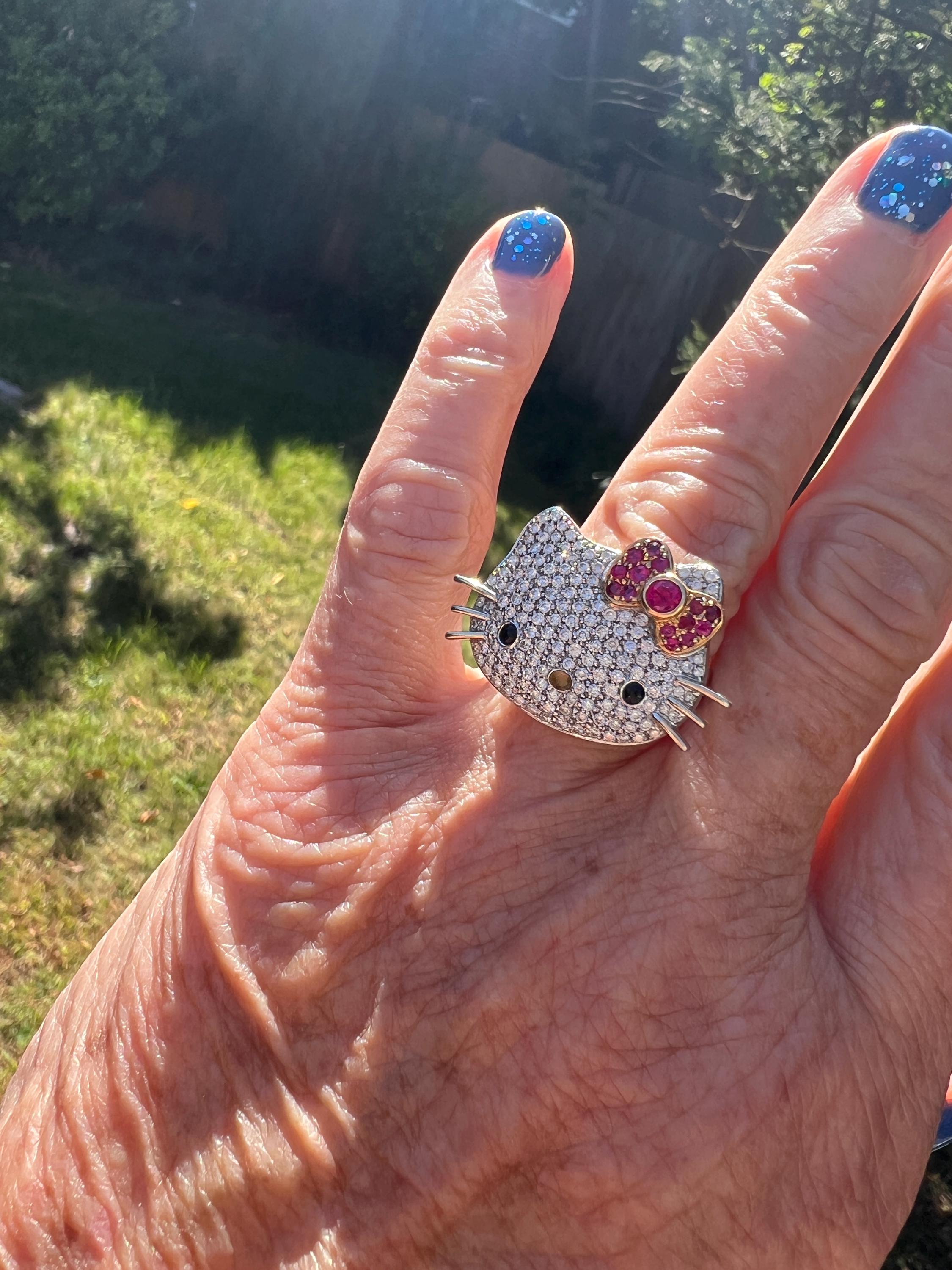 This darling Hello Kitty Sanrio diamond ring is crafted in 18k white gold. The cat's face is encrusted in round dazzling diamonds. The signature bow is placed atop and coated in red synthetic rubies. Kitty has the black eyes and white gold whiskers. The diamonds have a total approx. weight of 2.00 ct. The diamonds are G in color and VS2 in clarity. The ring weighs 12.30 grams. It measures 13/16" x 3/4". It is a size 7. It is marked Sanrio and KLS. These are just perfect for any Hello Kitty fan or cat lover!