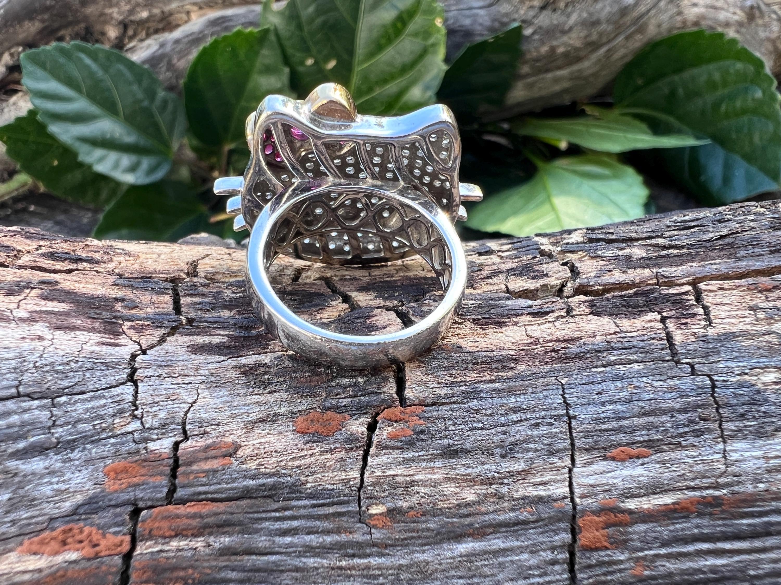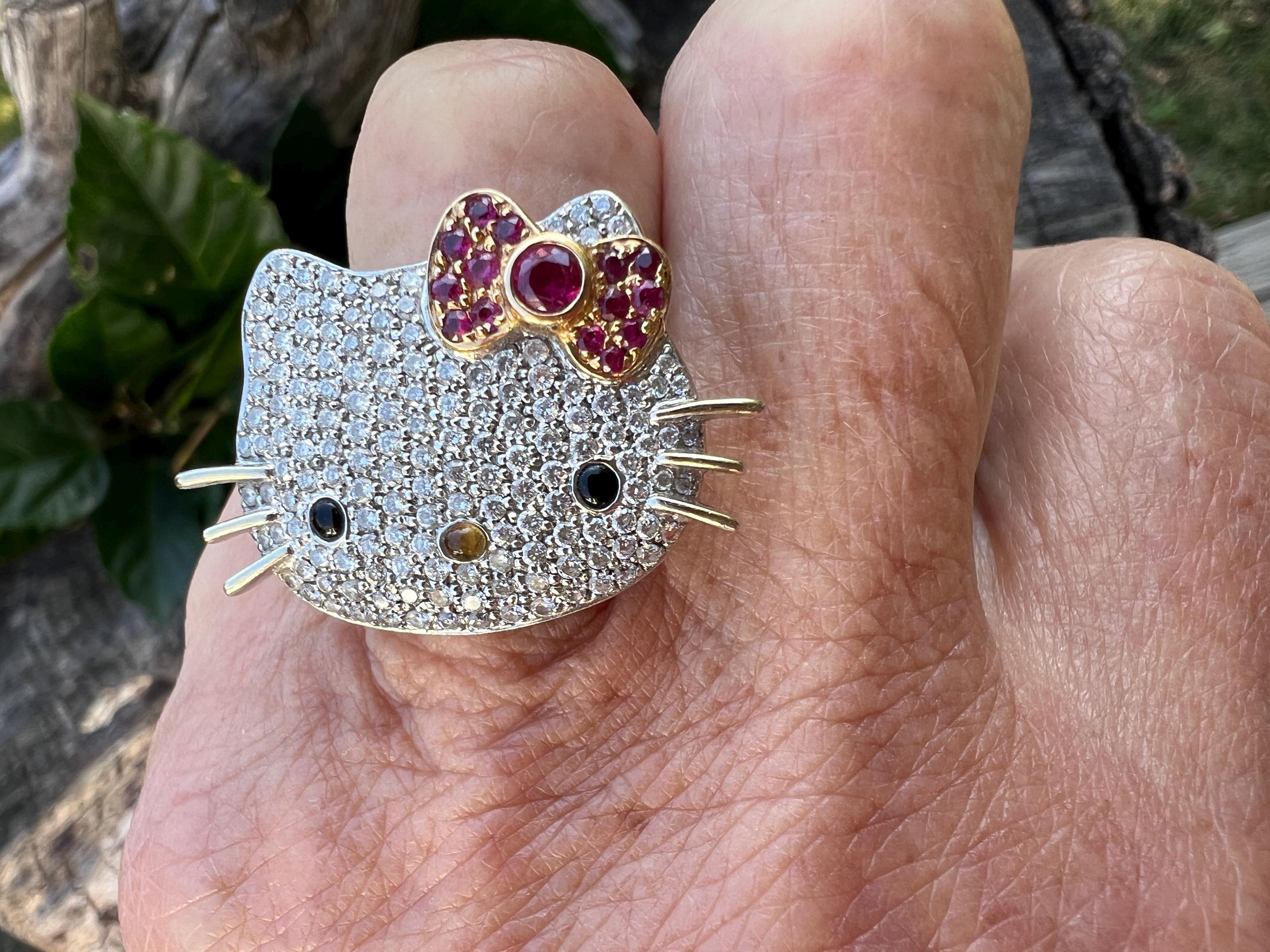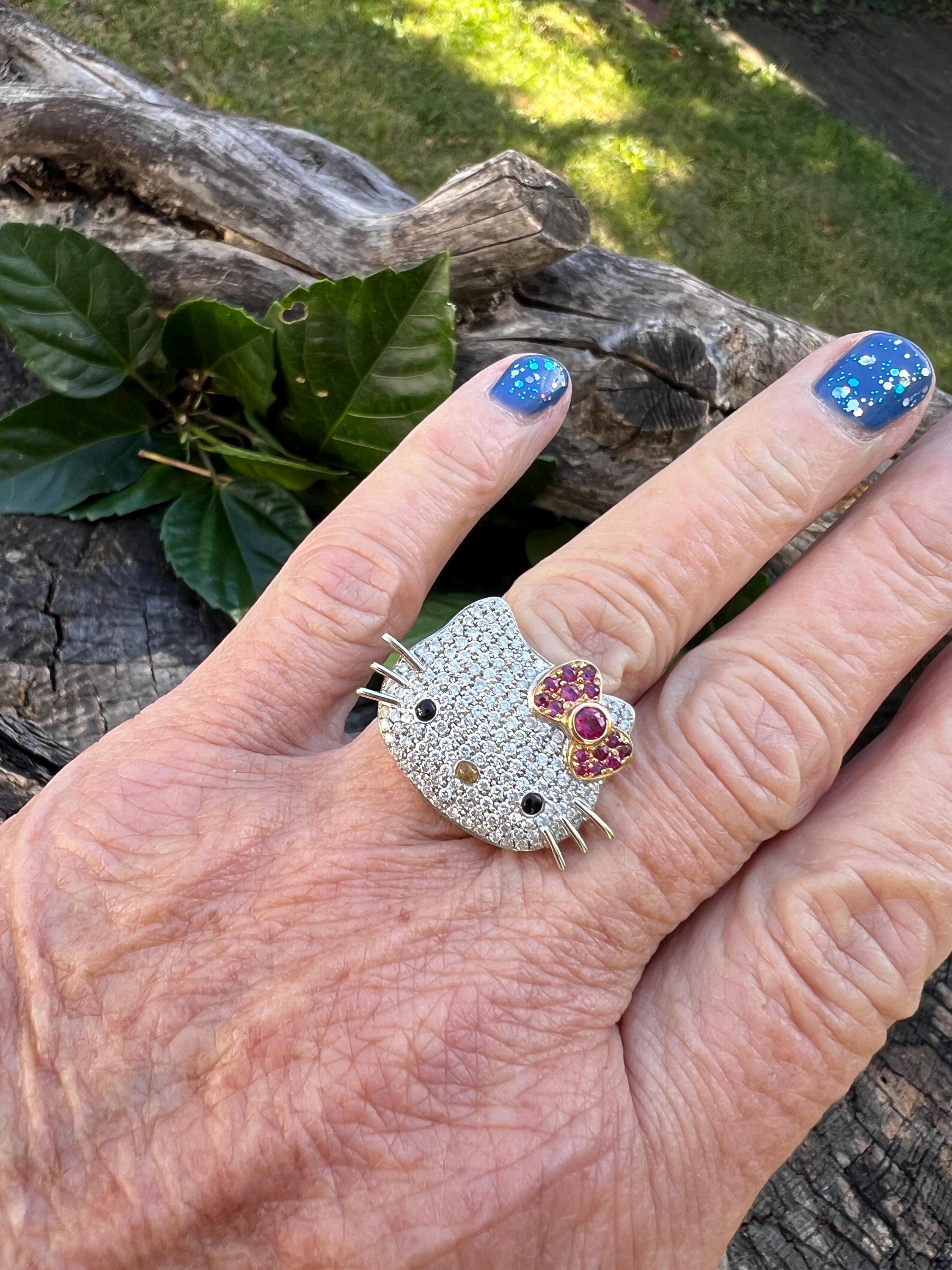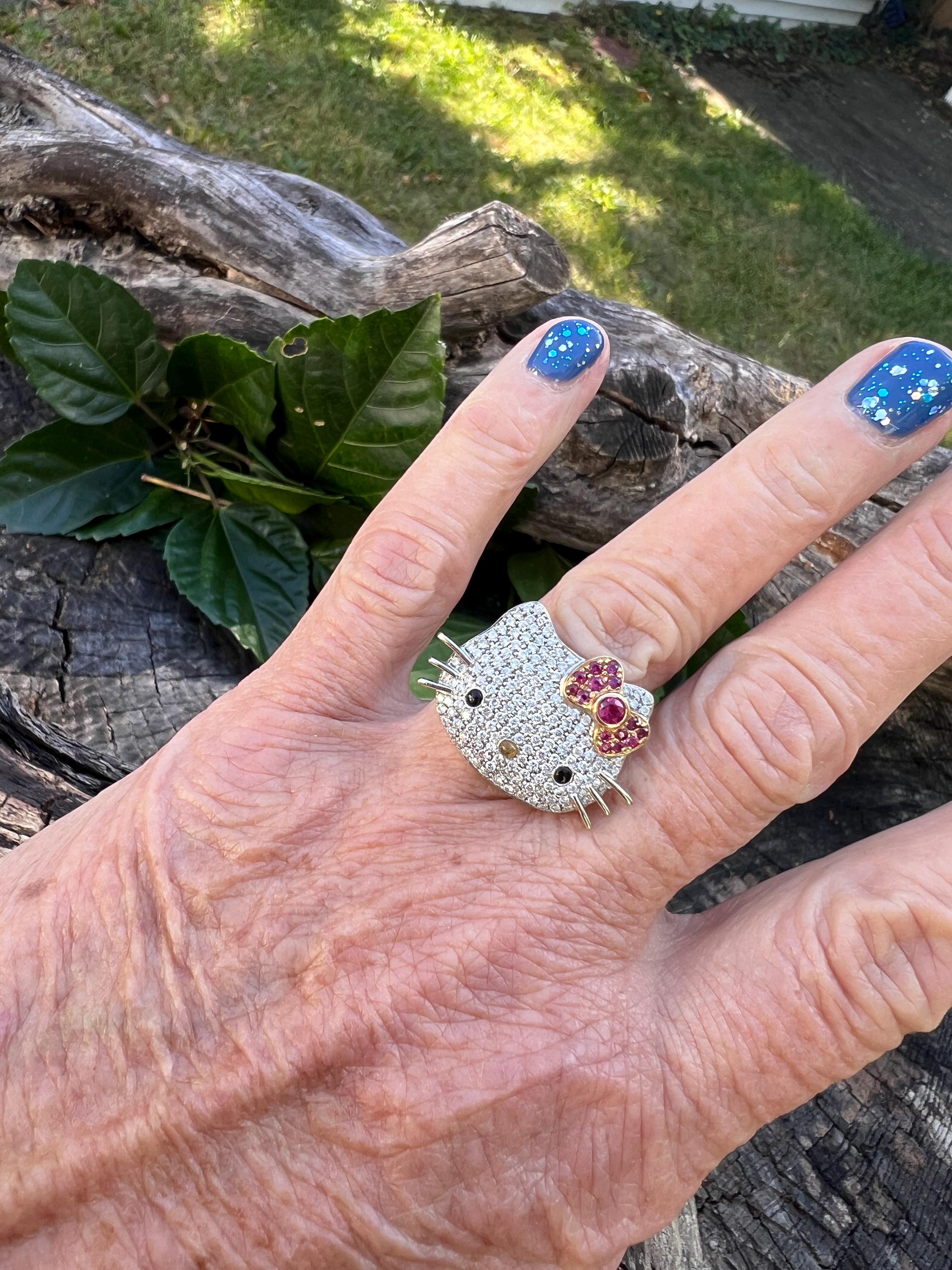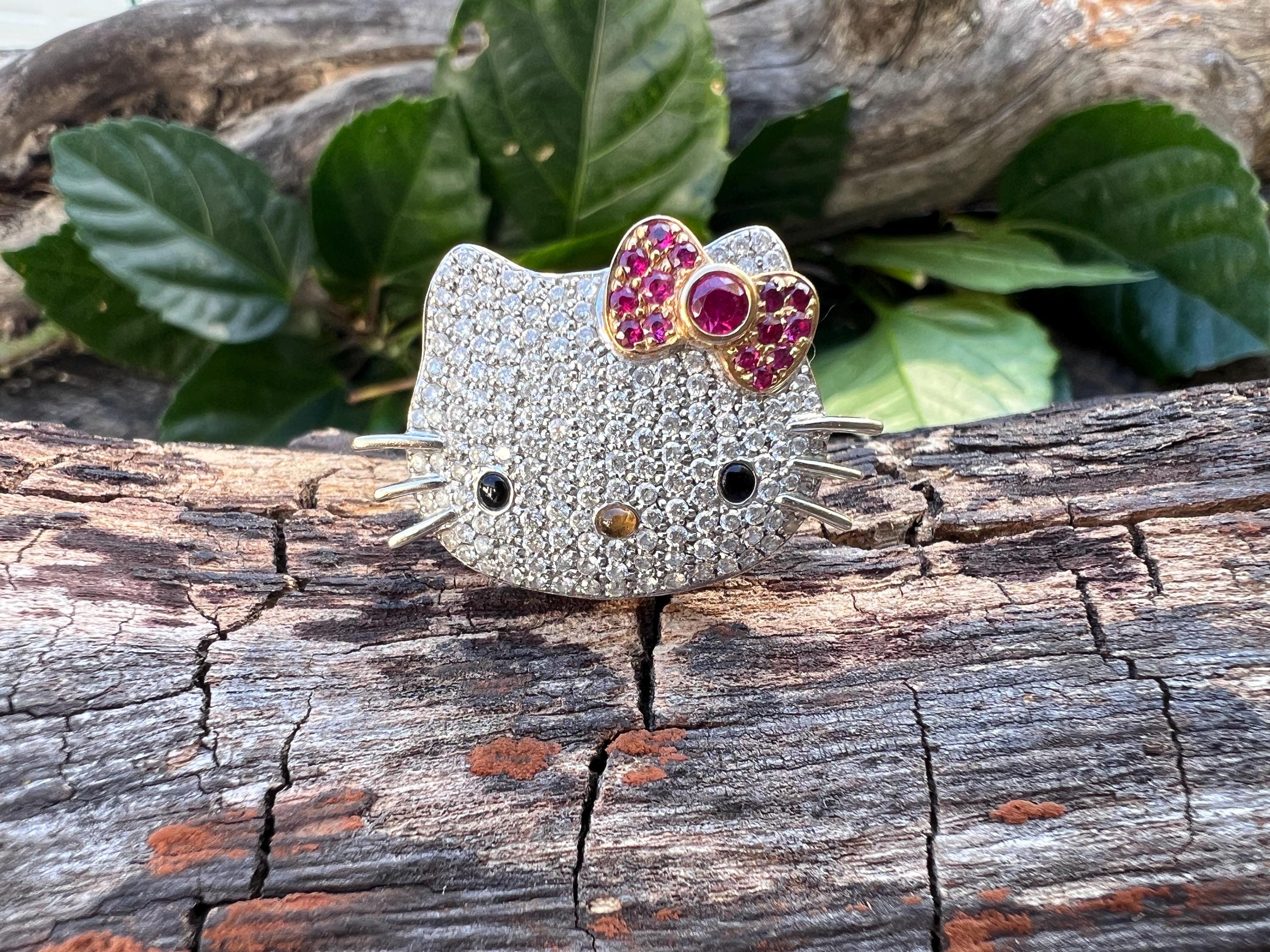 This darling Hello Kitty Sanrio diamond ring is crafted in 18k white gold. The cat's face is encrusted in round dazzling diamonds. The signature bow is placed atop and coated in red synthetic rubies. Kitty has the black eyes and white gold whiskers. The diamonds have a total approx. weight of 2.00 ct. The diamonds are G in color and VS2 in clarity. The ring weighs 12.30 grams. It measures 13/16" x 3/4". It is a size 7. It is marked Sanrio and KLS. These are just perfect for any Hello Kitty fan or cat lover!