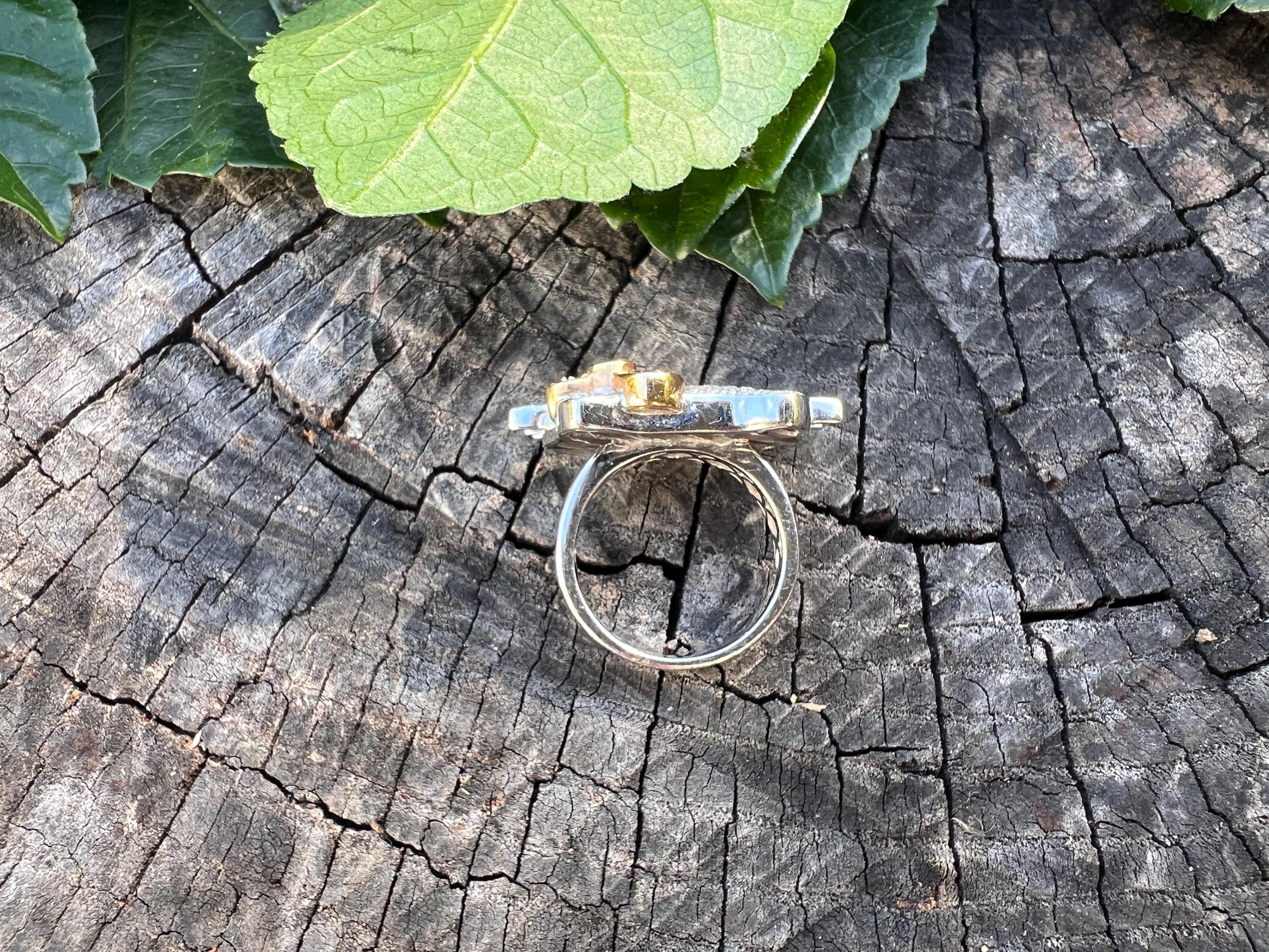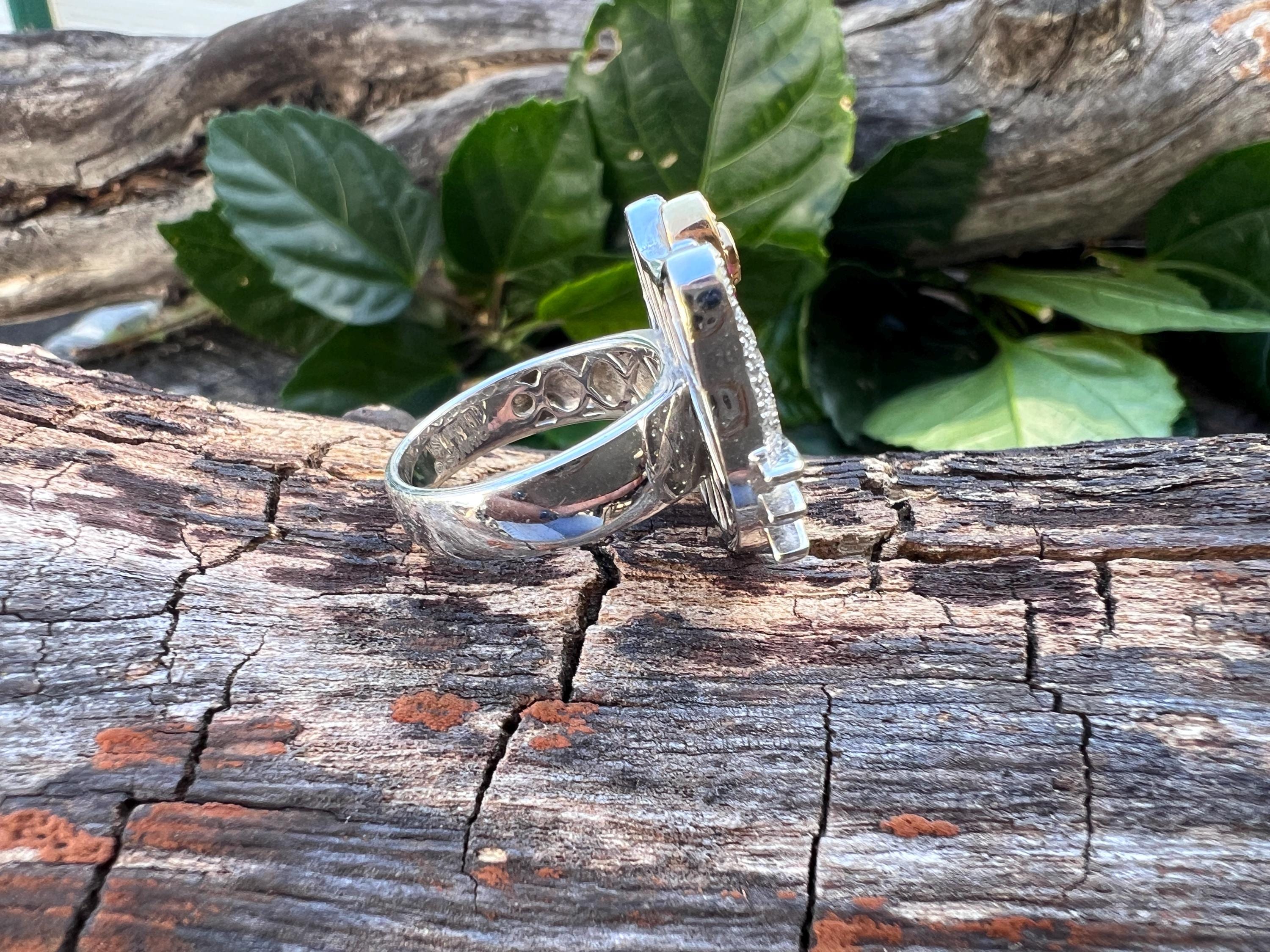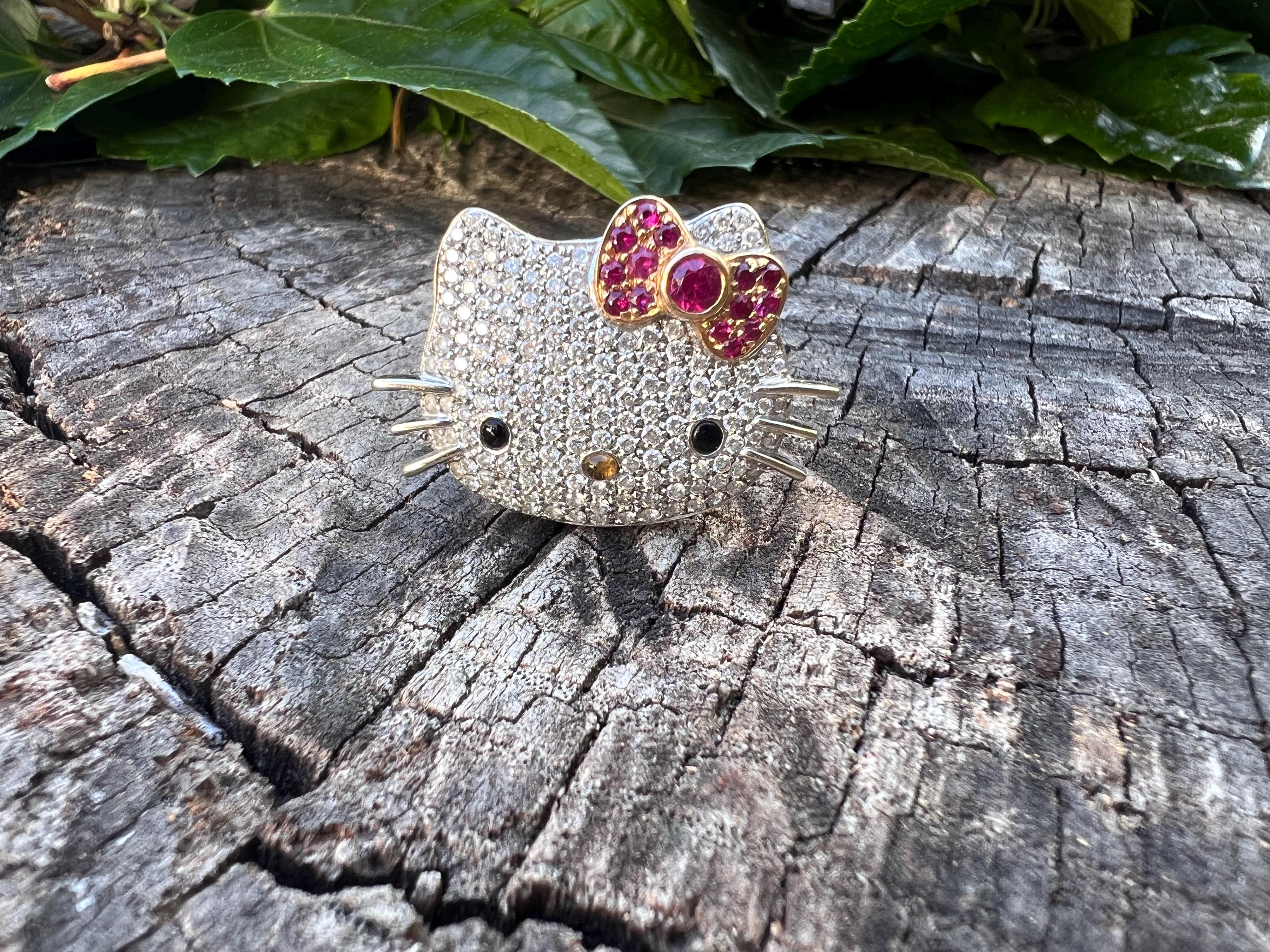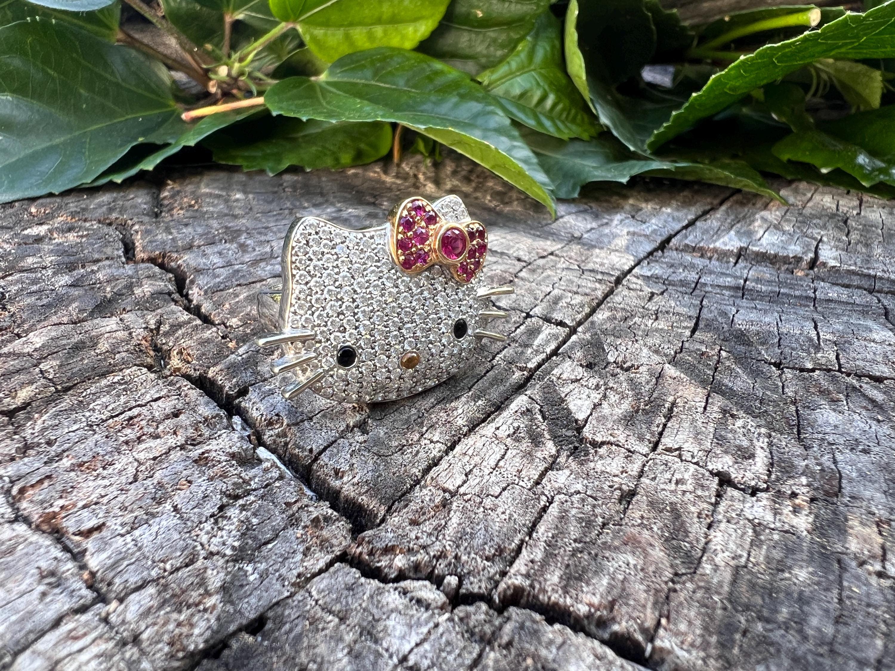 This darling Hello Kitty Sanrio diamond ring is crafted in 18k white gold. The cat's face is encrusted in round dazzling diamonds. The signature bow is placed atop and coated in red synthetic rubies. Kitty has the black eyes and white gold whiskers. The diamonds have a total approx. weight of 2.00 ct. The diamonds are G in color and VS2 in clarity. The ring weighs 12.30 grams. It measures 13/16" x 3/4". It is a size 7. It is marked Sanrio and KLS. These are just perfect for any Hello Kitty fan or cat lover!