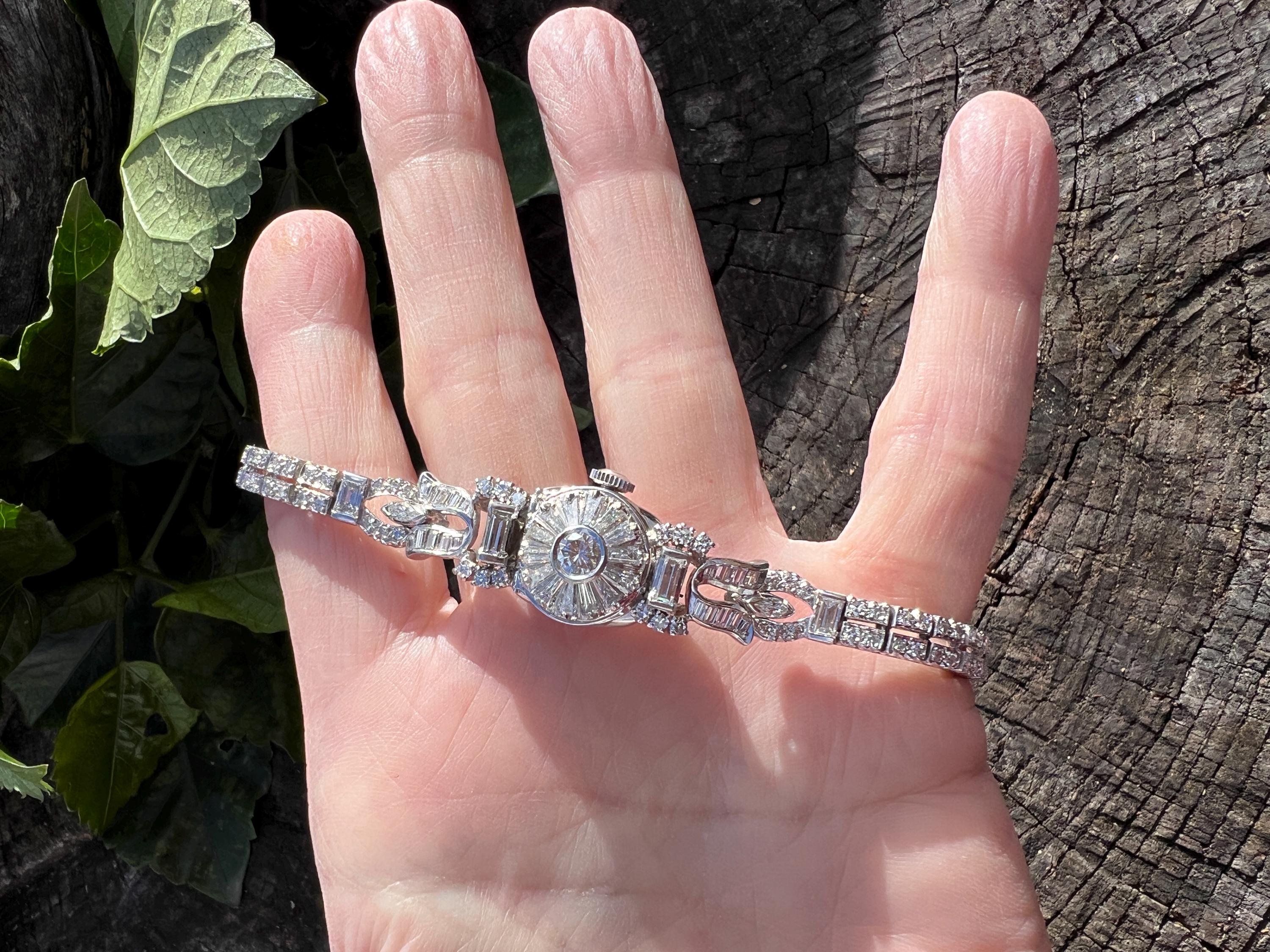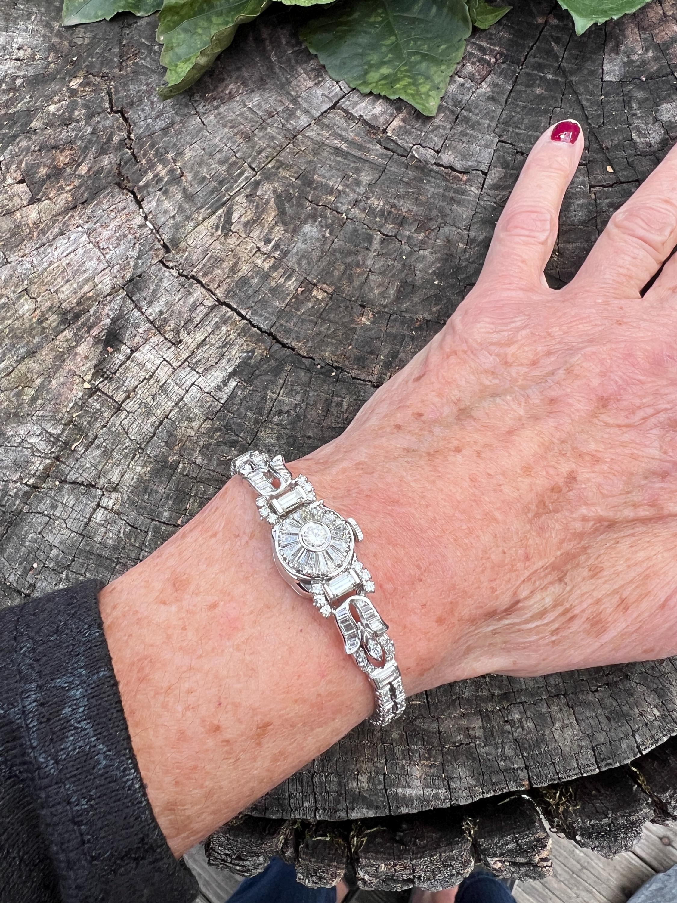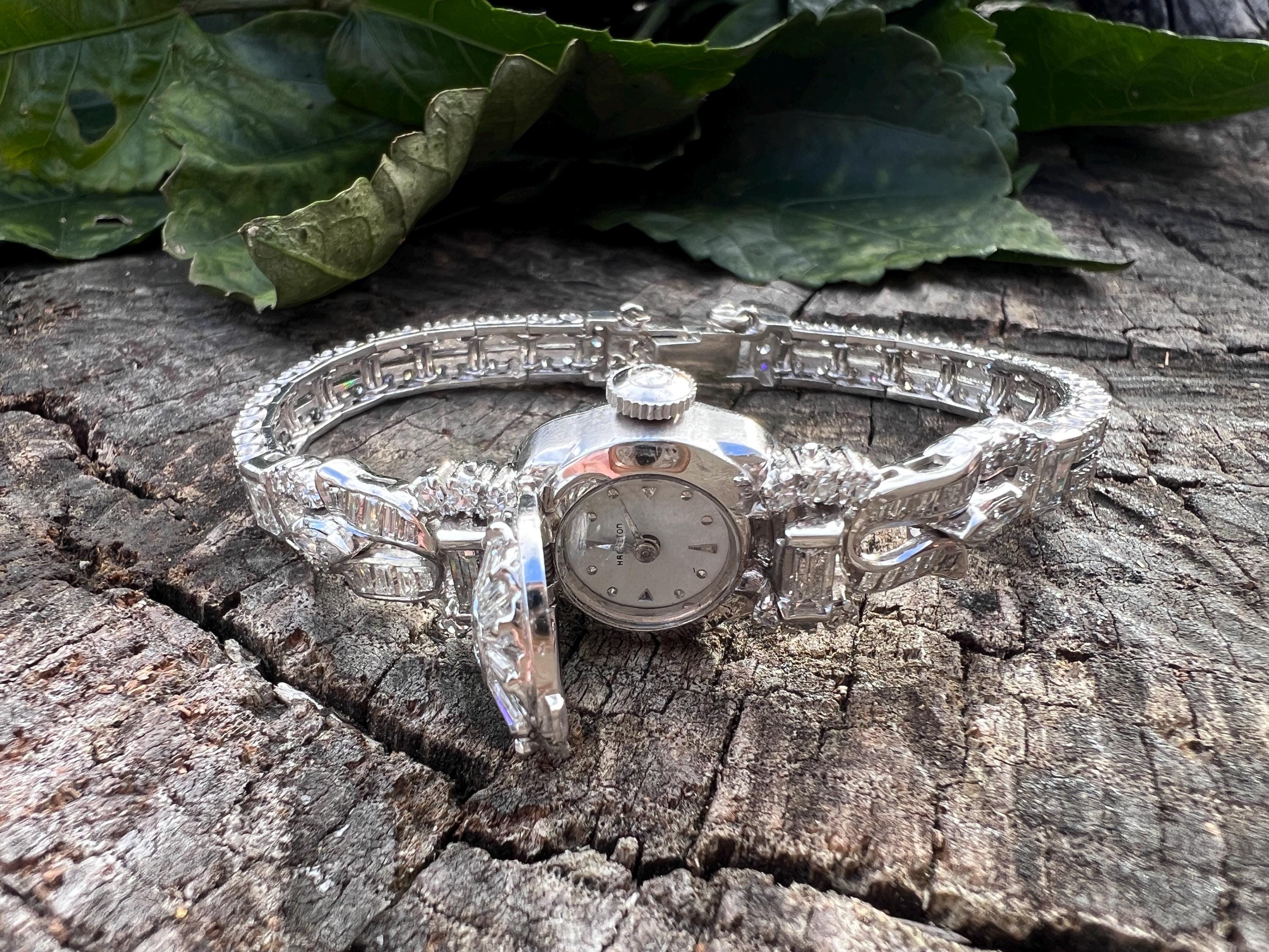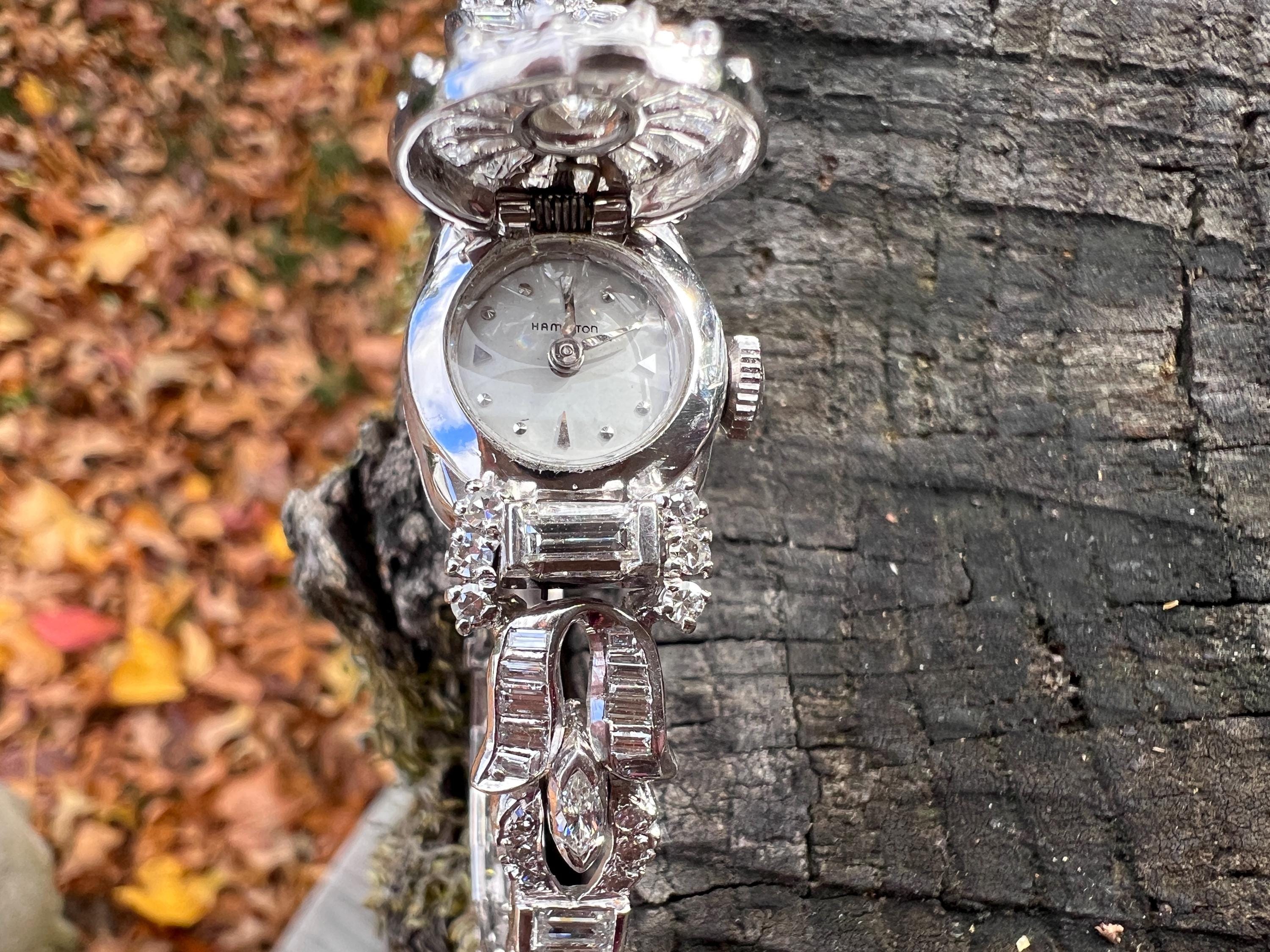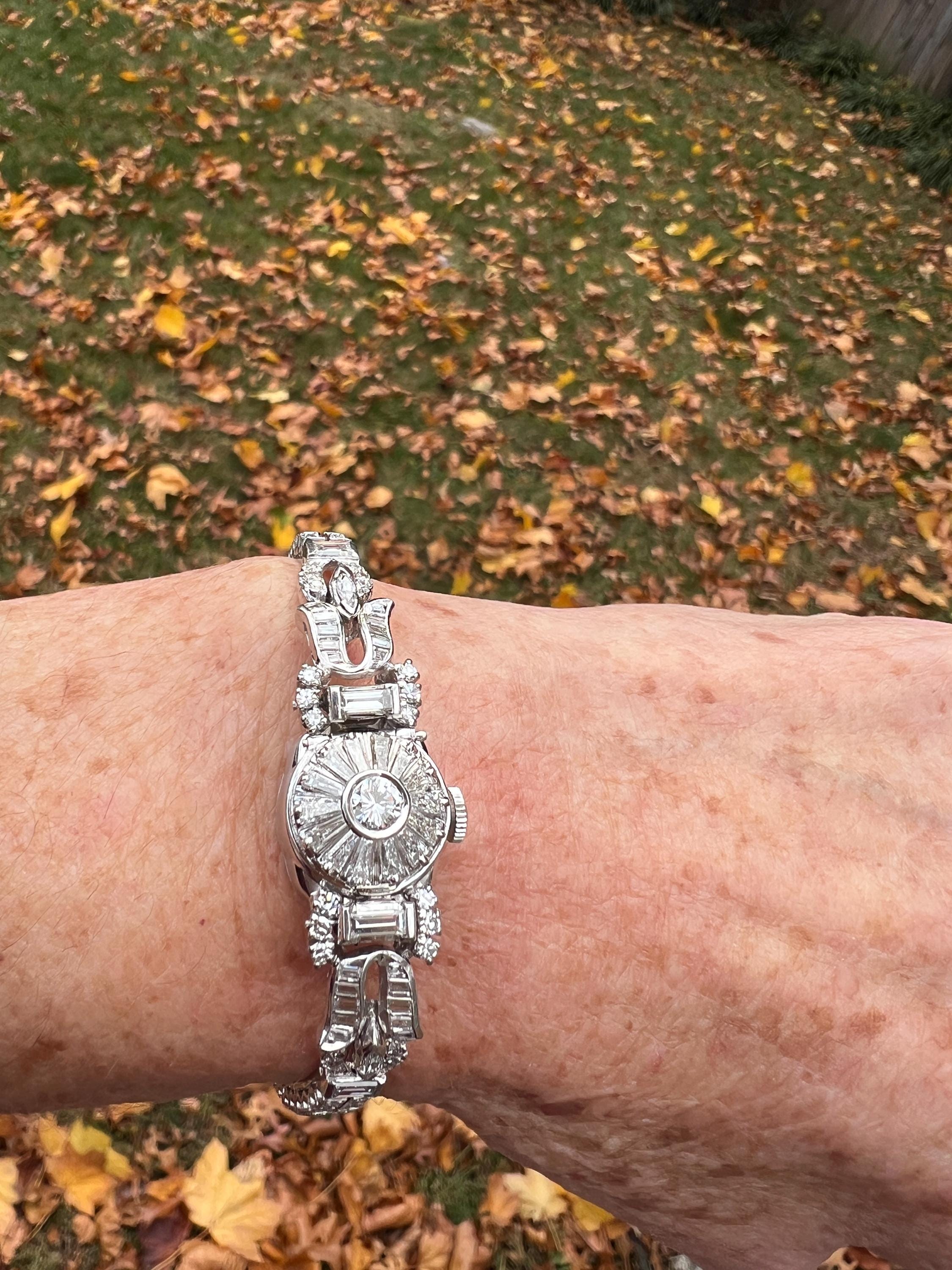 This platinum diamond covered Hamilton watch is the epitome of magnificence. It dates from the 1950’s. On the inside the 17 jewel movement is perfection in time. On the outside it is encrusted with approx. 4.00 cts of round and baguette cut diamonds in blinding brilliance. All diamonds are G/H in color and VS1 in clarity. The band is a double tennis bracelet with round diamonds parading down the aisles. The watch measures 6 1/2”. The band is 3/16" wide. The face measures 1 1/2" x 5/8". It weighs 35.68 grams. It is marked platinum. Time was never so dazzling.