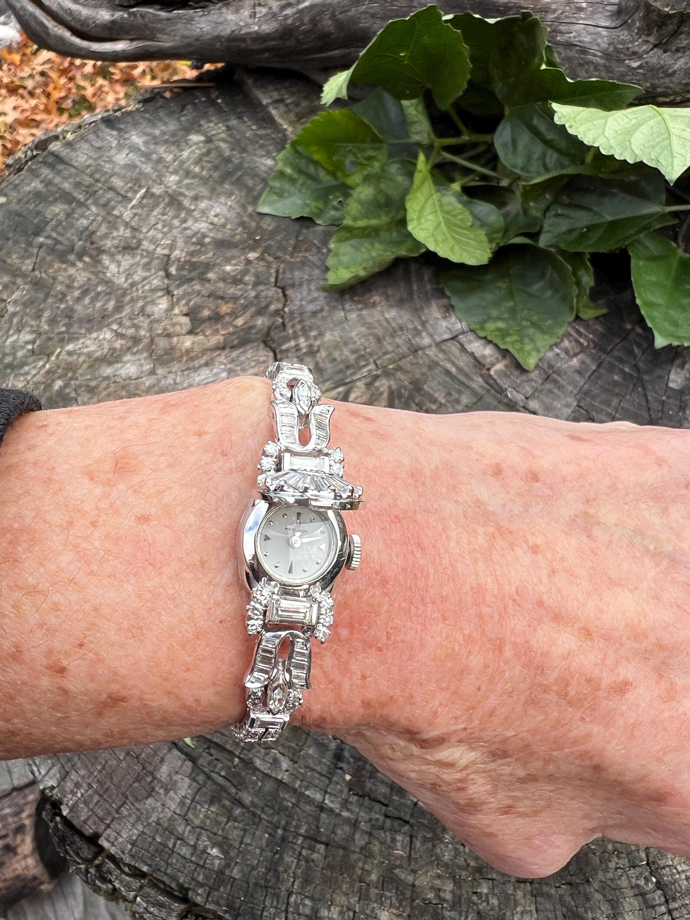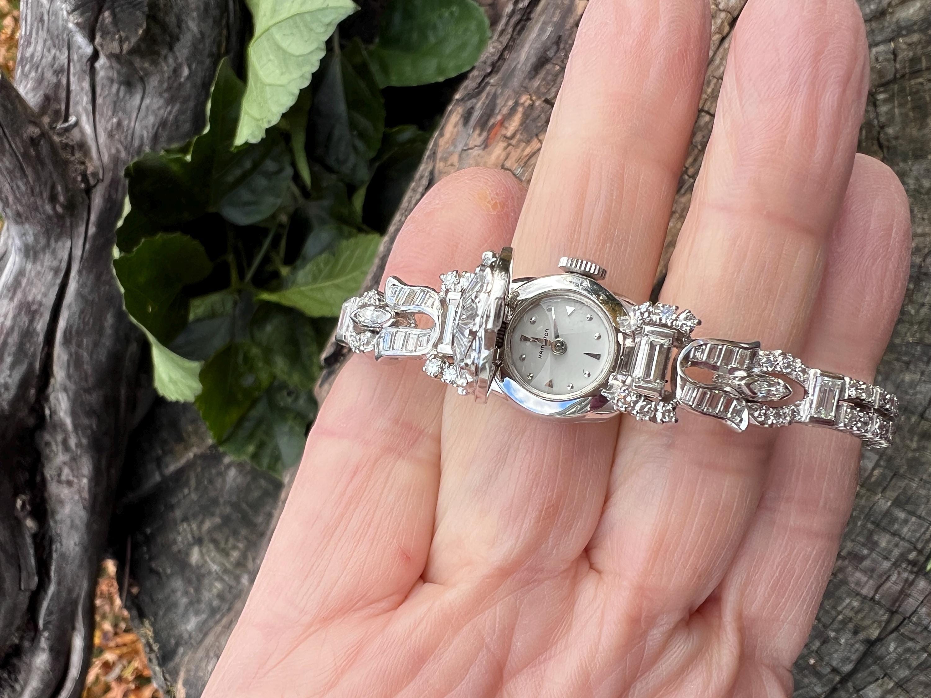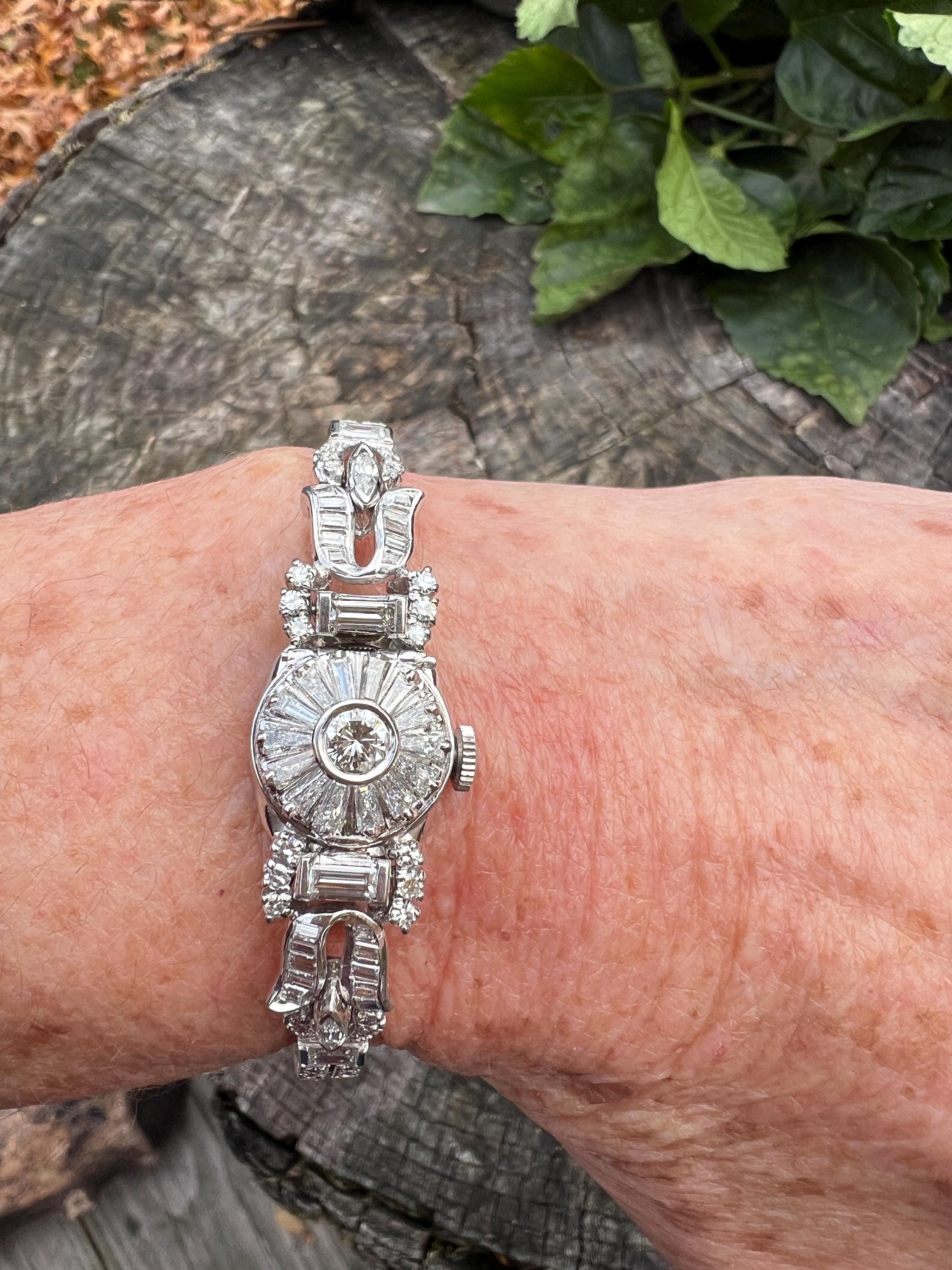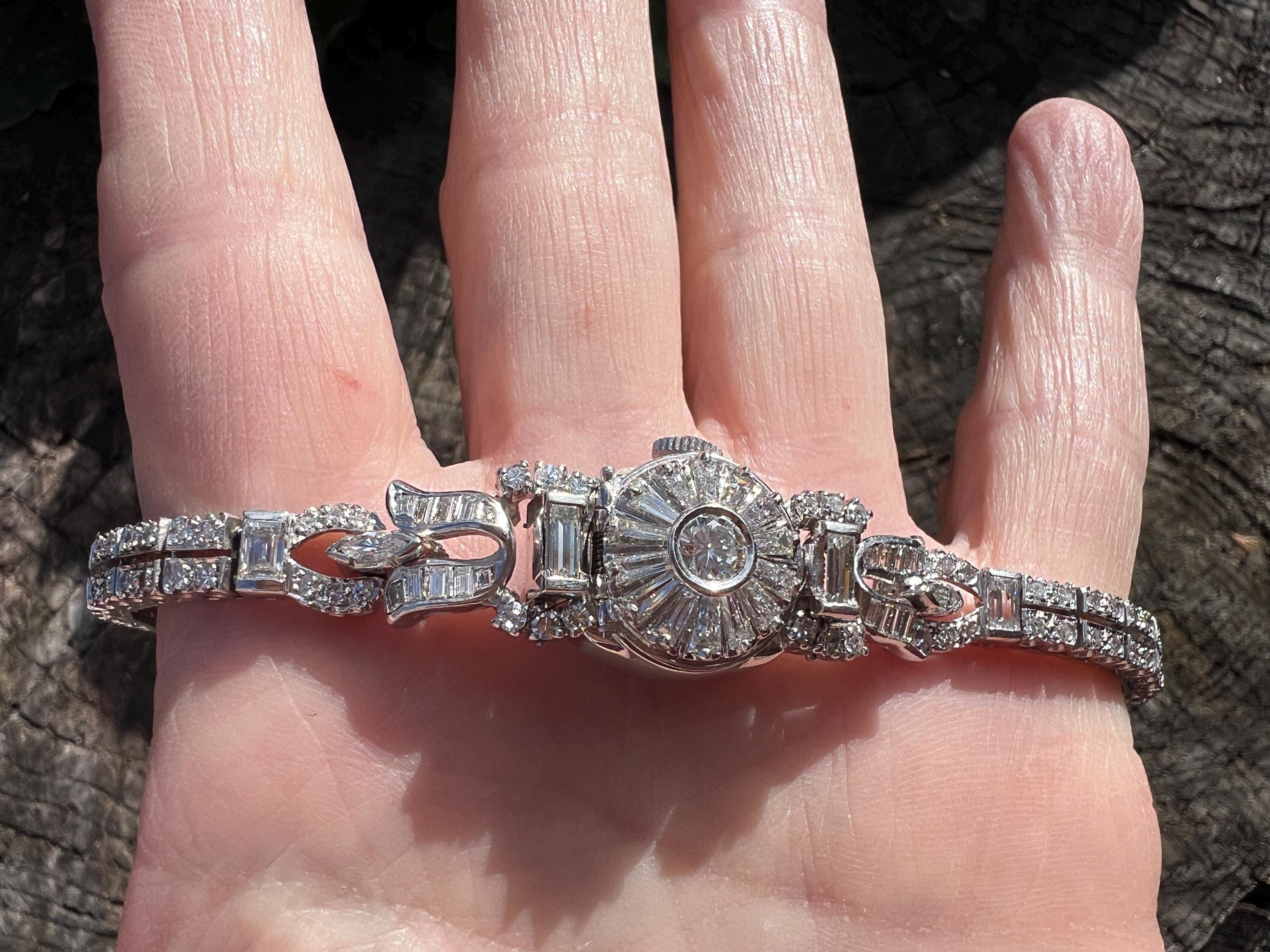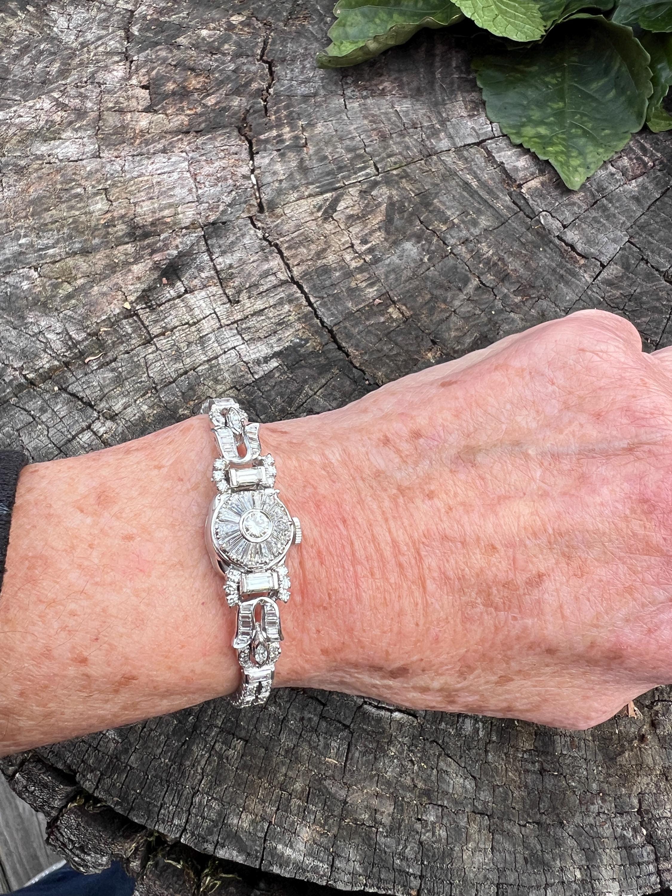 This platinum diamond covered Hamilton watch is the epitome of magnificence. It dates from the 1950’s. On the inside the 17 jewel movement is perfection in time. On the outside it is encrusted with approx. 4.00 cts of round and baguette cut diamonds in blinding brilliance. All diamonds are G/H in color and VS1 in clarity. The band is a double tennis bracelet with round diamonds parading down the aisles. The watch measures 6 1/2”. The band is 3/16" wide. The face measures 1 1/2" x 5/8". It weighs 35.68 grams. It is marked platinum. Time was never so dazzling.