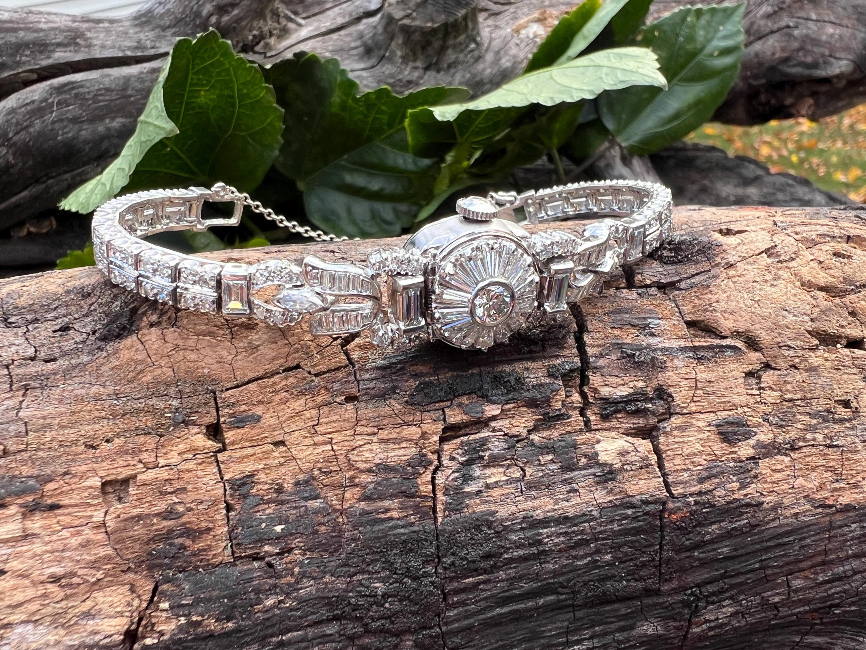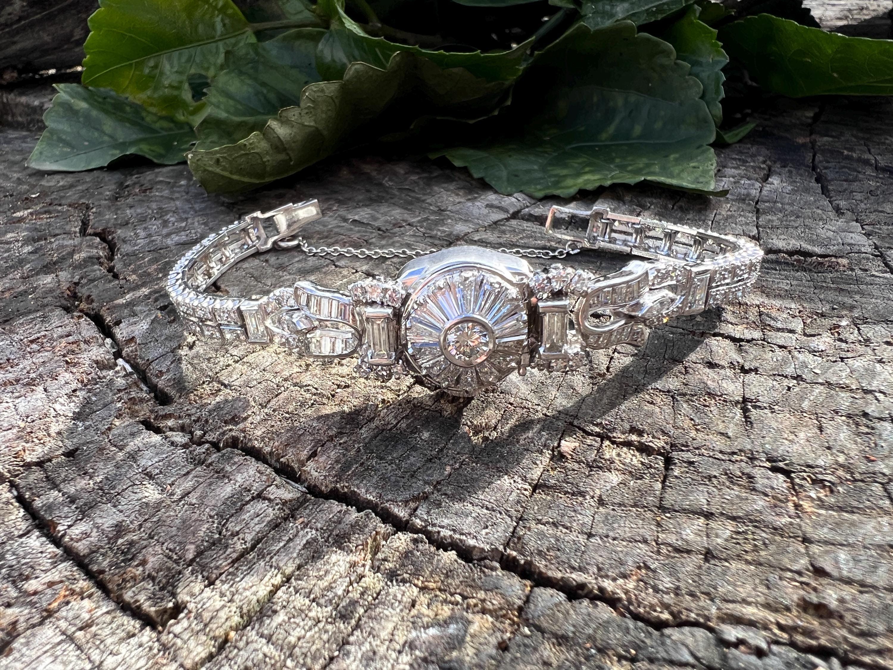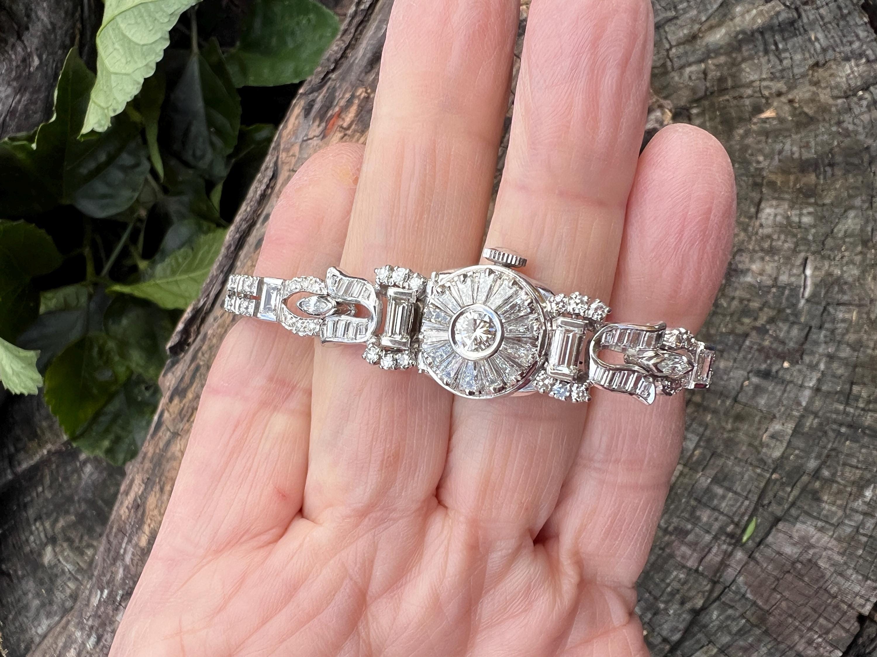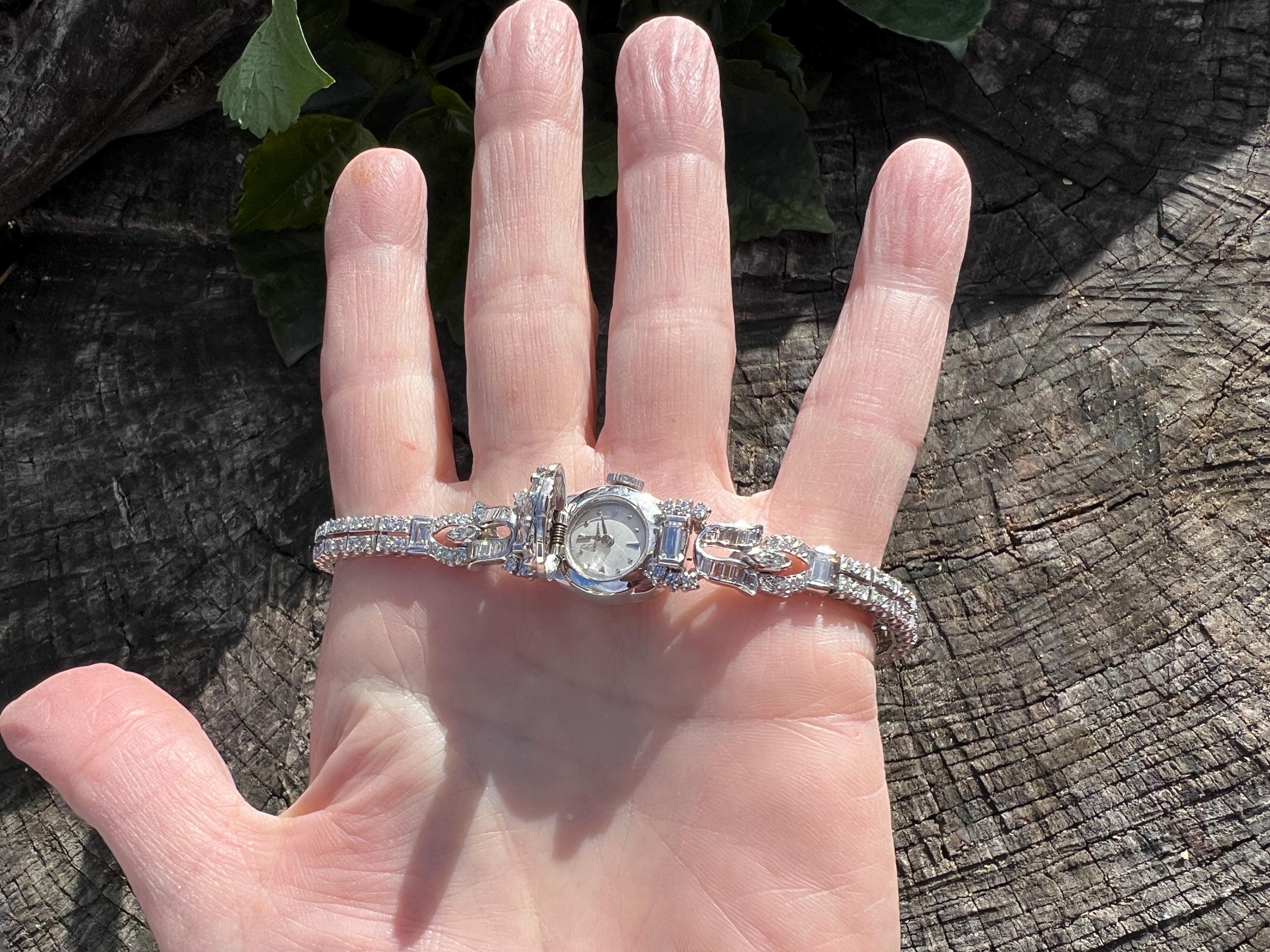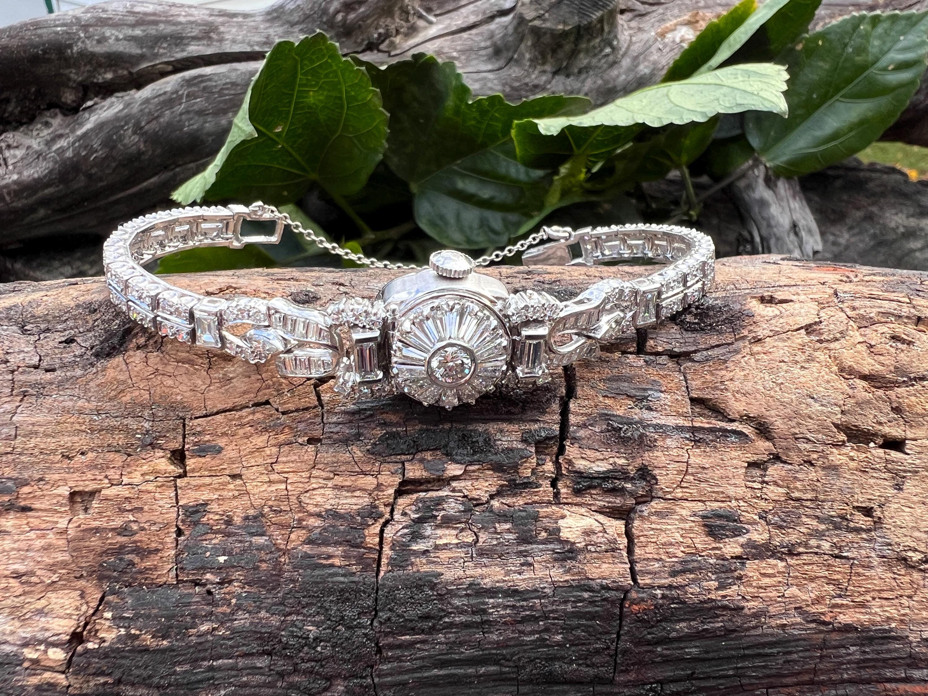 This platinum diamond covered Hamilton watch is the epitome of magnificence. It dates from the 1950’s. On the inside the 17 jewel movement is perfection in time. On the outside it is encrusted with approx. 4.00 cts of round and baguette cut diamonds in blinding brilliance. All diamonds are G/H in color and VS1 in clarity. The band is a double tennis bracelet with round diamonds parading down the aisles. The watch measures 6 1/2”. The band is 3/16" wide. The face measures 1 1/2" x 5/8". It weighs 35.68 grams. It is marked platinum. Time was never so dazzling.