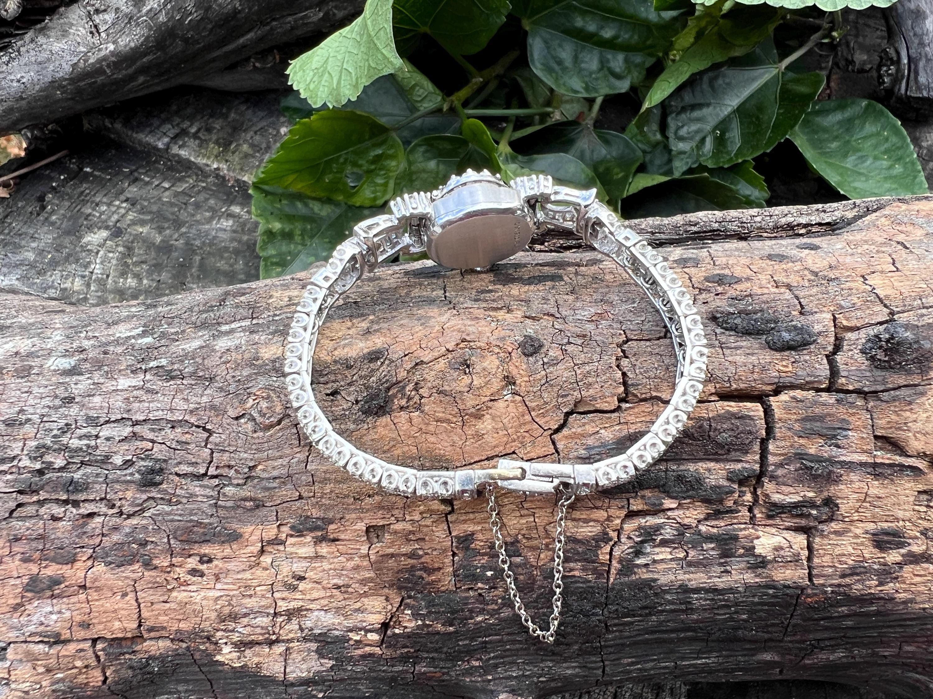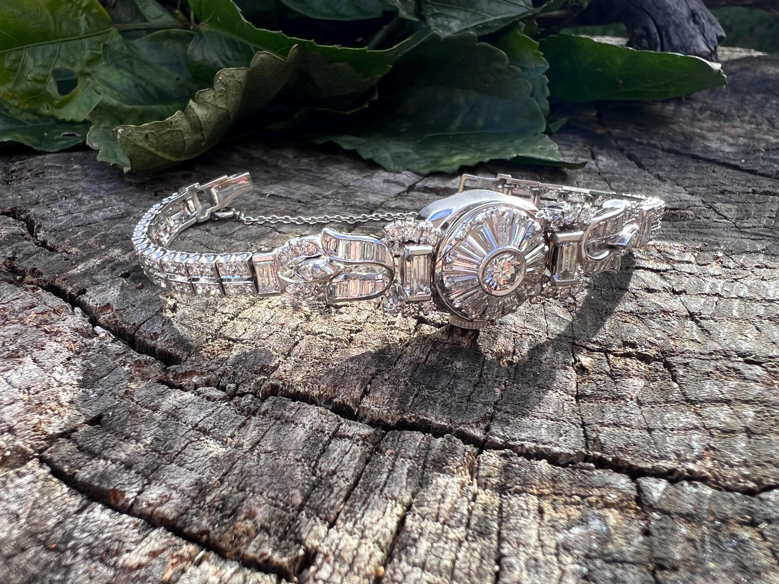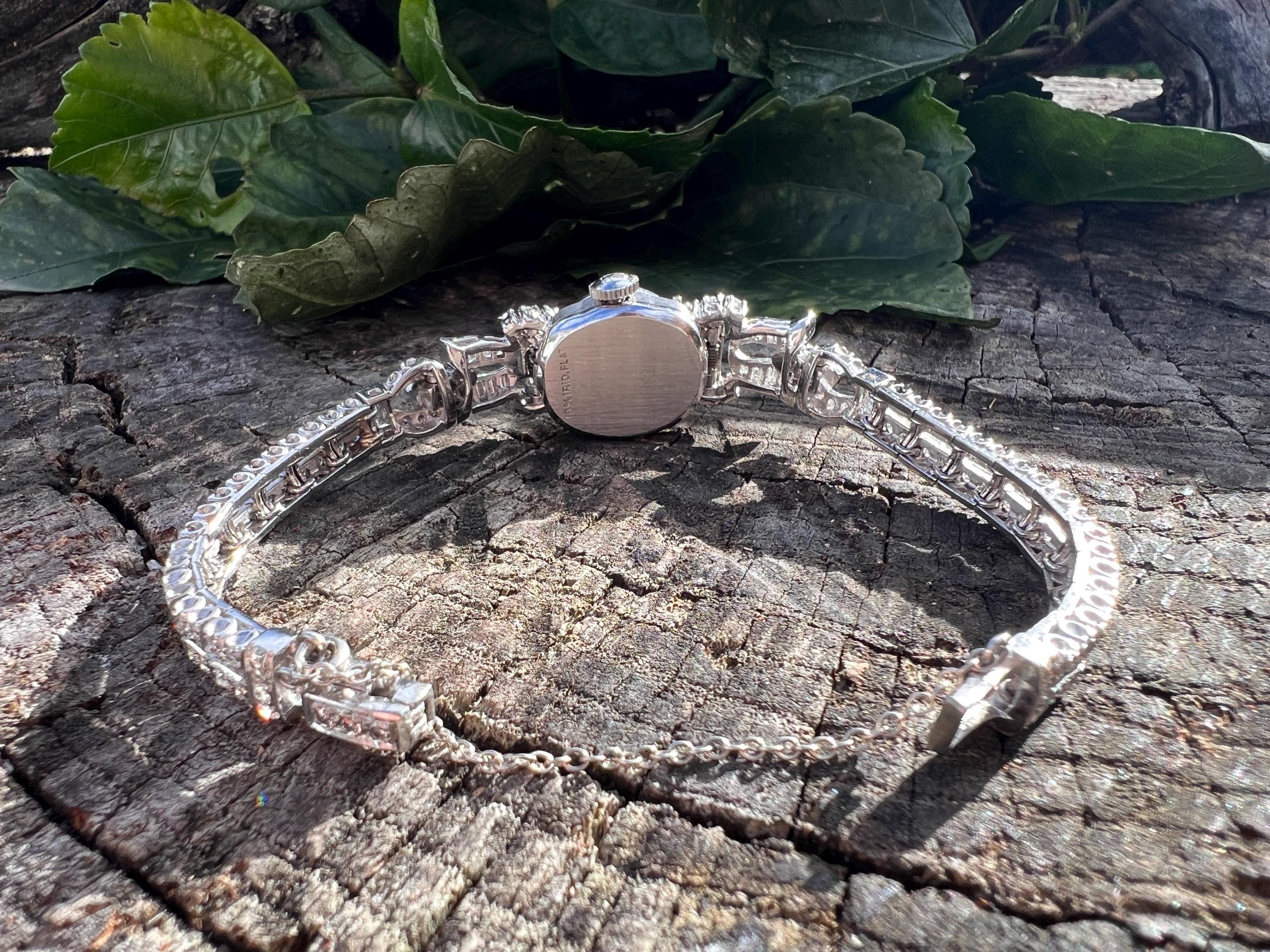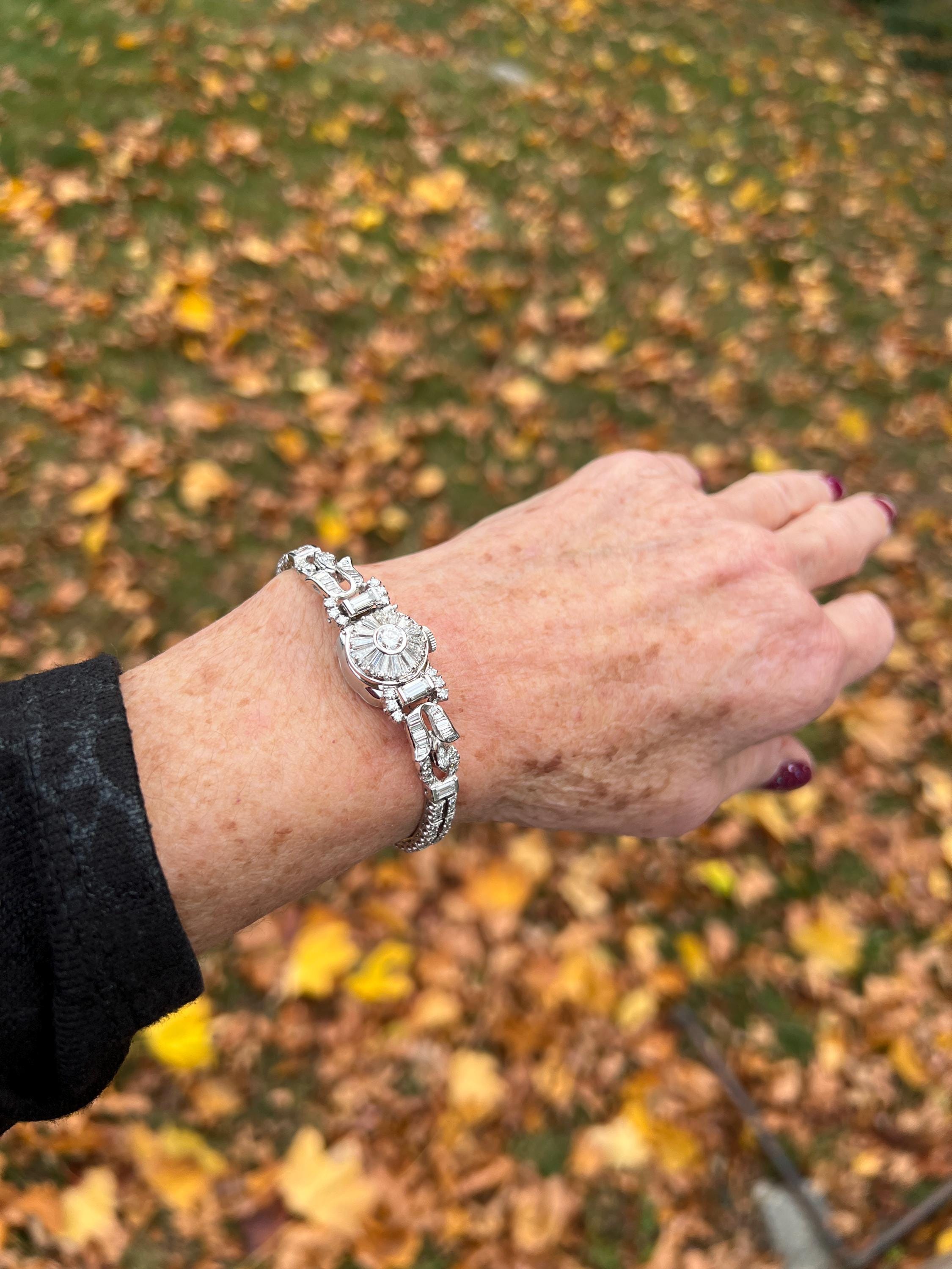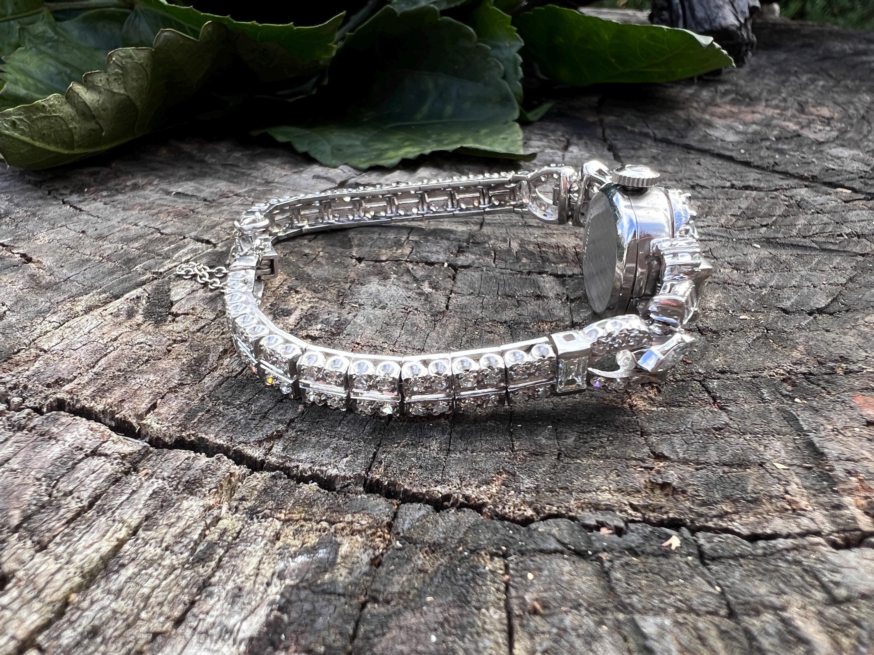This platinum diamond covered Hamilton watch is the epitome of magnificence. It dates from the 1950’s. On the inside the 17 jewel movement is perfection in time. On the outside it is encrusted with approx. 4.00 cts of round and baguette cut diamonds in blinding brilliance. All diamonds are G/H in color and VS1 in clarity. The band is a double tennis bracelet with round diamonds parading down the aisles. The watch measures 6 1/2”. The band is 3/16" wide. The face measures 1 1/2" x 5/8". It weighs 35.68 grams. It is marked platinum. Time was never so dazzling.