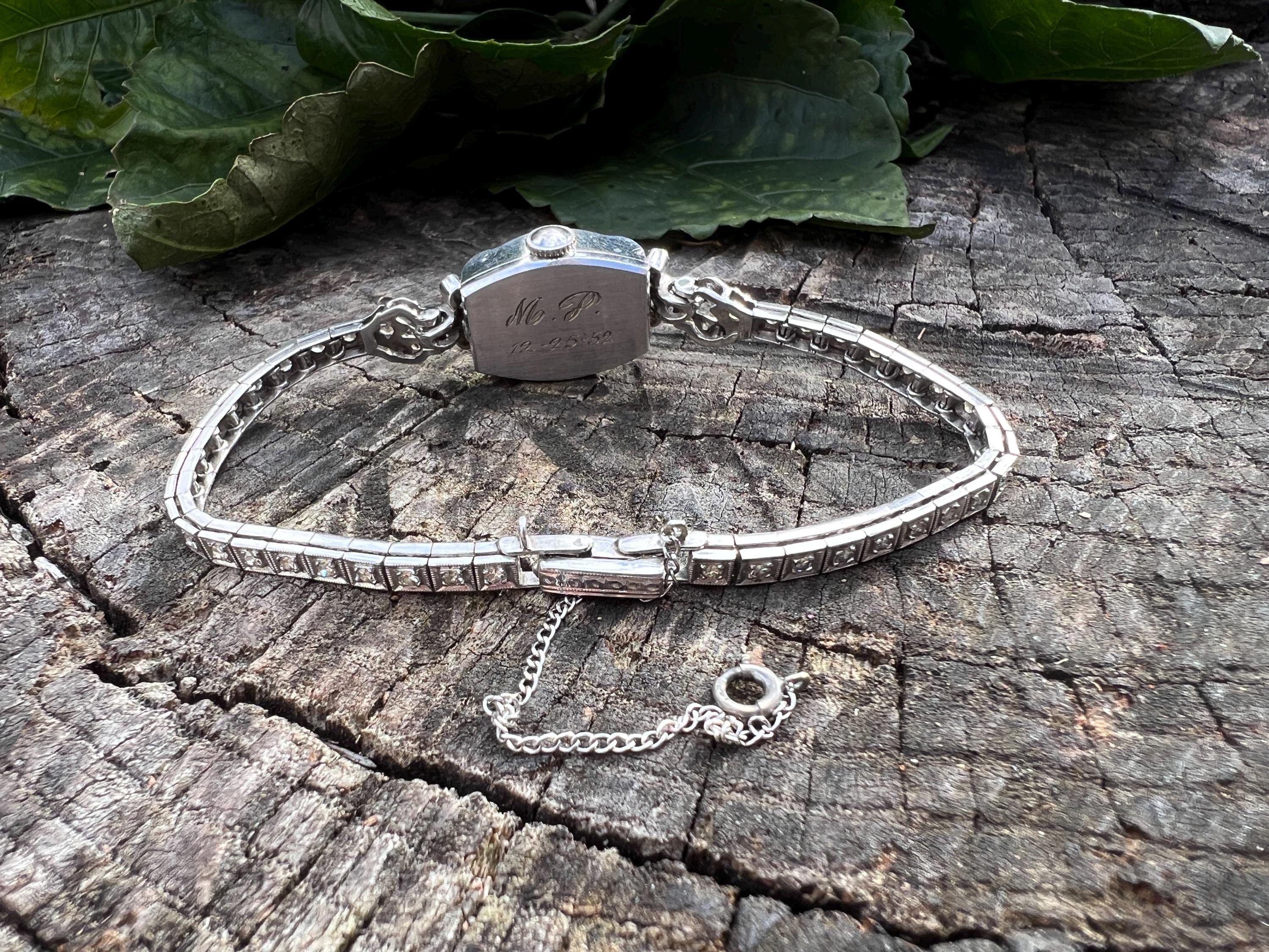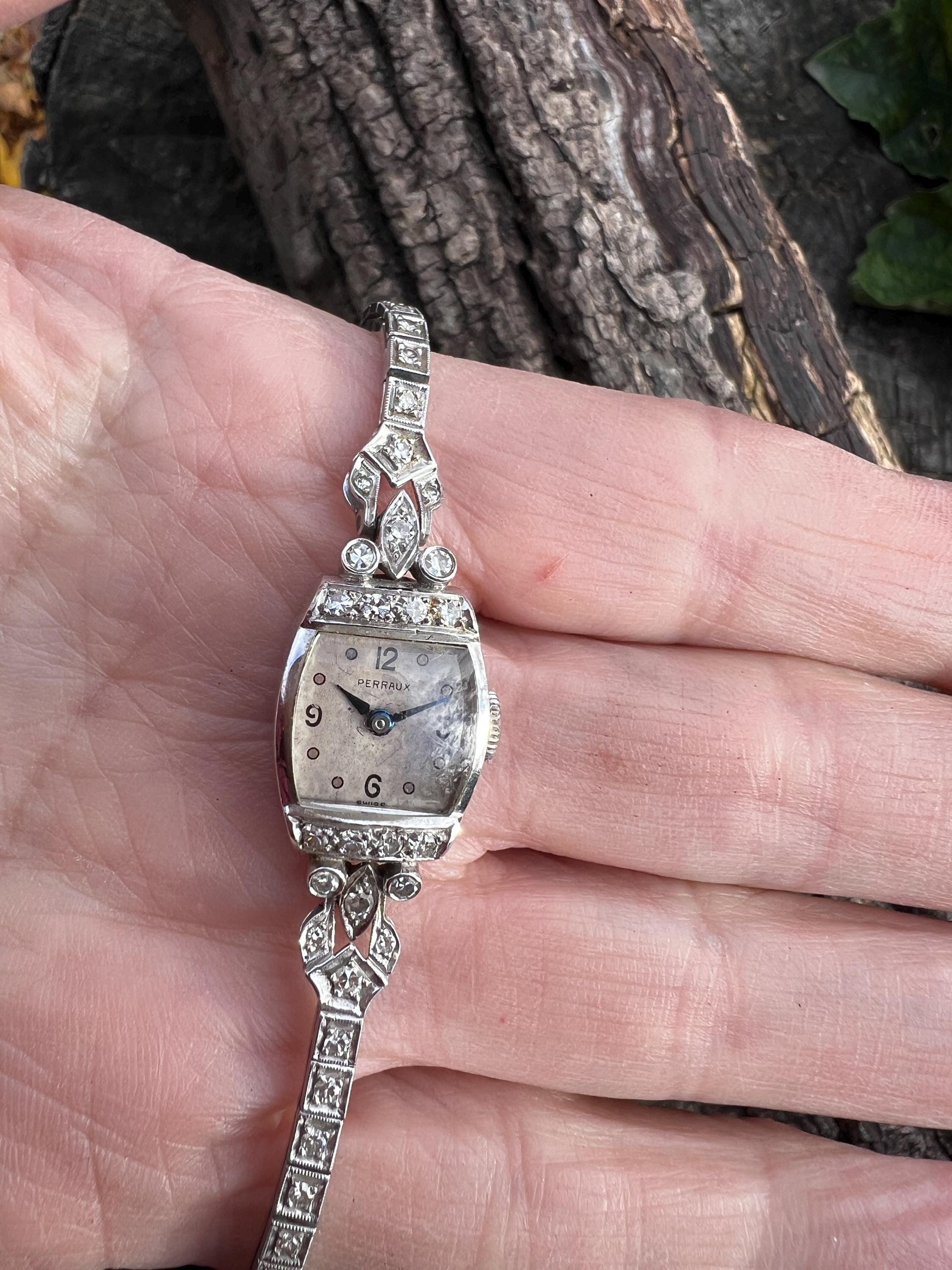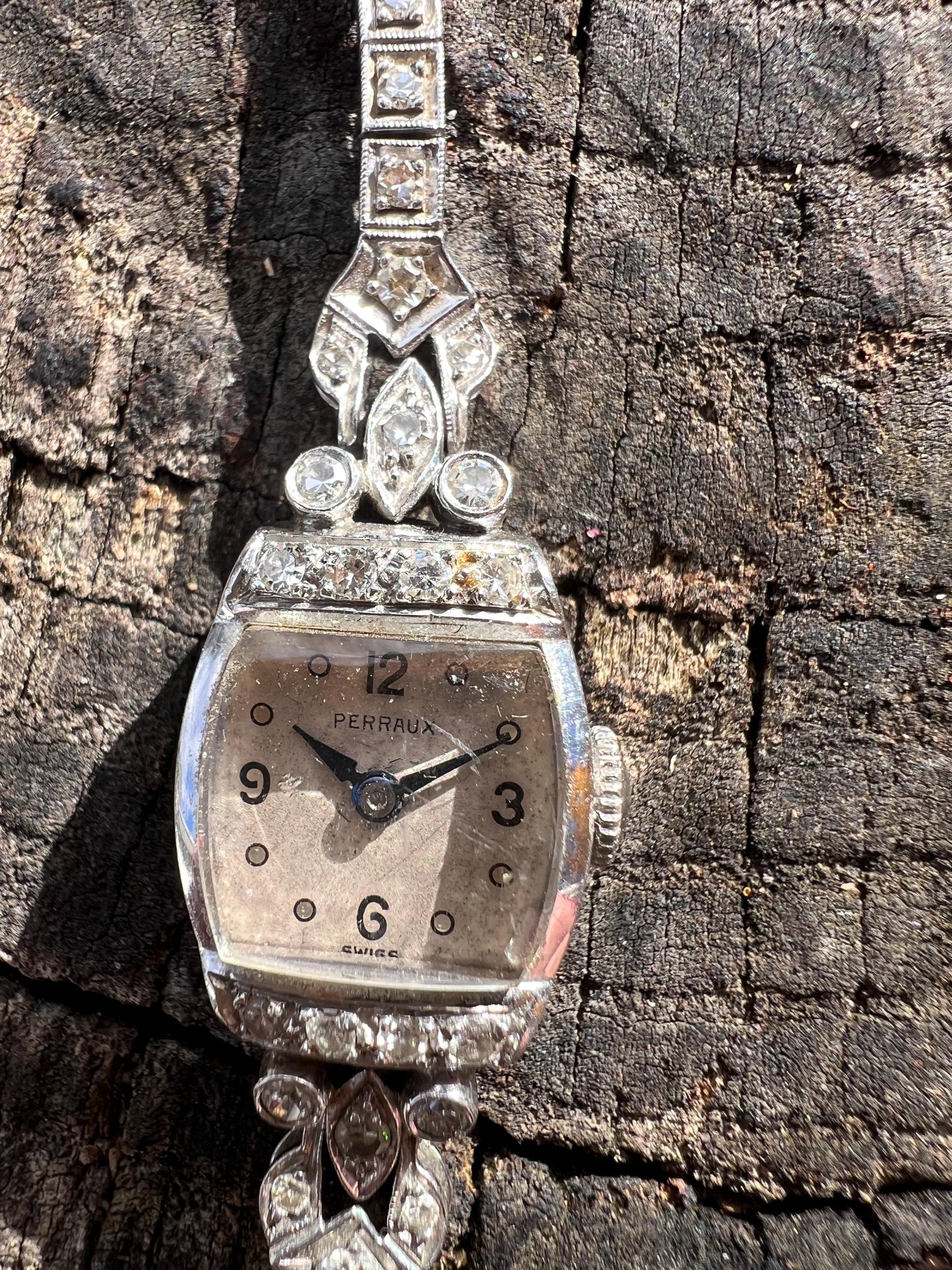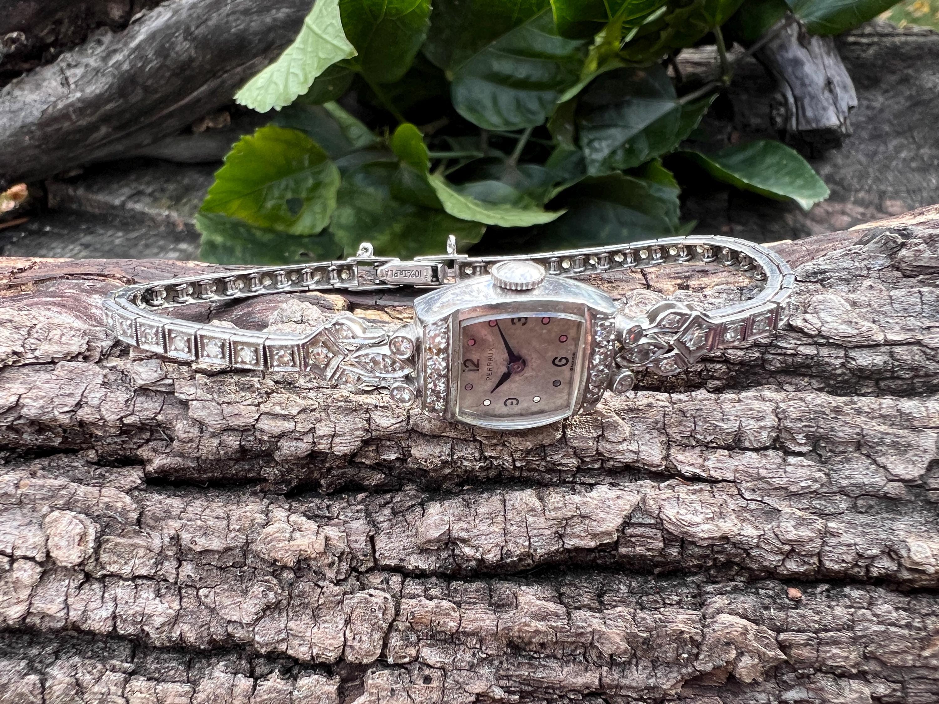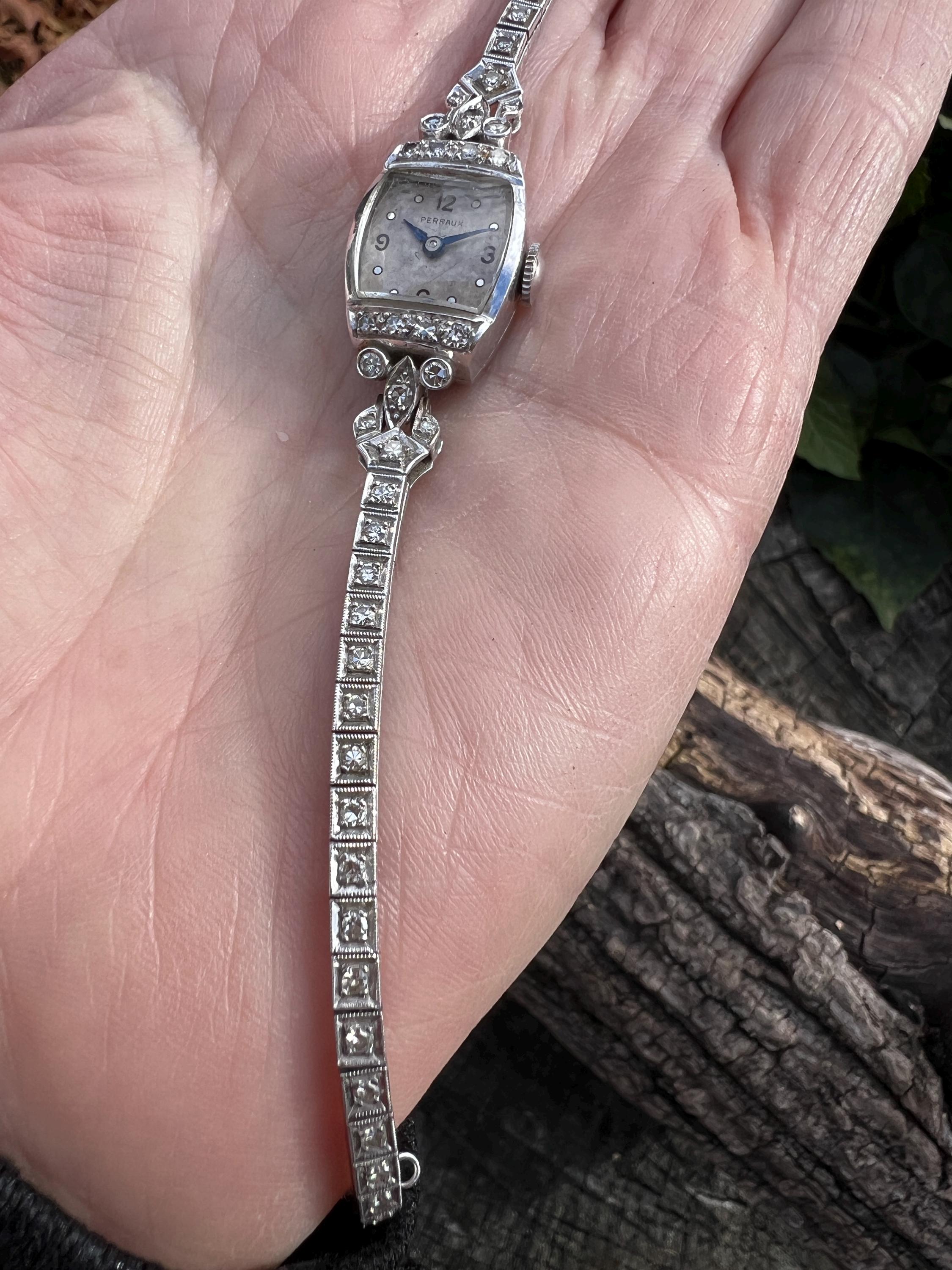 This impassioned art deco diamond watch is set in platinum. It dates from the 1920’s. Its alluring glamorous appeal is generously decorated with approx. 1.00 ct of lively round diamonds adding to its magnetism. The rectangular face is attached to a diamond studded band for maximum bling. The color of the diamonds are all H and the clarity is VS2. The allure is that it is much more than a timepiece. The watch measures 7 1/8”. The face measures 1/2" x 11/16". The bracelet width is 1/8". It weighs 21.99 grams. It is engraved on the back - MP and 12-25-52. The brand of watch is Perraux. The watch is in excellent working order.