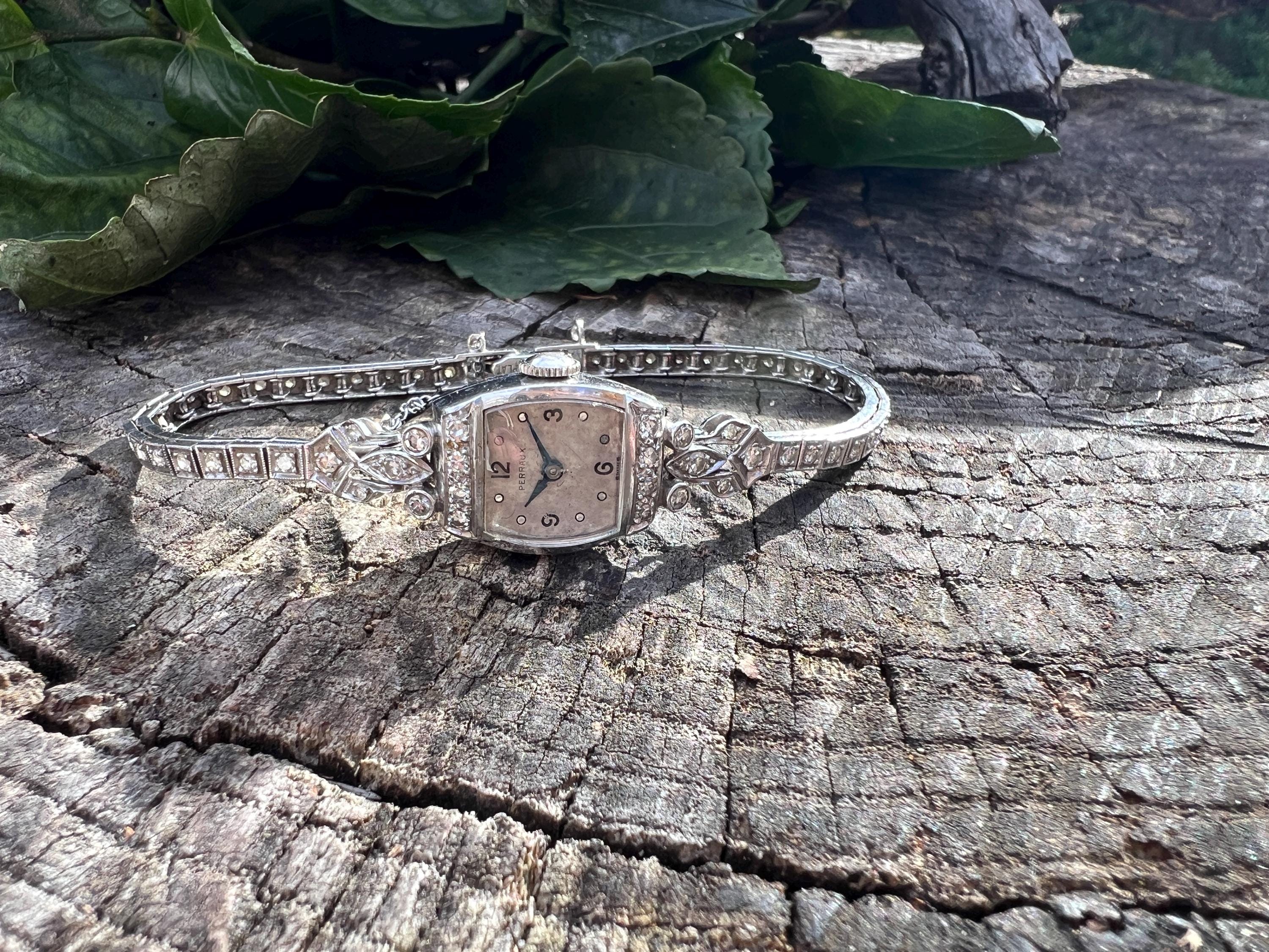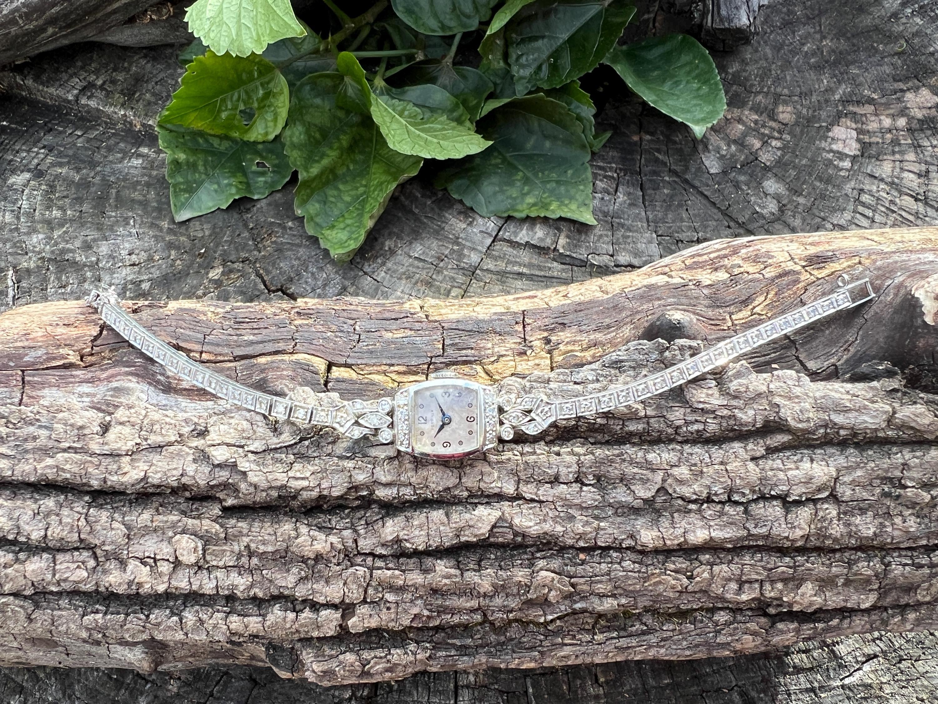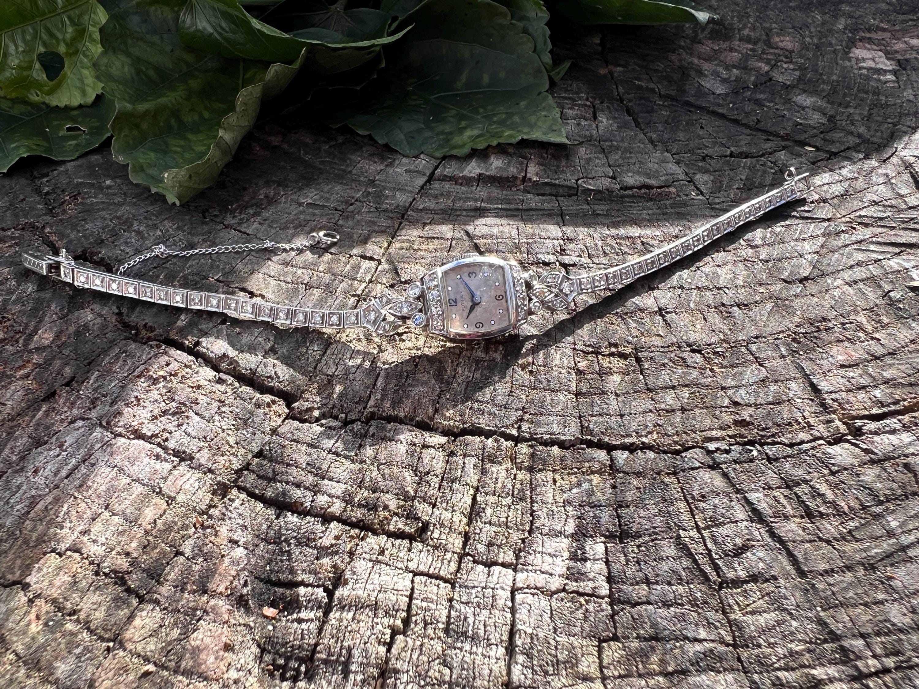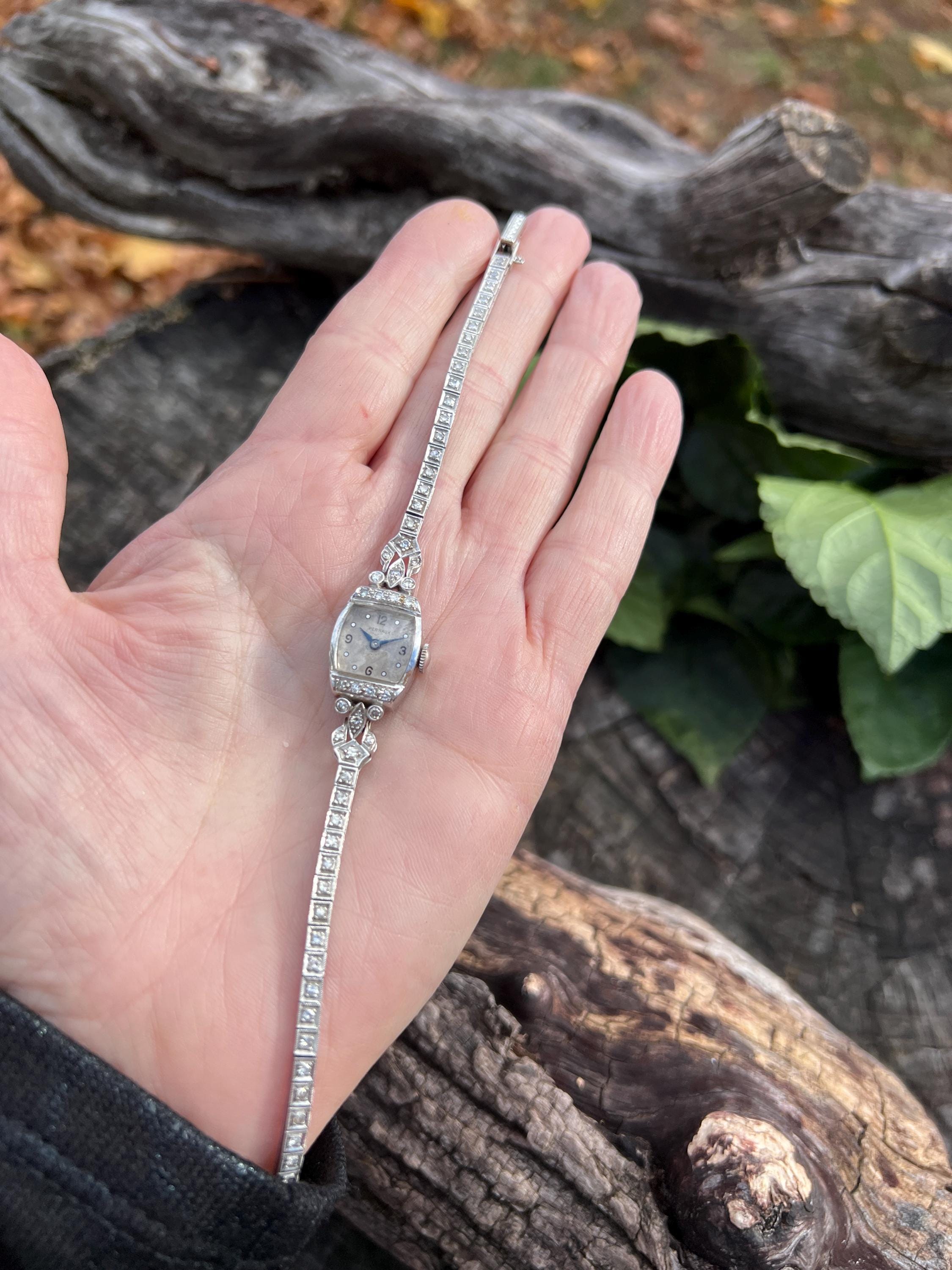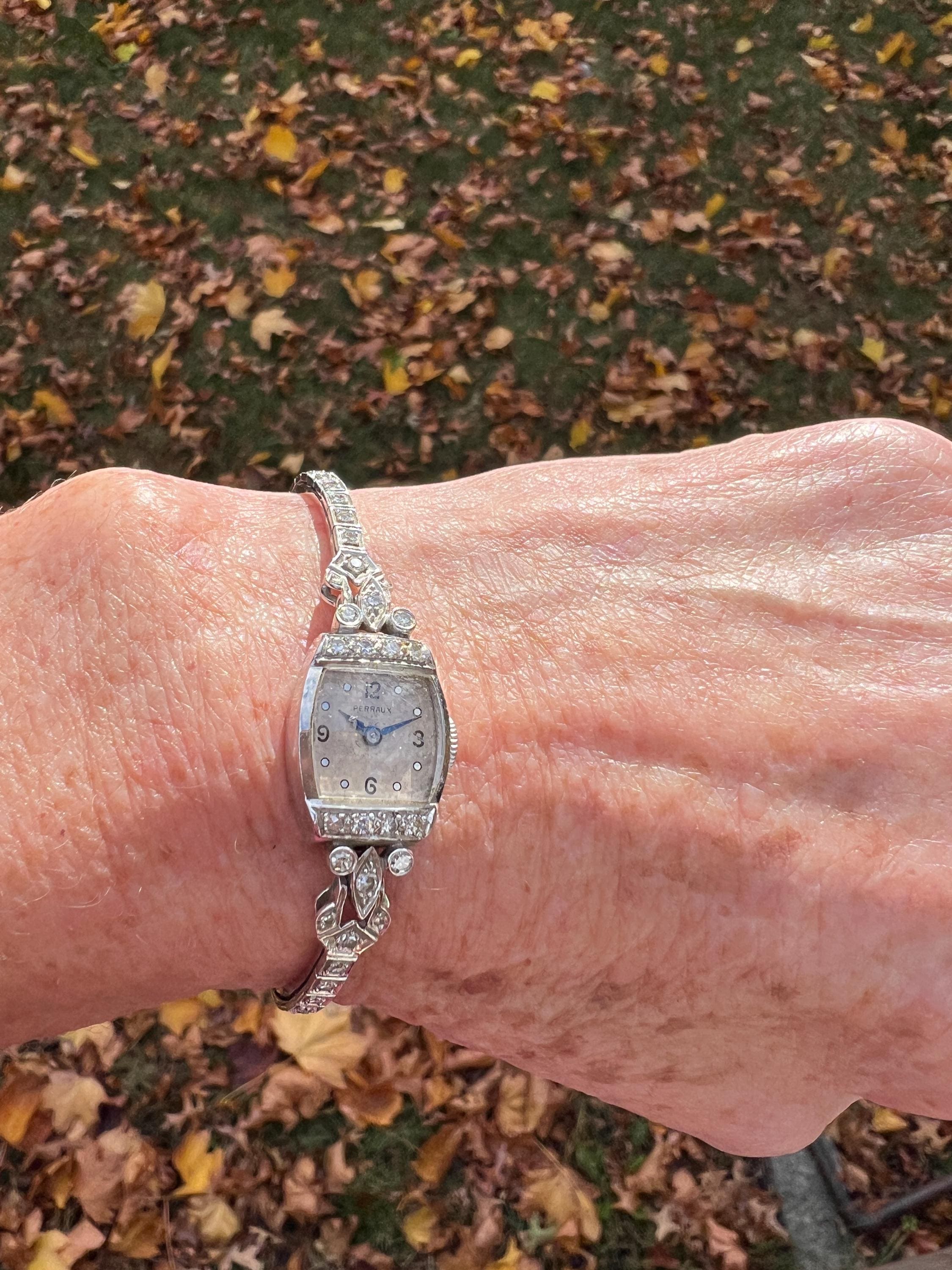 This impassioned art deco diamond watch is set in platinum. It dates from the 1920’s. Its alluring glamorous appeal is generously decorated with approx. 1.00 ct of lively round diamonds adding to its magnetism. The rectangular face is attached to a diamond studded band for maximum bling. The color of the diamonds are all H and the clarity is VS2. The allure is that it is much more than a timepiece. The watch measures 7 1/8”. The face measures 1/2" x 11/16". The bracelet width is 1/8". It weighs 21.99 grams. It is engraved on the back - MP and 12-25-52. The brand of watch is Perraux. The watch is in excellent working order.
