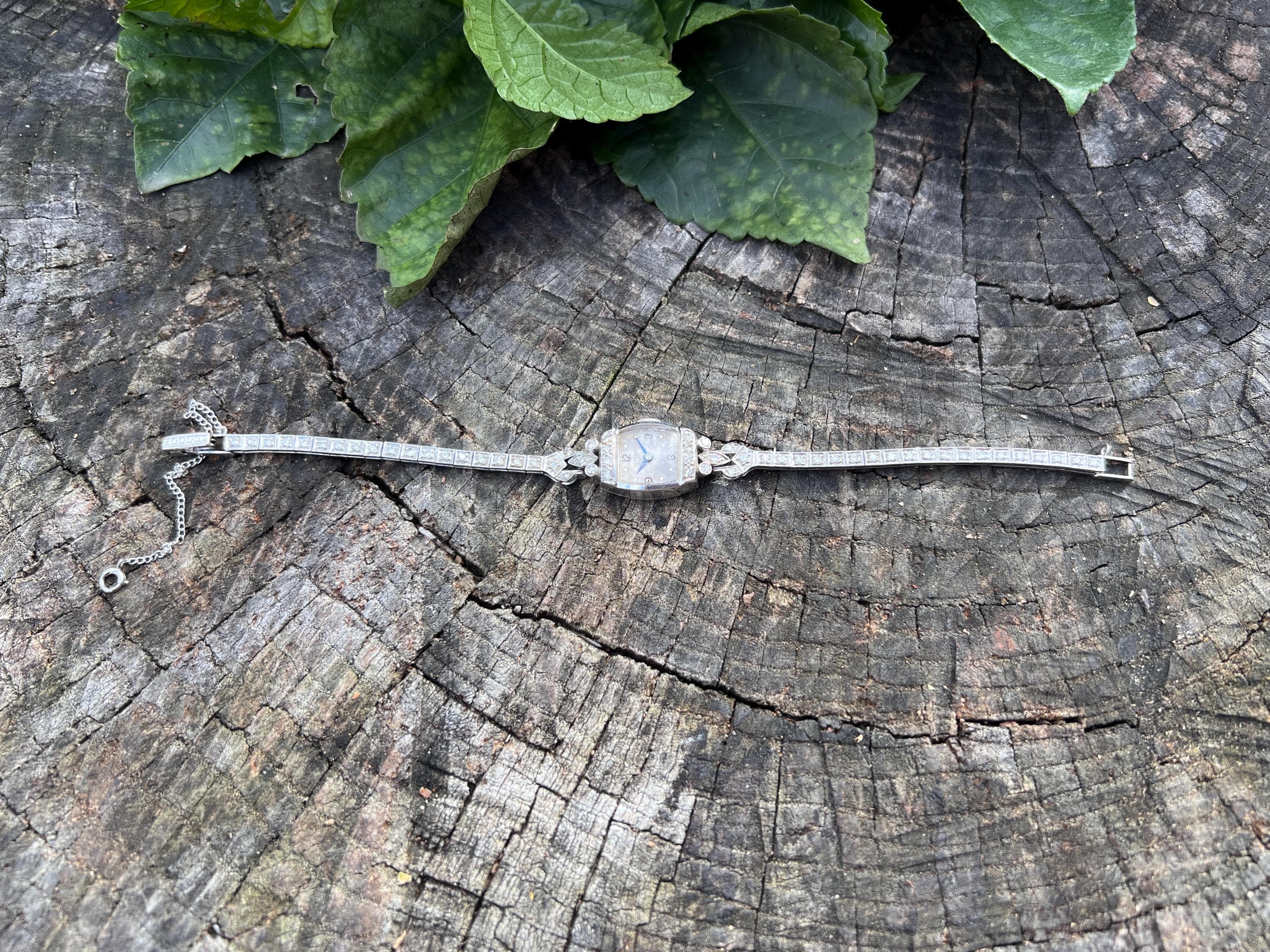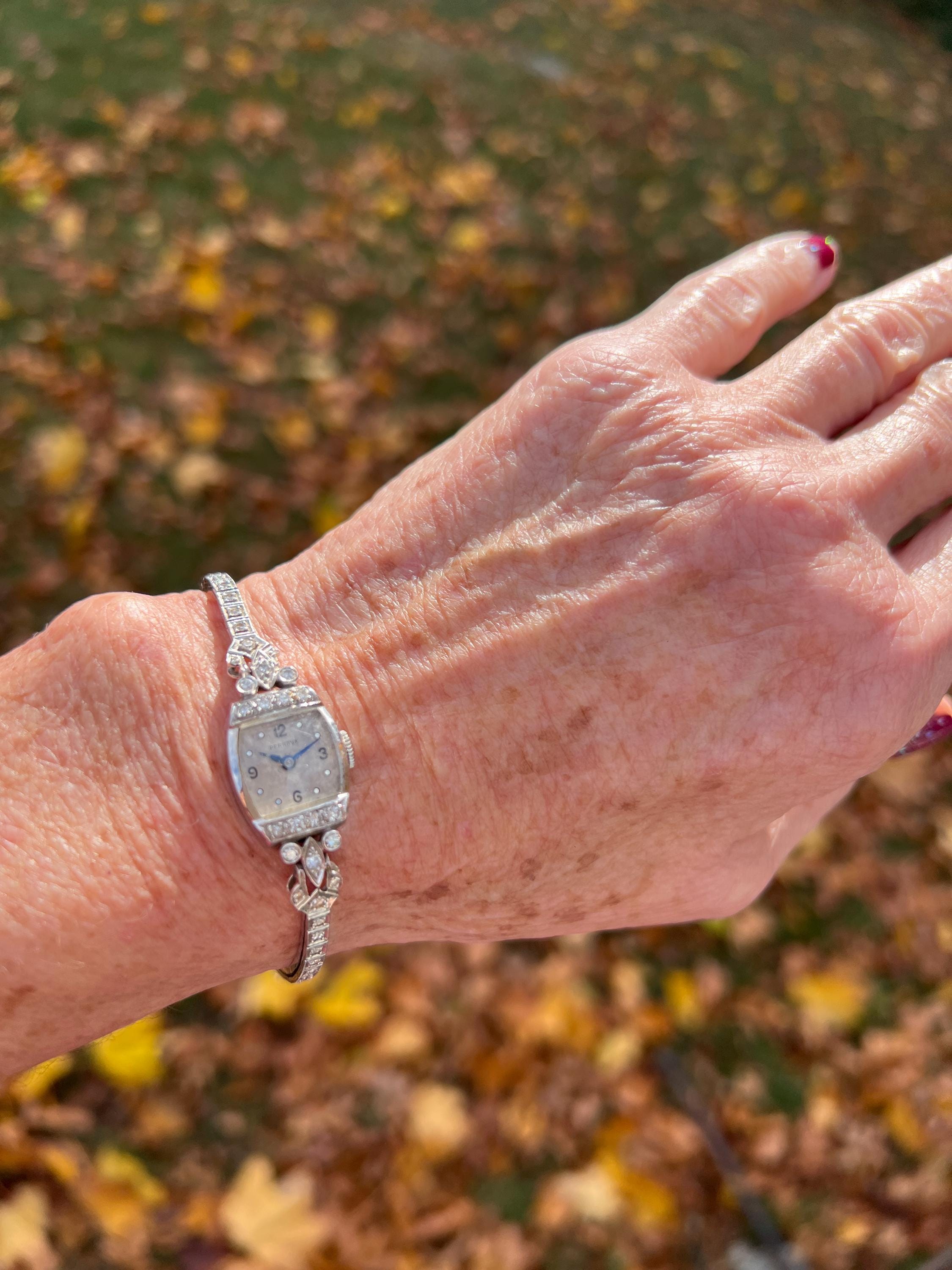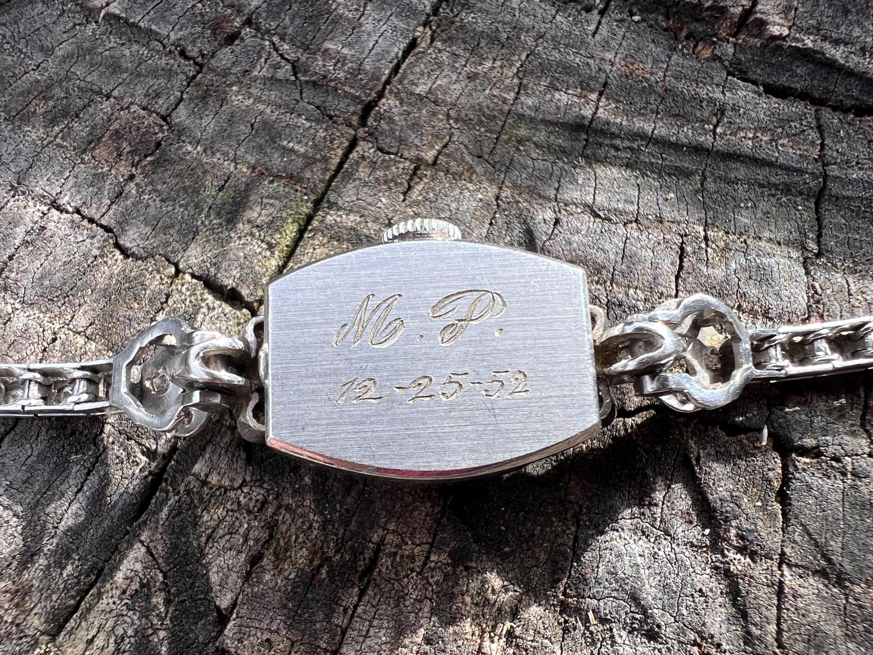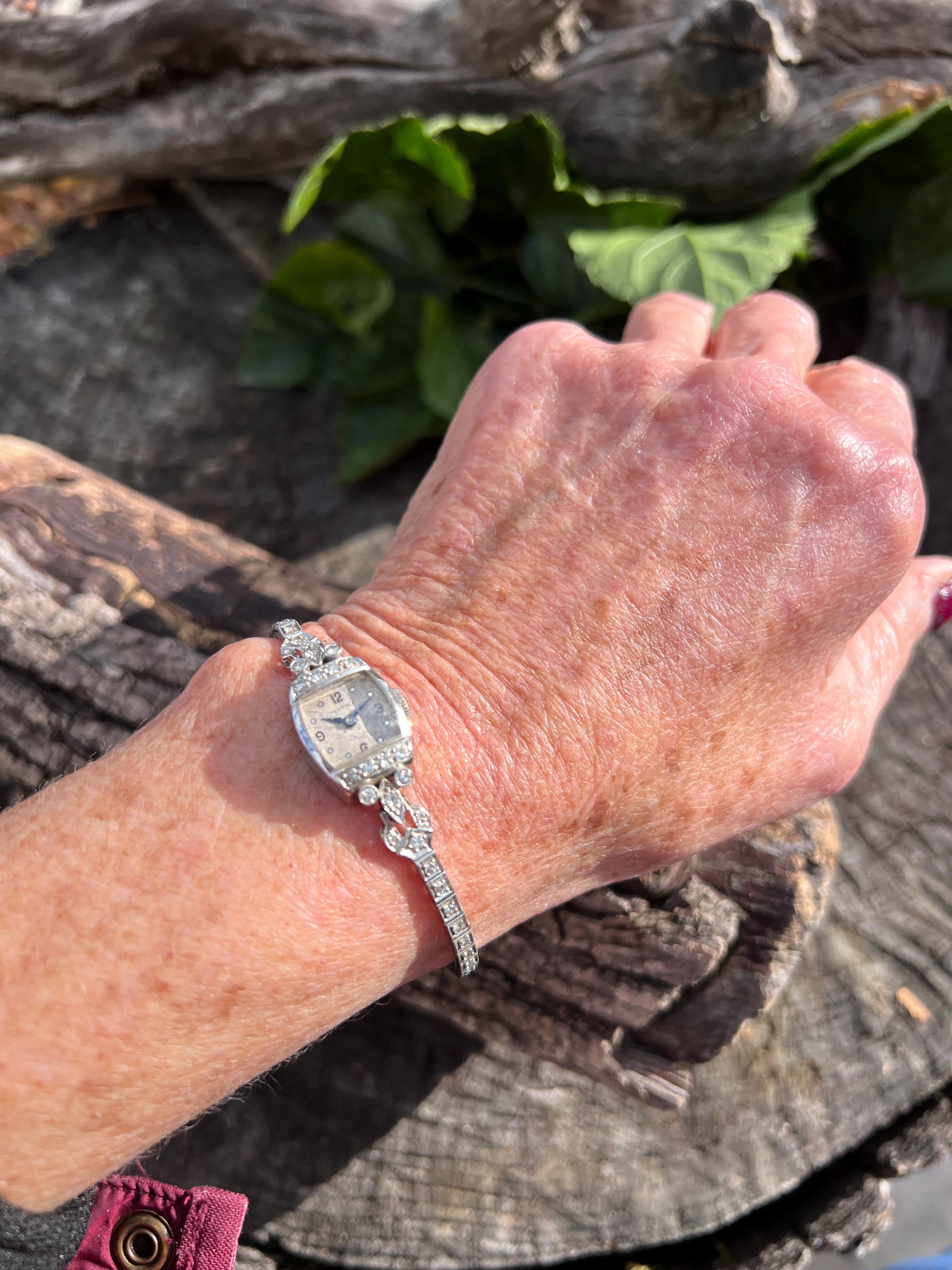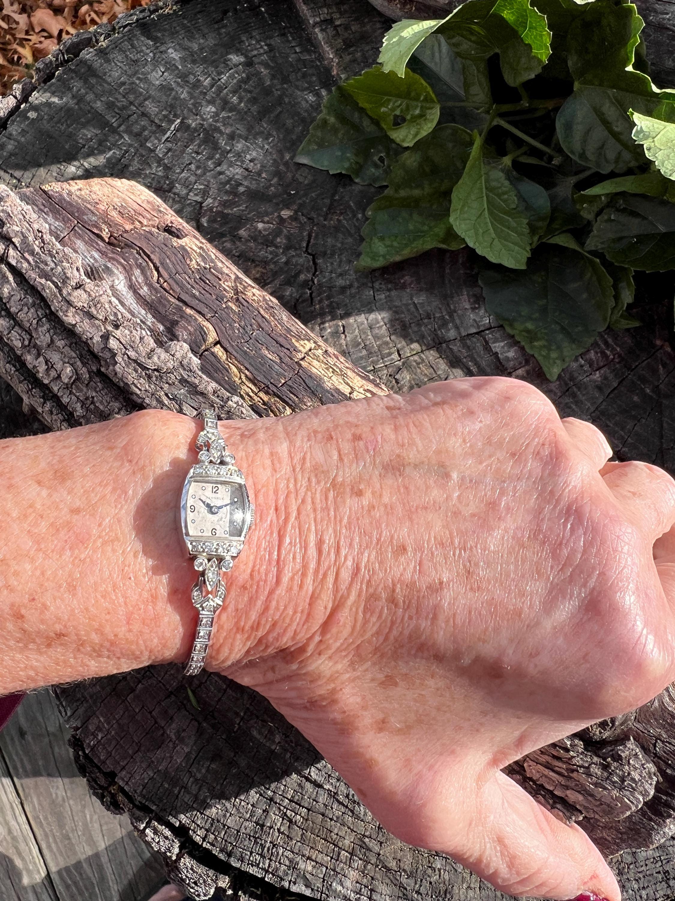 This impassioned art deco diamond watch is set in platinum. It dates from the 1920’s. Its alluring glamorous appeal is generously decorated with approx. 1.00 ct of lively round diamonds adding to its magnetism. The rectangular face is attached to a diamond studded band for maximum bling. The color of the diamonds are all H and the clarity is VS2. The allure is that it is much more than a timepiece. The watch measures 7 1/8”. The face measures 1/2" x 11/16". The bracelet width is 1/8". It weighs 21.99 grams. It is engraved on the back - MP and 12-25-52. The brand of watch is Perraux. The watch is in excellent working order.