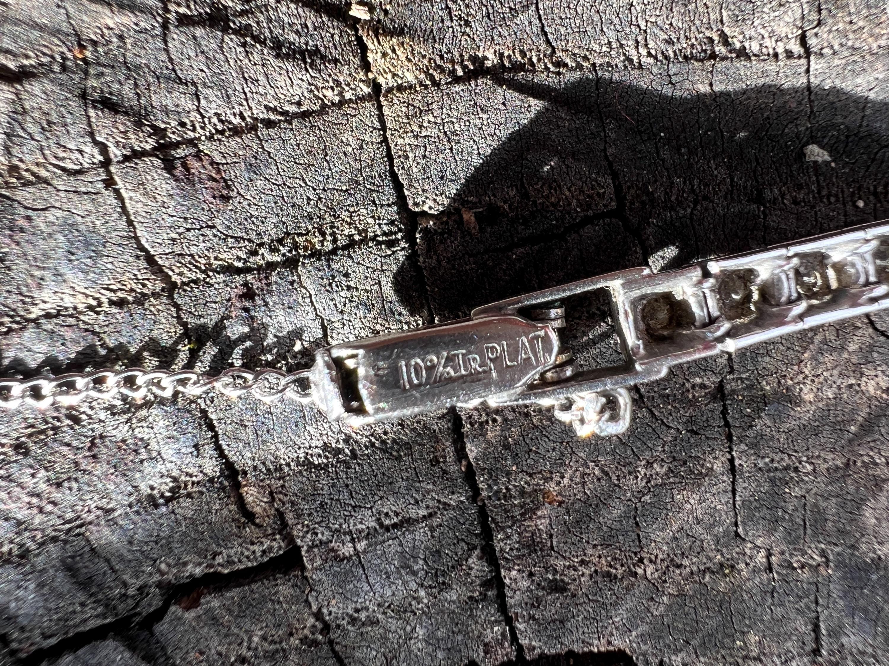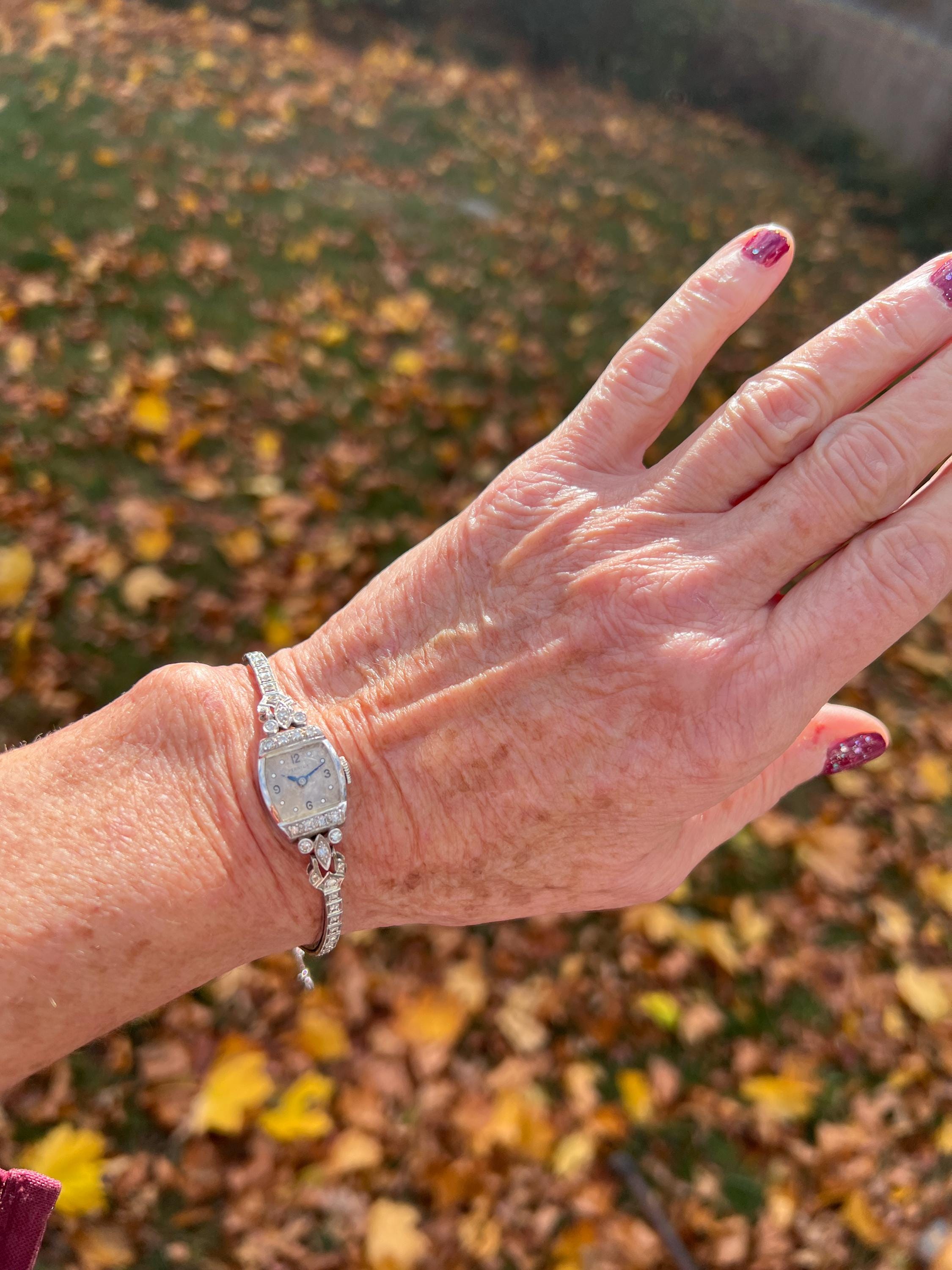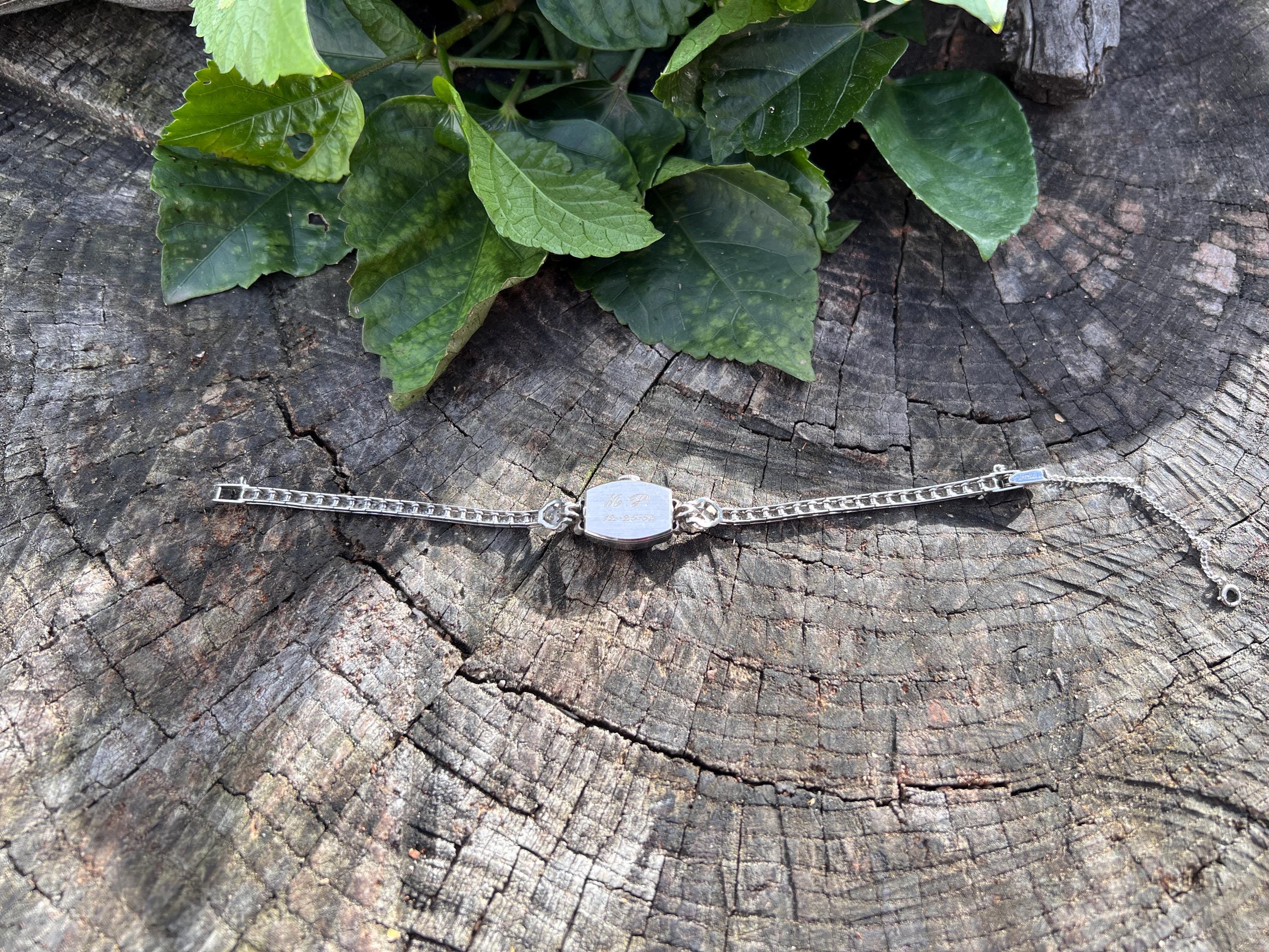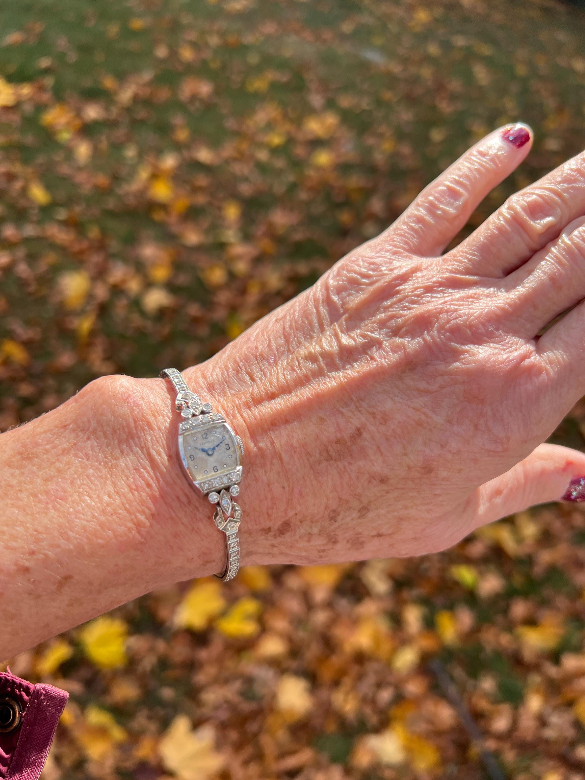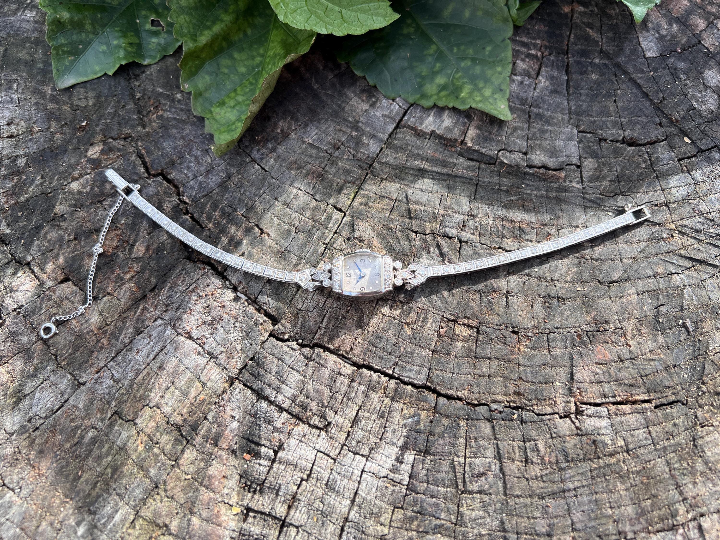 This impassioned art deco diamond watch is set in platinum. It dates from the 1920’s. Its alluring glamorous appeal is generously decorated with approx. 1.00 ct of lively round diamonds adding to its magnetism. The rectangular face is attached to a diamond studded band for maximum bling. The color of the diamonds are all H and the clarity is VS2. The allure is that it is much more than a timepiece. The watch measures 7 1/8”. The face measures 1/2" x 11/16". The bracelet width is 1/8". It weighs 21.99 grams. It is engraved on the back - MP and 12-25-52. The brand of watch is Perraux. The watch is in excellent working order.