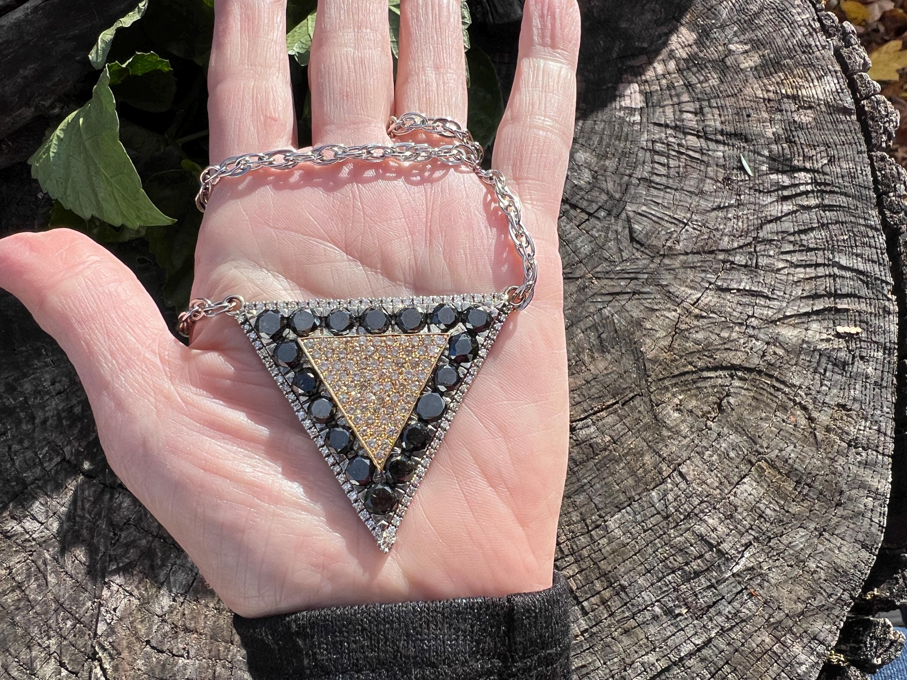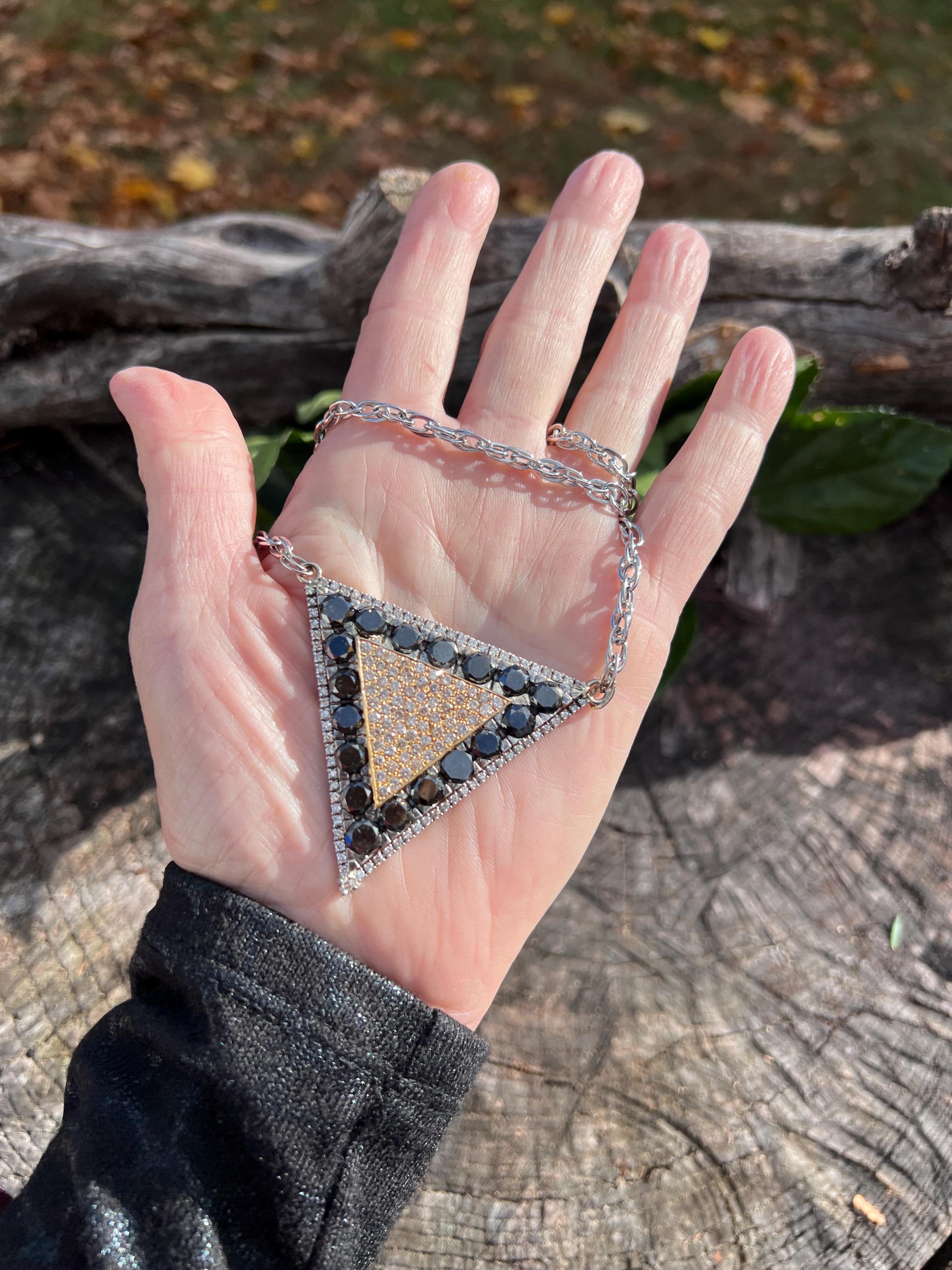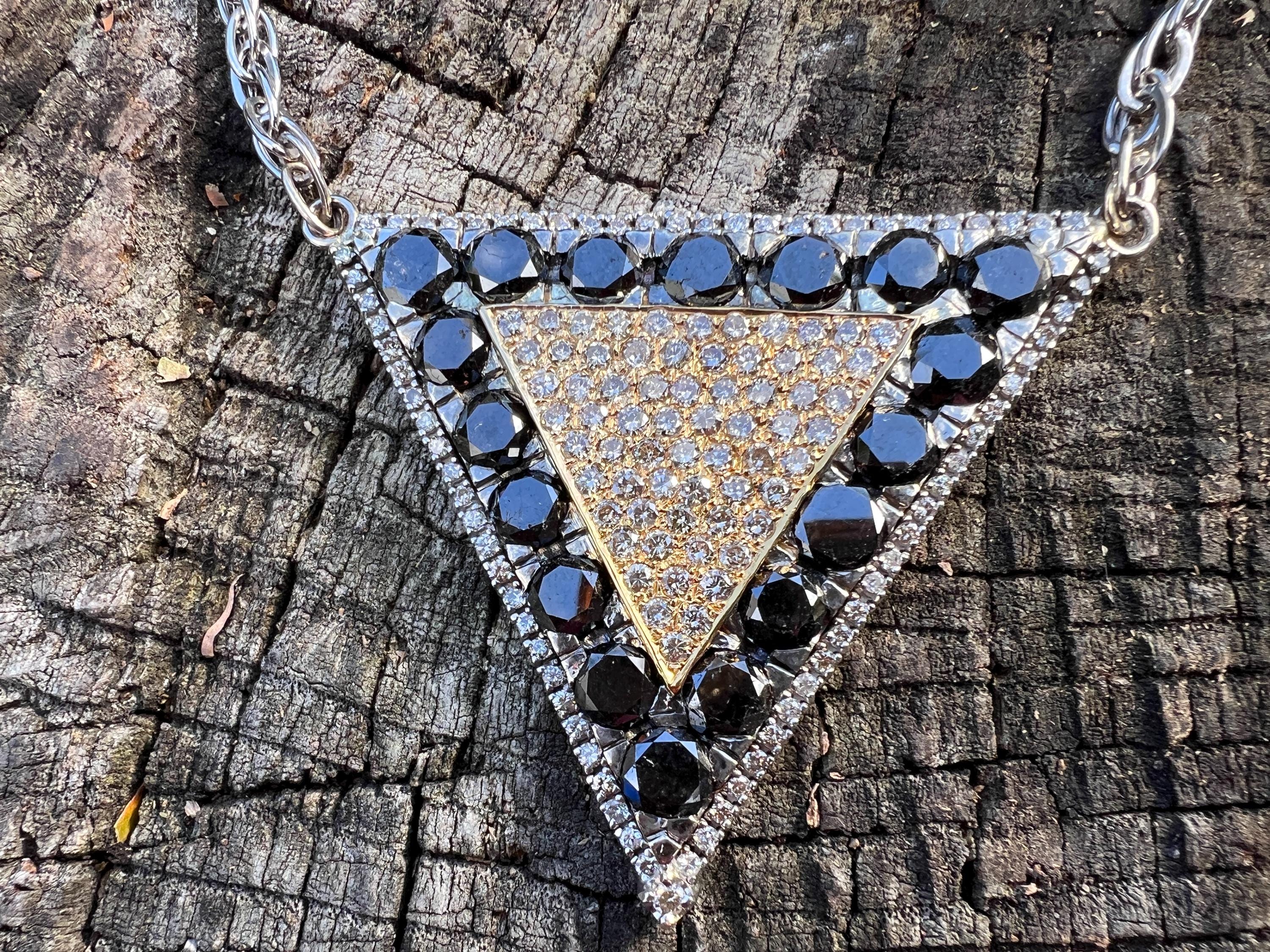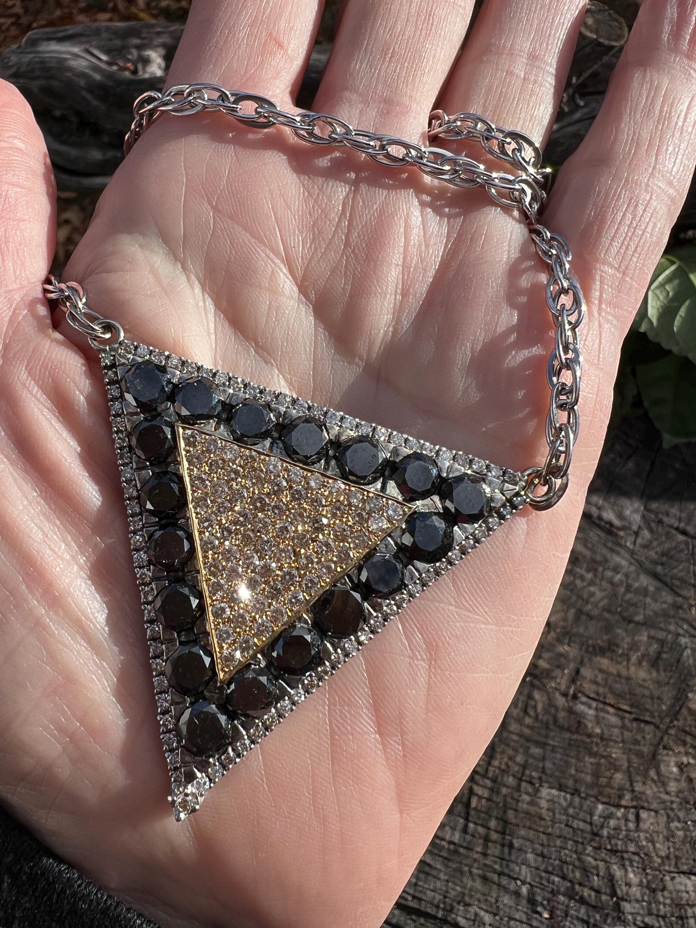 This spectacular vintage triangle black, white and champagne diamond pendant is a one of kind beauty. The pendant is set in 14k white gold. Opulently set in the center are a barrage of champagne colored diamond, secured by an orb of dazzling black diamonds and bordered with a coating of white round diamonds. Coming together to form this striking look making this an exquisitely unique piece. The white diamonds have a total weight of 1.87 ct. The diamonds are G/H in color and VS2/sI1 in clarity. The black diamonds have a total weight of 20.69 ct. The champagne diamonds have a total weight of 2.99 ct. The champagne diamonds are VS2/SI1 in clarity. All attached to a beautiful curb link chain. The lavish and luxurious pendant gives way to an unruffled energy . This is the ultimate pedant. The entire piece weighs 34.12 grams. The chain measures 17 1/2" long and 1/16" wide. The pendant measures 2" x 1 7/8". It is marked 14k. It comes with a certificate from the Gemological Appraisal Laboratory of America.