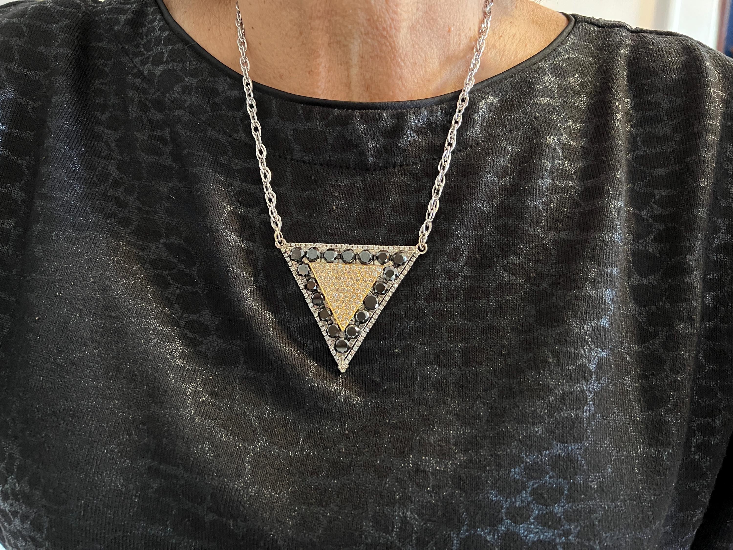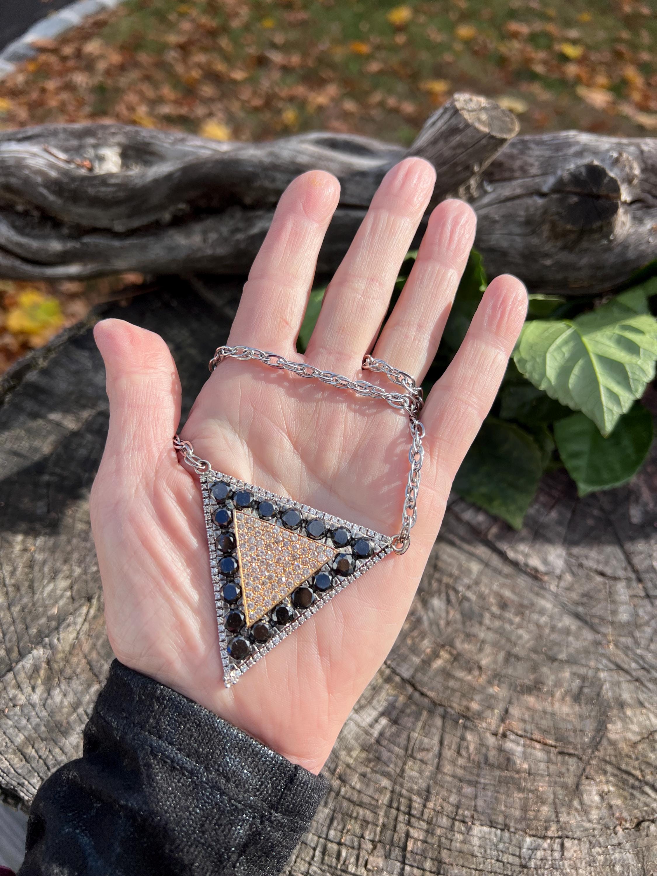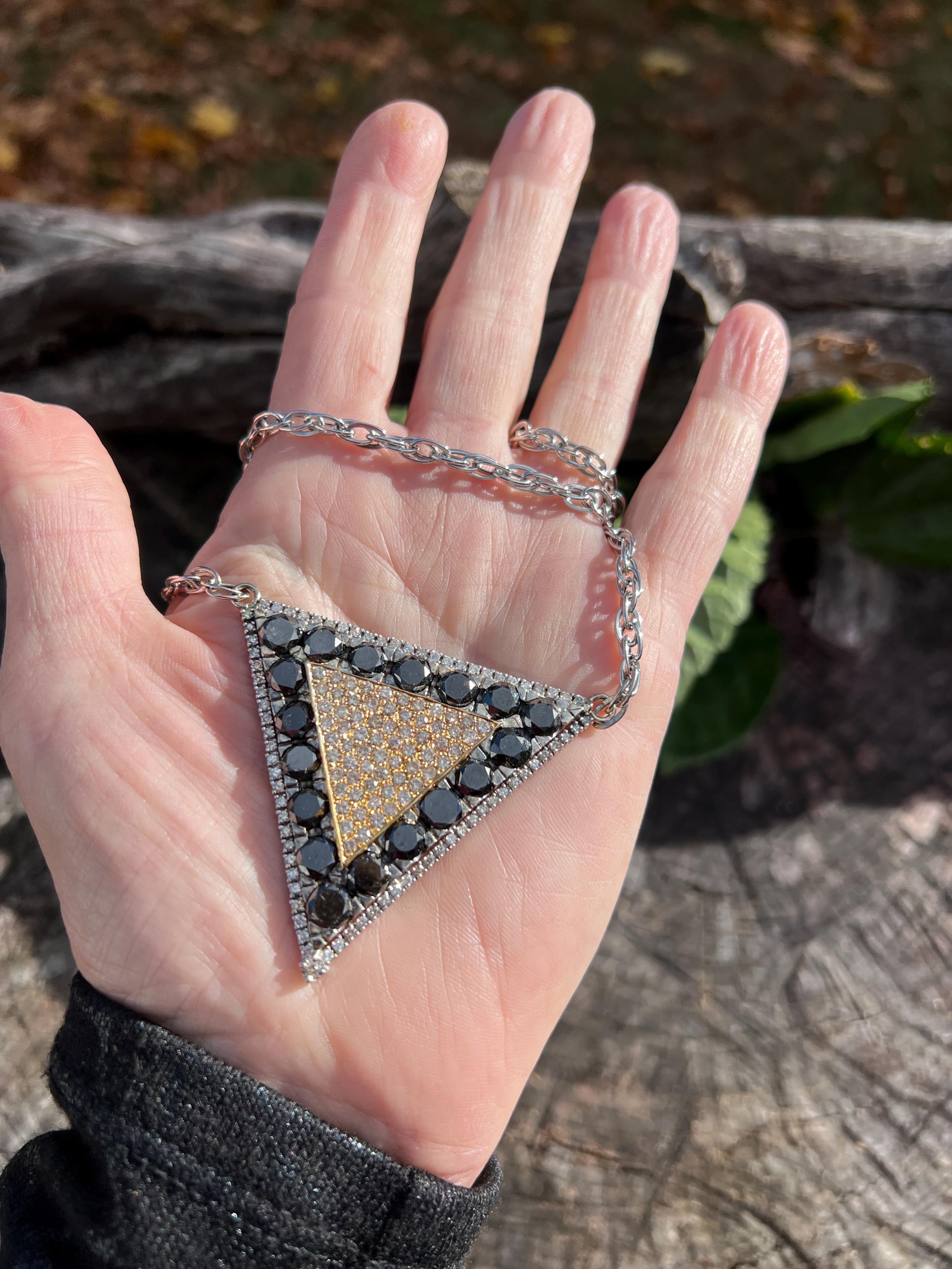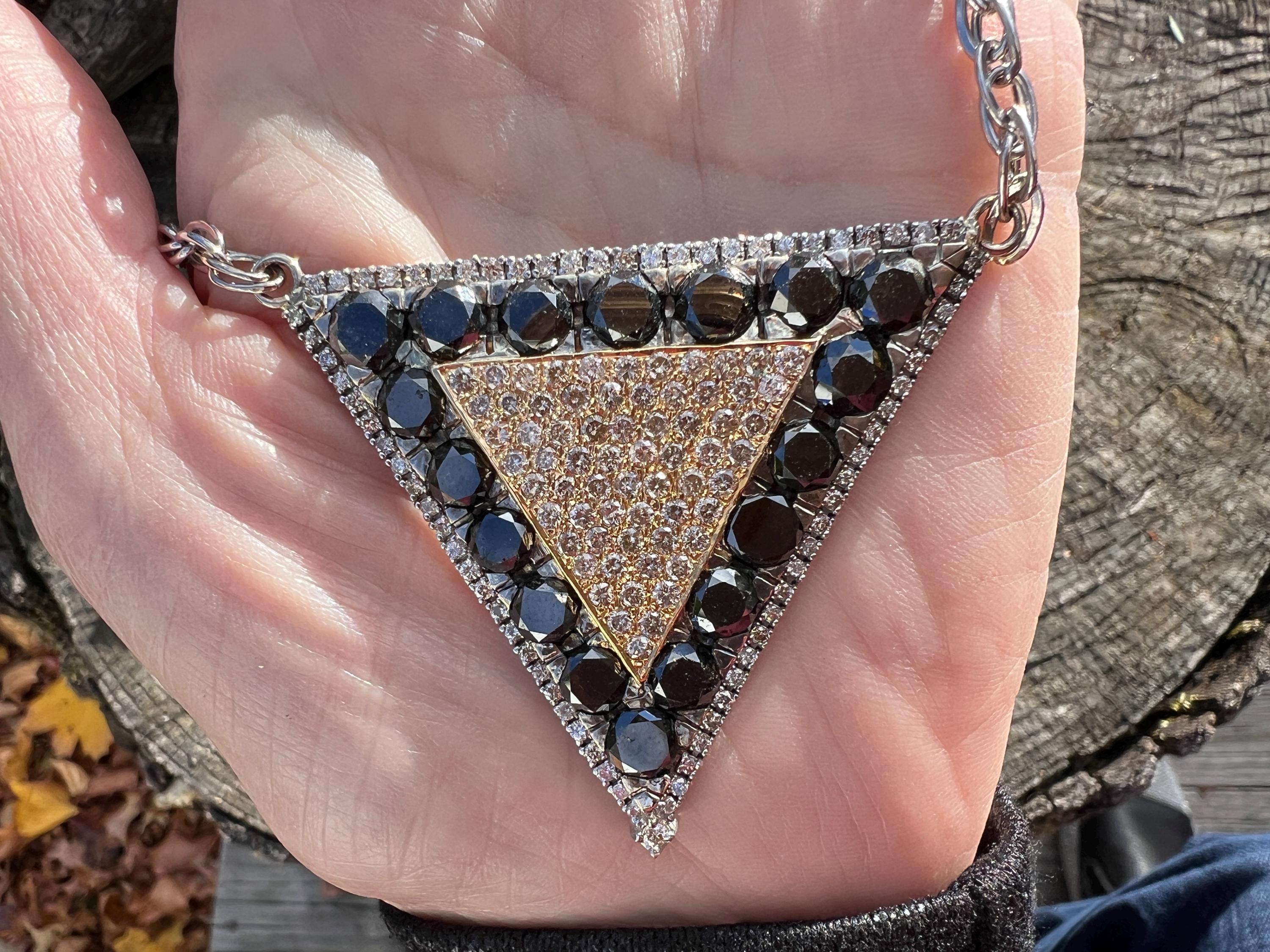 This spectacular vintage triangle black, white and champagne diamond pendant is a one of kind beauty. The pendant is set in 14k white gold. Opulently set in the center are a barrage of champagne colored diamond, secured by an orb of dazzling black diamonds and bordered with a coating of white round diamonds. Coming together to form this striking look making this an exquisitely unique piece. The white diamonds have a total weight of 1.87 ct. The diamonds are G/H in color and VS2/sI1 in clarity. The black diamonds have a total weight of 20.69 ct. The champagne diamonds have a total weight of 2.99 ct. The champagne diamonds are VS2/SI1 in clarity. All attached to a beautiful curb link chain. The lavish and luxurious pendant gives way to an unruffled energy . This is the ultimate pedant. The entire piece weighs 34.12 grams. The chain measures 17 1/2" long and 1/16" wide. The pendant measures 2" x 1 7/8". It is marked 14k. It comes with a certificate from the Gemological Appraisal Laboratory of America.