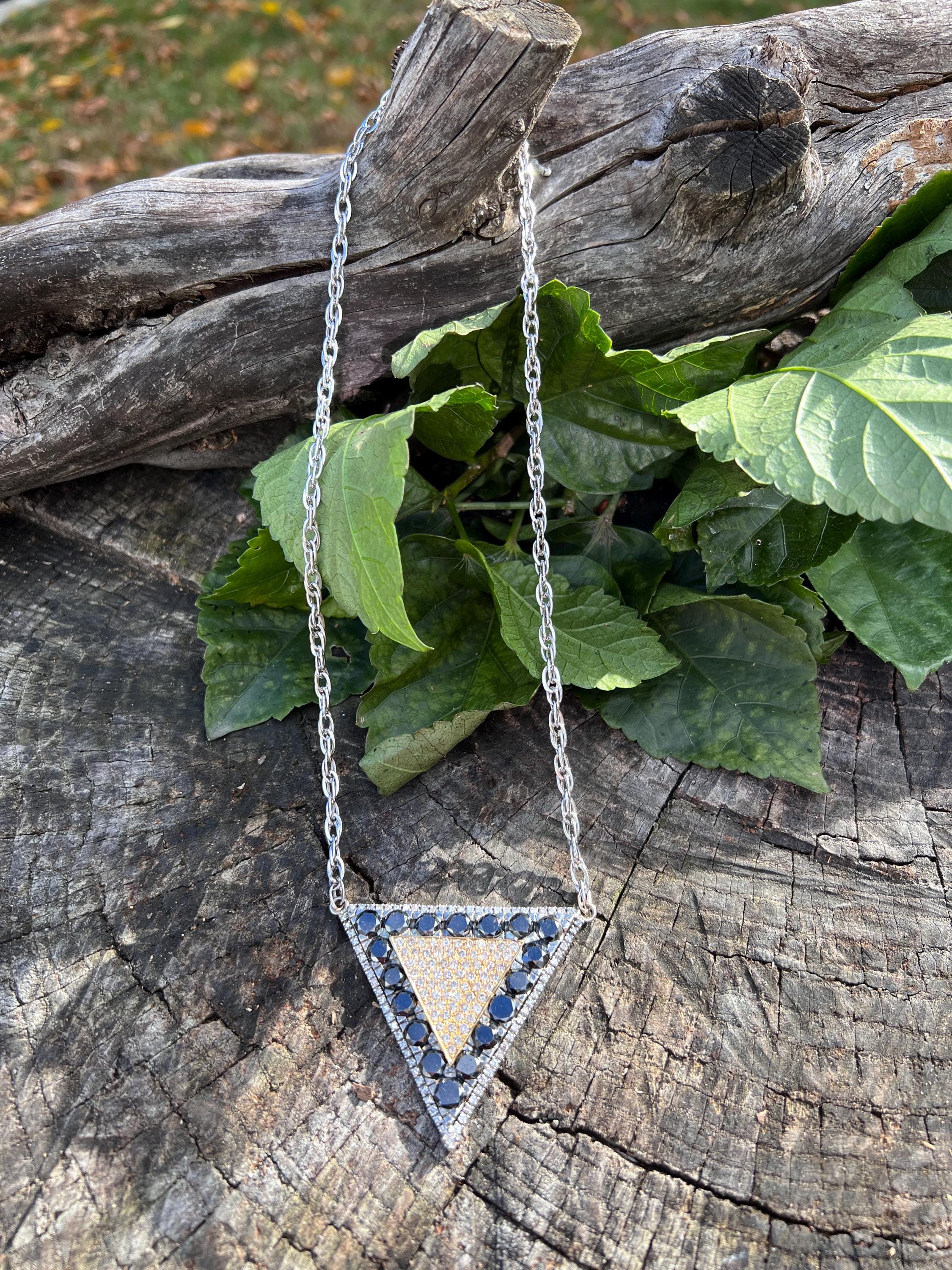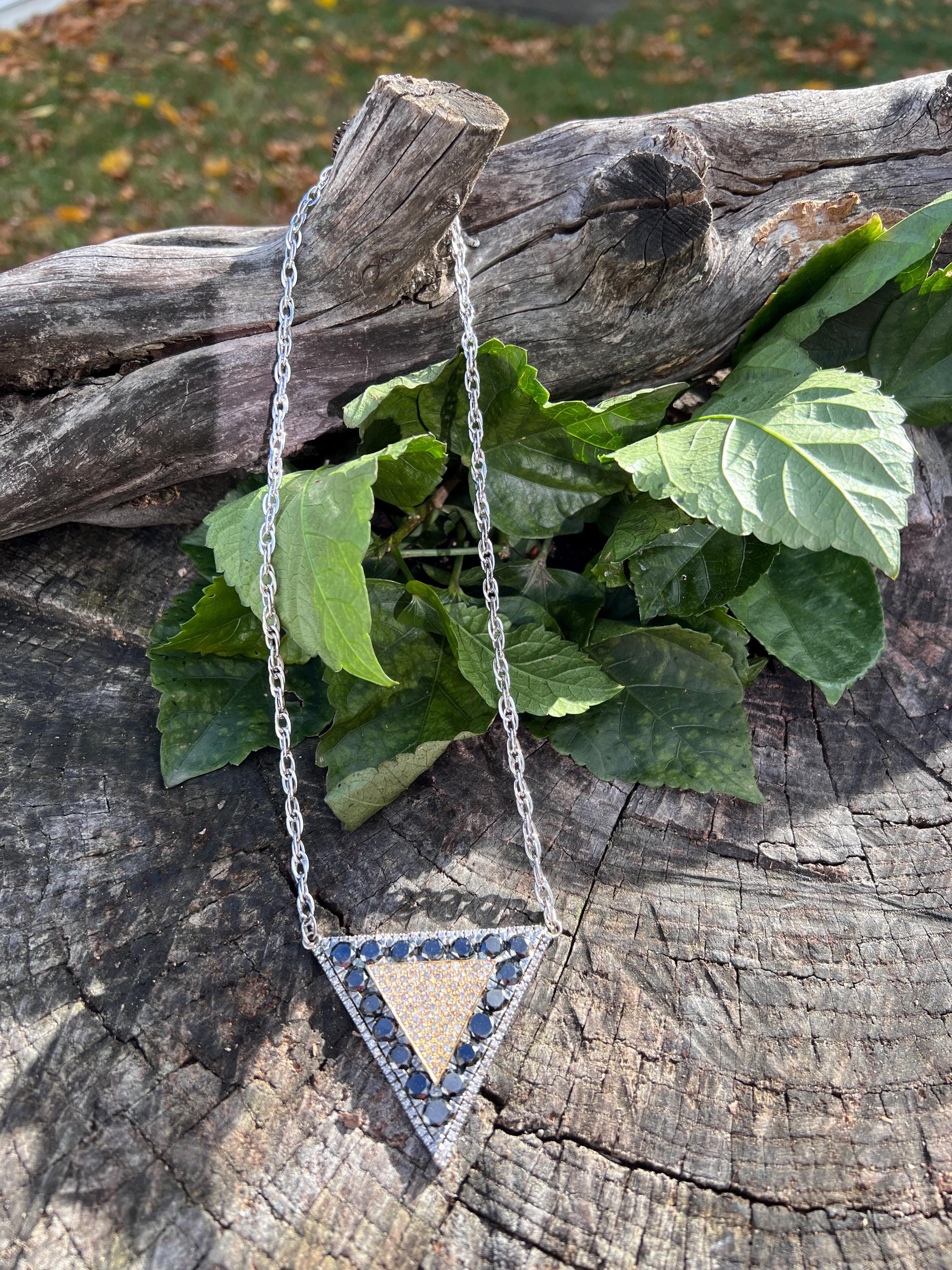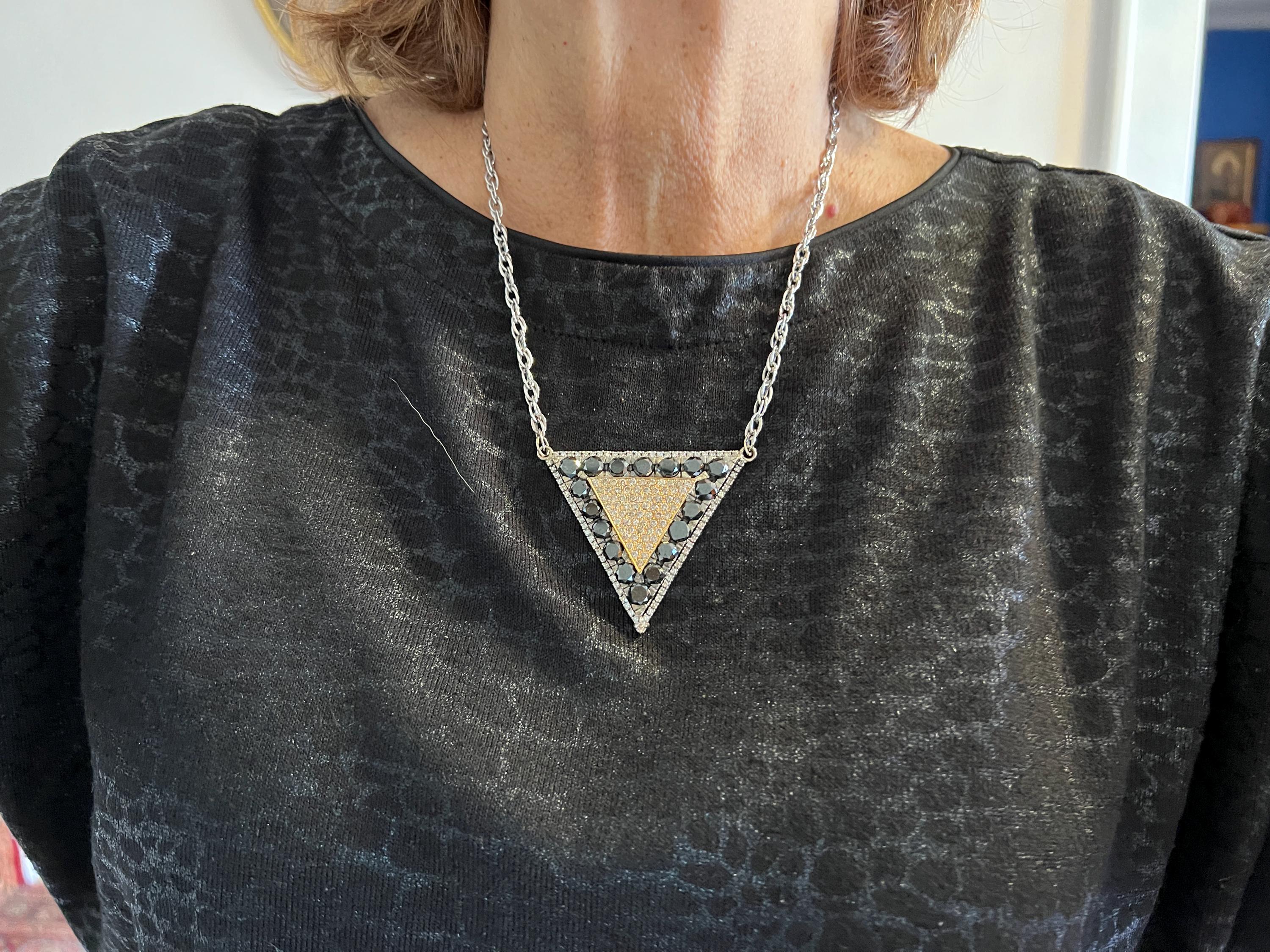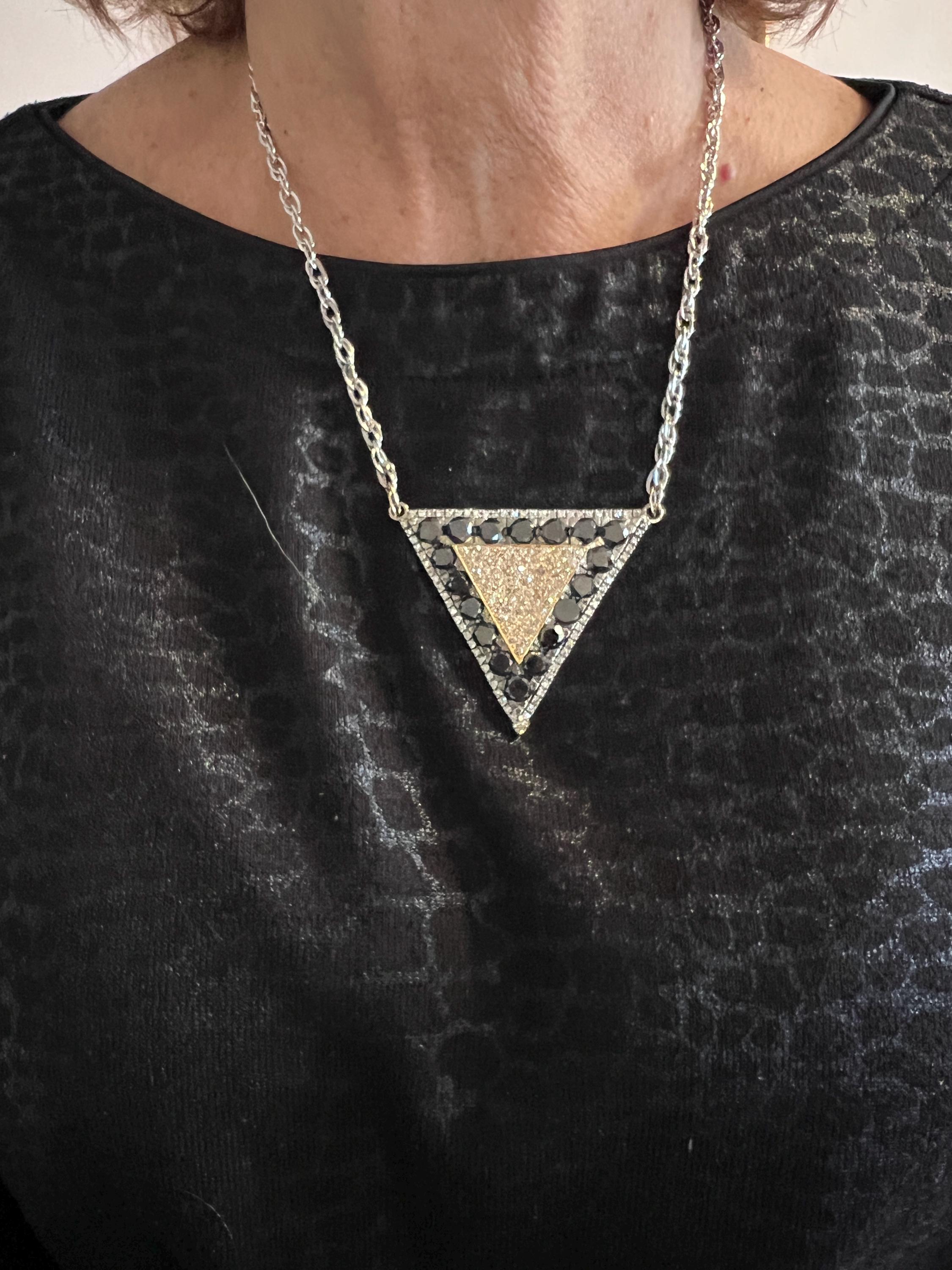 This spectacular vintage triangle black, white and champagne diamond pendant is a one of kind beauty. The pendant is set in 14k white gold. Opulently set in the center are a barrage of champagne colored diamond, secured by an orb of dazzling black diamonds and bordered with a coating of white round diamonds. Coming together to form this striking look making this an exquisitely unique piece. The white diamonds have a total weight of 1.87 ct. The diamonds are G/H in color and VS2/sI1 in clarity. The black diamonds have a total weight of 20.69 ct. The champagne diamonds have a total weight of 2.99 ct. The champagne diamonds are VS2/SI1 in clarity. All attached to a beautiful curb link chain. The lavish and luxurious pendant gives way to an unruffled energy . This is the ultimate pedant. The entire piece weighs 34.12 grams. The chain measures 17 1/2" long and 1/16" wide. The pendant measures 2" x 1 7/8". It is marked 14k. It comes with a certificate from the Gemological Appraisal Laboratory of America.