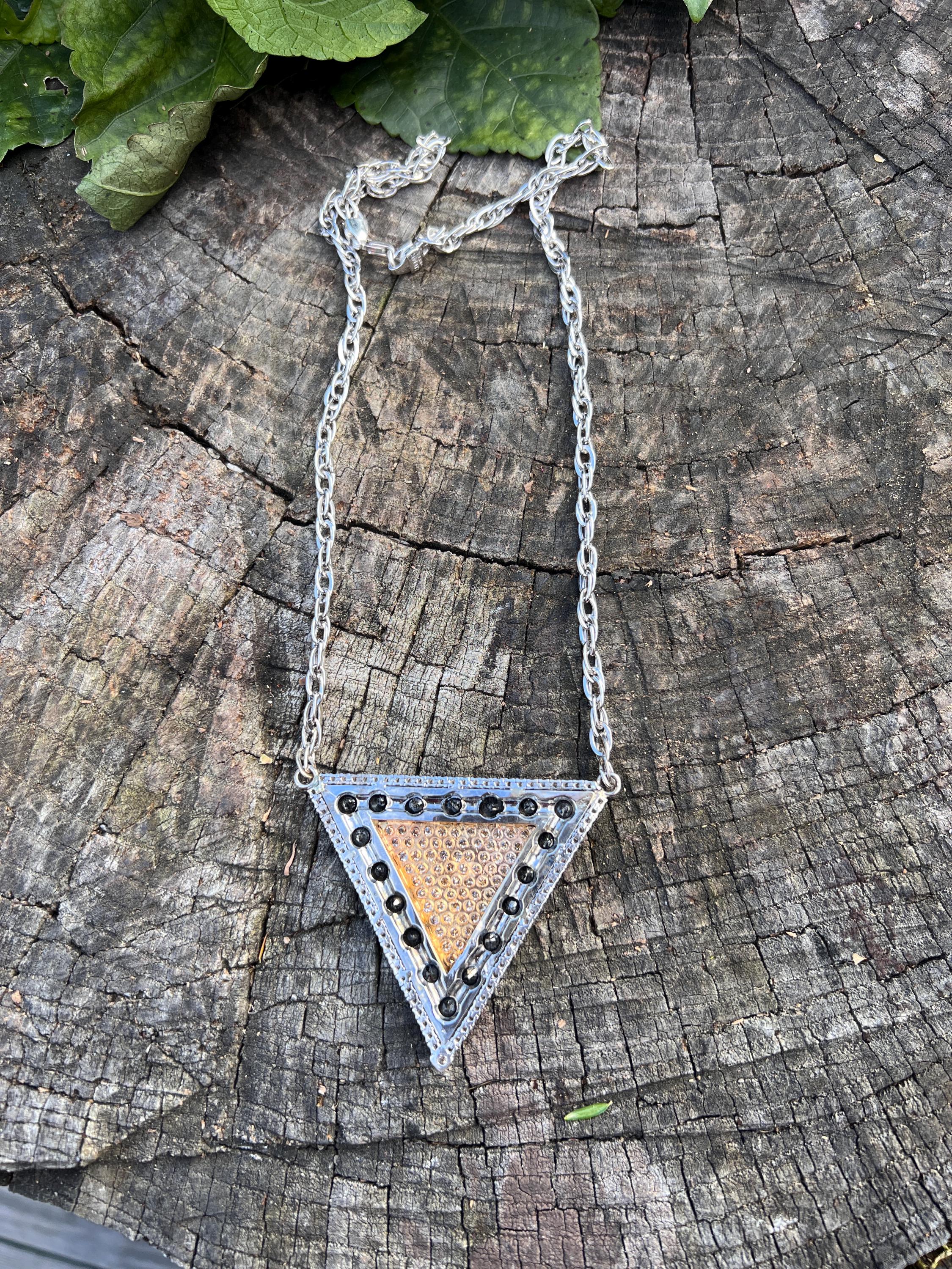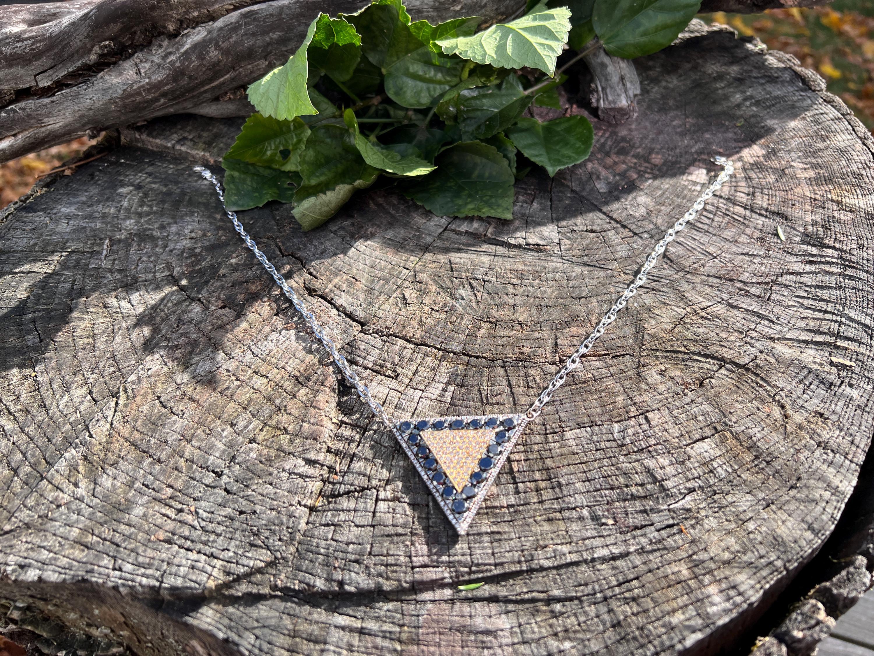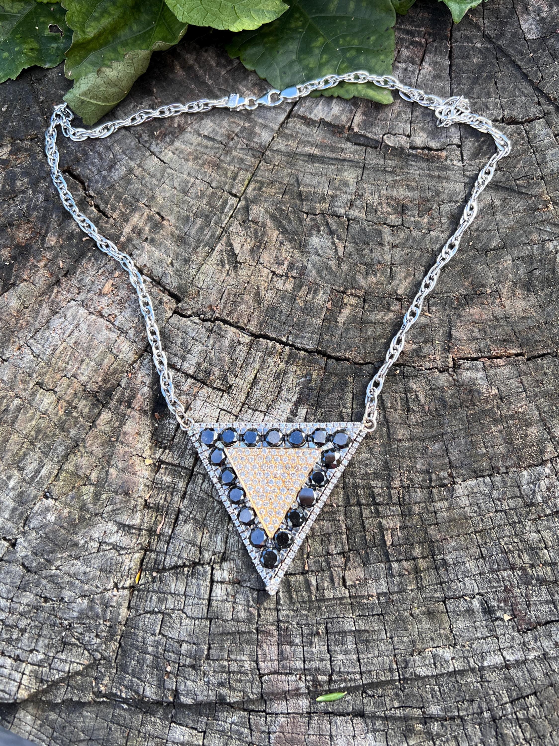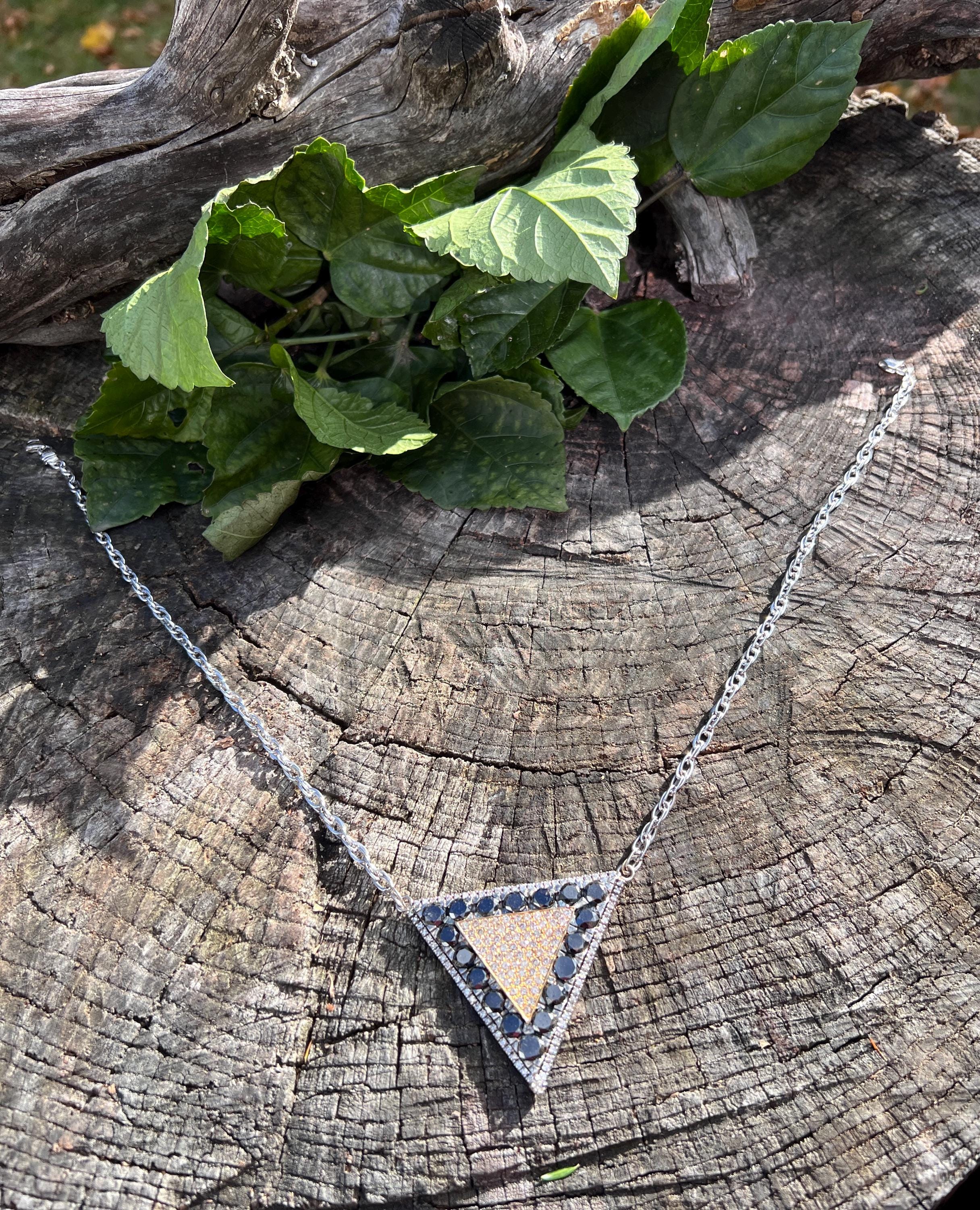 This spectacular vintage triangle black, white and champagne diamond pendant is a one of kind beauty. The pendant is set in 14k white gold. Opulently set in the center are a barrage of champagne colored diamond, secured by an orb of dazzling black diamonds and bordered with a coating of white round diamonds. Coming together to form this striking look making this an exquisitely unique piece. The white diamonds have a total weight of 1.87 ct. The diamonds are G/H in color and VS2/sI1 in clarity. The black diamonds have a total weight of 20.69 ct. The champagne diamonds have a total weight of 2.99 ct. The champagne diamonds are VS2/SI1 in clarity. All attached to a beautiful curb link chain. The lavish and luxurious pendant gives way to an unruffled energy . This is the ultimate pedant. The entire piece weighs 34.12 grams. The chain measures 17 1/2" long and 1/16" wide. The pendant measures 2" x 1 7/8". It is marked 14k. It comes with a certificate from the Gemological Appraisal Laboratory of America.