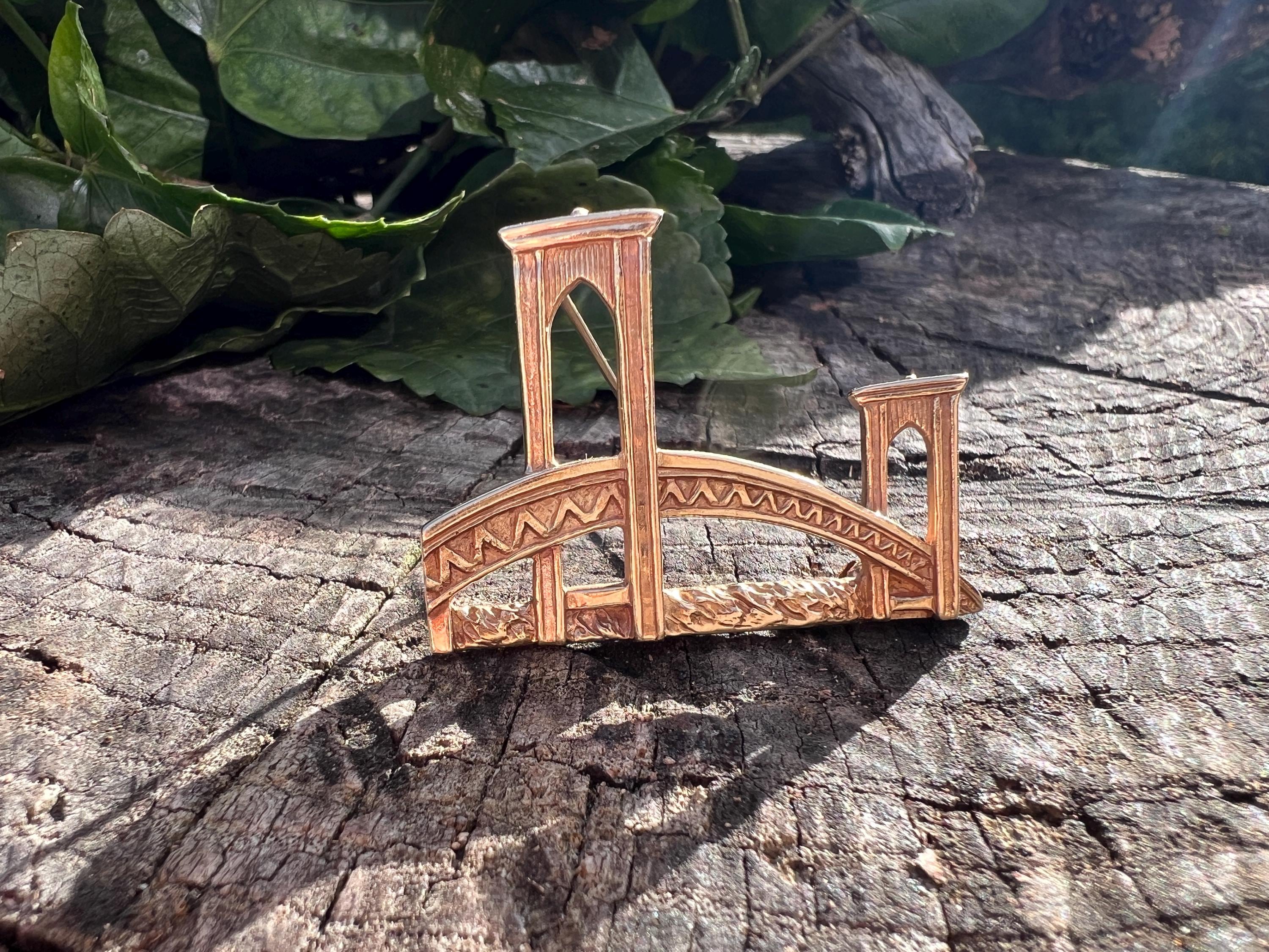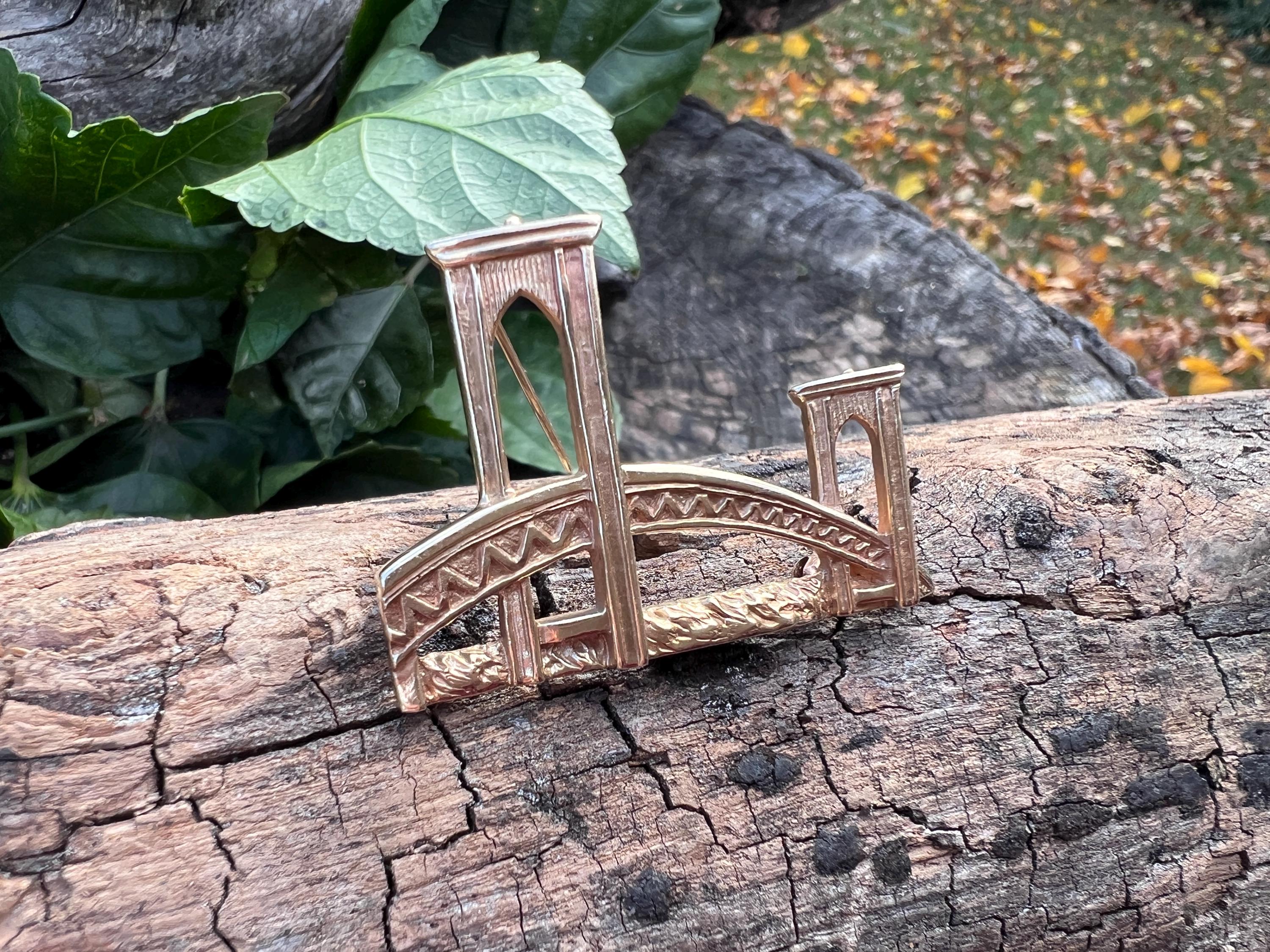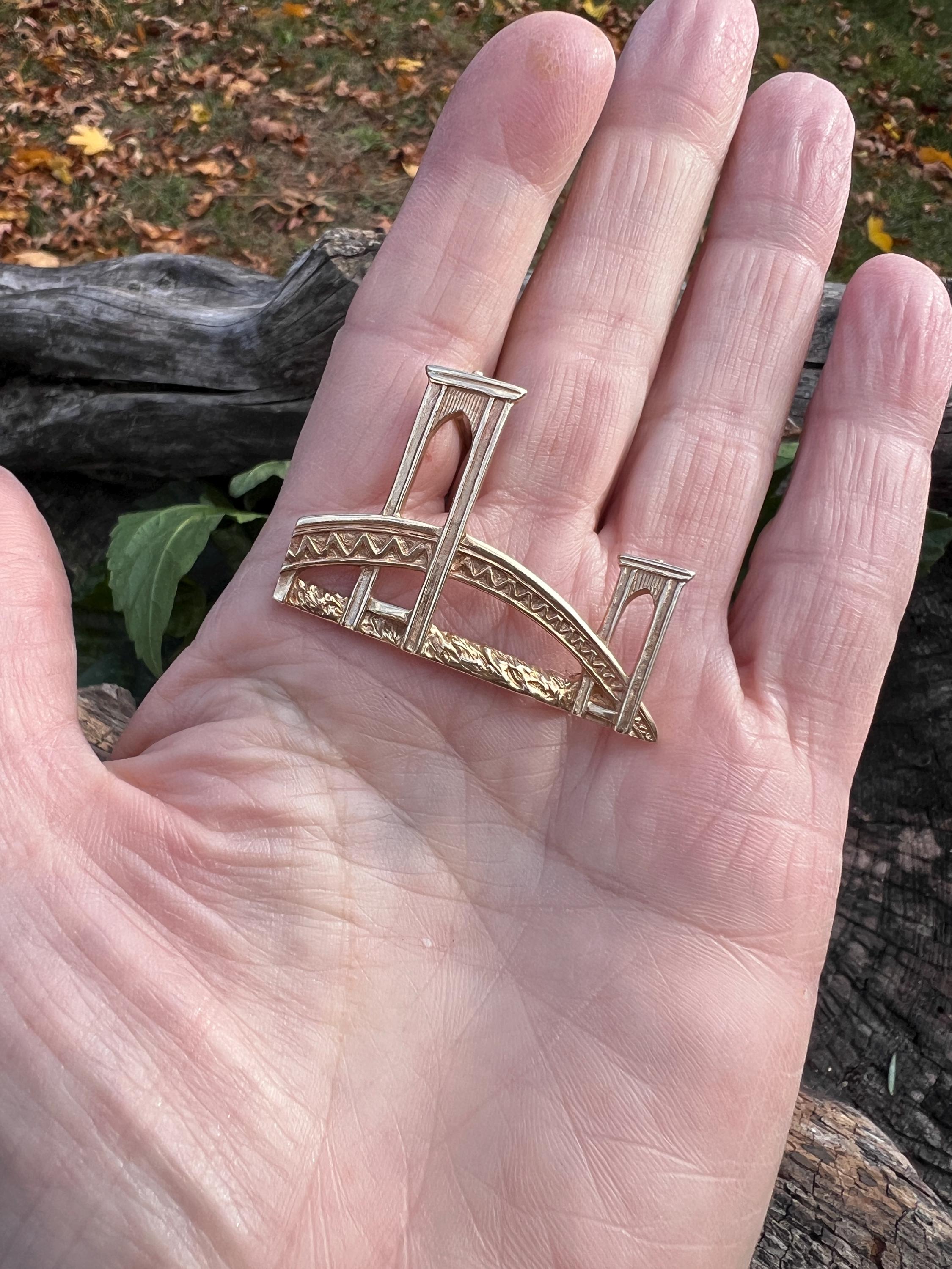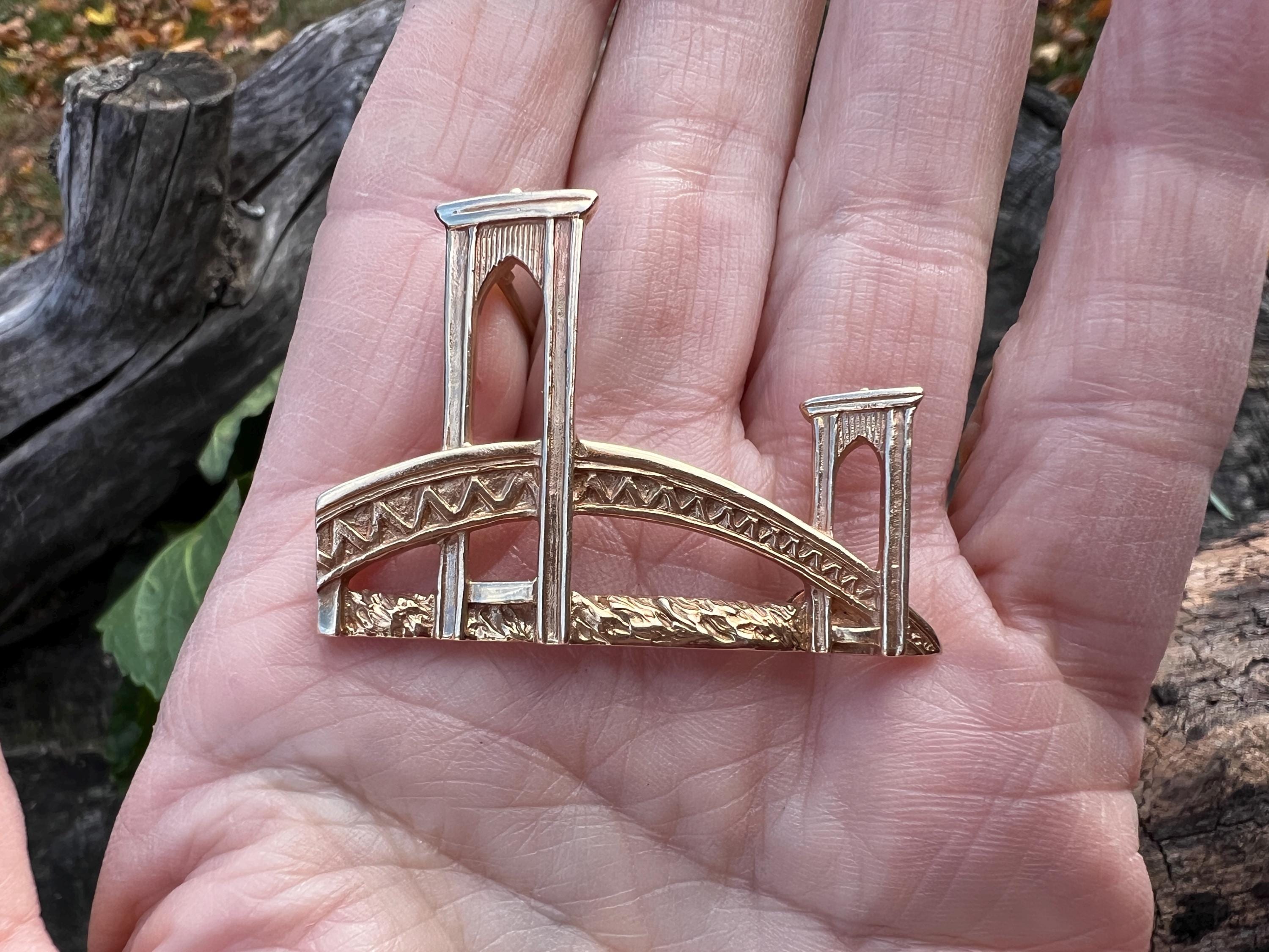 This fabulous replica of the Claiborne Pell Newport Bridge is made in 14k yellow gold. This mini version is amazing and the attention to detail incredible. The Claiborne Pell Bridge, commonly known as the Newport Bridge, is a suspension bridge that spans the East Passage of the Narragansett Bay in Rhode Island.. It connects the city of Newport on Aquidneck Island and the Town of Jamestown on Conanicut Island, and is named for Senator Claiborne Pell who lived in Newport. The piece weighs 15.07 grams. It measures 1 3/4" x 1 1/4" It is marked 14k and Breakell.