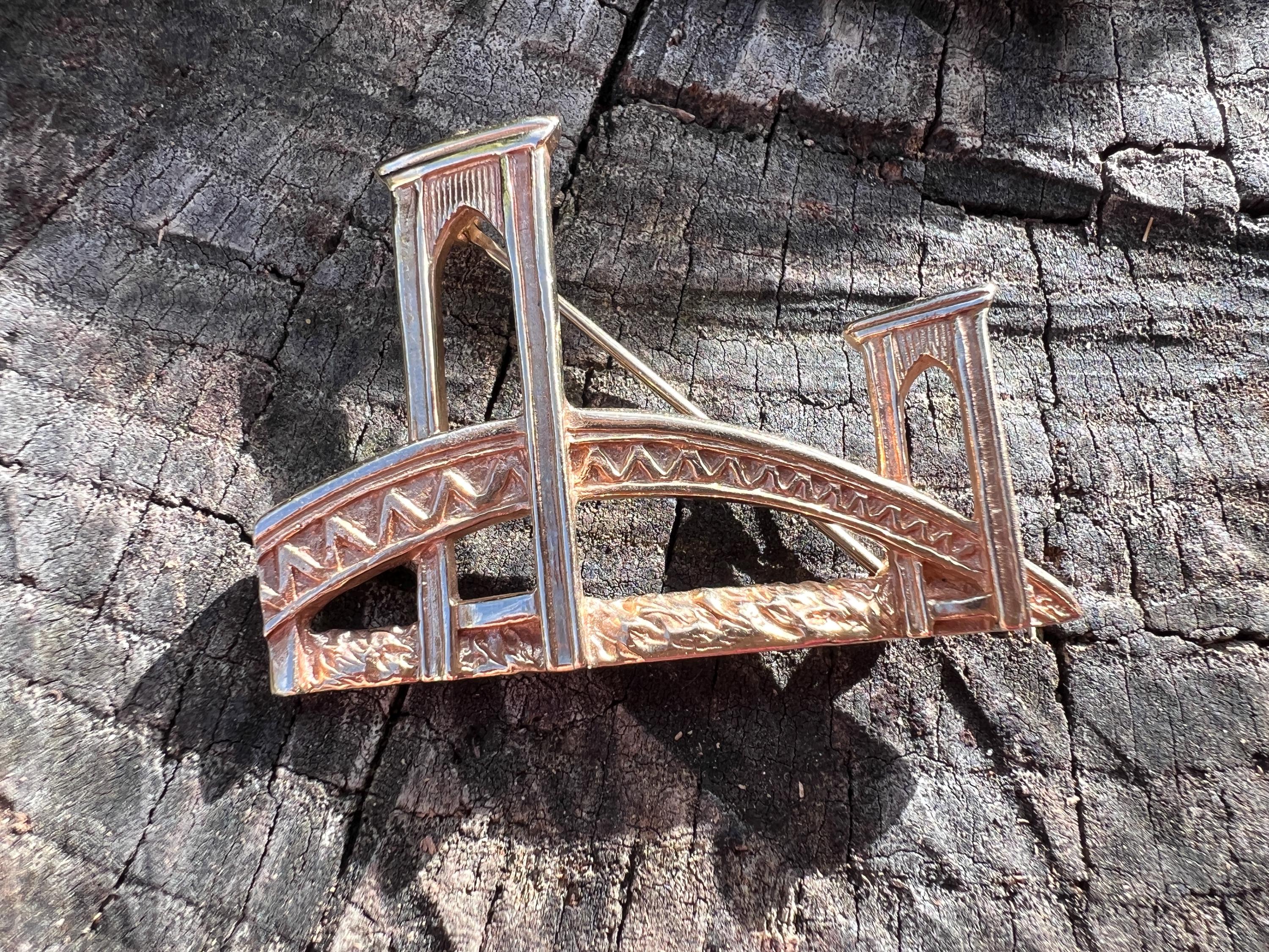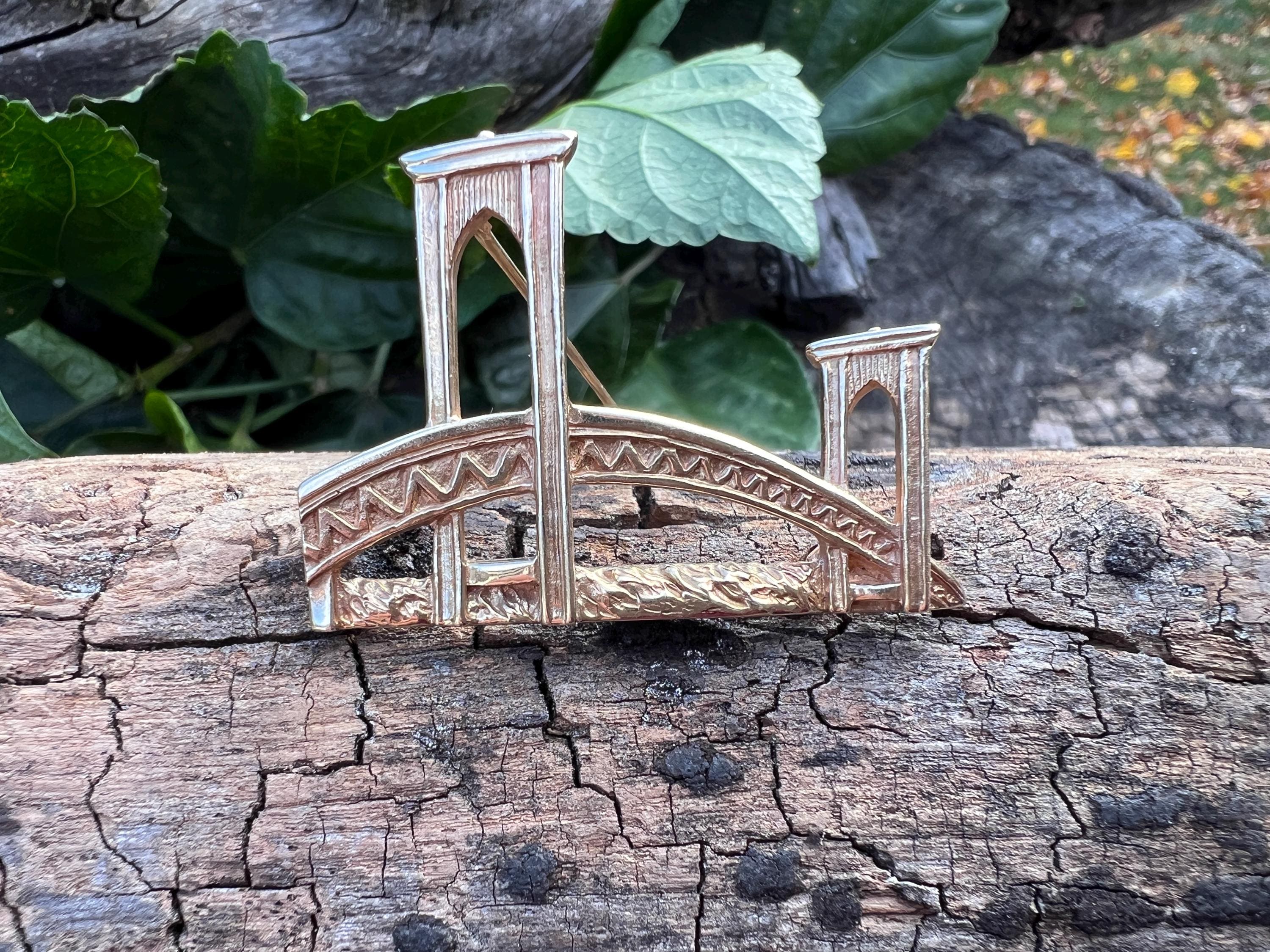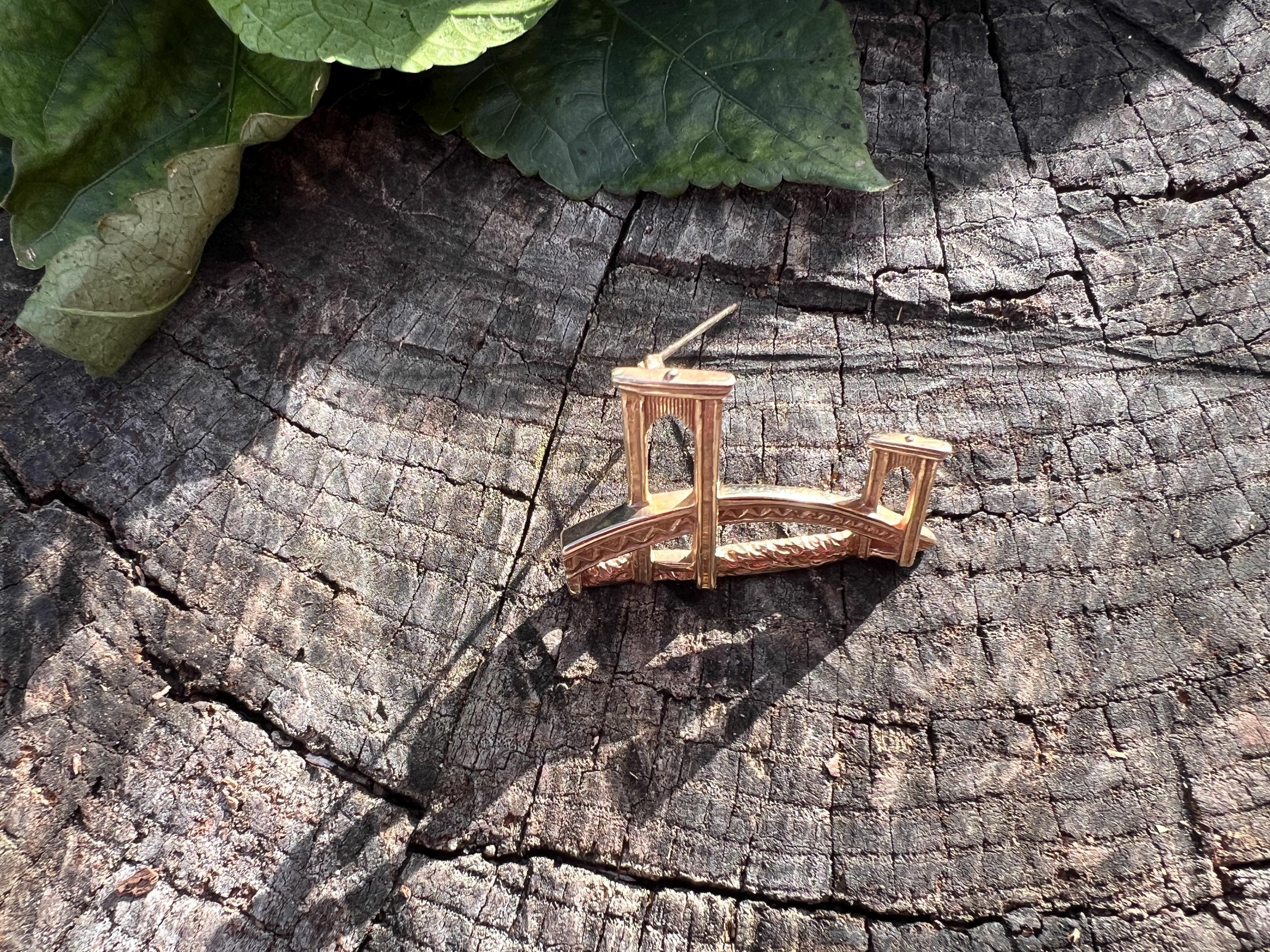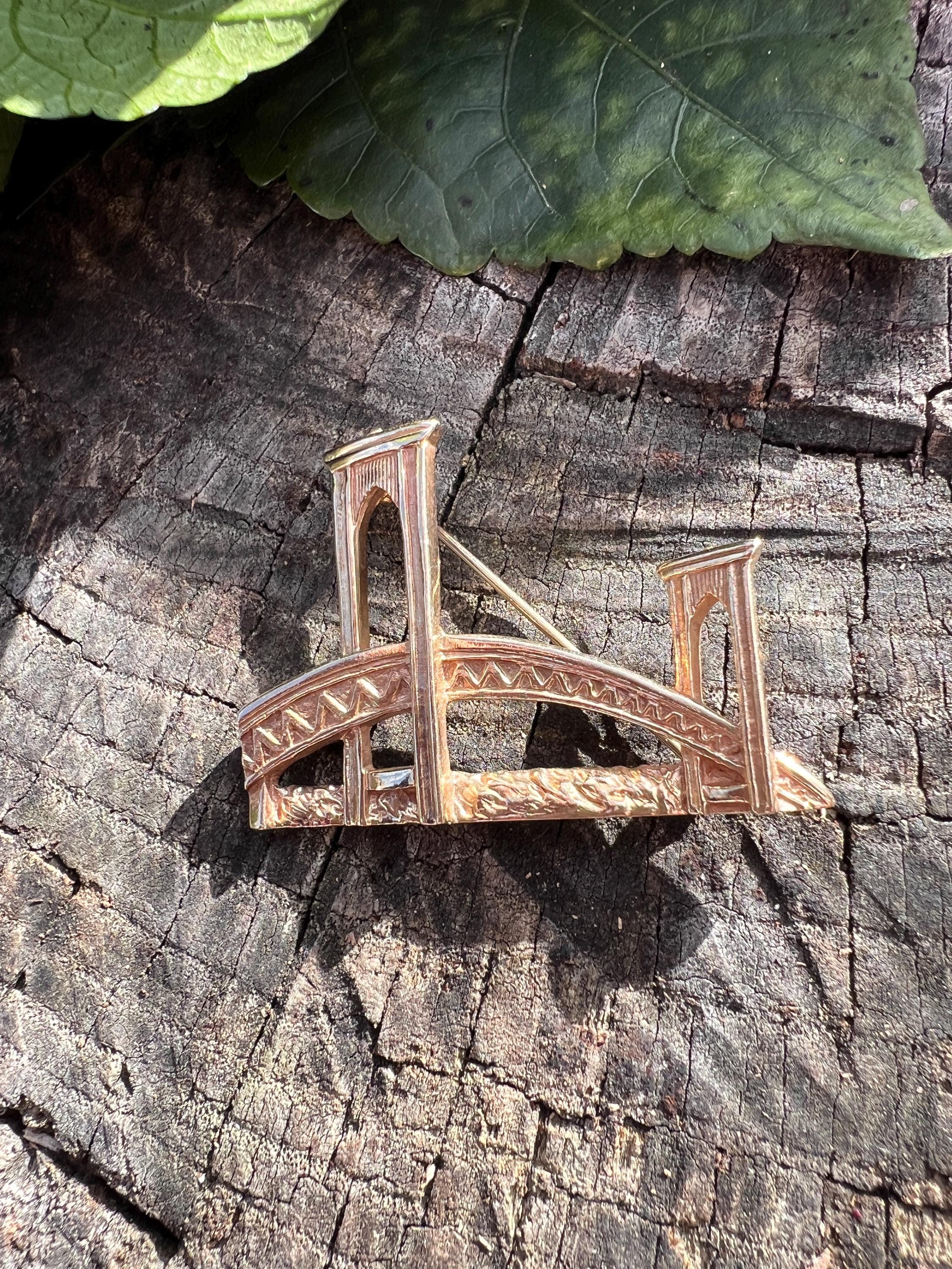 This fabulous replica of the Claiborne Pell Newport Bridge is made in 14k yellow gold. This mini version is amazing and the attention to detail incredible. The Claiborne Pell Bridge, commonly known as the Newport Bridge, is a suspension bridge that spans the East Passage of the Narragansett Bay in Rhode Island.. It connects the city of Newport on Aquidneck Island and the Town of Jamestown on Conanicut Island, and is named for Senator Claiborne Pell who lived in Newport. The piece weighs 15.07 grams. It measures 1 3/4" x 1 1/4" It is marked 14k and Breakell.