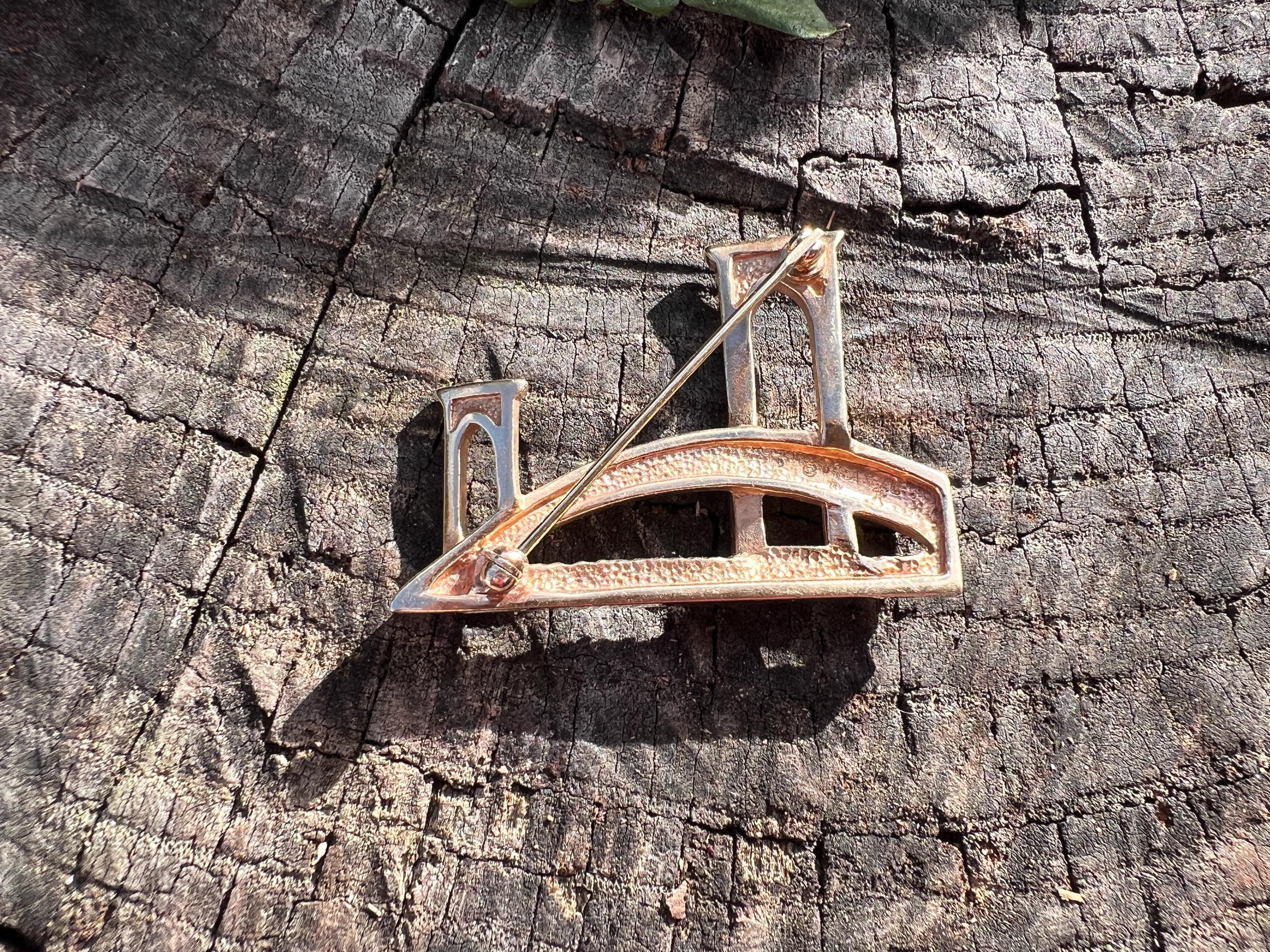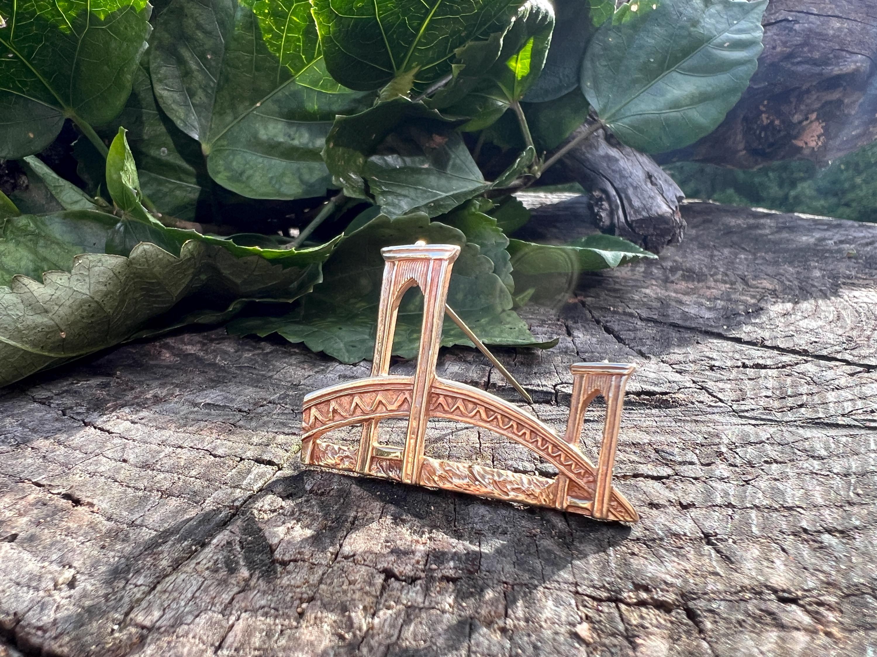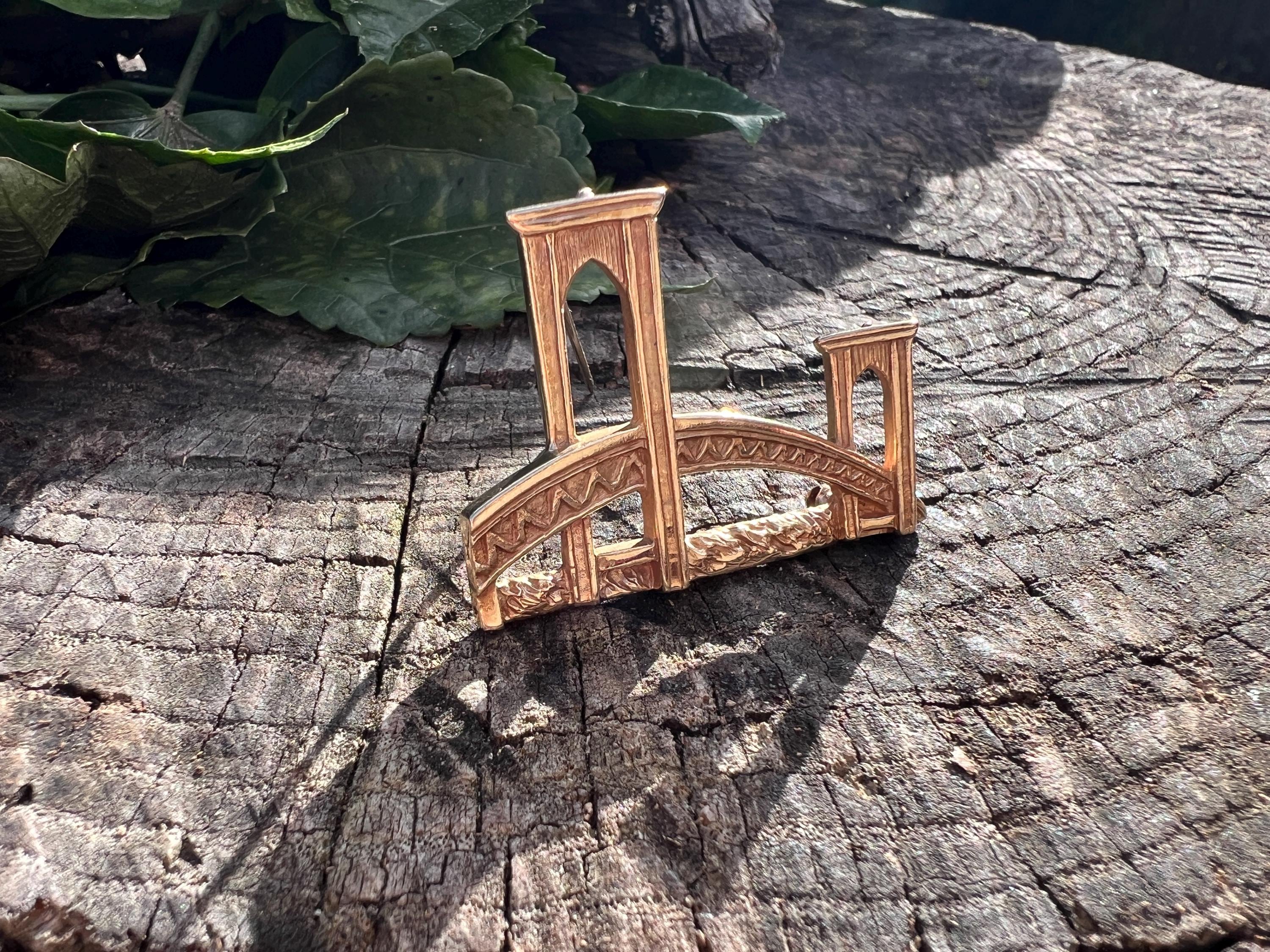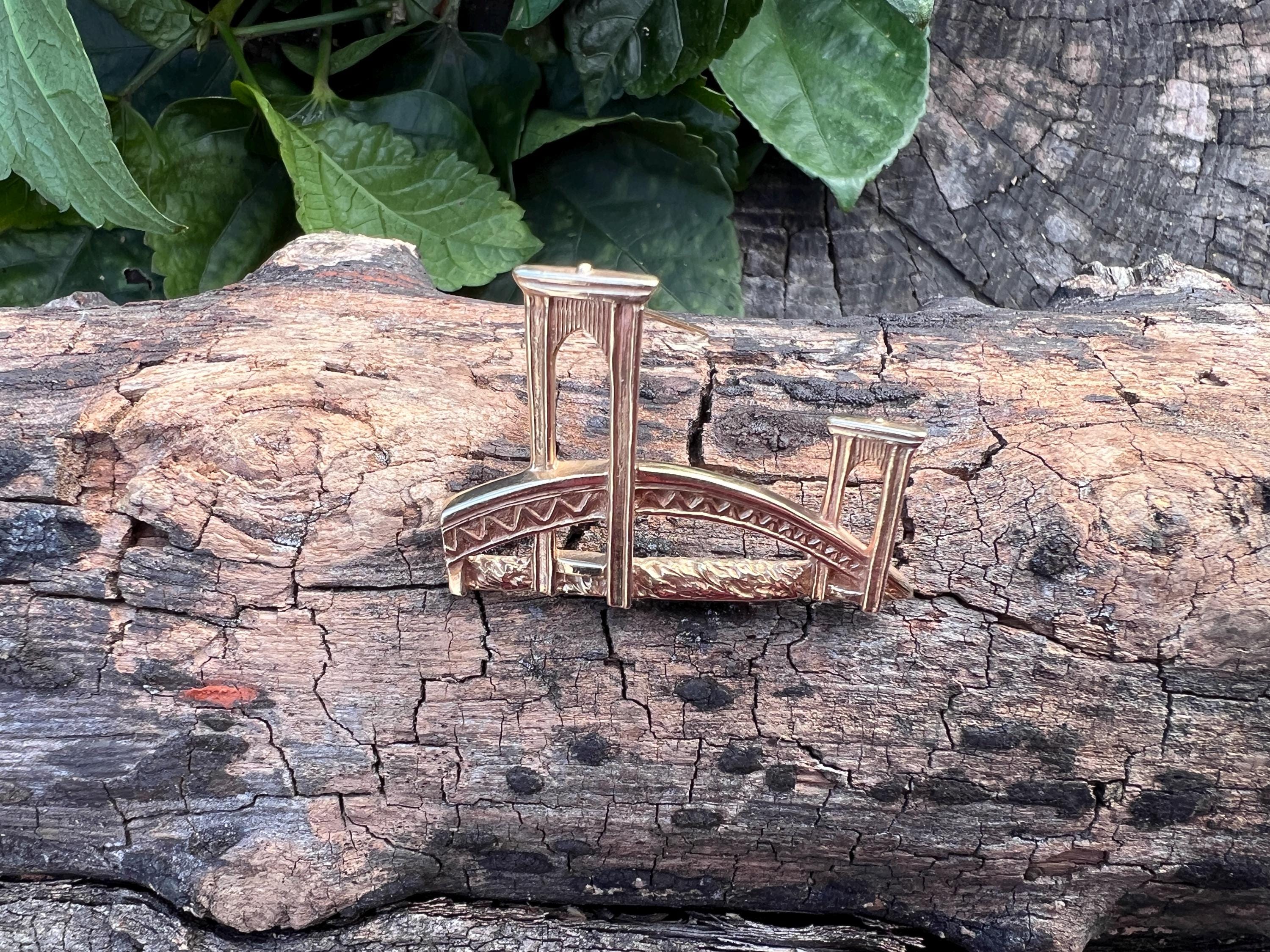 This fabulous replica of the Claiborne Pell Newport Bridge is made in 14k yellow gold. This mini version is amazing and the attention to detail incredible. The Claiborne Pell Bridge, commonly known as the Newport Bridge, is a suspension bridge that spans the East Passage of the Narragansett Bay in Rhode Island.. It connects the city of Newport on Aquidneck Island and the Town of Jamestown on Conanicut Island, and is named for Senator Claiborne Pell who lived in Newport. The piece weighs 15.07 grams. It measures 1 3/4" x 1 1/4" It is marked 14k and Breakell.