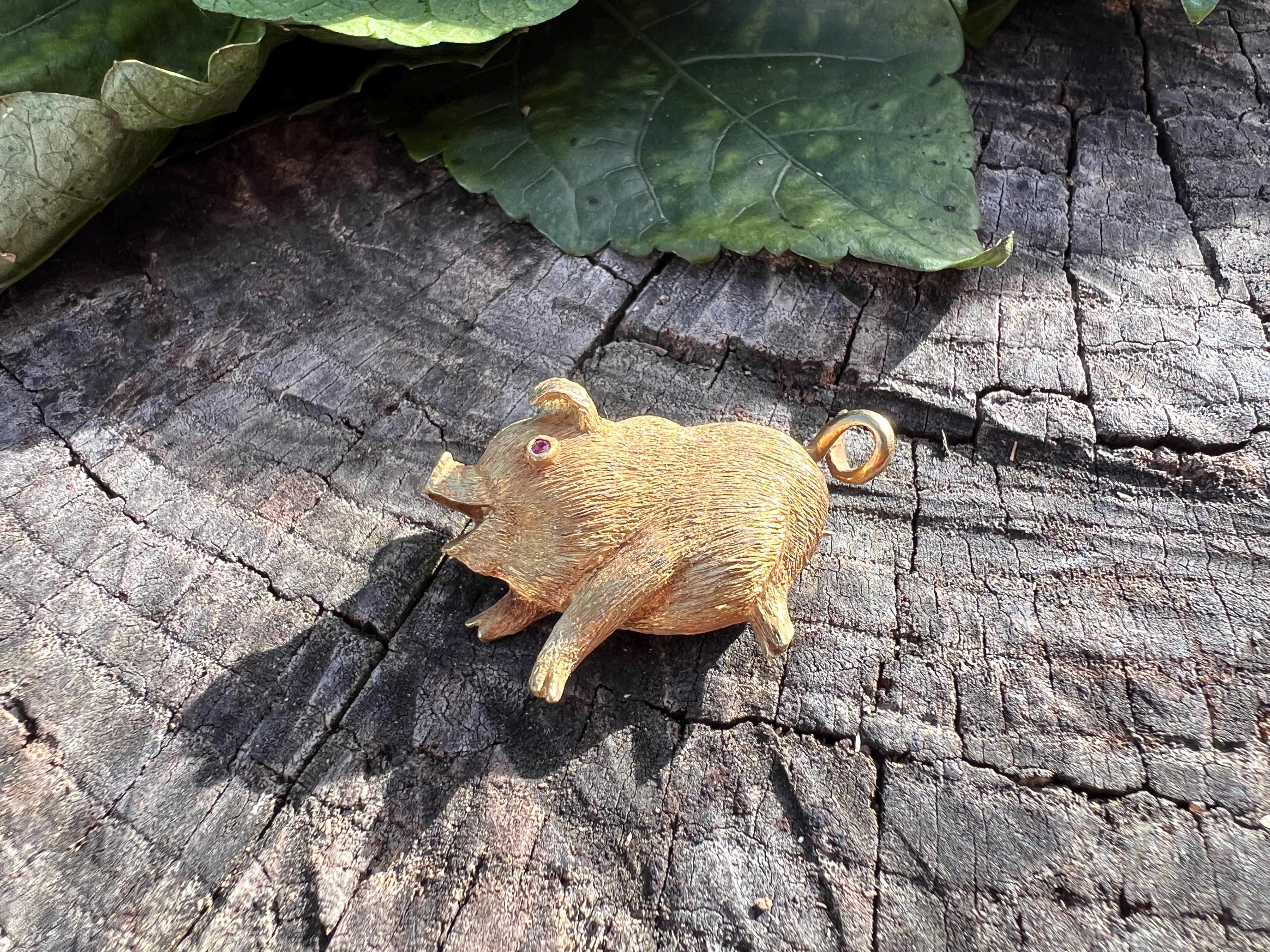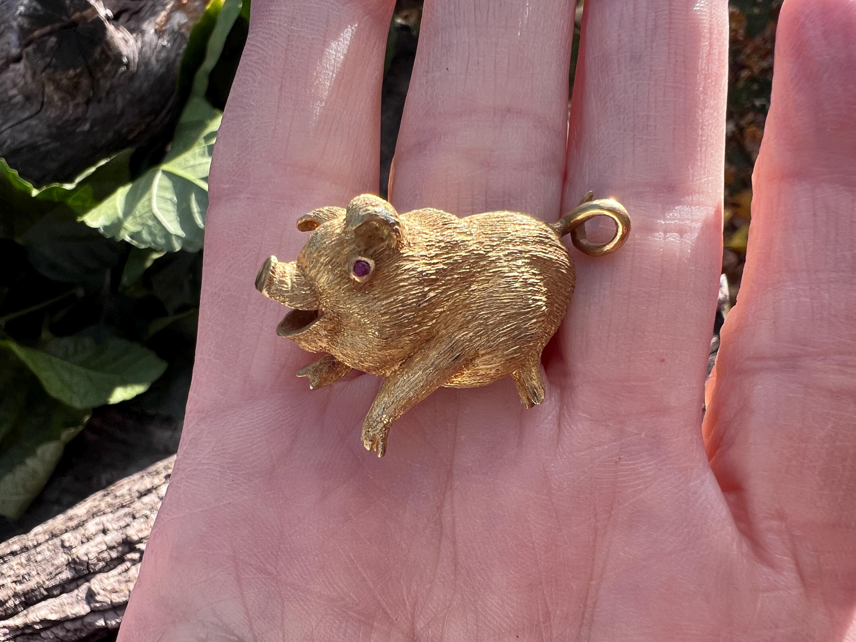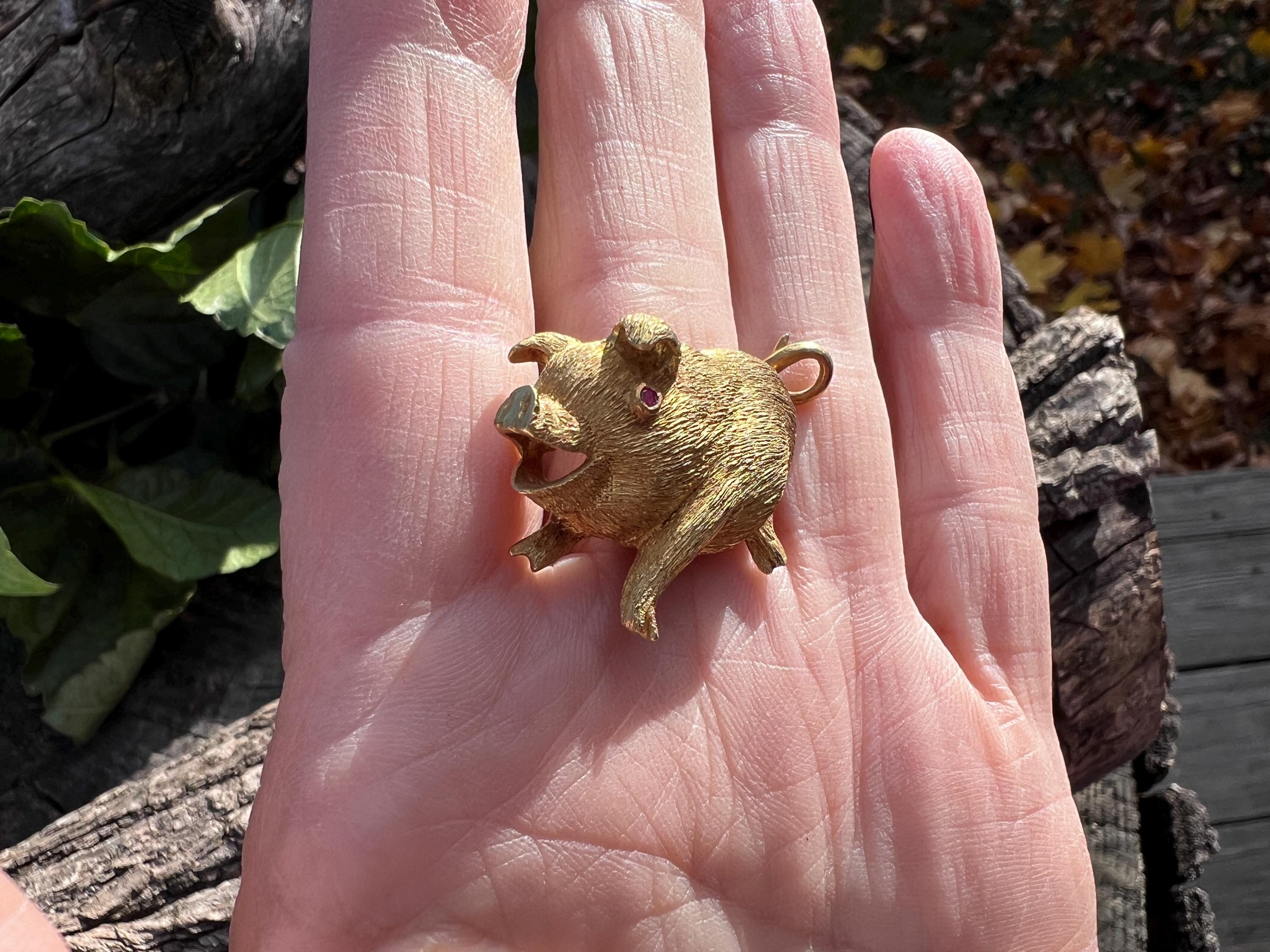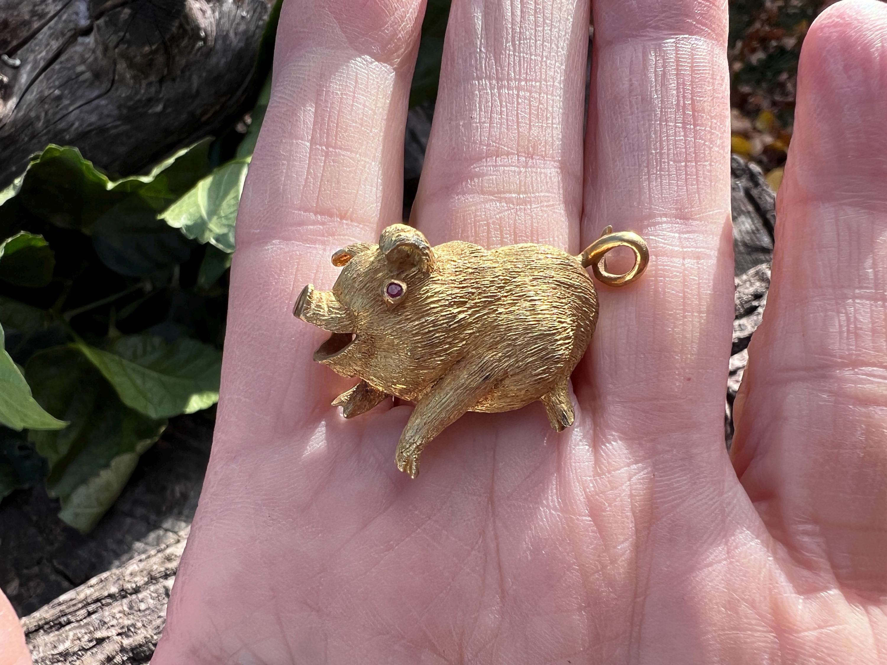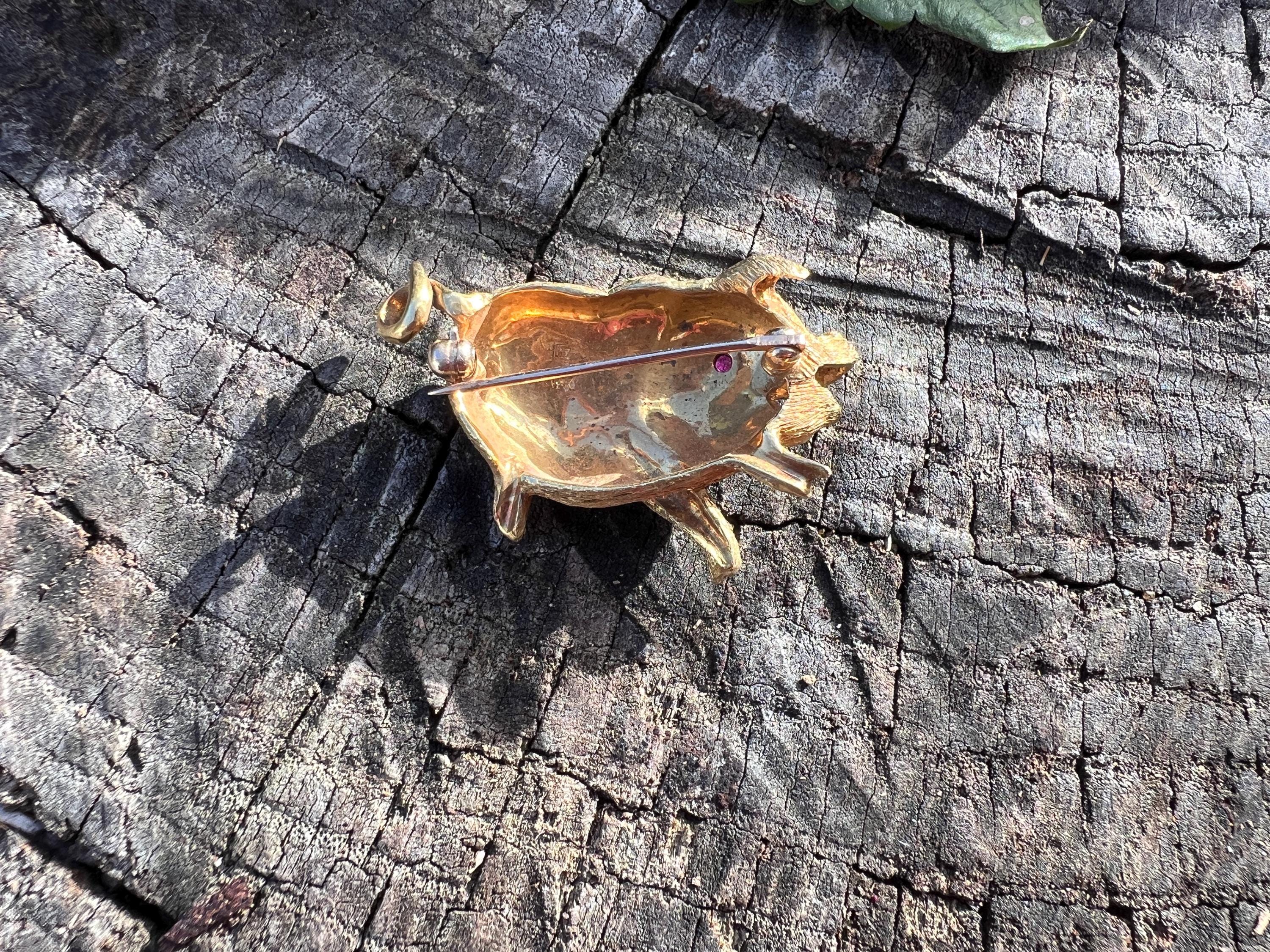 Happy as a pig in a poke! You can be with this! This 18k yellow gold pig brooch is nothing short of enchanting. It dates from the 1980's. In its whimsical form, this spectacular pig has his body coated in a textured gold. The adorable babe's attention to detail is intricate. Magically charming. The pin weighs 13.51 grams. It measures 1 3/8" x 7/8". It is marked 18k.