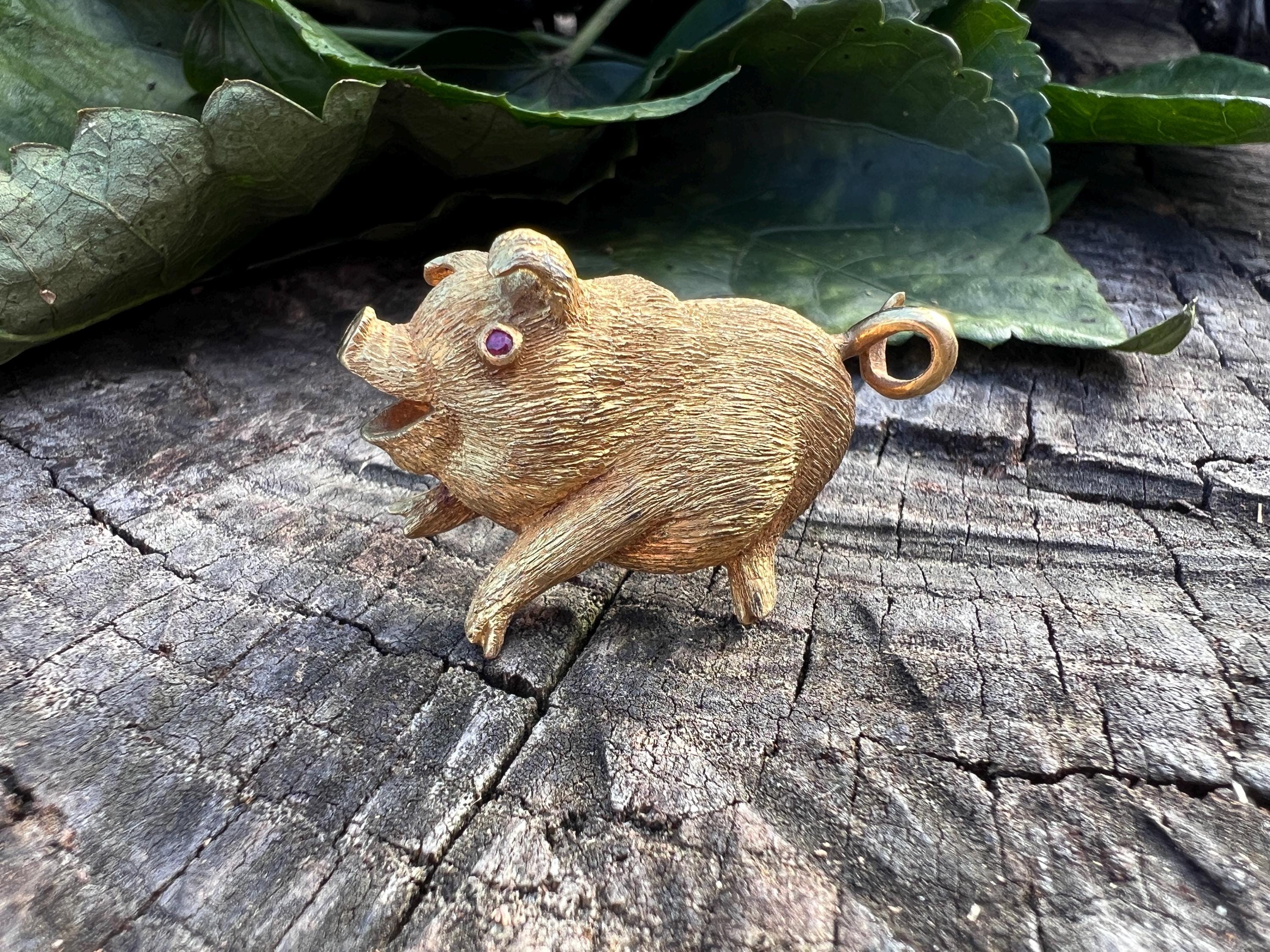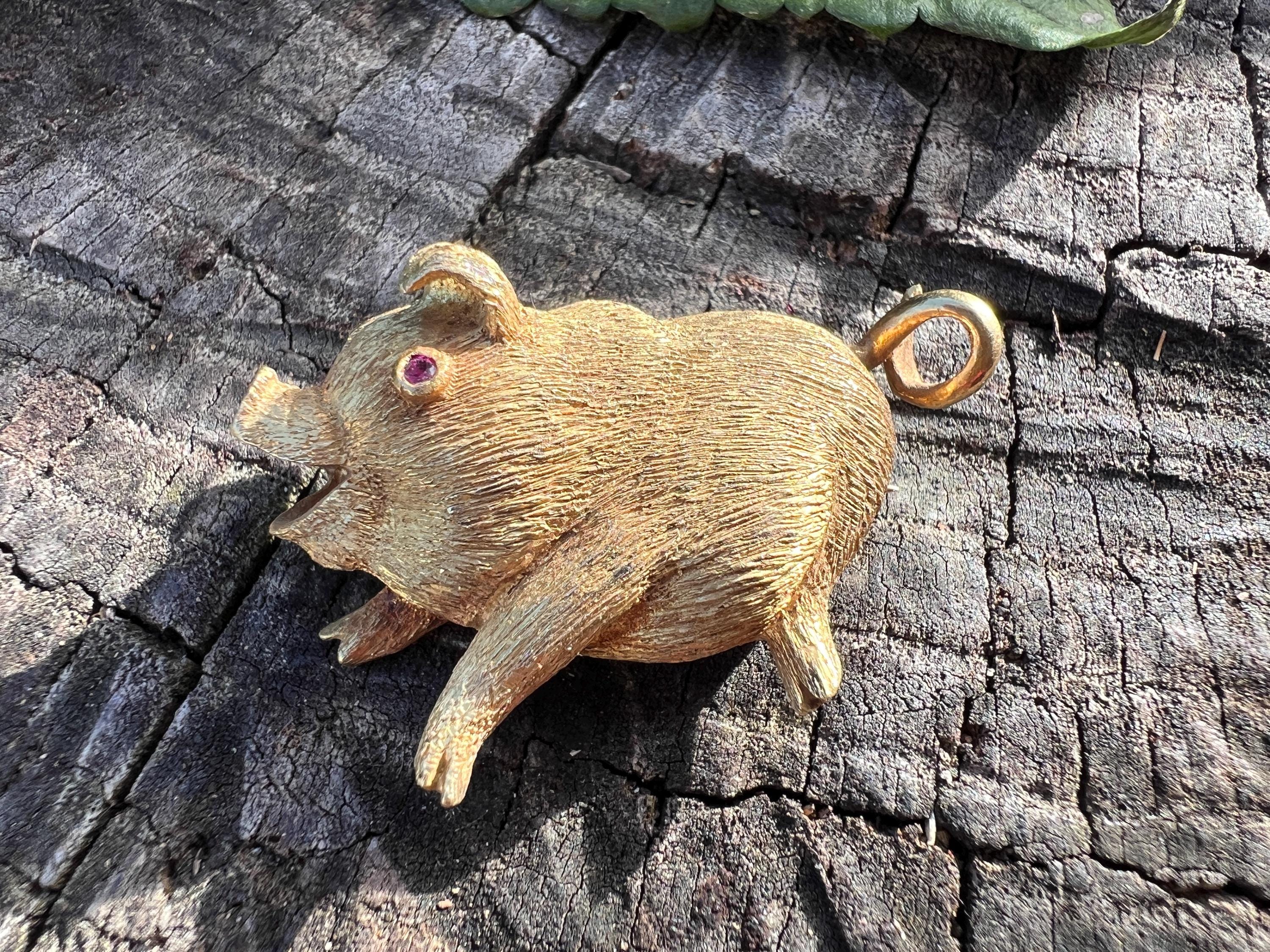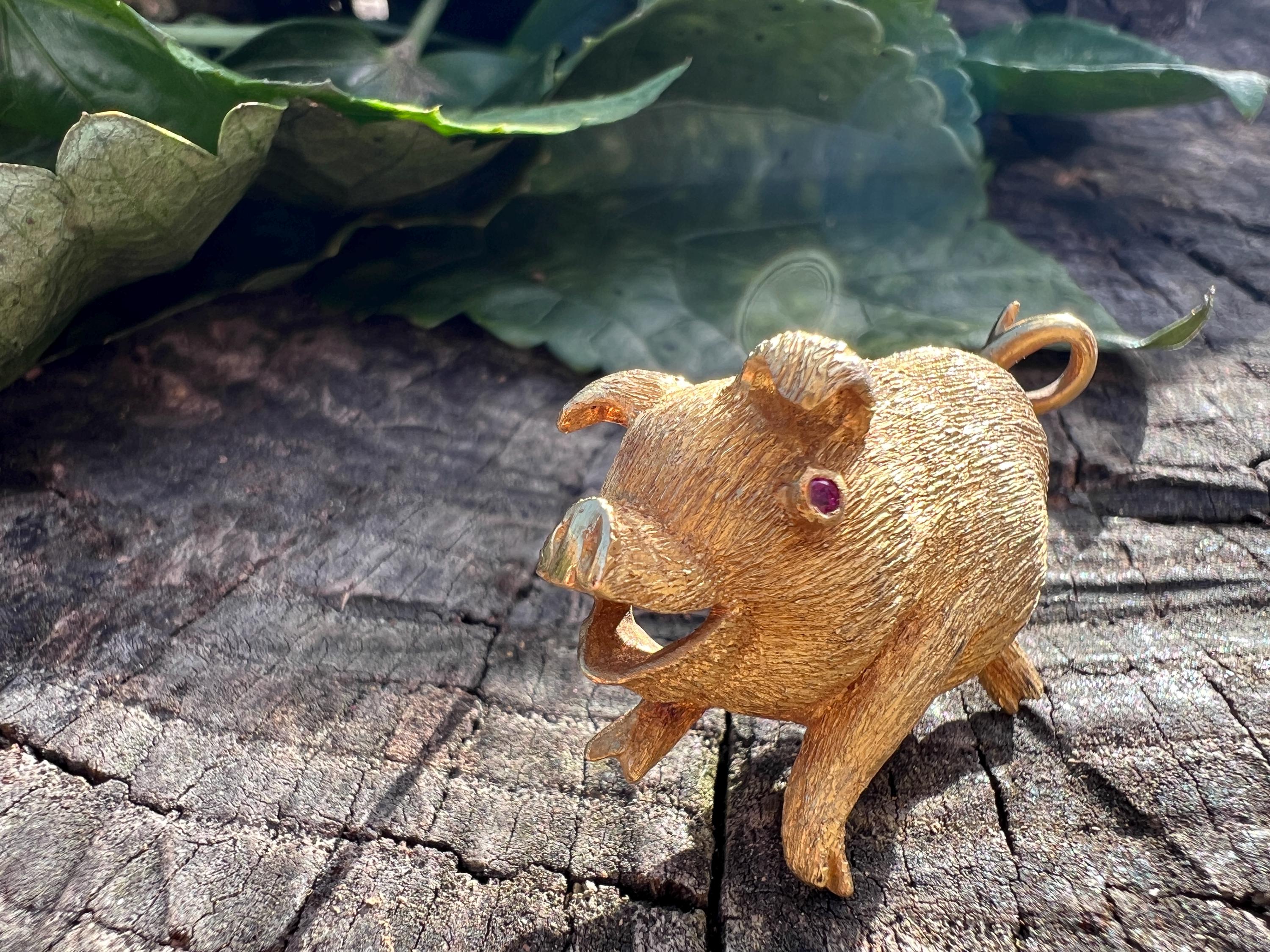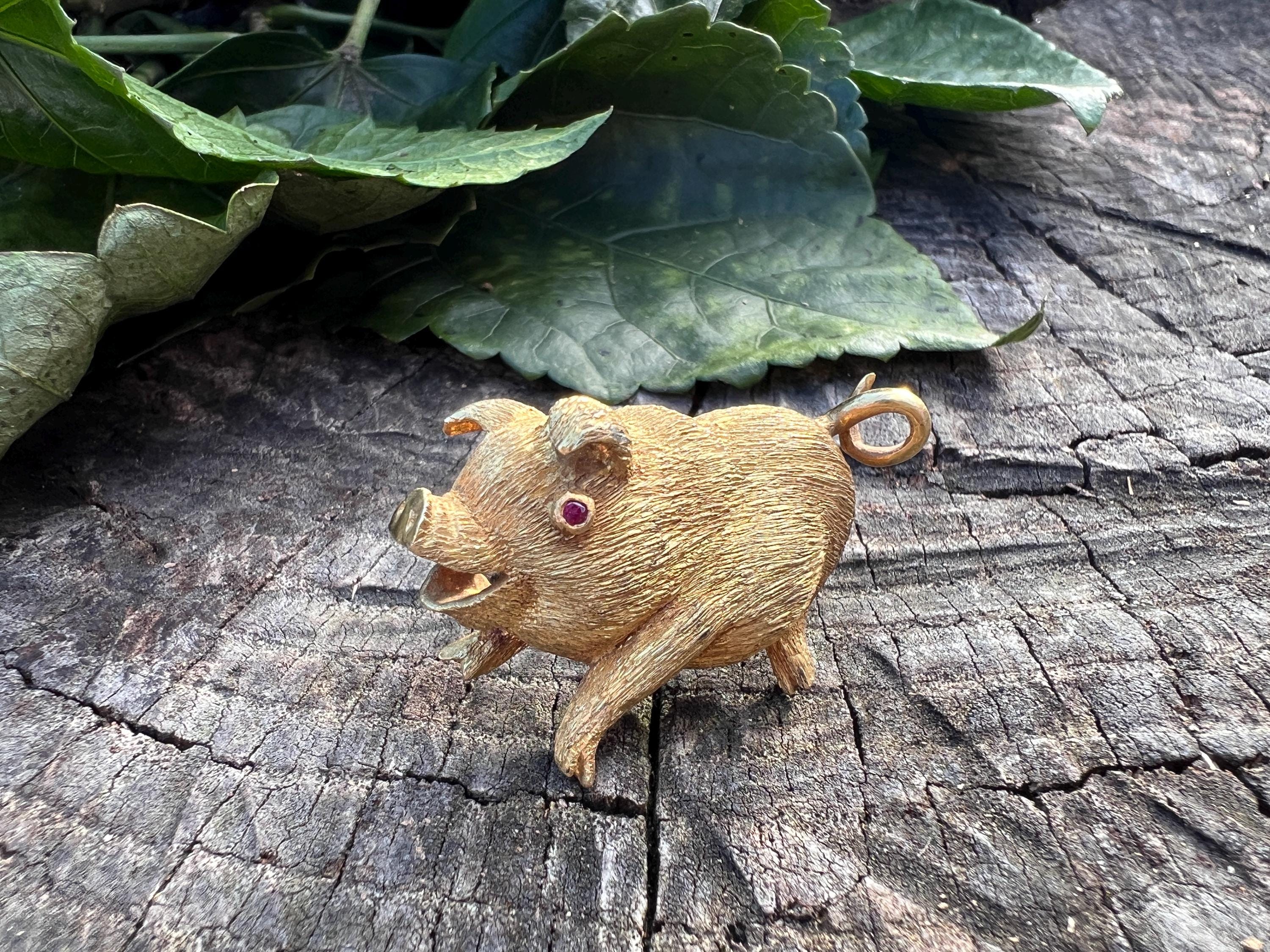 Happy as a pig in a poke! You can be with this! This 18k yellow gold pig brooch is nothing short of enchanting. It dates from the 1980's. In its whimsical form, this spectacular pig has his body coated in a textured gold. The adorable babe's attention to detail is intricate. Magically charming. The pin weighs 13.51 grams. It measures 1 3/8" x 7/8". It is marked 18k.