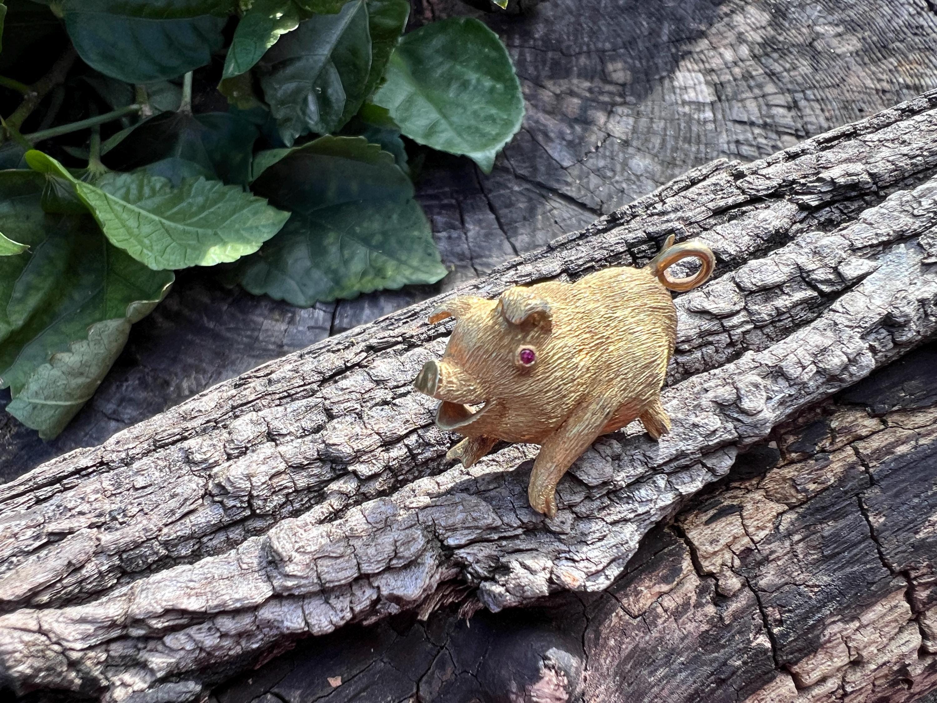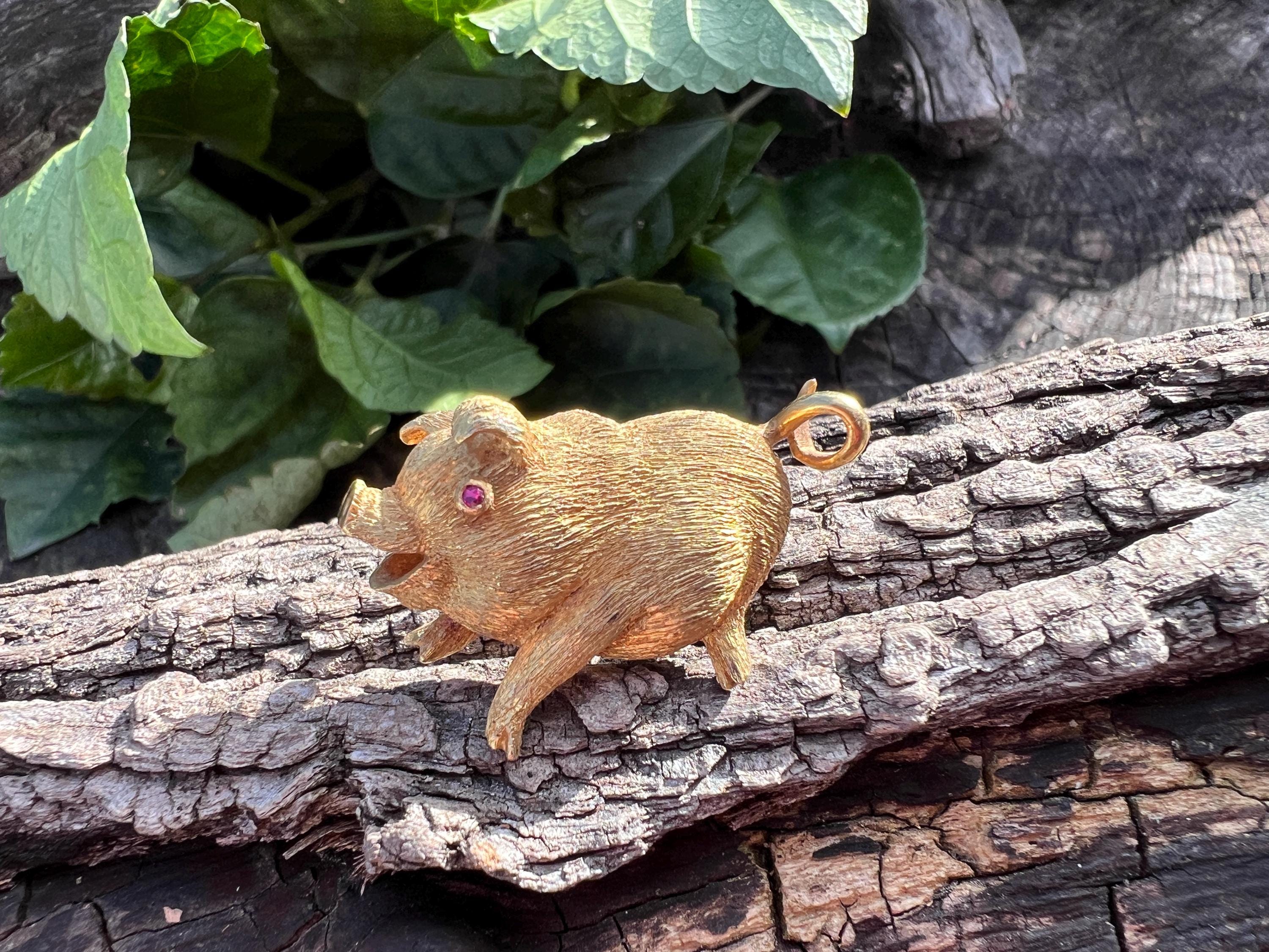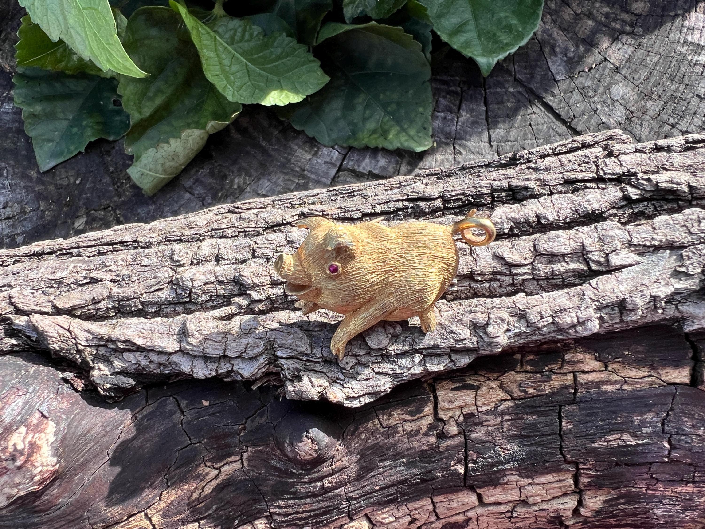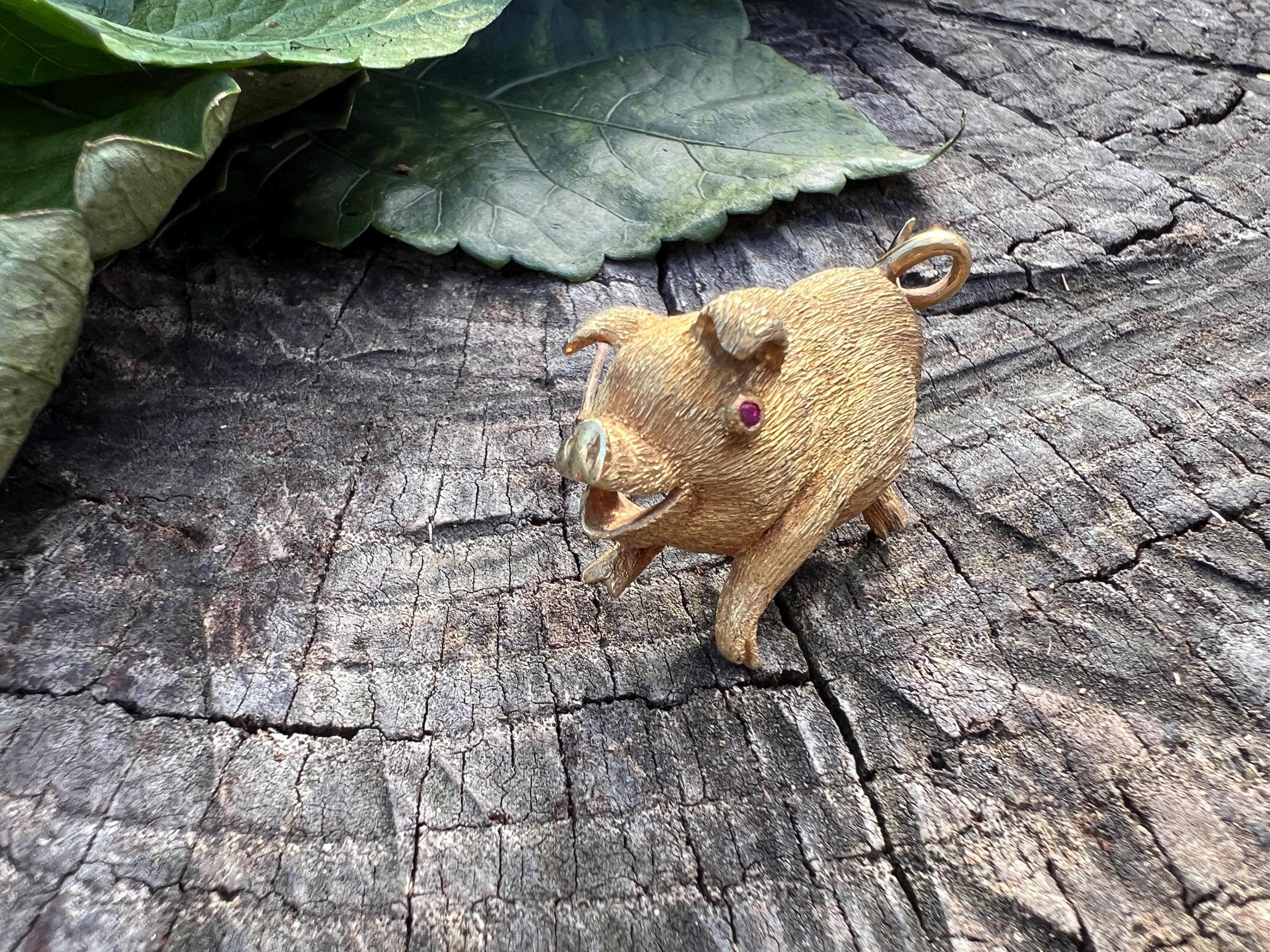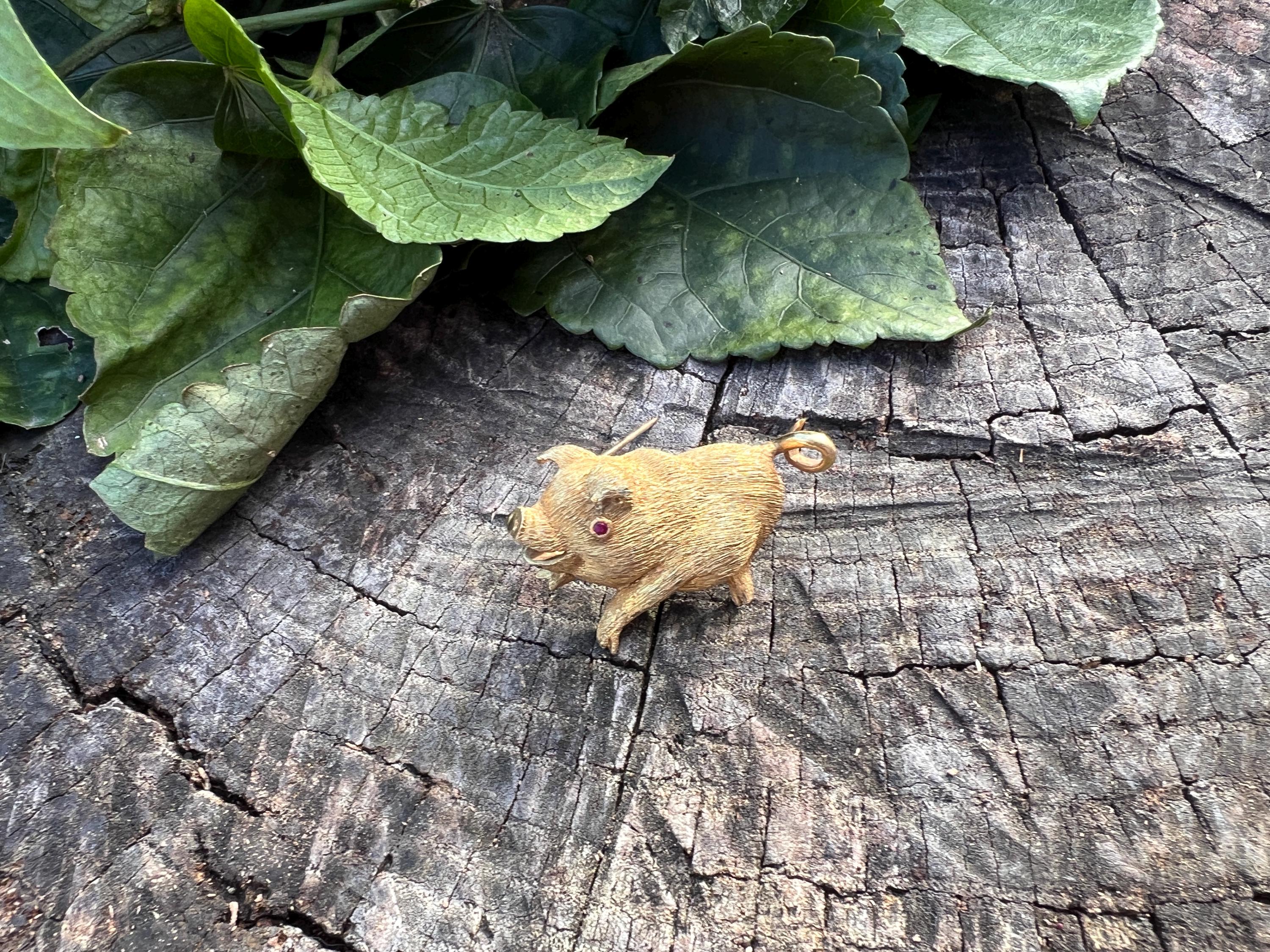Happy as a pig in a poke! You can be with this! This 18k yellow gold pig brooch is nothing short of enchanting. It dates from the 1980's. In its whimsical form, this spectacular pig has his body coated in a textured gold. The adorable babe's attention to detail is intricate. Magically charming. The pin weighs 13.51 grams. It measures 1 3/8" x 7/8". It is marked 18k.