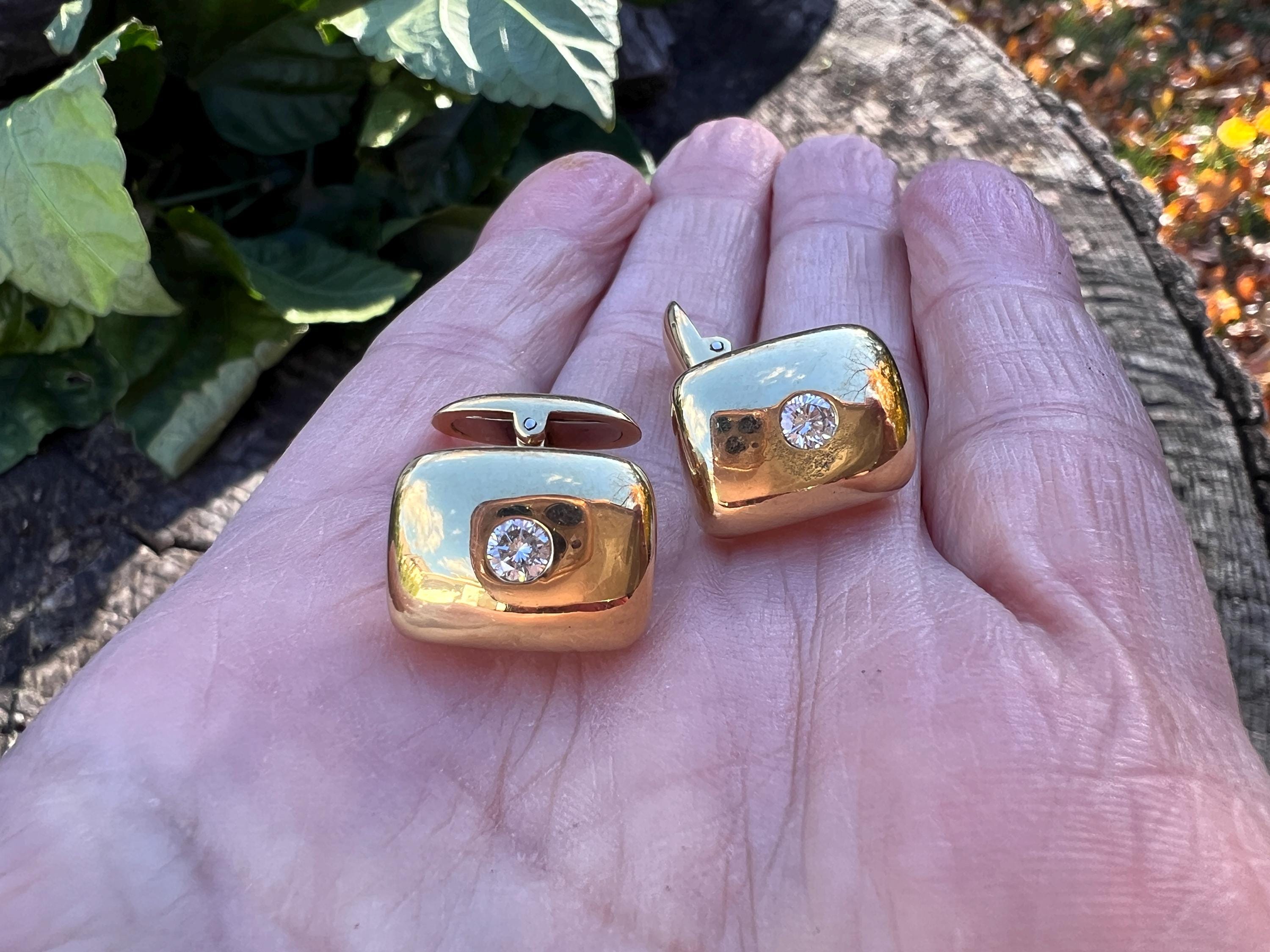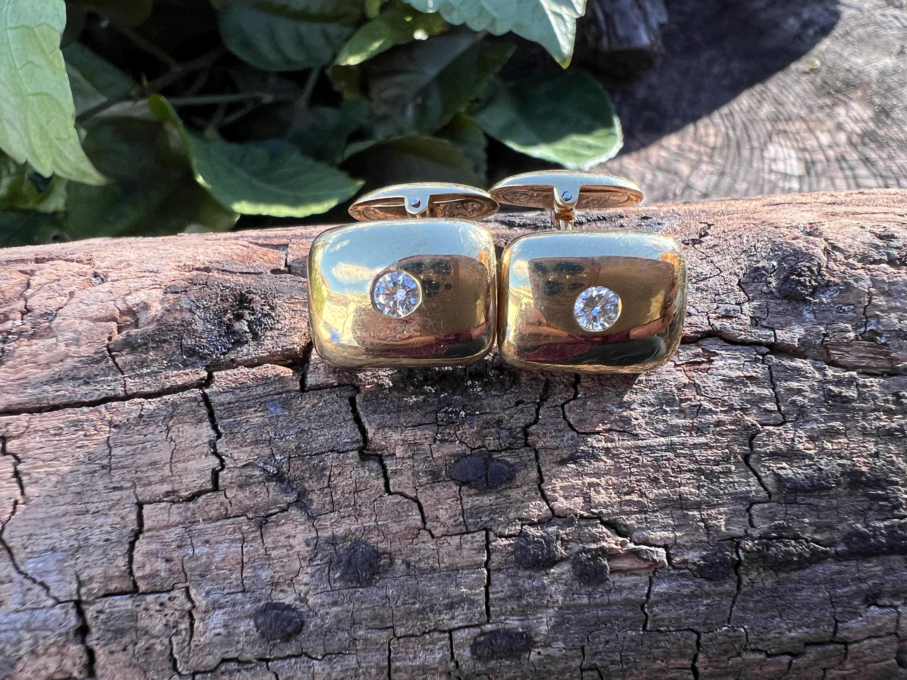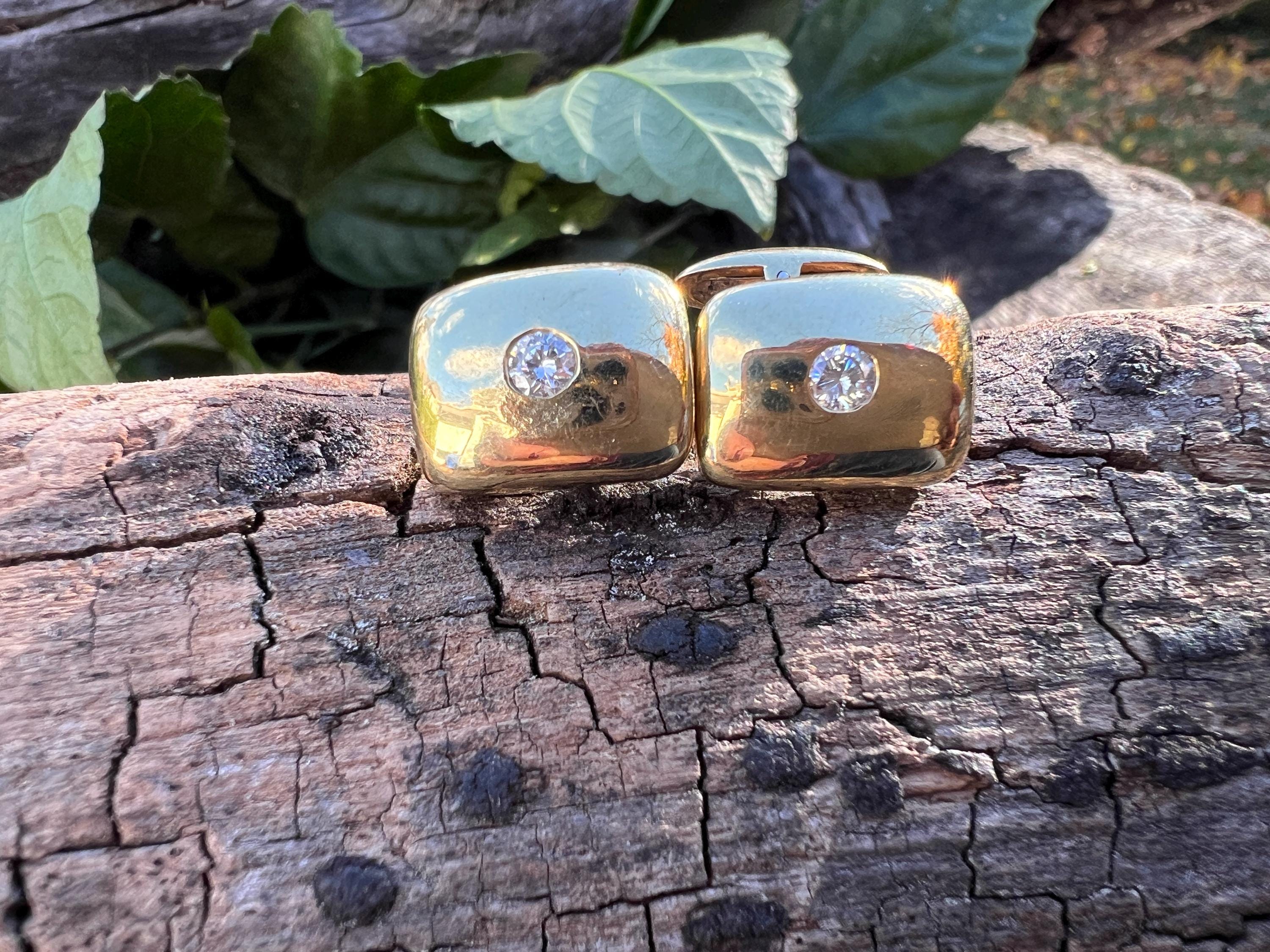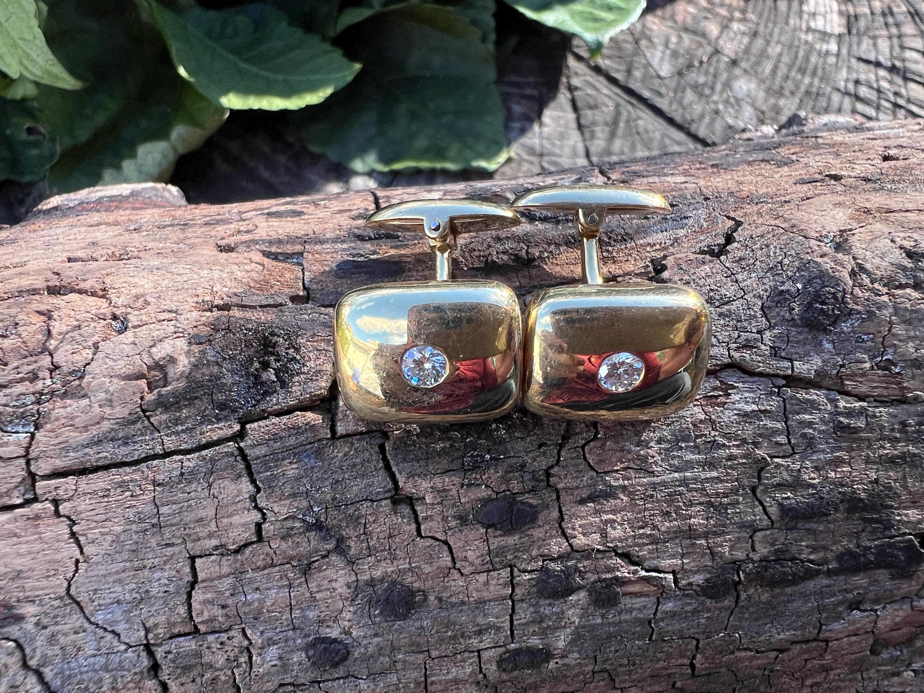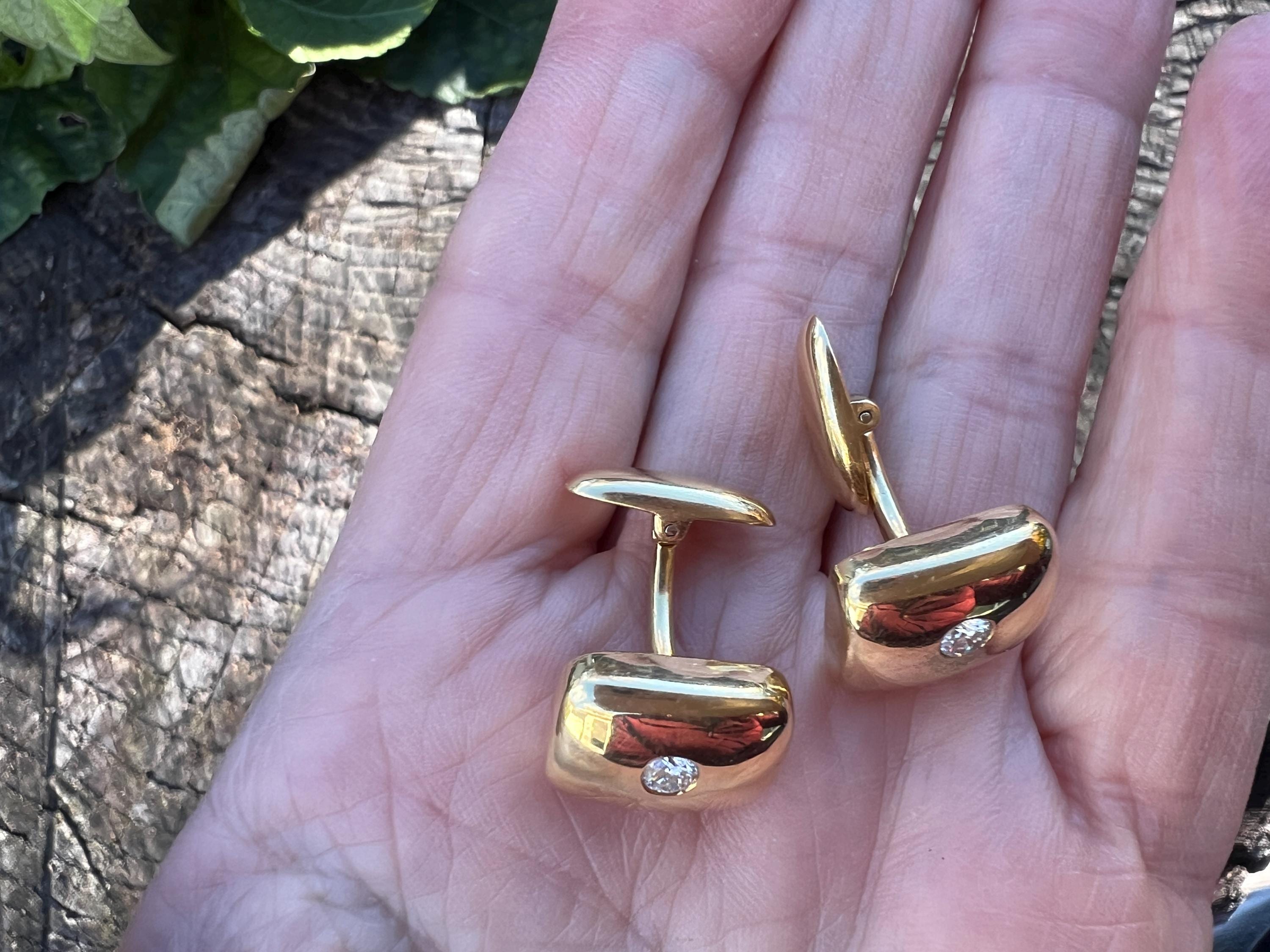 This strong vintage cuff link is set in 18k yellow gold. Impactful and elegant the rectangular shaped curved cuff links are stunning solid polished gold. There is a round diamond bezel set in the center of each cuff link. The diamonds have a total approx. weight of .30 ct. They are G in color and VS2 in clarity. The cuff links are marked Antora and 750. The cuff links weigh 14.10 grams. They measure 5/8” x 7/16”
