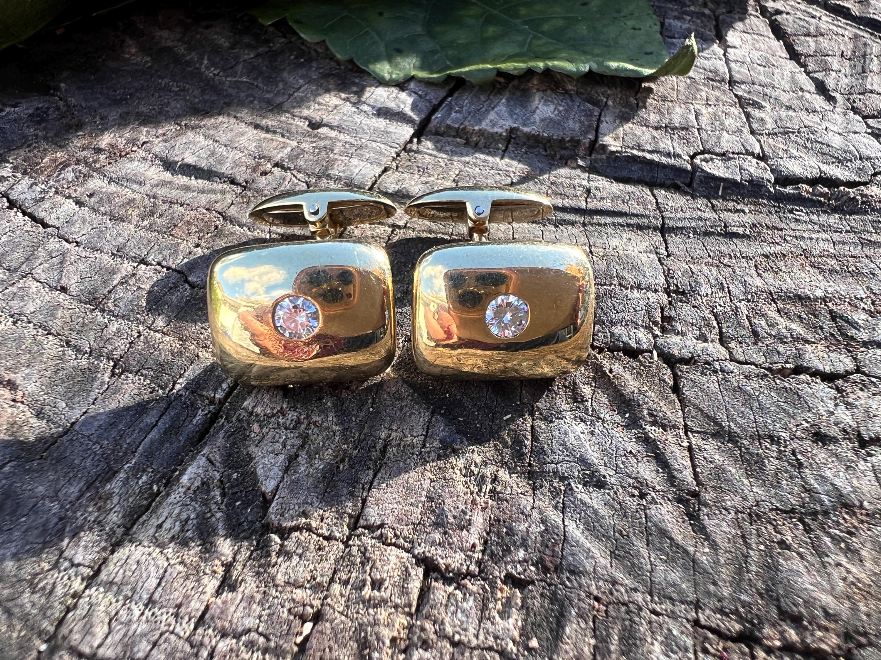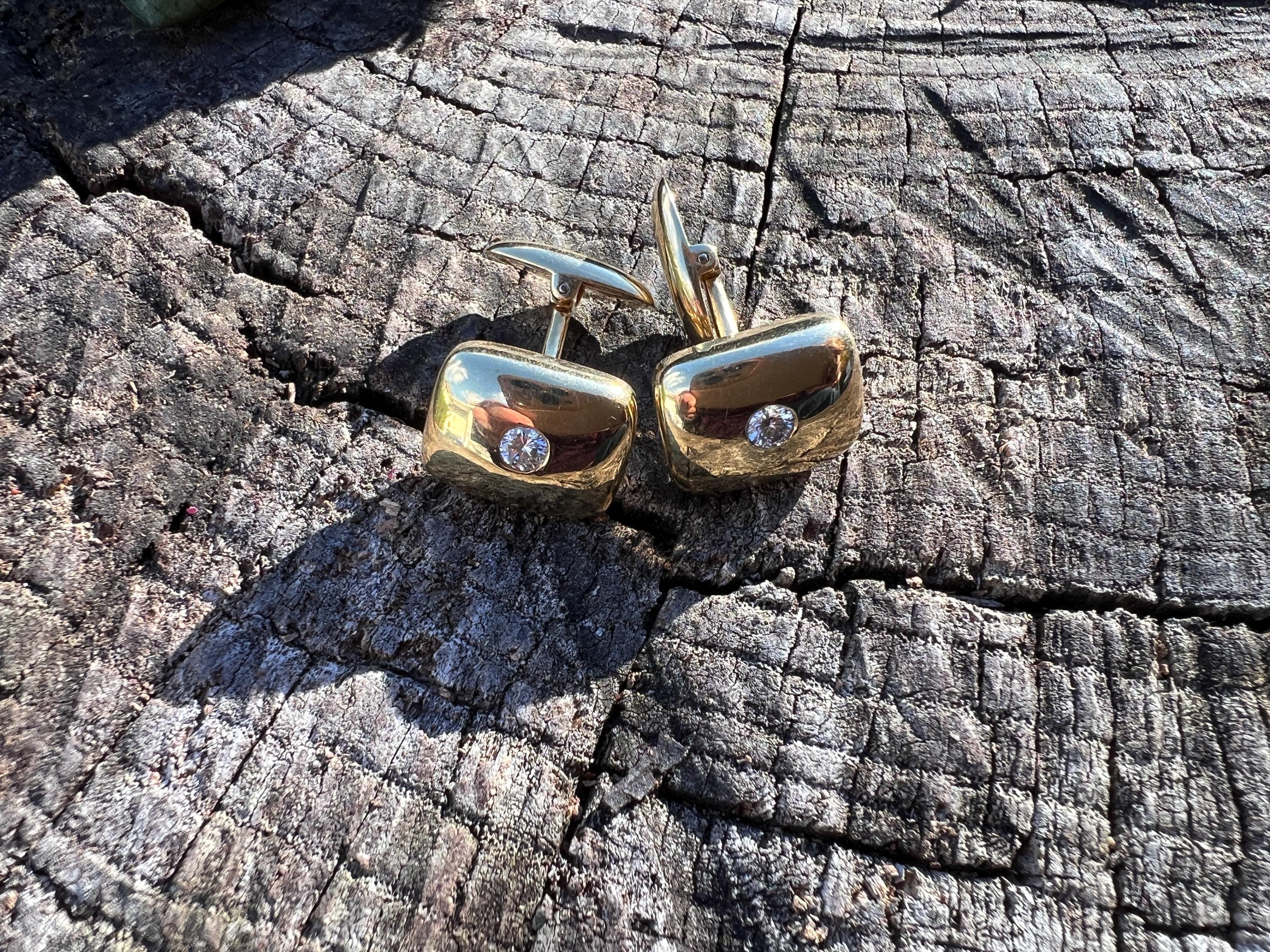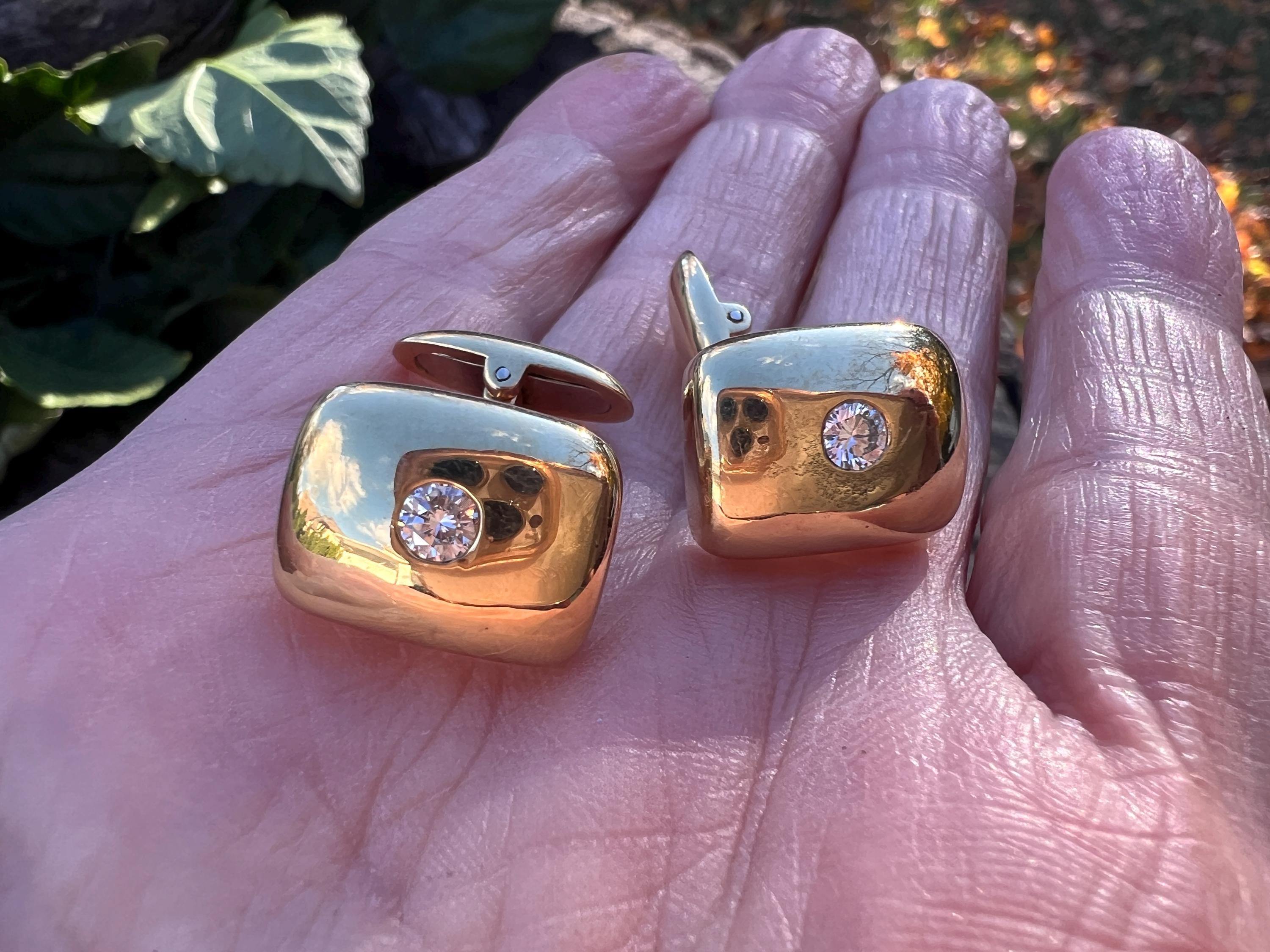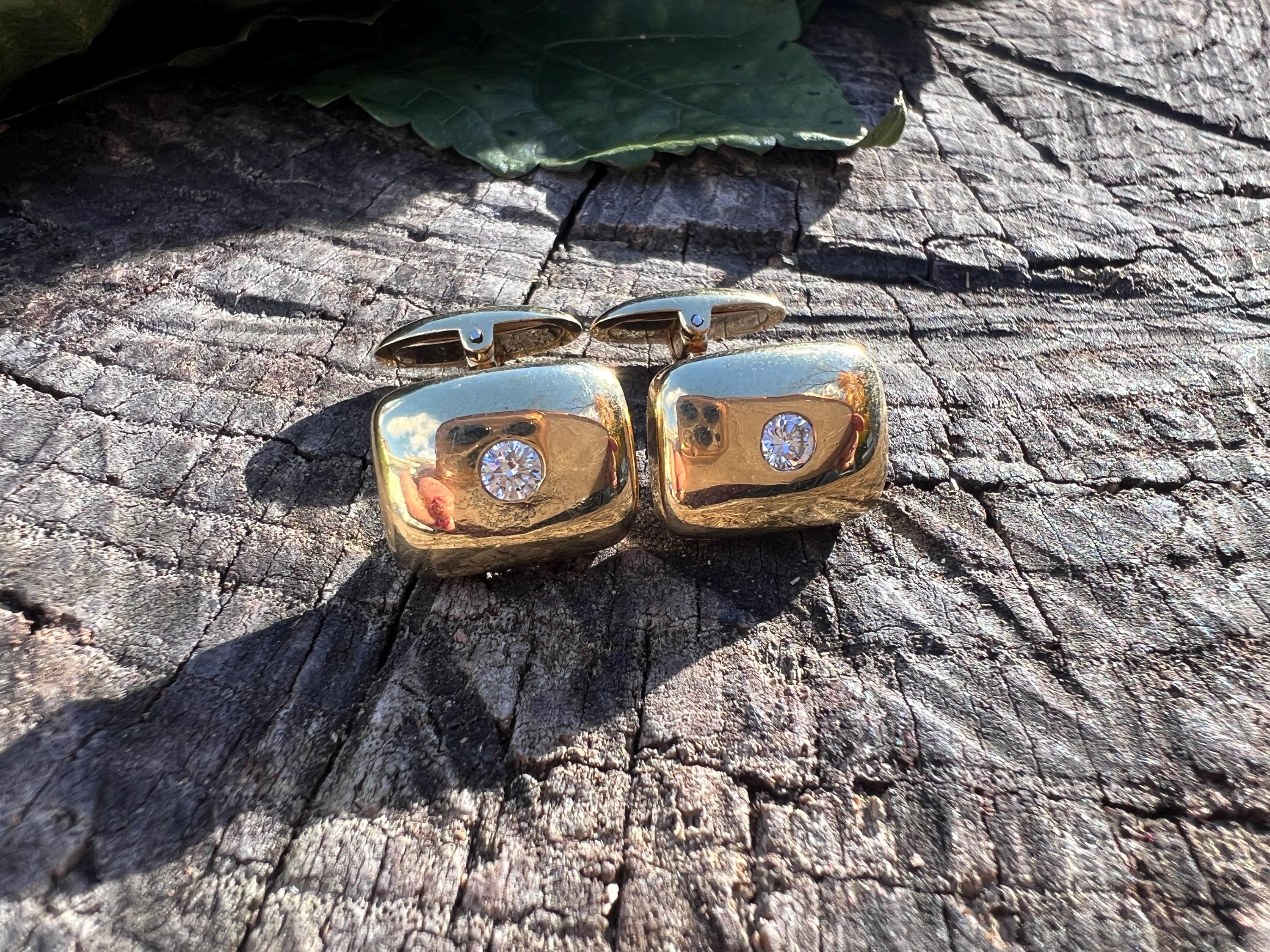 This strong vintage cuff link is set in 18k yellow gold. Impactful and elegant the rectangular shaped curved cuff links are stunning solid polished gold. There is a round diamond bezel set in the center of each cuff link. The diamonds have a total approx. weight of .30 ct. They are G in color and VS2 in clarity. The cuff links are marked Antora and 750. The cuff links weigh 14.10 grams. They measure 5/8” x 7/16”