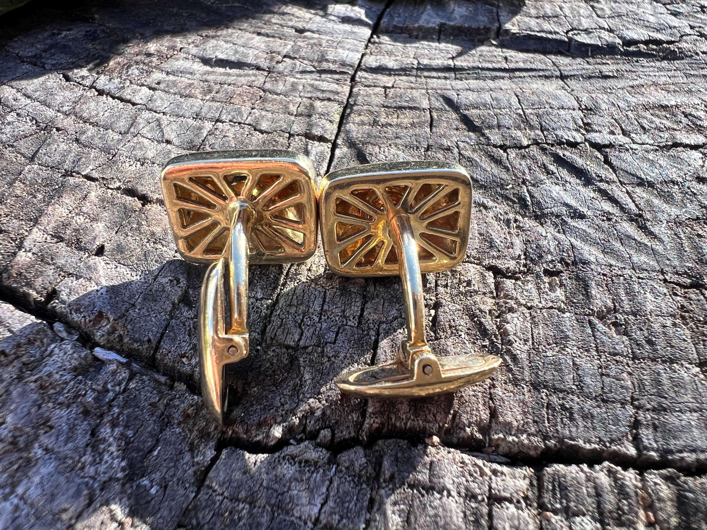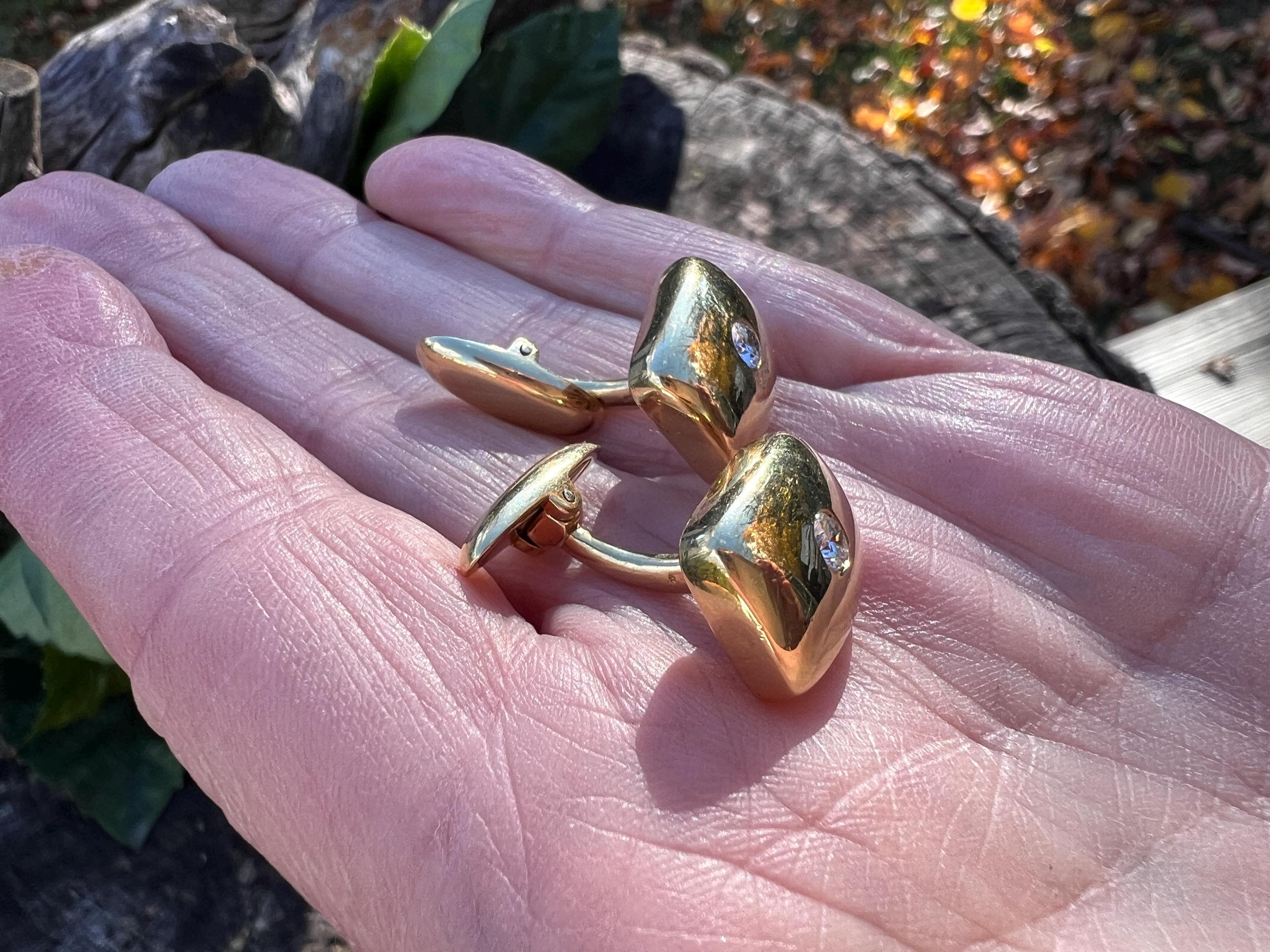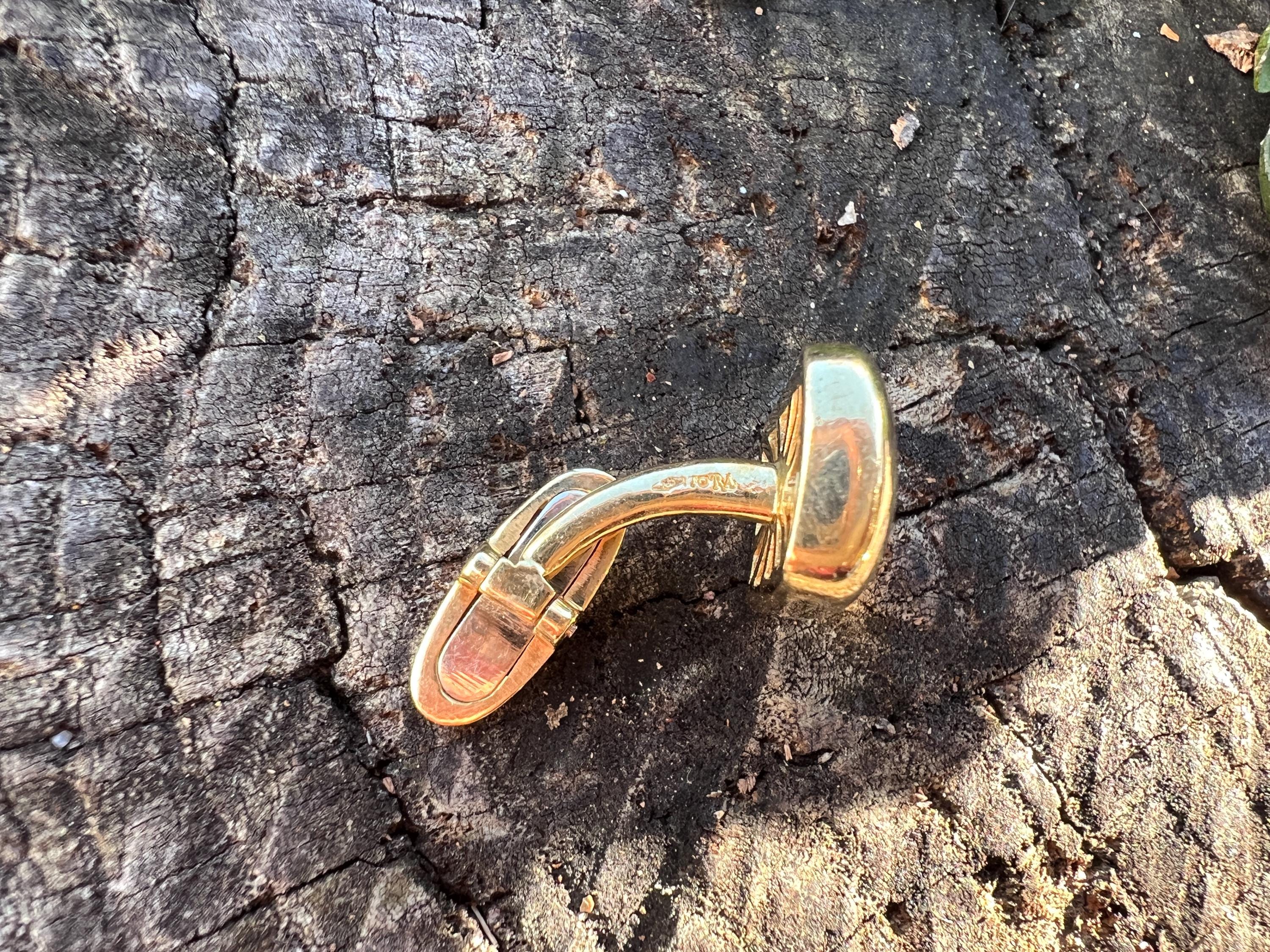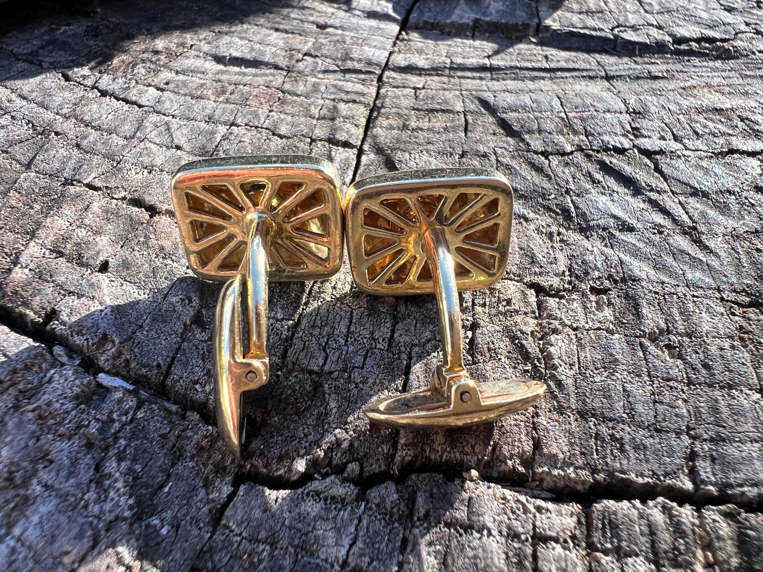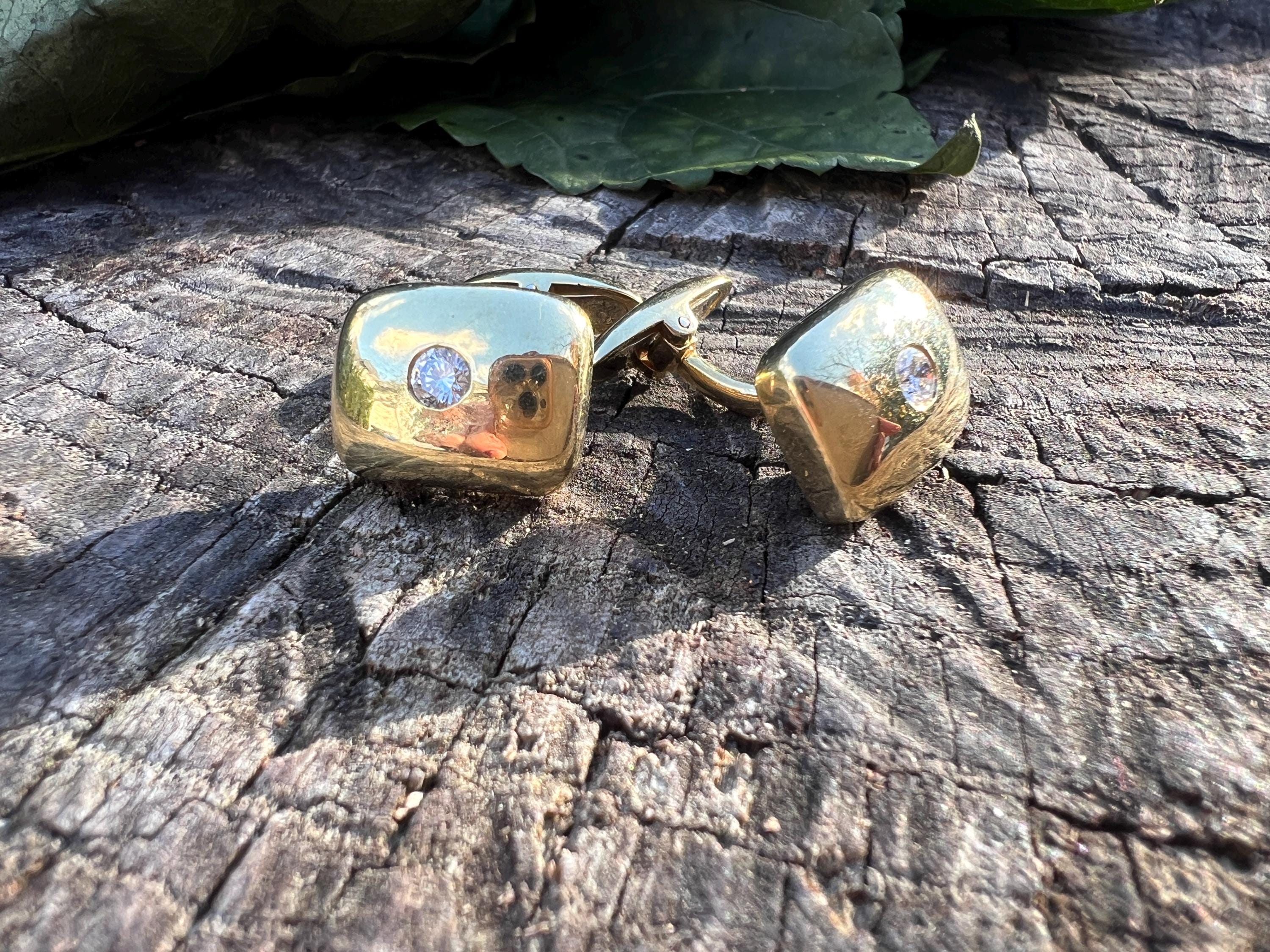 This strong vintage cuff link is set in 18k yellow gold. Impactful and elegant the rectangular shaped curved cuff links are stunning solid polished gold. There is a round diamond bezel set in the center of each cuff link. The diamonds have a total approx. weight of .30 ct. They are G in color and VS2 in clarity. The cuff links are marked Antora and 750. The cuff links weigh 14.10 grams. They measure 5/8” x 7/16”
