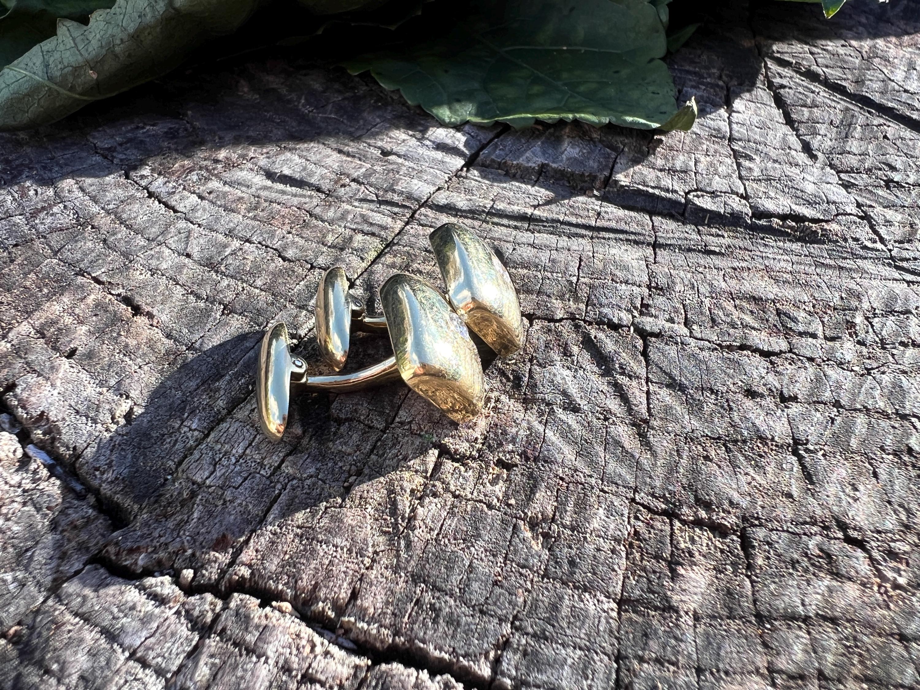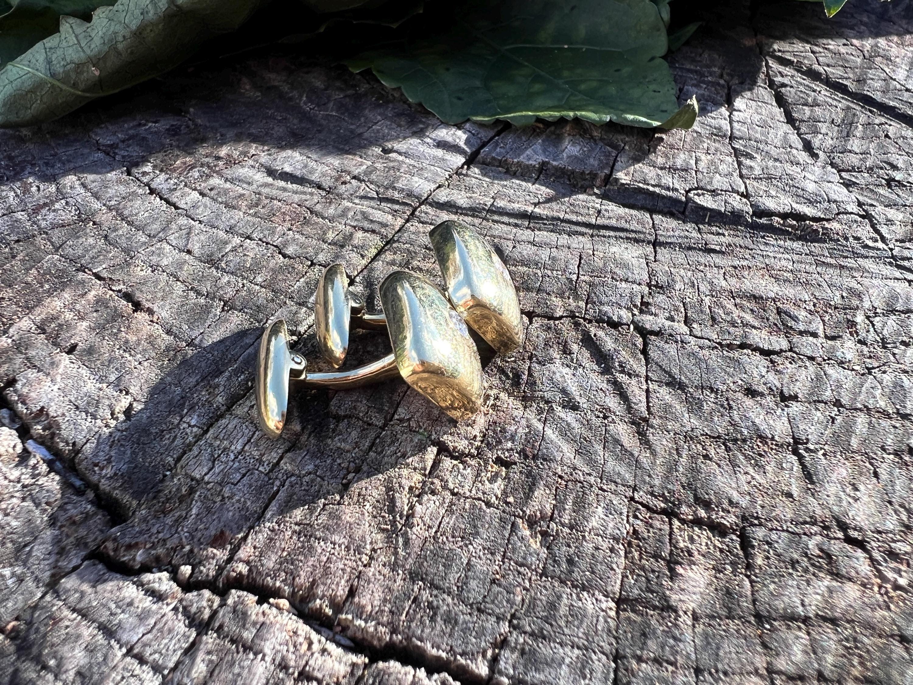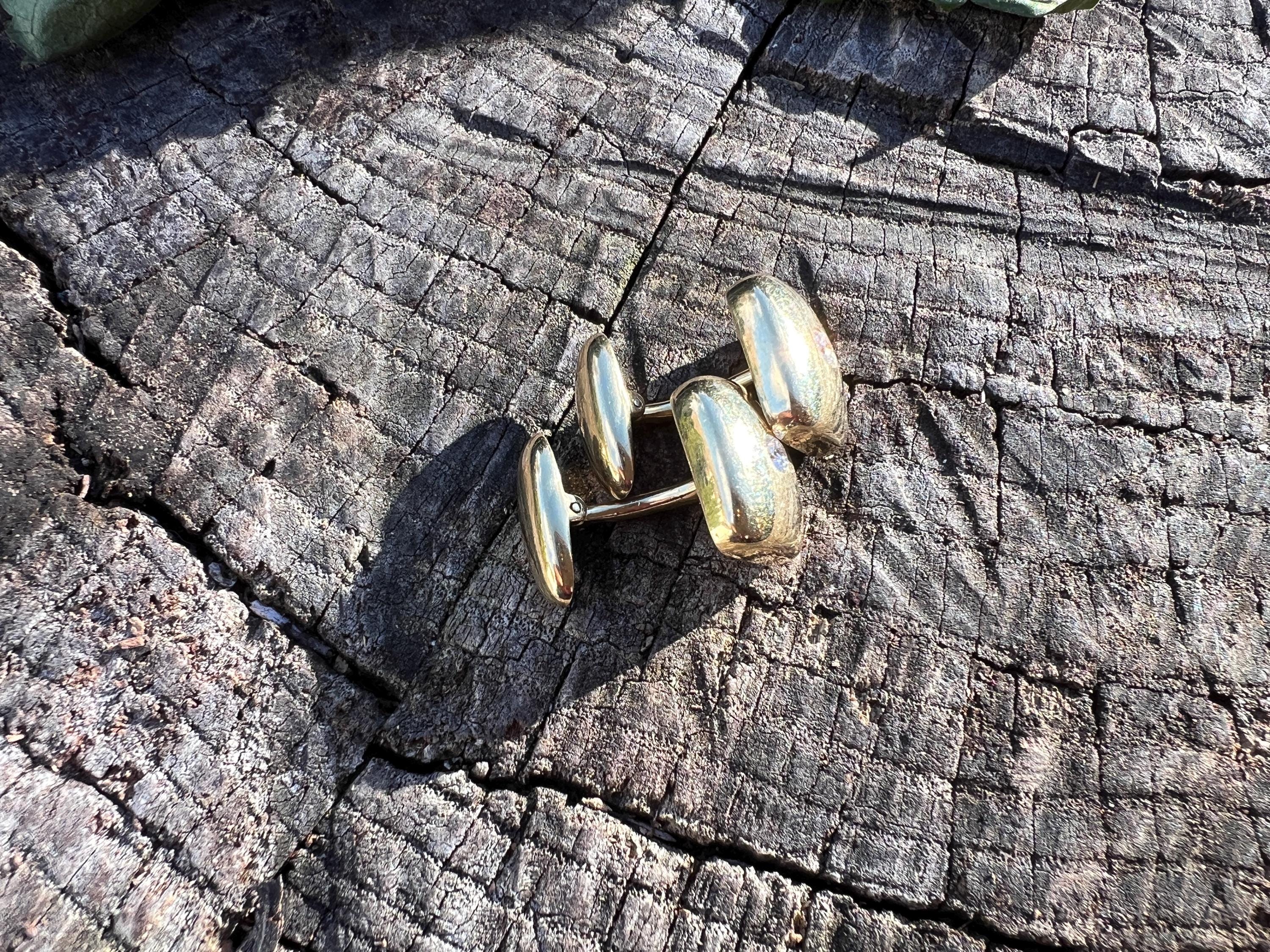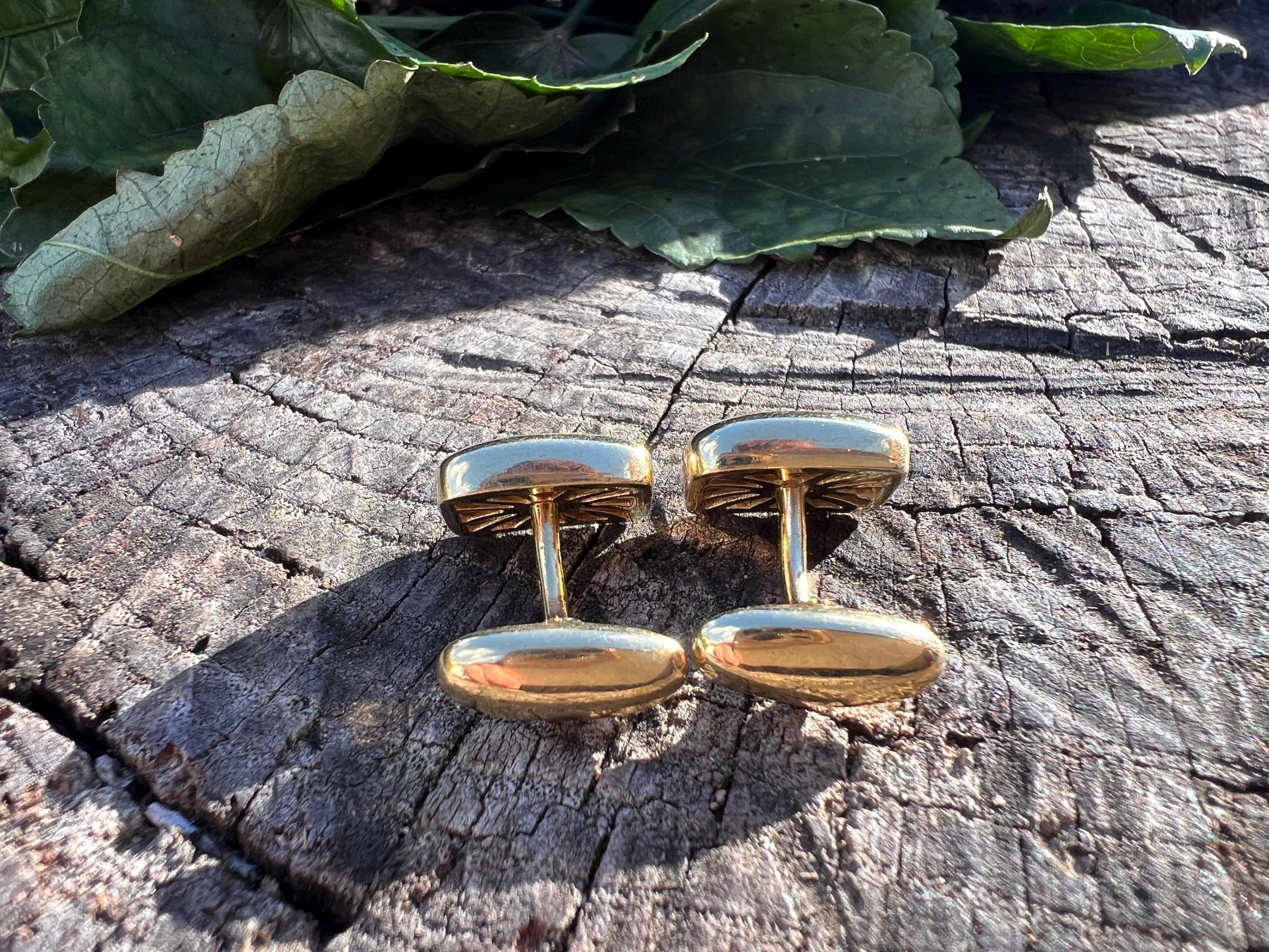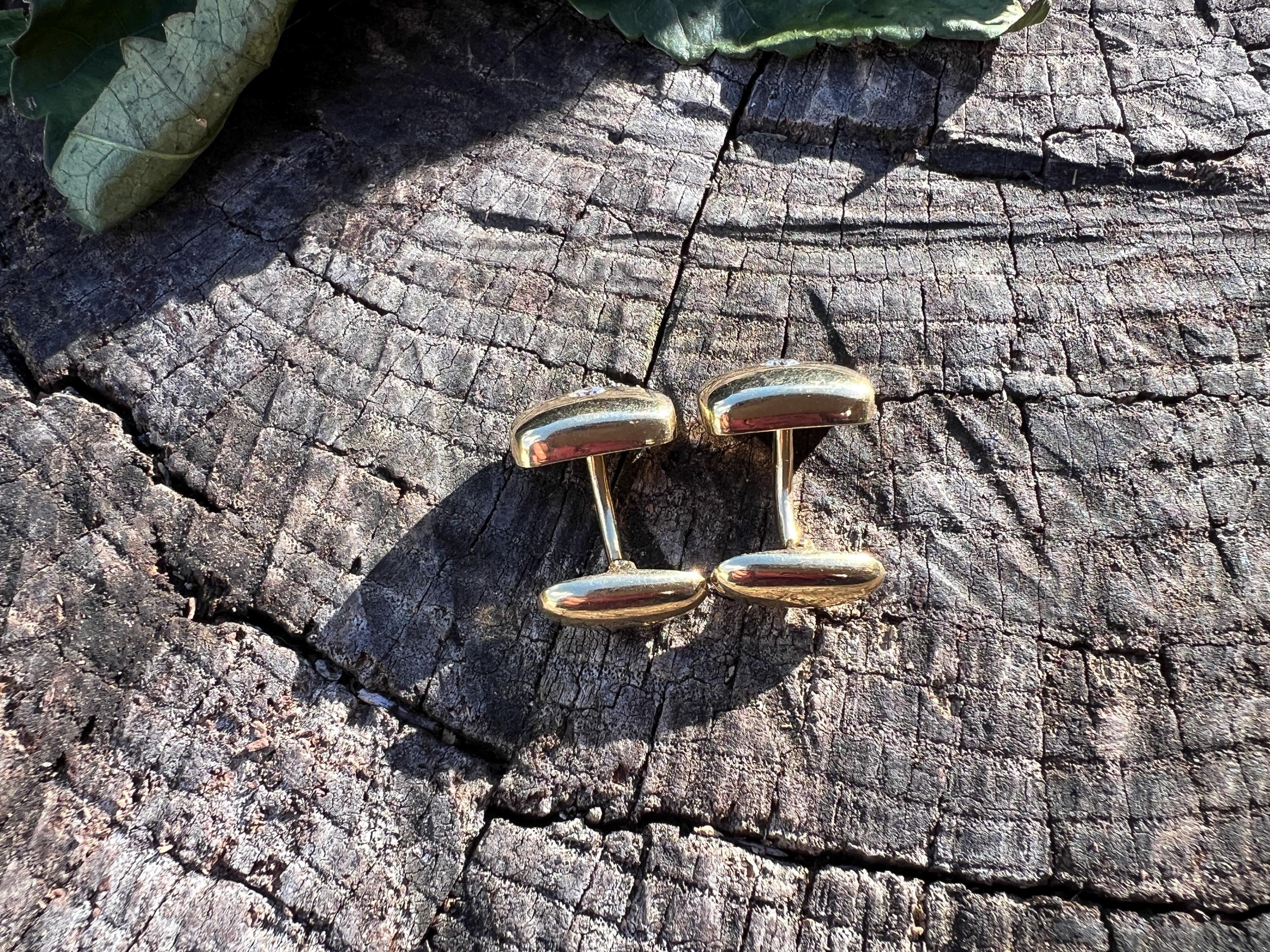 This strong vintage cuff link is set in 18k yellow gold. Impactful and elegant the rectangular shaped curved cuff links are stunning solid polished gold. There is a round diamond bezel set in the center of each cuff link. The diamonds have a total approx. weight of .30 ct. They are G in color and VS2 in clarity. The cuff links are marked Antora and 750. The cuff links weigh 14.10 grams. They measure 5/8” x 7/16”